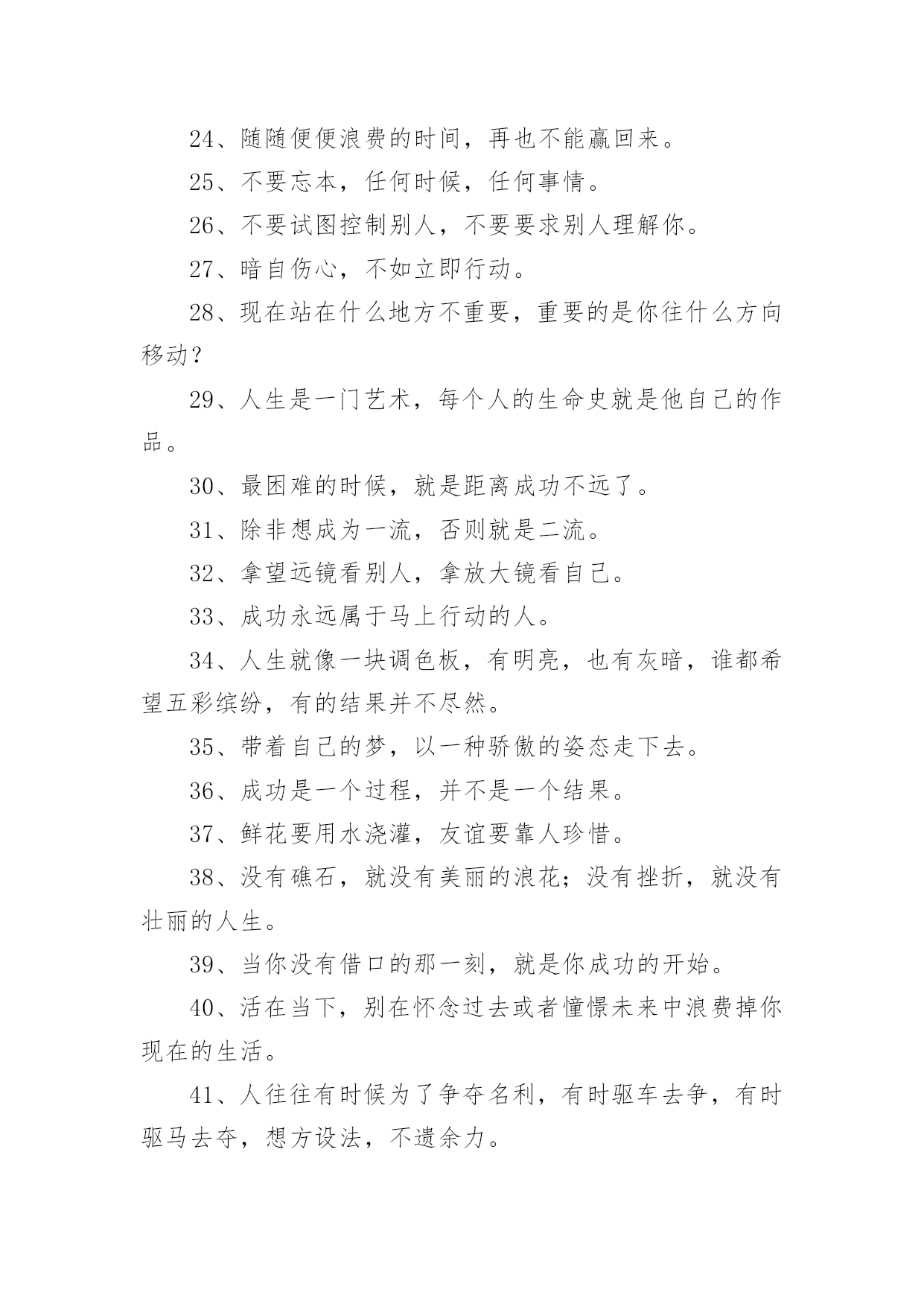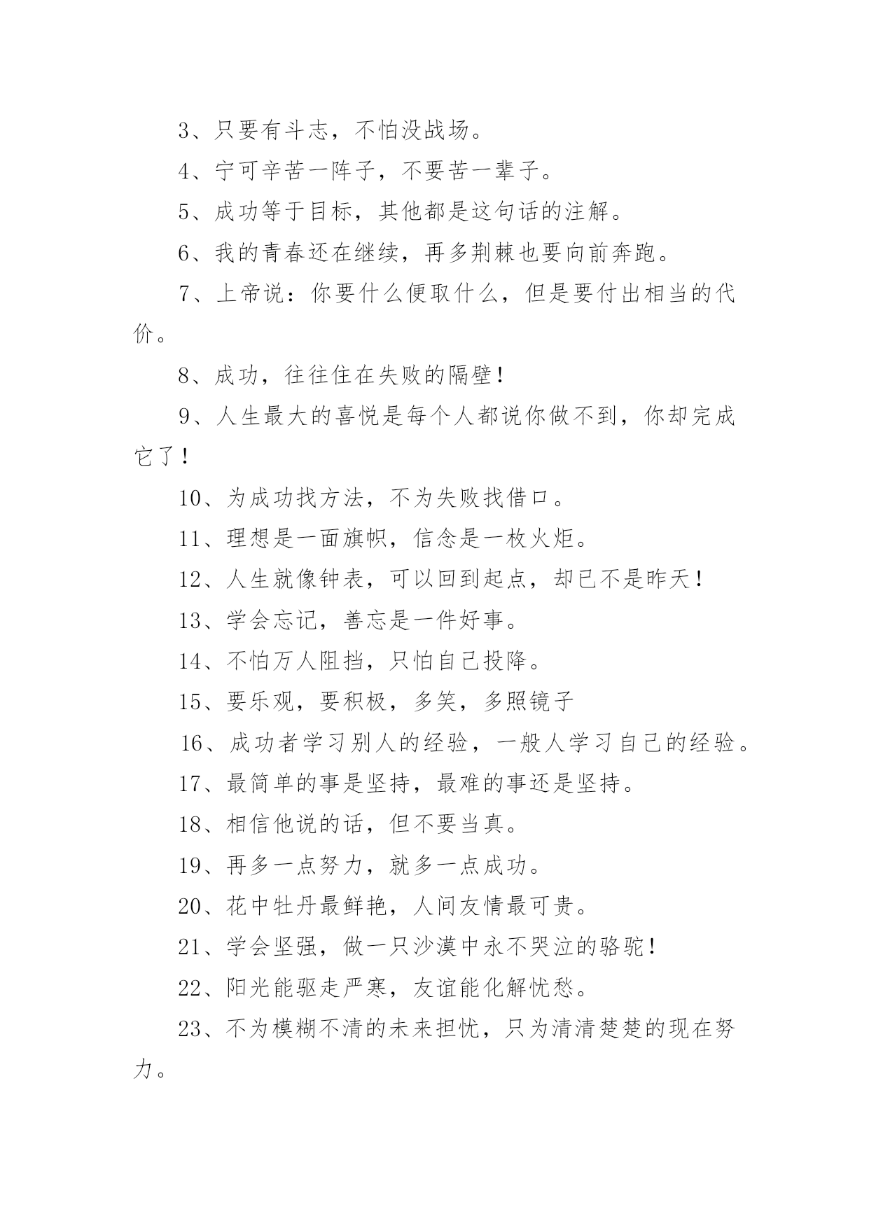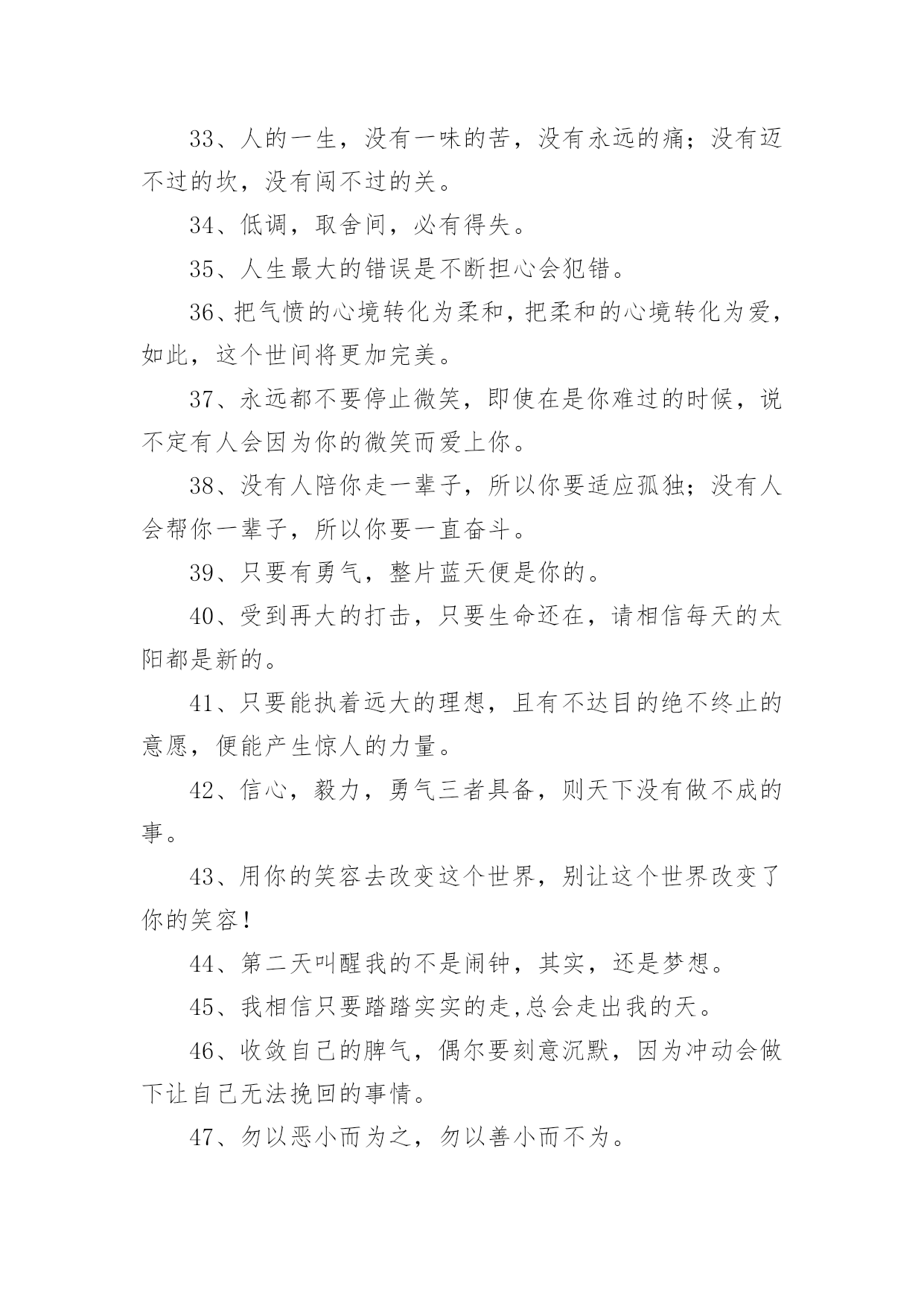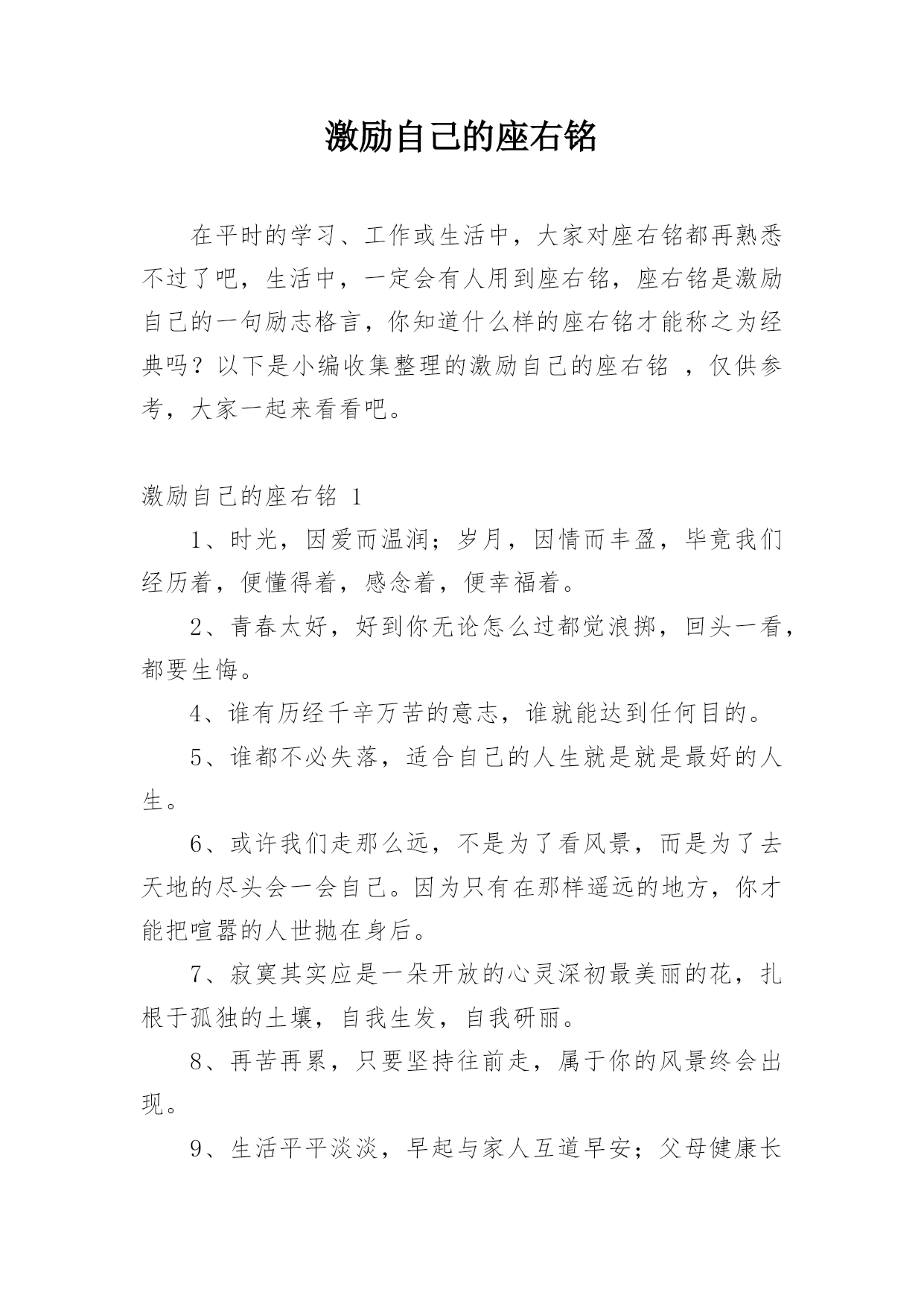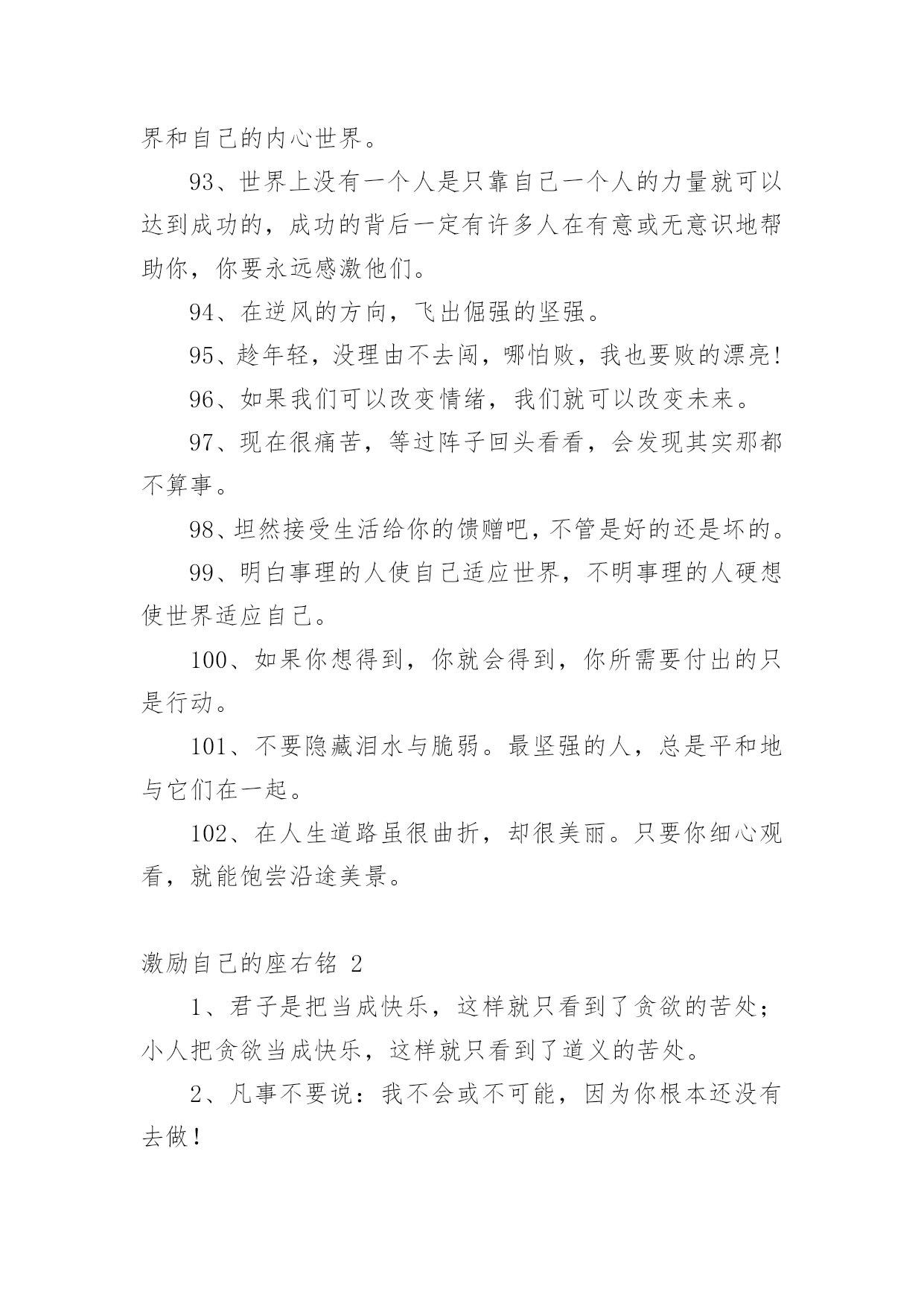 激励自己的座右铭在平时的学习、工作或生活中,大家对座右铭都再熟悉不过了吧,生活中,一定会有人用到座右铭,座右铭是激励自己的一句励志格言,你知道什么样的座右铭才能称之为经典吗?以下是小编收集整理的激励自己的座右铭,仅供参考,大家一起来看看吧。激励自己的座右铭11、时光,因爱而温润;岁月,因情而丰盈,毕竟我们经历着,便懂得着,感念着,便幸福着。2、青春太好,好到你无论怎么过都觉浪掷,回头一看,都要生悔。4、谁有历经千辛万苦的意志,谁就能达到任何目的。5、谁都不必失落,适合自己的人生就是就是最好的人生。6、或许我们走那么远,不是为了看风景,而是为了去天地的尽头会一会自己。因为只有在那样遥远的地方,你才能把喧嚣的人世抛在身后。7、寂寞其实应是一朵开放的心灵深初最美丽的花,扎根于孤独的土壤,自我生发,自我研丽。8、再苦再累,只要坚持往前走,属于你的风景终会出现。9、生活平平淡淡,早起与家人互道早安;父母健康长寿,尽量天天见面;孩子聪明可爱,每天亲亲小脸;夫妻恩爱有加,一生把手相牵;生活无需复杂,幸福就是如此简单。10、人不是坏的,只是习气罢了,每个人都有习气,只是深浅不同罢了。只要他有向善的心,能原谅的就原谅他,不要把他看做是坏人。11、活得轻松,任何事都作一个最好的打算和最坏的打算。12、人永远在追求快乐,永远在逃避痛苦。13、以平常心来面对一些事物,用现实的眼光来看待一些人物,你会收获很多的。14、不要太依赖朋友,人性基本都有恶的一面。15、做一个简单的人,踏实而务实。不沉溺幻想。不庸人自扰。16、人生最精彩的不是实现梦想的瞬间,而是坚持梦想的过程。17、当所有人都拿我当回事的时候,我不能太拿自己当回事。当所有人都不拿我当回事的时,我一定得瞧得上自己。这就是淡定,这就是从容。18、温和对人对事,不要随意发脾气,谁都不欠你的。19、人生难免要受些委屈和伤害,与其耿耿于怀郁郁寡欢,倒不如坦坦荡荡泰然处之。只有经受住狂风暴雨的洗礼,才能练就波澜不惊的淡定。20、讲真话的最大好处就是:不必记得自己讲过什么。21、生活就是一种积累,你若储存的温暖越多,你的生活就会越阳光明媚,你若储存太多寒凉,你的生活就会阴云密布。22、把弯路走直是聪明的,因为找到了捷径;把直路走弯是豁达的,因为可以多看了几道风景。23、真正了解无常的含义,当你痛苦时,你要想这痛苦不是永恒的,当你快乐时,你要想这快乐也不是永恒的。24、身在顺境,我们固然可喜,面对逆境,也不必太过忧伤,因为人生的顺境和逆境都有其独特的魅力和存在的价值。25、一个人的快乐,不是因为他拥有的多,而是他计较的少。26、试着把光芒留给别人,不用太在意那些有的没的,你会更快乐。27、对于每一个不利条件,都会存在与之相对应的有利条件。28、活在当下,别在怀念过去或者憧憬未来中浪费掉你现在的生活。29、一个从来没有失败过的人,必然是一个从未尝试过什么的.人。30、学会放弃,拽的越紧,痛苦的是自己。31、可以不美丽,可以不可爱,可以不温柔,但是一定要诚实和善良。32、对人性的弱点有清醒的认识,但要相信真诚的爱情,对爱情永远怀有单纯的向往。33、人的一生,没有一味的苦,没有永远的痛;没有迈不过的坎,没有闯不过的关。34、低调,取舍间,必有得失。35、人生最大的错误是不断担心会犯错。36、把气愤的心境转化为柔和,把柔和的心境转化为爱,如此,这个世间将更加完美。37、永远都不要停止微笑,即使在是你难过的时候,说不定有人会因为你的微笑而爱上你。38、没有人陪你走一辈子,所以你要适应孤独;没有人会帮你一辈子,所以你要一直奋斗。39、只要有勇气,整片蓝天便是你的。40、受到再大的打击,只要生命还在,请相信每天的太阳都是新的。41、只要能执着远大的理想,且有不达目的绝不终止的意愿,便能产生惊人的力量。42、信心,毅力,勇气三者具备,则天下没有做不成的事。43、用你的笑容去改变这个世界,别让这个世界改变了你的笑容!44、第二天叫醒我的不是闹钟,其实,还是梦想。45、我相信只要踏踏实实的走,总会走出我的天。46、收敛自己的脾气,偶尔要刻意沉默,因为冲动会做下让自己无法挽回的事情。47、勿以恶小而为之,勿以善小而不为。48、下定决心一定要,才是成功的关键。49、怀念是生命中最无能为力的事。看着满心的疮痍,你以为你老了,其实那是你空了。50、你真的得碰上那个你能降得住又能降得住你的人,才算是适合。52、当困苦姗姗而来之时,超越它们会更有余味。53、以后的路谁也不清楚,只有慢慢去探索。54、坚持者能在命运风暴中奋斗。55、有多大的思想,才有多大的能量。56、爱情很美好,相信爱情。如果连爱情都不相信那人生岂不太苦了?57、没有经历过的,永远不能理解这些道理,但听听也是好的。58、有时可能别人不在乎你,但你不能不在乎自己。59、不要