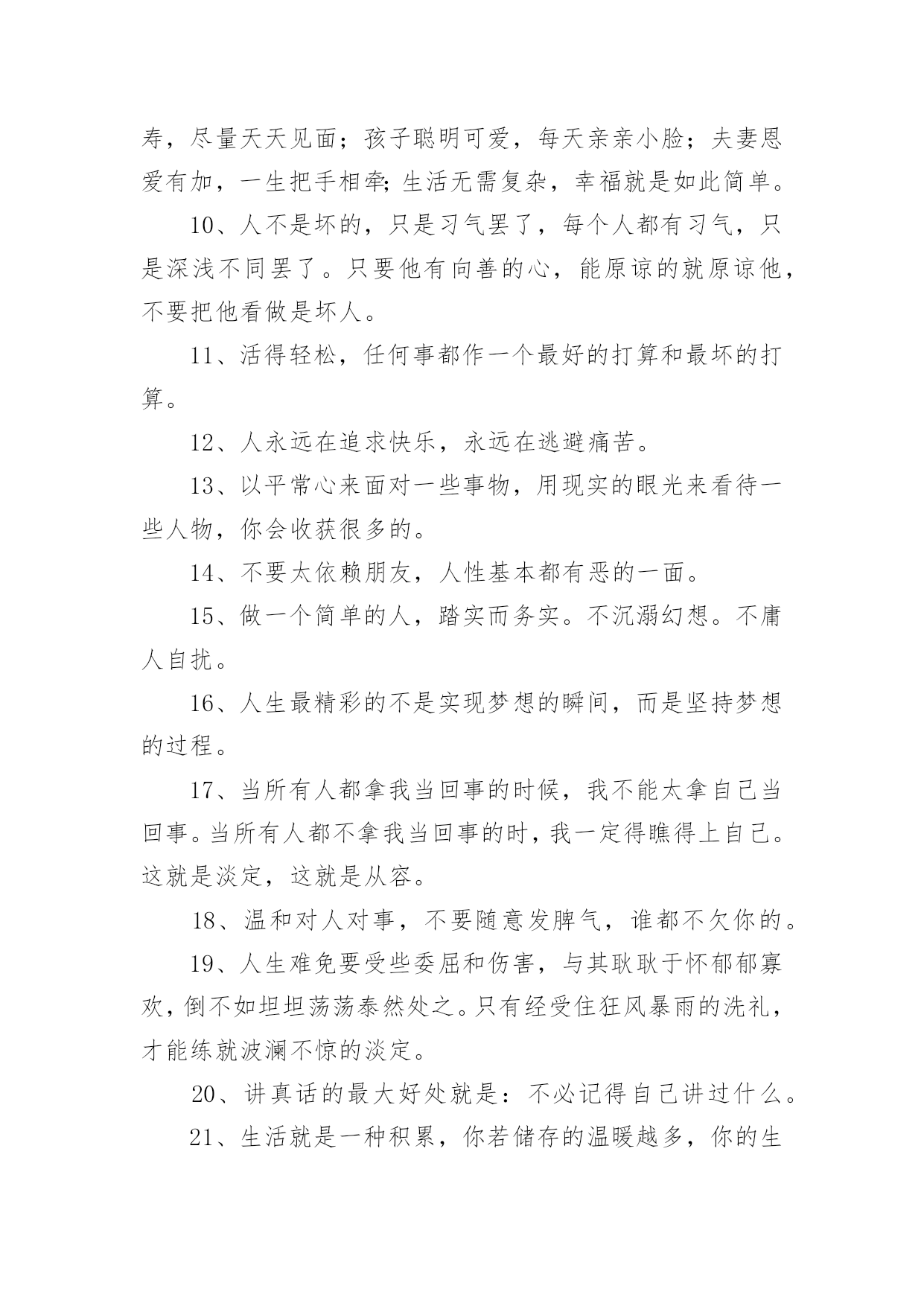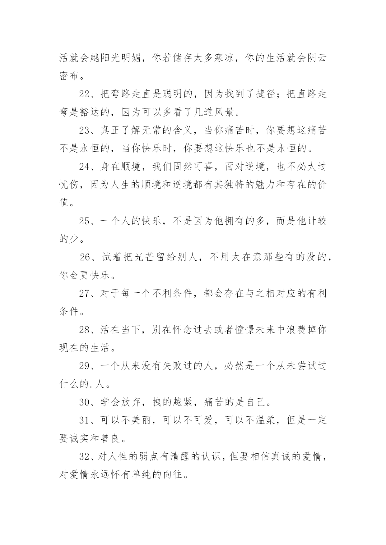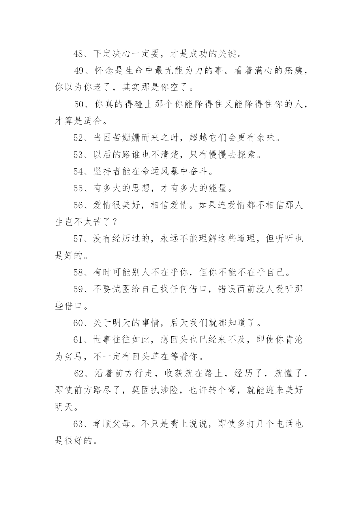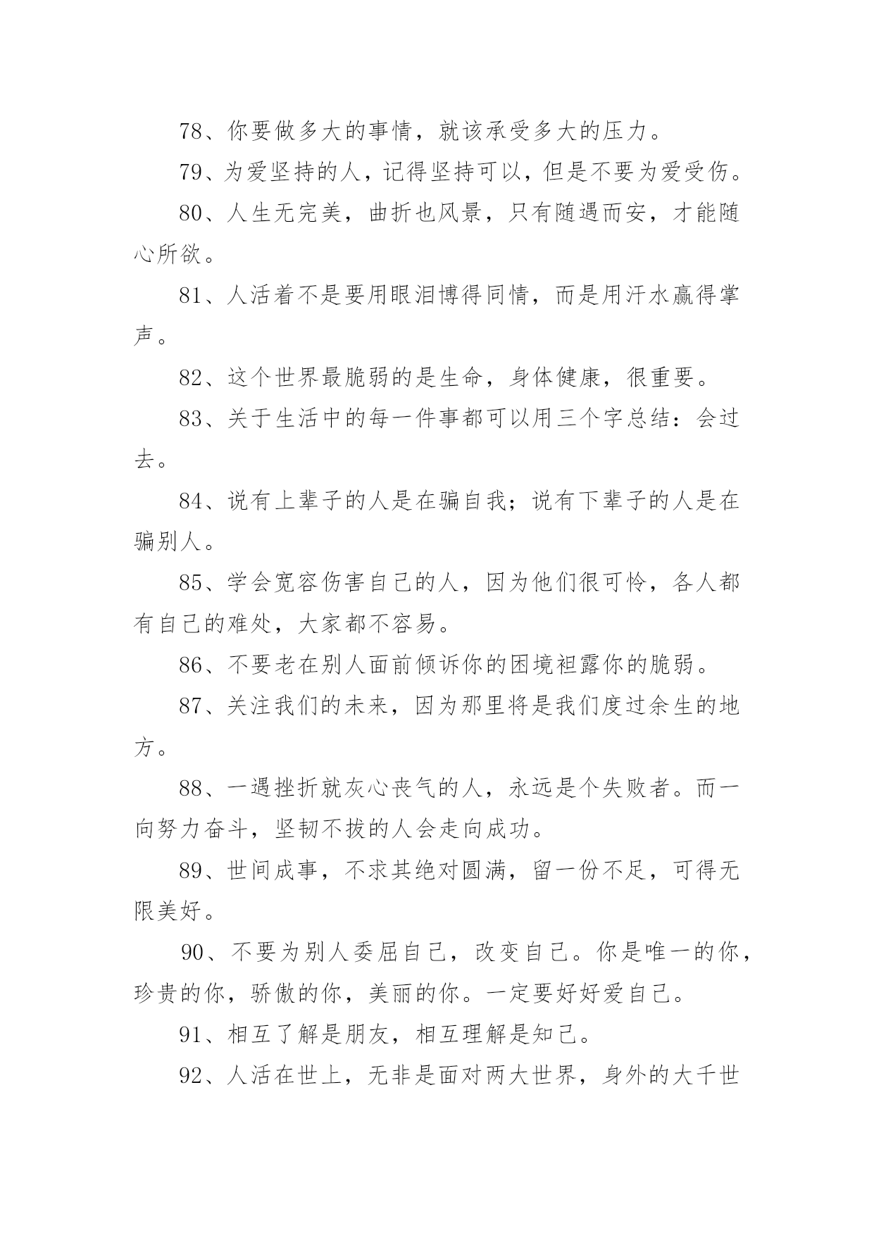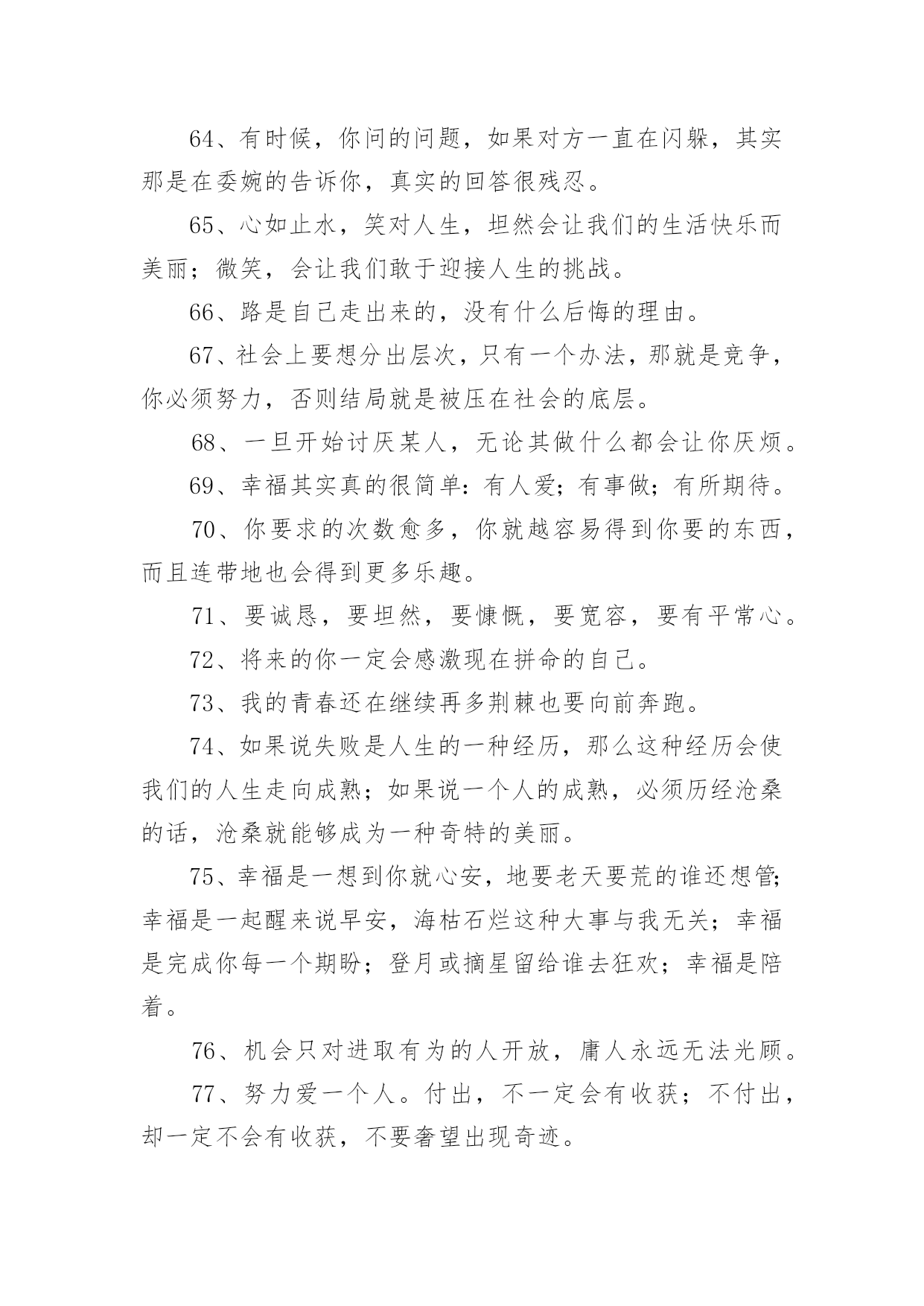 激励自己的座右铭在平时的学习、工作或生活中,大家对座右铭都再熟悉不过了吧,生活中,一定会有人用到座右铭,座右铭是激励自己的一句励志格言,你知道什么样的座右铭才能称之为经典吗?以下是小编收集整理的激励自己的座右铭,仅供参考,大家一起来看看吧。激励自己的座右铭11、时光,因爱而温润;岁月,因情而丰盈,毕竟我们经历着,便懂得着,感念着,便幸福着。2、青春太好,好到你无论怎么过都觉浪掷,回头一看,都要生悔。4、谁有历经千辛万苦的意志,谁就能达到任何目的。5、谁都不必失落,适合自己的人生就是就是最好的人生。6、或许我们走那么远,不是为了看风景,而是为了去天地的尽头会一会自己。因为只有在那样遥远的地方,你才能把喧嚣的人世抛在身后。7、寂寞其实应是一朵开放的心灵深初最美丽的花,扎根于孤独的土壤,自我生发,自我研丽。8、再苦再累,只要坚持往前走,属于你的风景终会出现。9、生活平平淡淡,早起与家人互道早安;父母健康长寿,尽量天天见面;孩子聪明可爱,每天亲亲小脸;夫妻恩爱有加,一生把手相牵;生活无需复杂,幸福就是如此简单。10、人不是坏的,只是习气罢了,每个人都有习气,只是深浅不同罢了。只要他有向善的心,能原谅的就原谅他,不要把他看做是坏人。11、活得轻松,任何事都作一个最好的打算和最坏的打算。12、人永远在追求快乐,永远在逃避痛苦。13、以平常心来面对一些事物,用现实的眼光来看待一些人物,你会收获很多的。14、不要太依赖朋友,人性基本都有恶的一面。15、做一个简单的人,踏实而务实。不沉溺幻想。不庸人自扰。16、人生最精彩的不是实现梦想的瞬间,而是坚持梦想的过程。17、当所有人都拿我当回事的时候,我不能太拿自己当回事。当所有人都不拿我当回事的时,我一定得瞧得上自己。这就是淡定,这就是从容。18、温和对人对事,不要随意发脾气,谁都不欠你的。19、人生难免要受些委屈和伤害,与其耿耿于怀郁郁寡欢,倒不如坦坦荡荡泰然处之。只有经受住狂风暴雨的洗礼,才能练就波澜不惊的淡定。20、讲真话的最大好处就是:不必记得自己讲过什么。21、生活就是一种积累,你若储存的温暖越多,你的生活就会越阳光明媚,你若储存太多寒凉,你的生活就会阴云密布。22、把弯路走直是聪明的,因为找到了捷径;把直路走弯是豁达的,因为可以多看了几道风景。23、真正了解无常的含义,当你痛苦时,你要想这痛苦不是永恒的,当你快乐时,你要想这快乐也不是永恒的。24、身在顺境,我们固然可喜,面对逆境,也不必太过忧伤,因为人生的顺境和逆境都有其独特的魅力和存在的价值。25、一个人的快乐,不是因为他拥有的多,而是他计较的少。26、试着把光芒留给别人,不用太在意那些有的没的,你会更快乐。27、对于每一个不利条件,都会存在与之相对应的有利条件。28、活在当下,别在怀念过去或者憧憬未来中浪费掉你现在的生活。29、一个从来没有失败过的人,必然是一个从未尝试过什么的.人。30、学会放弃,拽的越紧,痛苦的是自己。31、可以不美丽,可以不可爱,可以不温柔,但是一定要诚实和善良。32、对人性的弱点有清醒的认识,但要相信真诚的爱情,对爱情永远怀有单纯的向往。33、人的一生,没有一味的苦,没有永远的痛;没有迈不过的坎,没有闯不过的关。34、低调,取舍间,必有得失。35、人生最大的错误是不断担心会犯错。36、把气愤的心境转化为柔和,把柔和的心境转化为爱,如此,这个世间将更加完美。37、永远都不要停止微笑,即使在是你难过的时候,说不定有人会因为你的微笑而爱上你。38、没有人陪你走一辈子,所以你要适应孤独;没有人会帮你一辈子,所以你要一直奋斗。39、只要有勇气,整片蓝天便是你的。40、受到再大的打击,只要生命还在,请相信每天的太阳都是新的。41、只要能执着远大的理想,且有不达目的绝不终止的意愿,便能产生惊人的力量。42、信心,毅力,勇气三者具备,则天下没有做不成的事。43、用你的笑容去改变这个世界,别让这个世界改变了你的笑容!44、第二天叫醒我的不是闹钟,其实,还是梦想。45、我相信只要踏踏实实的走,总会走出我的天。46、收敛自己的脾气,偶尔要刻意沉默,因为冲动会做下让自己无法挽回的事情。47、勿以恶小而为之,勿以善小而不为。48、下定决心一定要,才是成功的关键。49、怀念是生命中最无能为力的事。看着满心的疮痍,你以为你老了,其实那是你空了。50、你真的得碰上那个你能降得住又能降得住你的人,才算是适合。52、当困苦姗姗而来之时,超越它们会更有余味。53、以后的路谁也不清楚,只有慢慢去探索。54、坚持者能在命运风暴中奋斗。55、有多大的思想,才有多大的能量。56、爱情很美好,相信爱情。如果连爱情都不相信那人生岂不太苦了?57、没有经历过的,永远不能理解这些道理,但听听也是好的。58、有时可能别人不在乎你,但你不能不在乎自己。59、不要