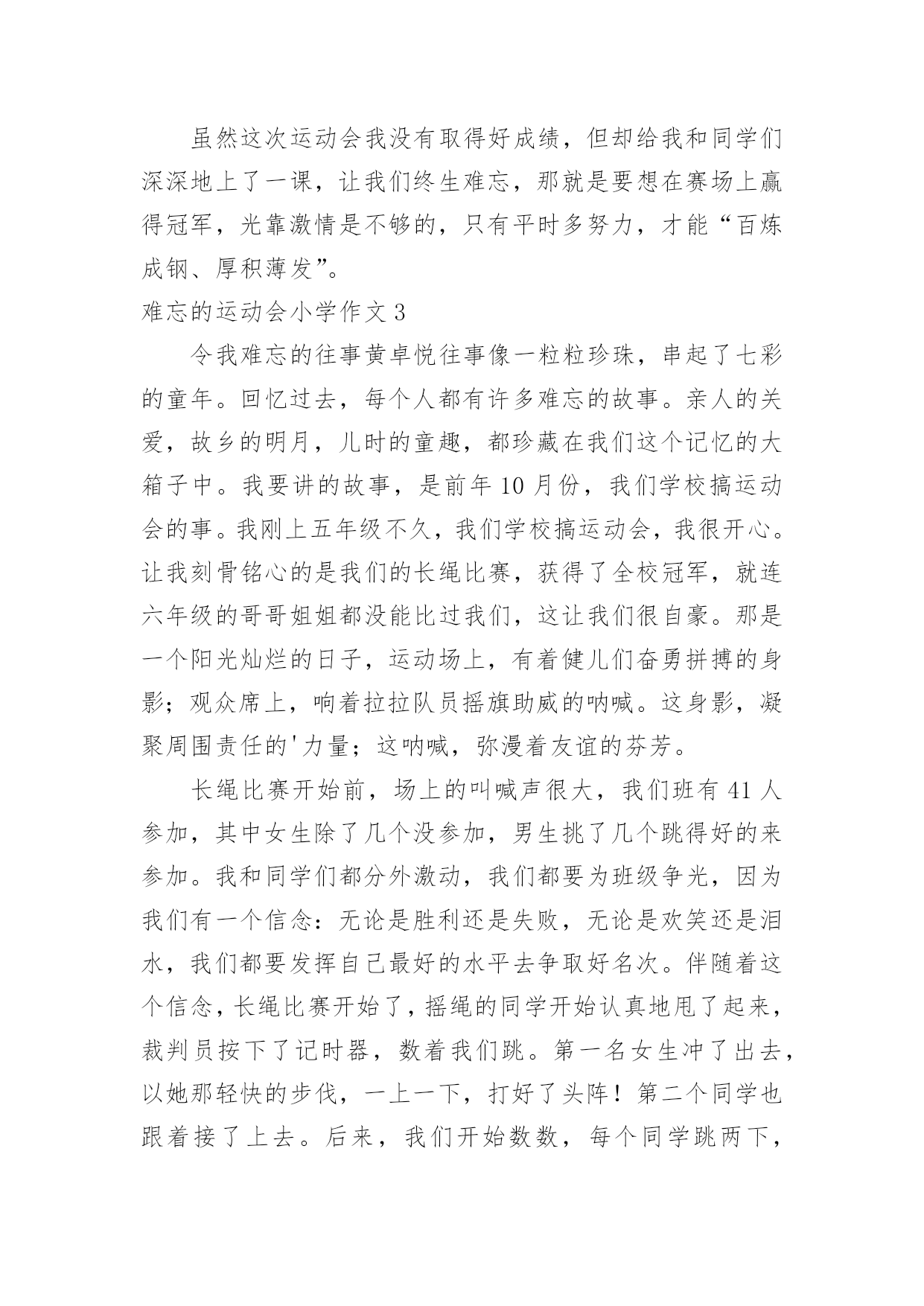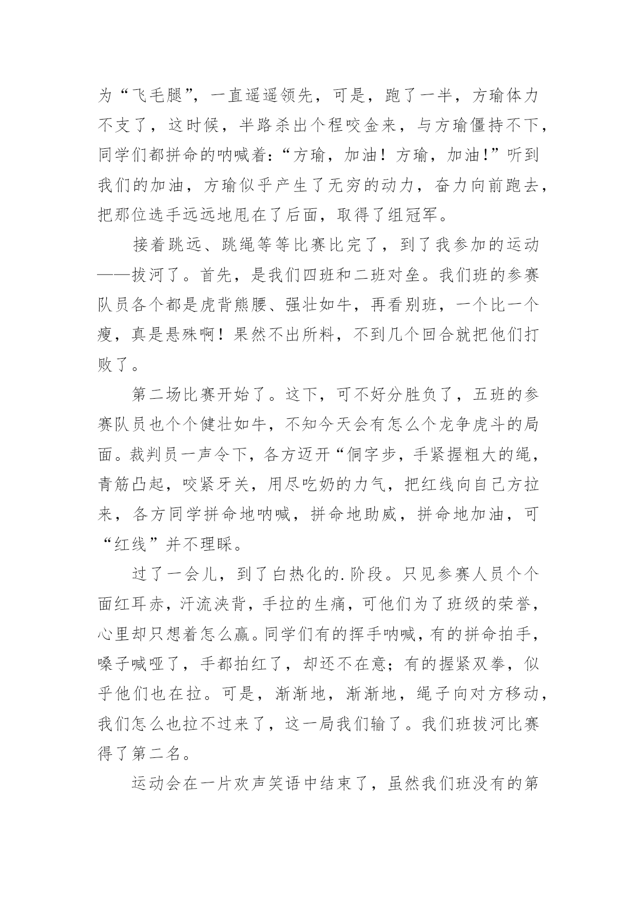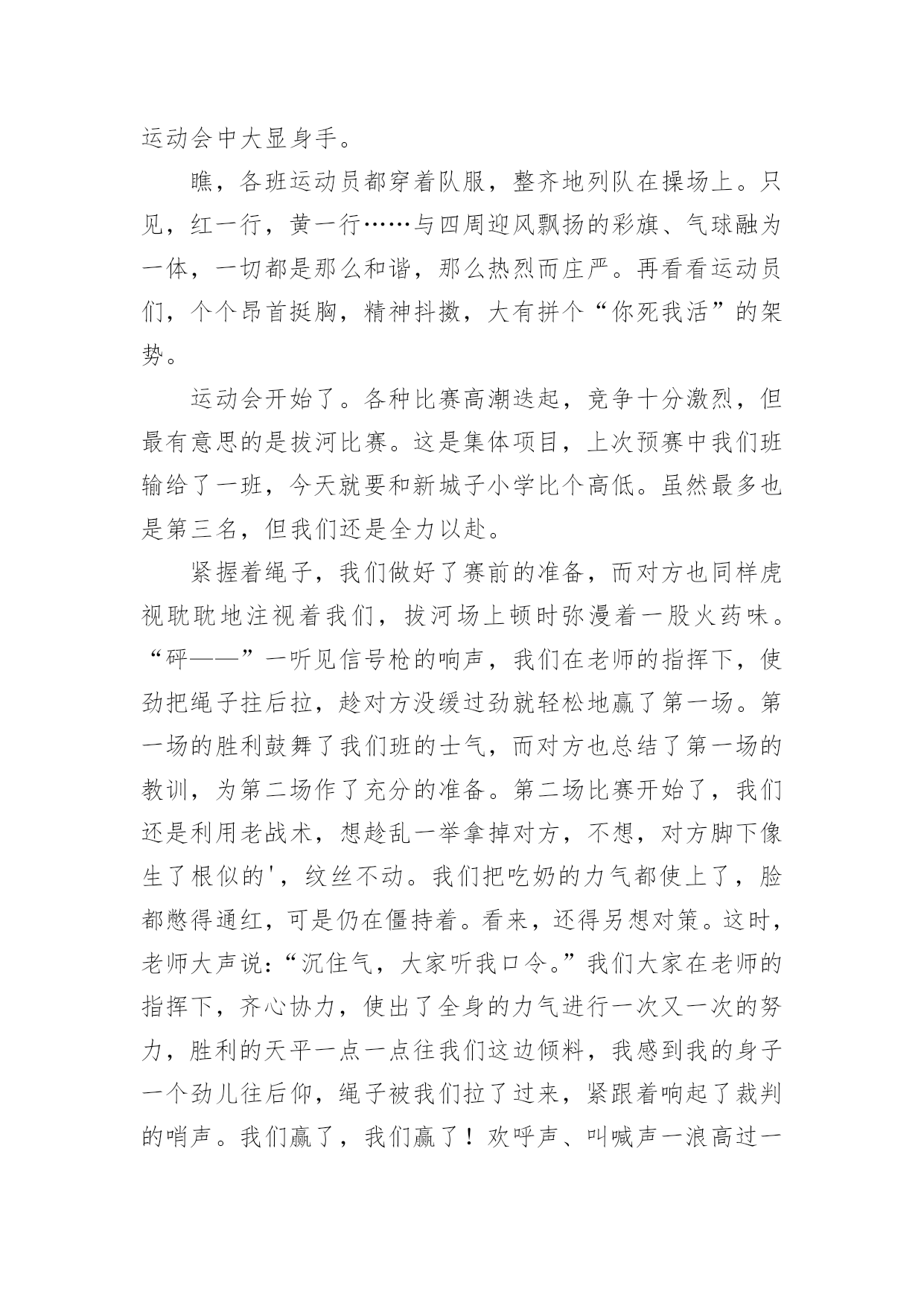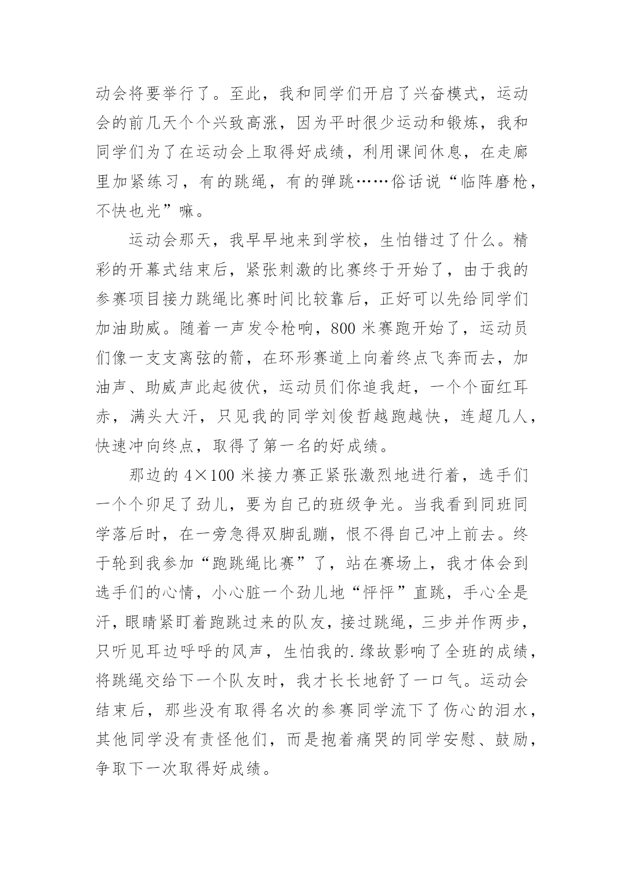 难忘的运动会小学作文难忘的运动会小学作文在日常学习、工作或生活中,大家总免不了要接触或使用作文吧,作文一定要做到主题集中,围绕同一主题作深入阐述,切忌东拉西扯,主题涣散甚至无主题。你知道作文怎样写才规范吗?以下是小编整理的难忘的运动会小学作文,希望对大家有所帮助。难忘的运动会小学作文1前不久,我们城北学校迎来了“乐步优身”体育节——第34届田径运动会。这一天,彩旗飘飘,广播里播放着刚劲有力的《运动员进行曲》。在副校长的讲话、裁判员的宣誓下,全校师生聚集在操场上,或参加比赛,或观看比赛。首先是1—6年级的运动员亮相,他们个个昂首挺胸,神气十足。瞧,345班的运动员们正面带微笑向我们走来,同学们都兴奋地向他们挥手,他们也热情地回应我们。在所有的比赛项目中,让我印象最深的是:1500米半决赛和两人三足。先说1500米半决赛吧,那时我正在看书,一位同学跟我说:“快去看,四年级的1500米半决赛要开始了!”我急忙跑到看比赛的地方,只见裁判员发令枪一响,男运动员们就像一只只离弦的箭,“嗖”地一声冲出起点。我们班的参赛选手是戴悦民,他一直遥遥领先,同学们都为他喝彩、加油。跑1500米的女运动员是黄语秋,她一开始就把对手们甩在后面,中途还不断地加速,后来,她竟把跑在第二的运动员甩了两圈半!胜利在望,我们激动地大声为她呐喊助威。不出所料,我们班的两个参赛运动员都获得了第一名。接下来是两人三足,这是一个集体项目。以班为单位参赛,各班的同学们比赛前先找到自己心仪的搭档,然后把一个人的右脚和另一个人的左脚绑在一起,有节奏地向前奔跑,哪个班用的时间短哪何班就获胜。我的搭档是罗俊佳,还没到我俩时,我心里很紧张,生怕自己摔倒,拖了班级的.后腿。但真正轮到我们,我和搭档健步如飞,踏着统一的步伐向前飞奔,只感觉到耳边的风声呼啸而过。到了终点,我拍了下一组同学的手,下一组搭档立马出发。我和搭档一起拆下绑腿的绷带,站到我们班的队伍里。而我还处在兴奋中,觉得这个项目太有趣,跑一次不过瘾,很想再跑一次。运动会已经结束了,但运动会中的精彩瞬间在我的脑海中一直萦绕!这真是一次难忘的运动会!难忘的运动会小学作文2四年级新学期,我们搬到了新校区,崭新的教学楼,葱绿的树木,宽阔的操场,金色的阳光洒满校园的每个角落,让这一切充满了生机与活力。当我们还沉浸在新校区带来的欢愉时,一个令人兴奋的消息彻底让同学们炸开了锅,同学们埋藏已久的期盼——运动会将要举行了。至此,我和同学们开启了兴奋模式,运动会的前几天个个兴致高涨,因为平时很少运动和锻炼,我和同学们为了在运动会上取得好成绩,利用课间休息,在走廊里加紧练习,有的跳绳,有的弹跳……俗话说“临阵磨枪,不快也光”嘛。运动会那天,我早早地来到学校,生怕错过了什么。精彩的开幕式结束后,紧张刺激的比赛终于开始了,由于我的参赛项目接力跳绳比赛时间比较靠后,正好可以先给同学们加油助威。随着一声发令枪响,800米赛跑开始了,运动员们像一支支离弦的箭,在环形赛道上向着终点飞奔而去,加油声、助威声此起彼伏,运动员们你追我赶,一个个面红耳赤,满头大汗,只见我的同学刘俊哲越跑越快,连超几人,快速冲向终点,取得了第一名的好成绩。那边的4×100米接力赛正紧张激烈地进行着,选手们一个个卯足了劲儿,要为自己的班级争光。当我看到同班同学落后时,在一旁急得双脚乱蹦,恨不得自己冲上前去。终于轮到我参加“跑跳绳比赛”了,站在赛场上,我才体会到选手们的心情,小心脏一个劲儿地“怦怦”直跳,手心全是汗,眼睛紧盯着跑跳过来的队友,接过跳绳,三步并作两步,只听见耳边呼呼的风声,生怕我的.缘故影响了全班的成绩,将跳绳交给下一个队友时,我才长长地舒了一口气。运动会结束后,那些没有取得名次的参赛同学流下了伤心的泪水,其他同学没有责怪他们,而是抱着痛哭的同学安慰、鼓励,争取下一次取得好成绩。虽然这次运动会我没有取得好成绩,但却给我和同学们深深地上了一课,让我们终生难忘,那就是要想在赛场上赢得冠军,光靠激情是不够的,只有平时多努力,才能“百炼成钢、厚积薄发”。难忘的运动会小学作文3令我难忘的往事黄卓悦往事像一粒粒珍珠,串起了七彩的童年。回忆过去,每个人都有许多难忘的故事。亲人的关爱,故乡的明月,儿时的童趣,都珍藏在我们这个记忆的大箱子中。我要讲的故事,是前年10月份,我们学校搞运动会的事。我刚上五年级不久,我们学校搞运动会,我很开心。让我刻骨铭心的是我们的长绳比赛,获得了全校冠军,就连六年级的哥哥姐姐都没能比过我们,这让我们很自豪。那是一个阳光灿烂的日子,运动场上,有着健儿们奋勇拼搏的身影;观众席上,响着拉拉队员摇旗助威的呐喊。这身影,凝聚周围责任的'力量;这呐喊,弥漫着友谊的芬芳。长绳比赛开始前,场上的叫喊声很大,我们班有41人参加,其中女生除了几个没参加,男生挑了几个跳得好的来参加。