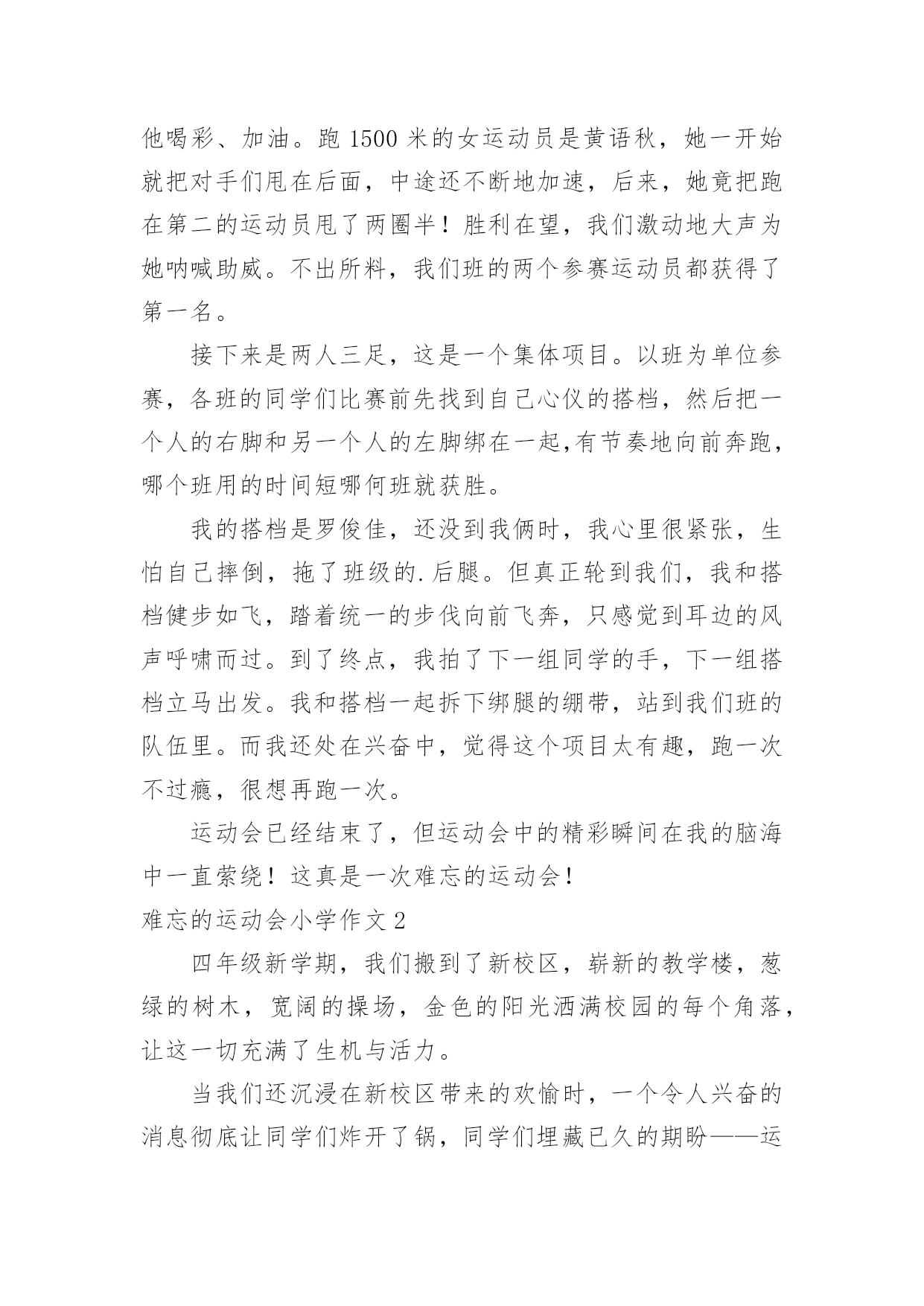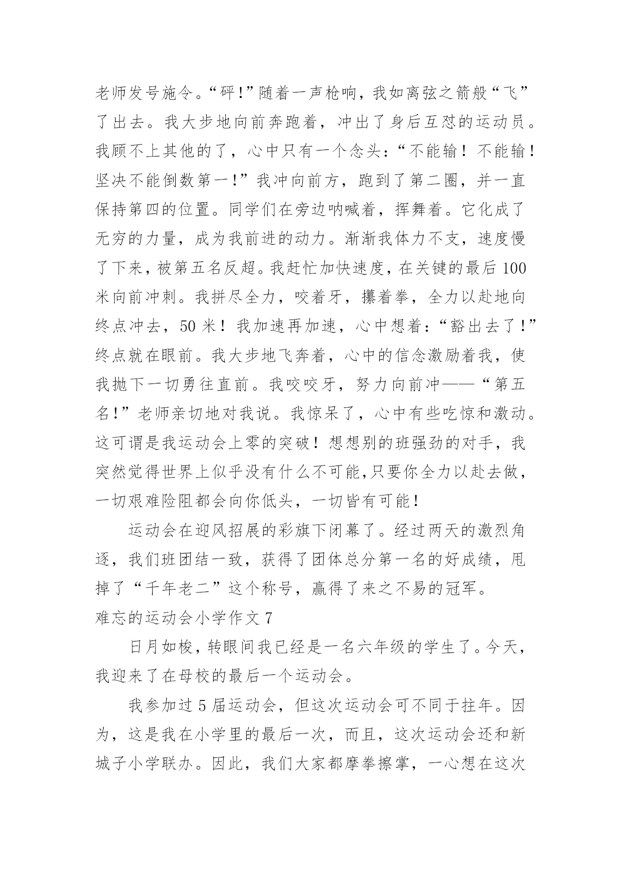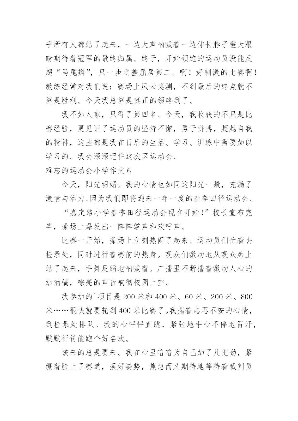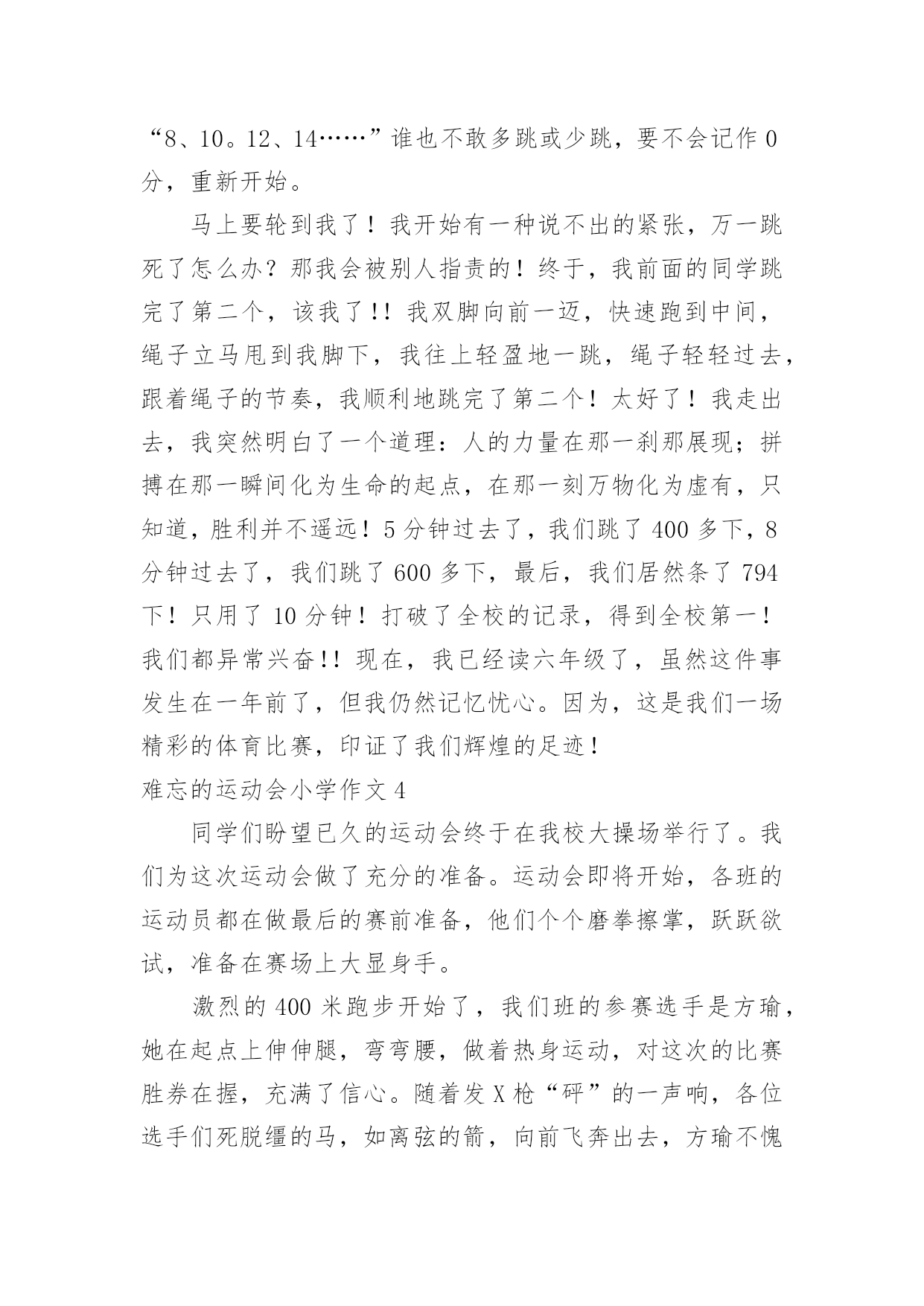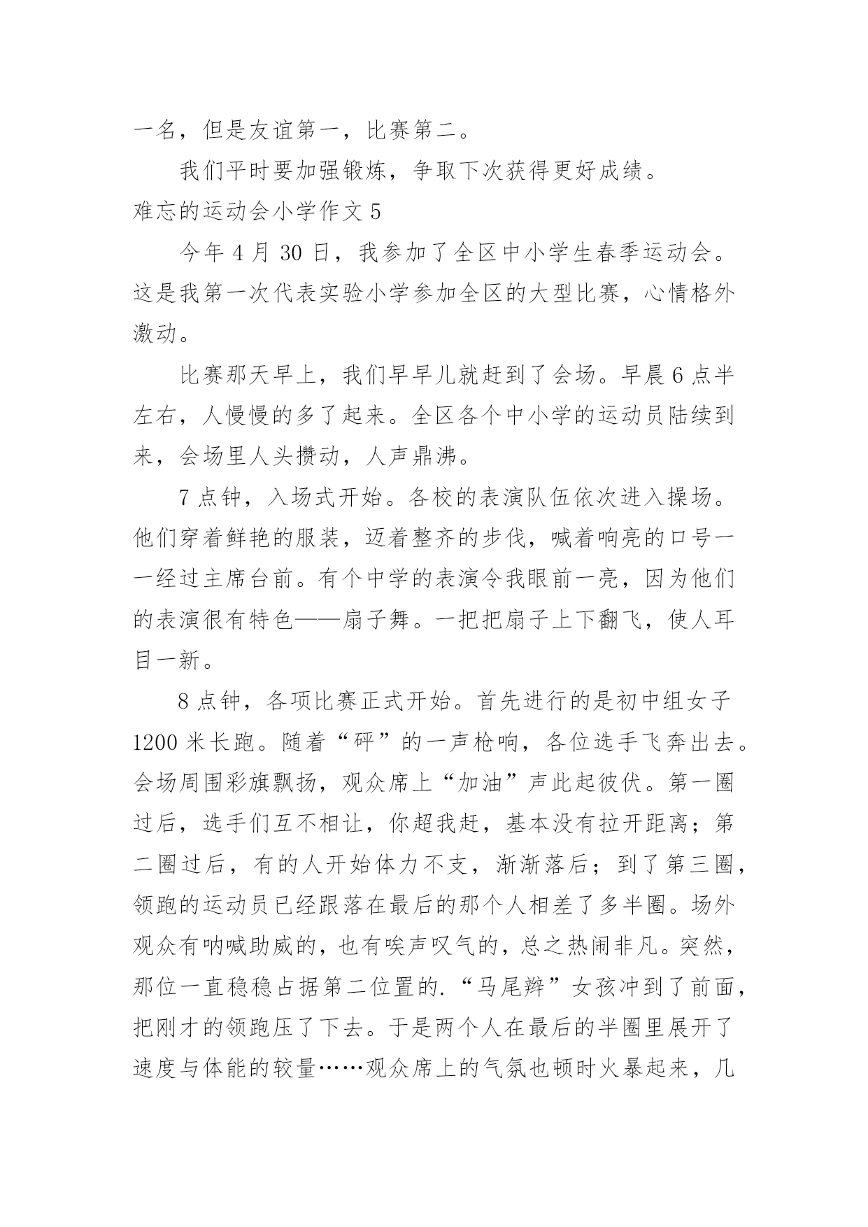 难忘的运动会小学作文难忘的运动会小学作文在日常学习、工作或生活中,大家总免不了要接触或使用作文吧,作文一定要做到主题集中,围绕同一主题作深入阐述,切忌东拉西扯,主题涣散甚至无主题。你知道作文怎样写才规范吗?以下是小编整理的难忘的运动会小学作文,希望对大家有所帮助。难忘的运动会小学作文1前不久,我们城北学校迎来了“乐步优身”体育节——第34届田径运动会。这一天,彩旗飘飘,广播里播放着刚劲有力的《运动员进行曲》。在副校长的讲话、裁判员的宣誓下,全校师生聚集在操场上,或参加比赛,或观看比赛。首先是1—6年级的运动员亮相,他们个个昂首挺胸,神气十足。瞧,345班的运动员们正面带微笑向我们走来,同学们都兴奋地向他们挥手,他们也热情地回应我们。在所有的比赛项目中,让我印象最深的是:1500米半决赛和两人三足。先说1500米半决赛吧,那时我正在看书,一位同学跟我说:“快去看,四年级的1500米半决赛要开始了!”我急忙跑到看比赛的地方,只见裁判员发令枪一响,男运动员们就像一只只离弦的箭,“嗖”地一声冲出起点。我们班的参赛选手是戴悦民,他一直遥遥领先,同学们都为他喝彩、加油。跑1500米的女运动员是黄语秋,她一开始就把对手们甩在后面,中途还不断地加速,后来,她竟把跑在第二的运动员甩了两圈半!胜利在望,我们激动地大声为她呐喊助威。不出所料,我们班的两个参赛运动员都获得了第一名。接下来是两人三足,这是一个集体项目。以班为单位参赛,各班的同学们比赛前先找到自己心仪的搭档,然后把一个人的右脚和另一个人的左脚绑在一起,有节奏地向前奔跑,哪个班用的时间短哪何班就获胜。我的搭档是罗俊佳,还没到我俩时,我心里很紧张,生怕自己摔倒,拖了班级的.后腿。但真正轮到我们,我和搭档健步如飞,踏着统一的步伐向前飞奔,只感觉到耳边的风声呼啸而过。到了终点,我拍了下一组同学的手,下一组搭档立马出发。我和搭档一起拆下绑腿的绷带,站到我们班的队伍里。而我还处在兴奋中,觉得这个项目太有趣,跑一次不过瘾,很想再跑一次。运动会已经结束了,但运动会中的精彩瞬间在我的脑海中一直萦绕!这真是一次难忘的运动会!难忘的运动会小学作文2四年级新学期,我们搬到了新校区,崭新的教学楼,葱绿的树木,宽阔的操场,金色的阳光洒满校园的每个角落,让这一切充满了生机与活力。当我们还沉浸在新校区带来的欢愉时,一个令人兴奋的消息彻底让同学们炸开了锅,同学们埋藏已久的期盼——运动会将要举行了。至此,我和同学们开启了兴奋模式,运动会的前几天个个兴致高涨,因为平时很少运动和锻炼,我和同学们为了在运动会上取得好成绩,利用课间休息,在走廊里加紧练习,有的跳绳,有的弹跳……俗话说“临阵磨枪,不快也光”嘛。运动会那天,我早早地来到学校,生怕错过了什么。精彩的开幕式结束后,紧张刺激的比赛终于开始了,由于我的参赛项目接力跳绳比赛时间比较靠后,正好可以先给同学们加油助威。随着一声发令枪响,800米赛跑开始了,运动员们像一支支离弦的箭,在环形赛道上向着终点飞奔而去,加油声、助威声此起彼伏,运动员们你追我赶,一个个面红耳赤,满头大汗,只见我的同学刘俊哲越跑越快,连超几人,快速冲向终点,取得了第一名的好成绩。那边的4×100米接力赛正紧张激烈地进行着,选手们一个个卯足了劲儿,要为自己的班级争光。当我看到同班同学落后时,在一旁急得双脚乱蹦,恨不得自己冲上前去。终于轮到我参加“跑跳绳比赛”了,站在赛场上,我才体会到选手们的心情,小心脏一个劲儿地“怦怦”直跳,手心全是汗,眼睛紧盯着跑跳过来的队友,接过跳绳,三步并作两步,只听见耳边呼呼的风声,生怕我的.缘故影响了全班的成绩,将跳绳交给下一个队友时,我才长长地舒了一口气。运动会结束后,那些没有取得名次的参赛同学流下了伤心的泪水,其他同学没有责怪他们,而是抱着痛哭的同学安慰、鼓励,争取下一次取得好成绩。虽然这次运动会我没有取得好成绩,但却给我和同学们深深地上了一课,让我们终生难忘,那就是要想在赛场上赢得冠军,光靠激情是不够的,只有平时多努力,才能“百炼成钢、厚积薄发”。难忘的运动会小学作文3令我难忘的往事黄卓悦往事像一粒粒珍珠,串起了七彩的童年。回忆过去,每个人都有许多难忘的故事。亲人的关爱,故乡的明月,儿时的童趣,都珍藏在我们这个记忆的大箱子中。我要讲的故事,是前年10月份,我们学校搞运动会的事。我刚上五年级不久,我们学校搞运动会,我很开心。让我刻骨铭心的是我们的长绳比赛,获得了全校冠军,就连六年级的哥哥姐姐都没能比过我们,这让我们很自豪。那是一个阳光灿烂的日子,运动场上,有着健儿们奋勇拼搏的身影;观众席上,响着拉拉队员摇旗助威的呐喊。这身影,凝聚周围责任的'力量;这呐喊,弥漫着友谊的芬芳。长绳比赛开始前,场上的叫喊声很大,我们班有41人参加,其中女生除了几个没参加,男生挑了几个跳得好的来参加。