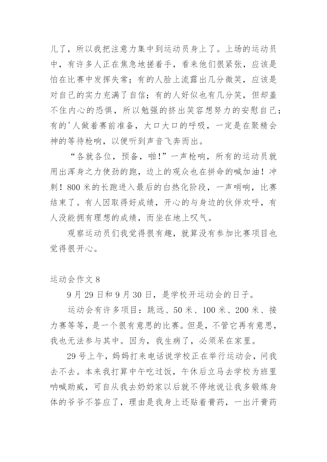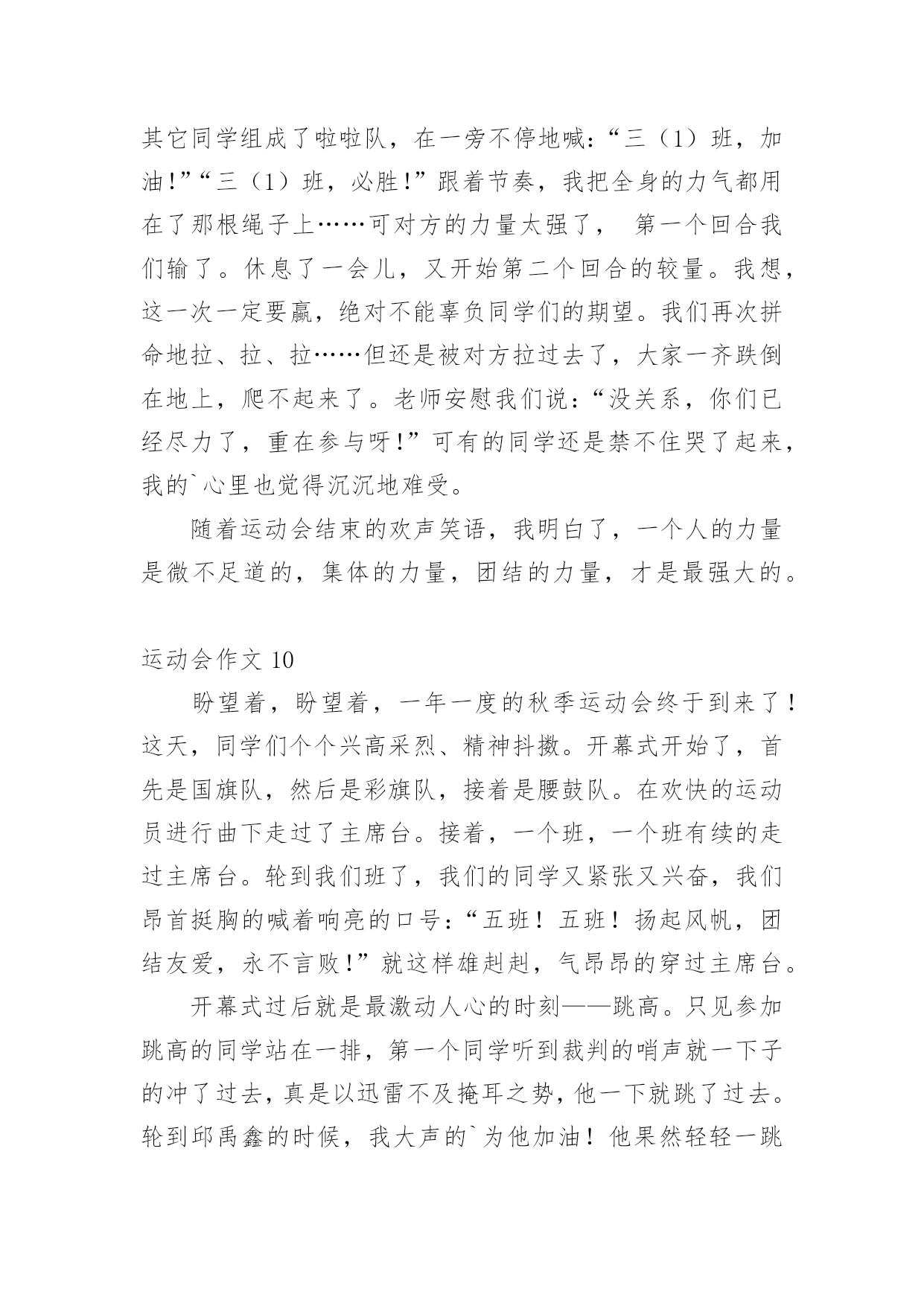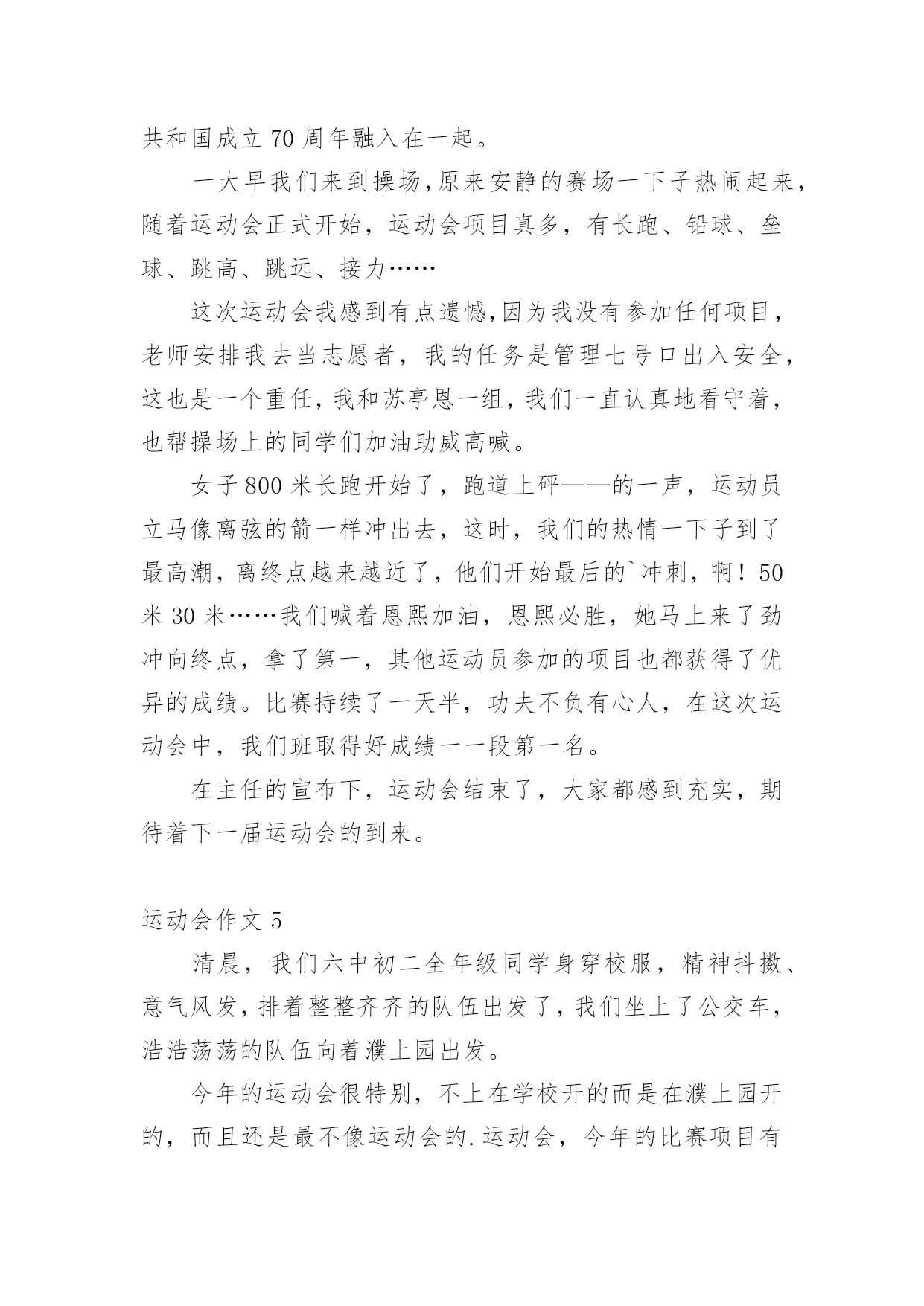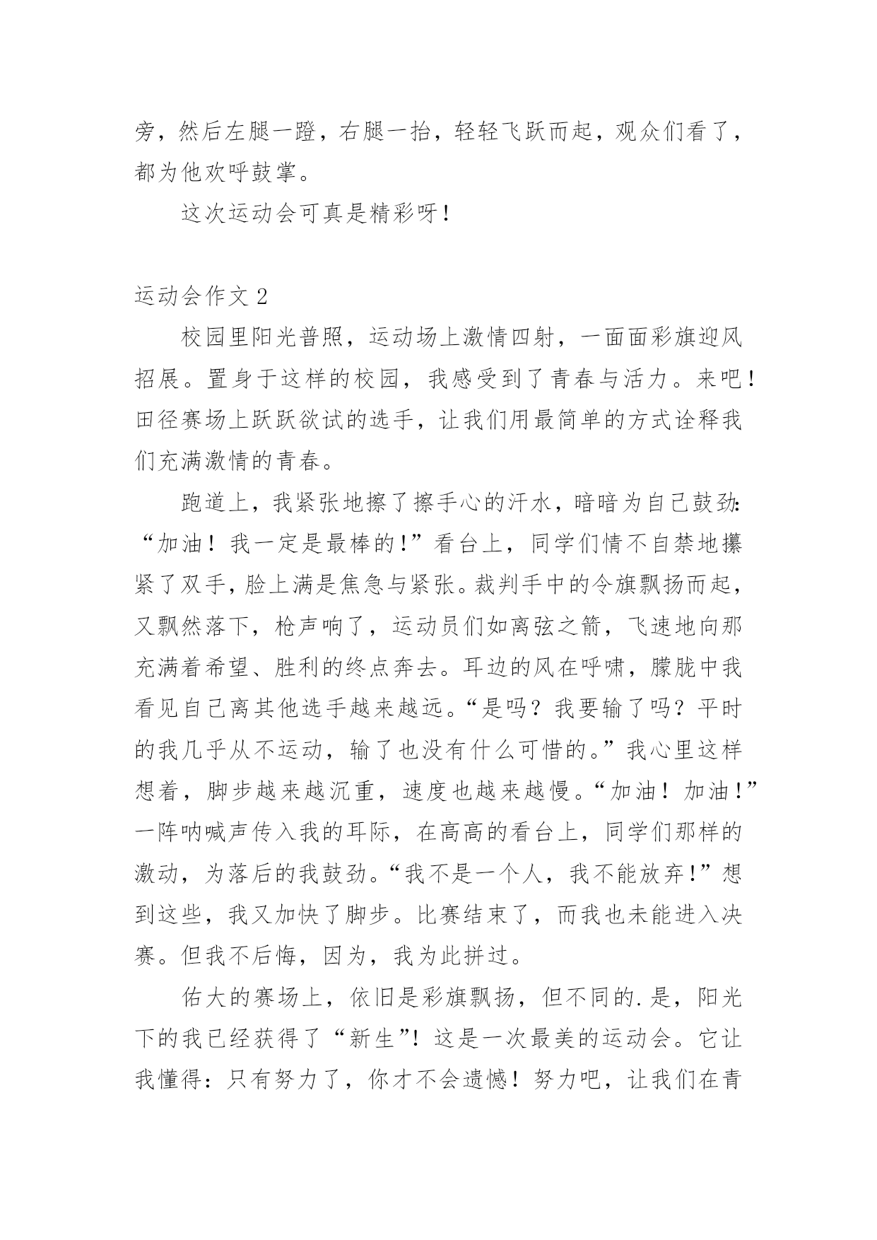 运动会作文在日常生活或是工作学习中,大家都写过作文吧,作文可分为小学作文、中学作文、大学作文(论文)。那么,怎么去写作文呢?以下是小编精心整理的运动会作文,仅供参考,大家一起来看看吧。运动会作文1又是一年百花争艳,又是一次龙腾虎跃。4月27日,凉风习习,瓯北五小第18届“亚龙”春季田径运动会举行了盛大的开幕式。我们排着整齐的队伍,来到崭新的操场上,首先进场的是一二年级方阵,接着,轮到我们三年级方阵了,我们信心满满地来到主席台前。听,音乐响起来了,我们拿着彩球,跳起欢快的`“健康操”,“左三圈,右三圈,脖子扭扭,屁股扭扭……”跳完舞,我们整齐地坐在操场中间,看着其他班表演。其中,给我印象最深刻的是四(2)班,他们先围成一圈,然后有一个名叫石子豪的同学站起来,跳起一段动感十足的街舞,帅气极了。接下来是跆拳道表演,只见其中一个人,竟然盲踢把一块木板踢裂了,大家惊叹不已。开幕式结束,运动会各项比赛正式开始了。我来到跳远场地,看见许瑜旋像风一样冲过去,迈开大步,然后踏在起跳板上,再纵身一跳,双脚稳稳地落在软软的沙坑里。紧接着,我来到跳高的场地,只见潘泳辰快速冲到横杠旁,然后左腿一蹬,右腿一抬,轻轻飞跃而起,观众们看了,都为他欢呼鼓掌。这次运动会可真是精彩呀!运动会作文2校园里阳光普照,运动场上激情四射,一面面彩旗迎风招展。置身于这样的校园,我感受到了青春与活力。来吧!田径赛场上跃跃欲试的选手,让我们用最简单的方式诠释我们充满激情的青春。跑道上,我紧张地擦了擦手心的汗水,暗暗为自己鼓劲:“加油!我一定是最棒的!”看台上,同学们情不自禁地攥紧了双手,脸上满是焦急与紧张。裁判手中的令旗飘扬而起,又飘然落下,枪声响了,运动员们如离弦之箭,飞速地向那充满着希望、胜利的终点奔去。耳边的风在呼啸,朦胧中我看见自己离其他选手越来越远。“是吗?我要输了吗?平时的我几乎从不运动,输了也没有什么可惜的。”我心里这样想着,脚步越来越沉重,速度也越来越慢。“加油!加油!”一阵呐喊声传入我的耳际,在高高的看台上,同学们那样的激动,为落后的我鼓劲。“我不是一个人,我不能放弃!”想到这些,我又加快了脚步。比赛结束了,而我也未能进入决赛。但我不后悔,因为,我为此拼过。佑大的赛场上,依旧是彩旗飘扬,但不同的.是,阳光下的我已经获得了“新生”!这是一次最美的运动会。它让我懂得:只有努力了,你才不会遗憾!努力吧,让我们在青春的舞台上,绽放出自己最美的“生命之花”!运动会作文3这个星期是我们学校举办的运动会,我很荣幸地被选为了实心球项目的运动员,我的心里无比激动,这样能让我展现自己和发挥自己的实力。经过两个星期的锻炼,我掌握了扔实心球的技巧,马上要举行实心球比赛了,我非常紧张,紧张得仿佛心跳都加速了一百倍似的,毕竟这是我第一次参加运动会。当老师喊道:“4208号”的`时候,我慌张地看了一眼自己的号码布,心想:这么快就轮到了,我急忙拿起一个在水里洗过的实心球,只听见老师一声“开始”,我把实心球高高地举到背后,右脚往后跨一步,用力把球扔了出去。球刚飞起就落下了。老师用卷尺量了一下距离是7米42,看成绩好像还不错,我松了一口气,经过了两轮激烈的比赛,我和人高马大的周浩轩进入了决赛。决赛开始了,同学们一个个自信满满,个个奋力拼搏,想要取得的好成绩。我用了九牛二虎之力,取得了第四名的好成绩,虽然成绩不理想,但是下次我也要争取参加,取得好成绩。明年的运动会上,我希望自己可以比今年表现得更好!运动会作文4在这秋高气爽的九月里,我们迎来了欢乐精彩的校运动会。这次运动会和往常不一样,特殊的是,和庆祝中华人民共和国成立70周年融入在一起。一大早我们来到操场,原来安静的赛场一下子热闹起来,随着运动会正式开始,运动会项目真多,有长跑、铅球、垒球、跳高、跳远、接力……这次运动会我感到有点遗憾,因为我没有参加任何项目,老师安排我去当志愿者,我的任务是管理七号口出入安全,这也是一个重任,我和苏亭恩一组,我们一直认真地看守着,也帮操场上的同学们加油助威高喊。女子800米长跑开始了,跑道上砰——的一声,运动员立马像离弦的箭一样冲出去,这时,我们的热情一下子到了最高潮,离终点越来越近了,他们开始最后的`冲刺,啊!50米30米……我们喊着恩熙加油,恩熙必胜,她马上来了劲冲向终点,拿了第一,其他运动员参加的项目也都获得了优异的成绩。比赛持续了一天半,功夫不负有心人,在这次运动会中,我们班取得好成绩一一段第一名。在主任的宣布下,运动会结束了,大家都感到充实,期待着下一届运动会的到来。运动会作文5清晨,我们六中初二全年级同学身穿校服,精神抖擞、意气风发,排着整整齐齐的队伍出发了,我们坐上了公交车,浩浩荡荡的队伍向着濮上园出发。今年的运动会很特别,不上在学校开的而是在濮上园开的,而且还是最不像运动会的.运动会,今年的比