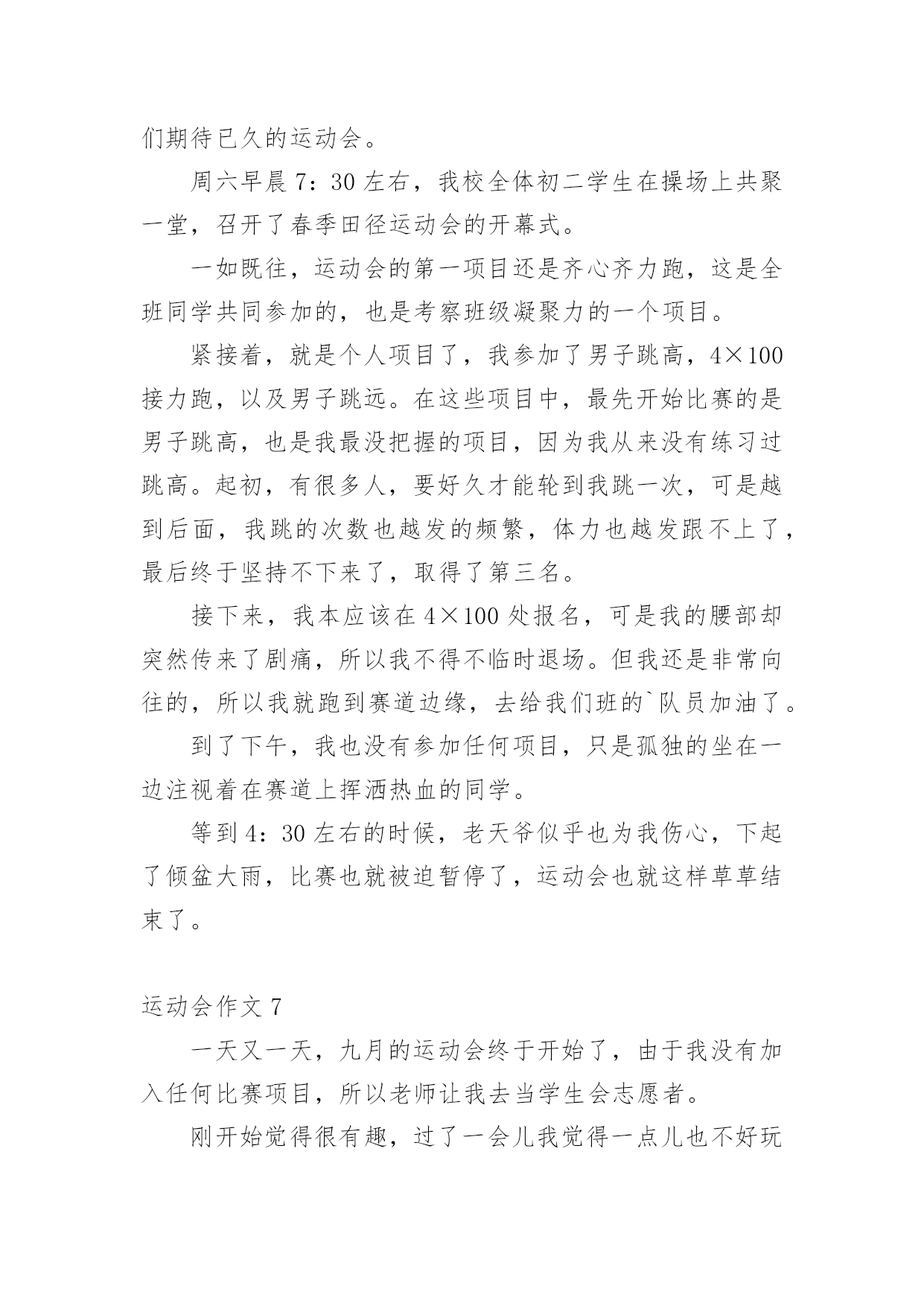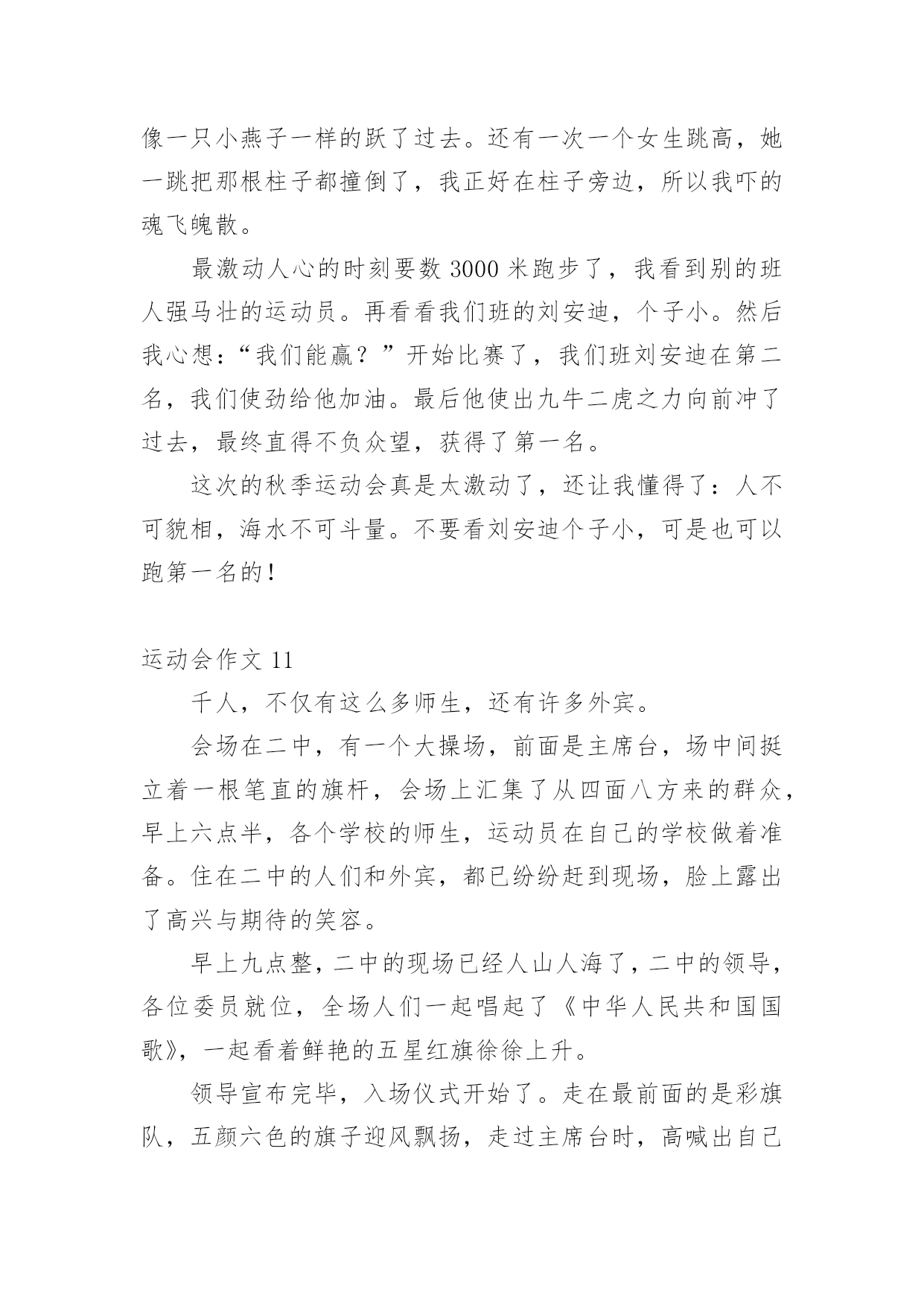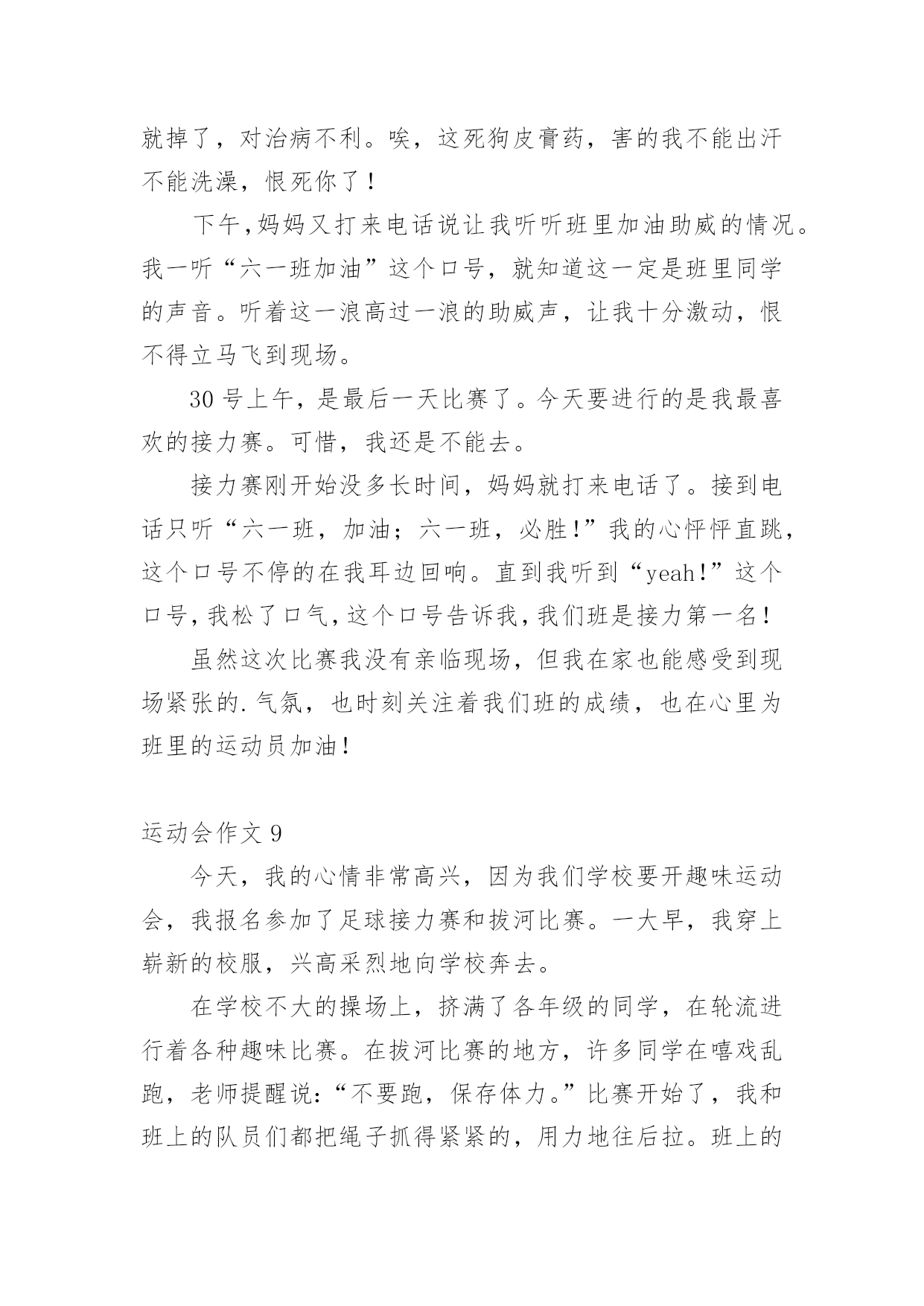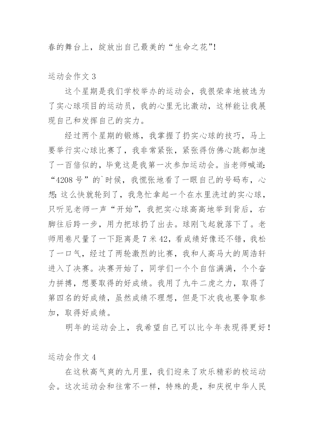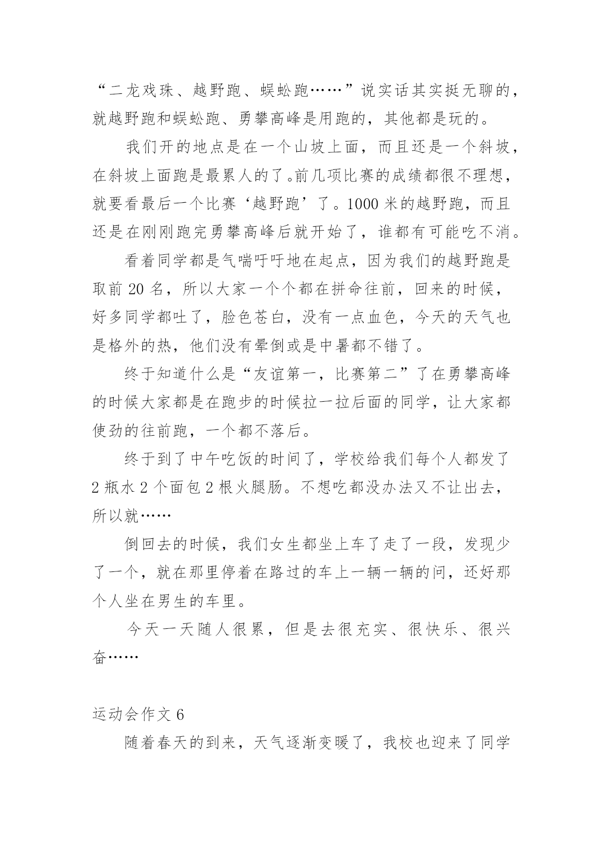运动会作文在日常生活或是工作学习中,大家都写过作文吧,作文可分为小学作文、中学作文、大学作文(论文)。那么,怎么去写作文呢?以下是小编精心整理的运动会作文,仅供参考,大家一起来看看吧。运动会作文1又是一年百花争艳,又是一次龙腾虎跃。4月27日,凉风习习,瓯北五小第18届“亚龙”春季田径运动会举行了盛大的开幕式。我们排着整齐的队伍,来到崭新的操场上,首先进场的是一二年级方阵,接着,轮到我们三年级方阵了,我们信心满满地来到主席台前。听,音乐响起来了,我们拿着彩球,跳起欢快的`“健康操”,“左三圈,右三圈,脖子扭扭,屁股扭扭……”跳完舞,我们整齐地坐在操场中间,看着其他班表演。其中,给我印象最深刻的是四(2)班,他们先围成一圈,然后有一个名叫石子豪的同学站起来,跳起一段动感十足的街舞,帅气极了。接下来是跆拳道表演,只见其中一个人,竟然盲踢把一块木板踢裂了,大家惊叹不已。开幕式结束,运动会各项比赛正式开始了。我来到跳远场地,看见许瑜旋像风一样冲过去,迈开大步,然后踏在起跳板上,再纵身一跳,双脚稳稳地落在软软的沙坑里。紧接着,我来到跳高的场地,只见潘泳辰快速冲到横杠旁,然后左腿一蹬,右腿一抬,轻轻飞跃而起,观众们看了,都为他欢呼鼓掌。这次运动会可真是精彩呀!运动会作文2校园里阳光普照,运动场上激情四射,一面面彩旗迎风招展。置身于这样的校园,我感受到了青春与活力。来吧!田径赛场上跃跃欲试的选手,让我们用最简单的方式诠释我们充满激情的青春。跑道上,我紧张地擦了擦手心的汗水,暗暗为自己鼓劲:“加油!我一定是最棒的!”看台上,同学们情不自禁地攥紧了双手,脸上满是焦急与紧张。裁判手中的令旗飘扬而起,又飘然落下,枪声响了,运动员们如离弦之箭,飞速地向那充满着希望、胜利的终点奔去。耳边的风在呼啸,朦胧中我看见自己离其他选手越来越远。“是吗?我要输了吗?平时的我几乎从不运动,输了也没有什么可惜的。”我心里这样想着,脚步越来越沉重,速度也越来越慢。“加油!加油!”一阵呐喊声传入我的耳际,在高高的看台上,同学们那样的激动,为落后的我鼓劲。“我不是一个人,我不能放弃!”想到这些,我又加快了脚步。比赛结束了,而我也未能进入决赛。但我不后悔,因为,我为此拼过。佑大的赛场上,依旧是彩旗飘扬,但不同的.是,阳光下的我已经获得了“新生”!这是一次最美的运动会。它让我懂得:只有努力了,你才不会遗憾!努力吧,让我们在青春的舞台上,绽放出自己最美的“生命之花”!运动会作文3这个星期是我们学校举办的运动会,我很荣幸地被选为了实心球项目的运动员,我的心里无比激动,这样能让我展现自己和发挥自己的实力。经过两个星期的锻炼,我掌握了扔实心球的技巧,马上要举行实心球比赛了,我非常紧张,紧张得仿佛心跳都加速了一百倍似的,毕竟这是我第一次参加运动会。当老师喊道:“4208号”的`时候,我慌张地看了一眼自己的号码布,心想:这么快就轮到了,我急忙拿起一个在水里洗过的实心球,只听见老师一声“开始”,我把实心球高高地举到背后,右脚往后跨一步,用力把球扔了出去。球刚飞起就落下了。老师用卷尺量了一下距离是7米42,看成绩好像还不错,我松了一口气,经过了两轮激烈的比赛,我和人高马大的周浩轩进入了决赛。决赛开始了,同学们一个个自信满满,个个奋力拼搏,想要取得的好成绩。我用了九牛二虎之力,取得了第四名的好成绩,虽然成绩不理想,但是下次我也要争取参加,取得好成绩。明年的运动会上,我希望自己可以比今年表现得更好!运动会作文4在这秋高气爽的九月里,我们迎来了欢乐精彩的校运动会。这次运动会和往常不一样,特殊的是,和庆祝中华人民共和国成立70周年融入在一起。一大早我们来到操场,原来安静的赛场一下子热闹起来,随着运动会正式开始,运动会项目真多,有长跑、铅球、垒球、跳高、跳远、接力……这次运动会我感到有点遗憾,因为我没有参加任何项目,老师安排我去当志愿者,我的任务是管理七号口出入安全,这也是一个重任,我和苏亭恩一组,我们一直认真地看守着,也帮操场上的同学们加油助威高喊。女子800米长跑开始了,跑道上砰——的一声,运动员立马像离弦的箭一样冲出去,这时,我们的热情一下子到了最高潮,离终点越来越近了,他们开始最后的`冲刺,啊!50米30米……我们喊着恩熙加油,恩熙必胜,她马上来了劲冲向终点,拿了第一,其他运动员参加的项目也都获得了优异的成绩。比赛持续了一天半,功夫不负有心人,在这次运动会中,我们班取得好成绩一一段第一名。在主任的宣布下,运动会结束了,大家都感到充实,期待着下一届运动会的到来。运动会作文5清晨,我们六中初二全年级同学身穿校服,精神抖擞、意气风发,排着整整齐齐的队伍出发了,我们坐上了公交车,浩浩荡荡的队伍向着濮上园出发。今年的运动会很特别,不上在学校开的而是在濮上园开的,而且还是最不像运动会的.运动会,今年的比