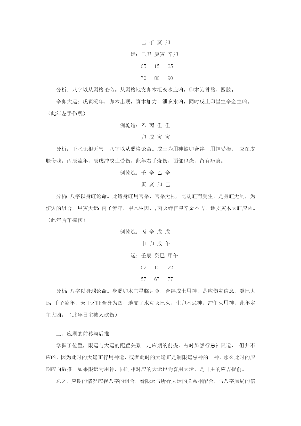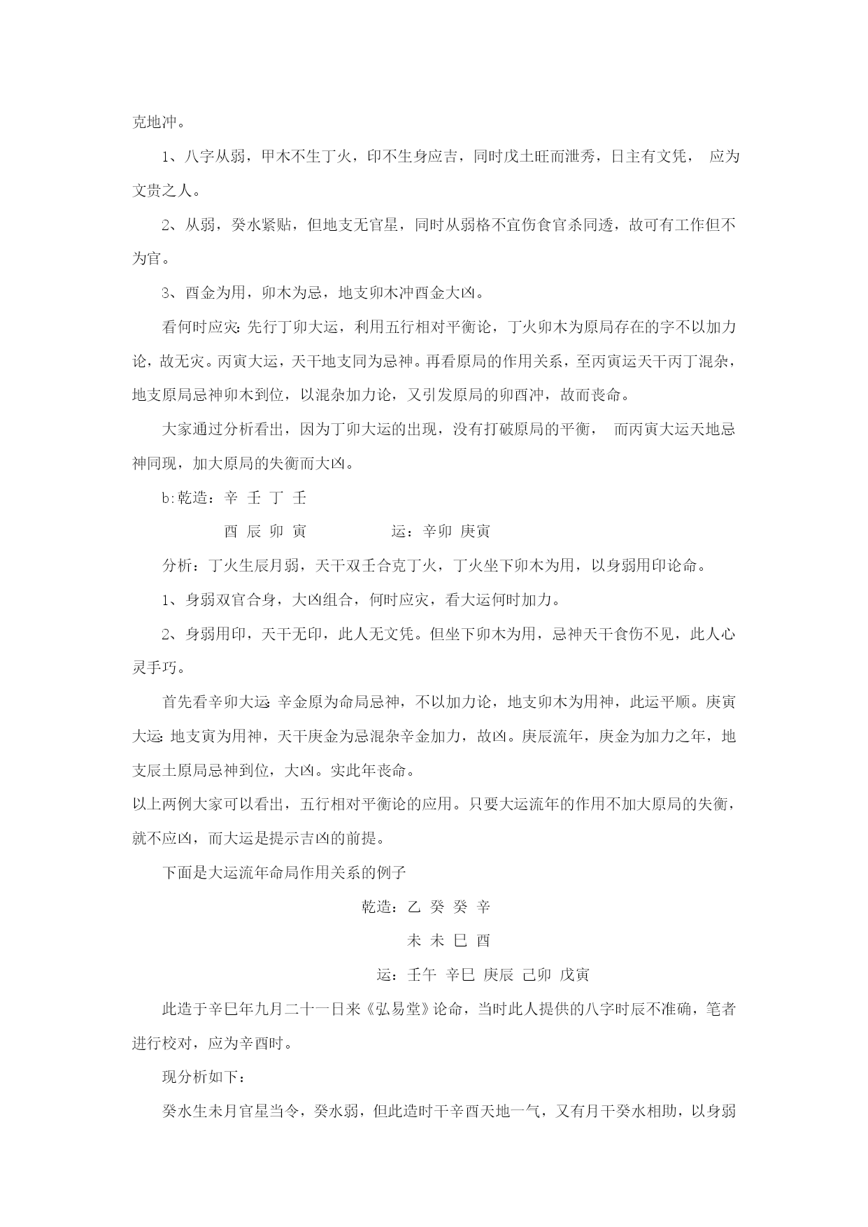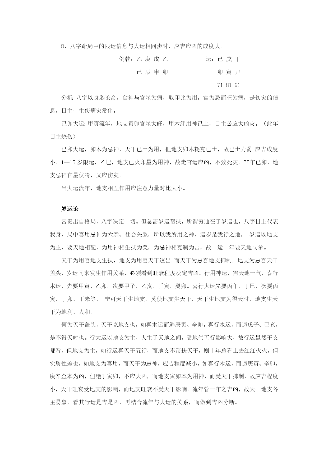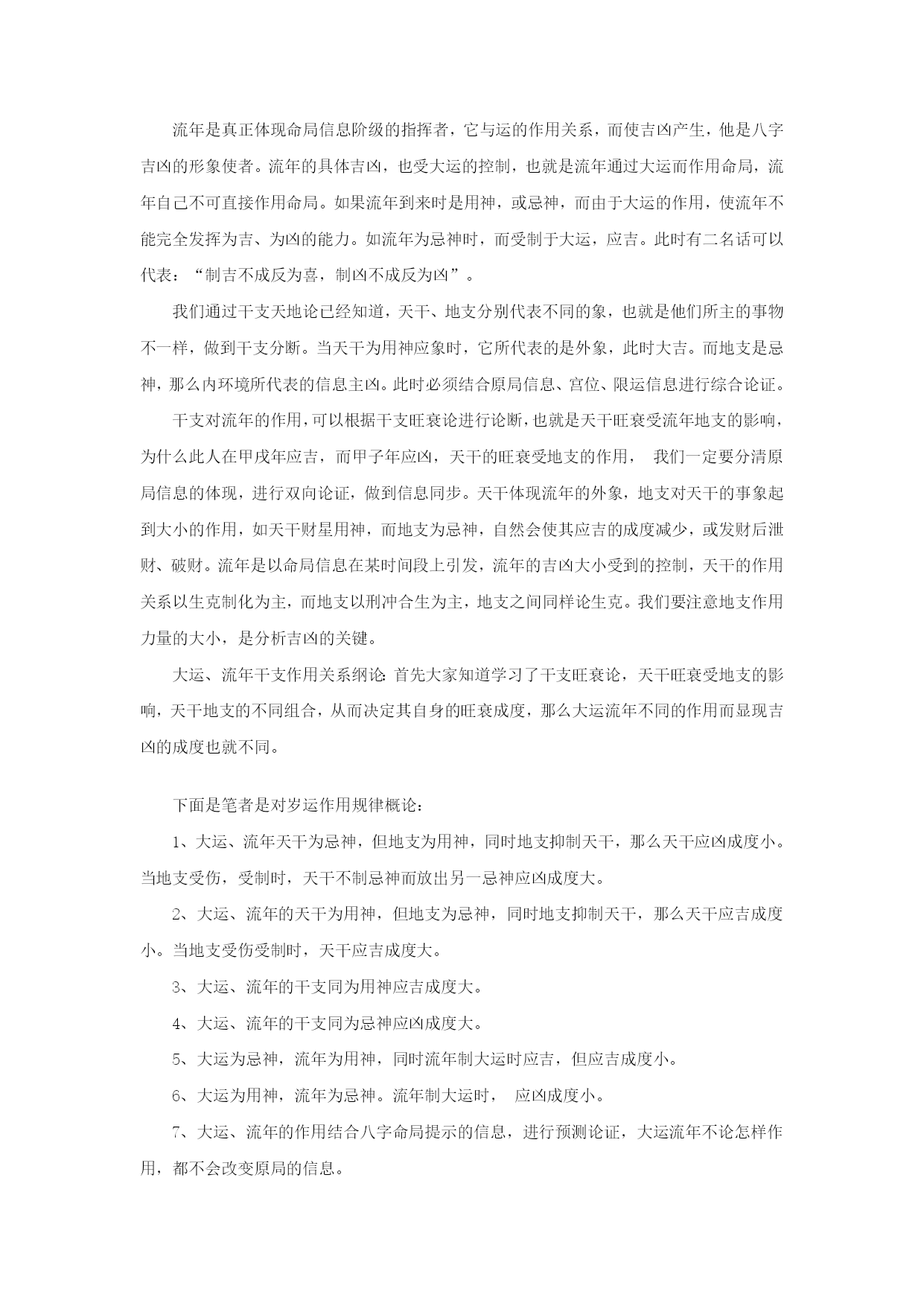 欢迎光临玄玄网易论坛HYPERLINK"http://www.zyyuce.net/bbs/get.asp?get=24"http://www.zyyuce.net/bbs/get.asp?get=24HYPERLINK"http://www.zyyuce.net/bbs/index.asp"http://www.zyyuce.net/bbs/index.asp八字实战讲义赵知易孙海义著张宇审校大运流年八字命局细论一、八字命局命局是一个庞大的信息库,八字日主的富贵贫贱,寿夭荣枯,包括六亲的整体信息,这些信息是与生俱来的,是不可更改的,这些信息不会随岁运的变化而变化,而是经过岁运来体现。因此分析命局是八字预测的第一关,从原局确定日主的先天信息,而不能通过岁运来分析,只有通过岁运的变化来实现,一个不为官的八字,即使走在好的运岁也不可能为官,只是比较平顺而已。八字是富贵双全的八字,走到吉运就会发财、升官是必然的。走到败运,也只是生活、工作不顺罢了。我们学习命理,进行预测,全面分析是至关重要的。只有思路清晰地分析全面,知道目前的状况,与基本情况才能在岁运表现,否则预测的准确度是没有的。二、大运是十年的行政长官,是对命局信息的体现,对命中的用神、忌神起到扶抑作用,但不是走用神运十年全部应吉,它只是提示此阶段大致的吉凶。而真正流年的吉凶,要视大运、流年的作用结果而定。如果八字日主有为官的信息,那么行运阶段正好生扶官星,或原局官为忌神受制,而行制官运,那么日主就会升官。假如日主有发财信息,此大运正好生扶此信息,那么日主发财。我们一定要搞清楚,大运只是对命局信息的体现,把命局中吉凶信息,真正在人生舞台上的体现,不要去分析大运而定人富贵贫贱。三、流年流年是真正体现命局信息阶级的指挥者,它与运的作用关系,而使吉凶产生,他是八字吉凶的形象使者。流年的具体吉凶,也受大运的控制,也就是流年通过大运而作用命局,流年自己不可直接作用命局。如果流年到来时是用神,或忌神,而由于大运的作用,使流年不能完全发挥为吉、为凶的能力。如流年为忌神时,而受制于大运,应吉。此时有二名话可以代表:“制吉不成反为喜,制凶不成反为凶”。我们通过干支天地论已经知道,天干、地支分别代表不同的象,也就是他们所主的事物不一样,做到干支分断。当天干为用神应象时,它所代表的是外象,此时大吉。而地支是忌神,那么内环境所代表的信息主凶。此时必须结合原局信息、宫位、限运信息进行综合论证。干支对流年的作用,可以根据干支旺衰论进行论断,也就是天干旺衰受流年地支的影响,为什么此人在甲戌年应吉,而甲子年应凶,天干的旺衰受地支的作用,我们一定要分清原局信息的体现,进行双向论证,做到信息同步。天干体现流年的外象,地支对天干的事象起到大小的作用,如天干财星用神,而地支为忌神,自然会使其应吉的成度减少,或发财后泄财、破财。流年是以命局信息在某时间段上引发,流年的吉凶大小受到的控制,天干的作用关系以生克制化为主,而地支以刑冲合生为主,地支之间同样论生克。我们要注意地支作用力量的大小,是分析吉凶的关键。大运、流年干支作用关系纲论:首先大家知道学习了干支旺衰论,天干旺衰受地支的影响,天干地支的不同组合,从而决定其自身的旺衰成度,那么大运流年不同的作用而显现吉凶的成度也就不同。下面是笔者是对岁运作用规律概论:1、大运、流年天干为忌神,但地支为用神,同时地支抑制天干,那么天干应凶成度小。当地支受伤,受制时,天干不制忌神而放出另一忌神应凶成度大。2、大运、流年的天干为用神,但地支为忌神,同时地支抑制天干,那么天干应吉成度小。当地支受伤受制时,天干应吉成度大。3、大运、流年的干支同为用神应吉成度大。4、大运、流年的干支同为忌神应凶成度大。5、大运为忌神,流年为用神,同时流年制大运时应吉,但应吉成度小。6、大运为用神,流年为忌神。流年制大运时,应凶成度小。7、大运、流年的作用结合八字命局提示的信息,进行预测论证,大运流年不论怎样作用,都不会改变原局的信息。8、八字命局中的限运信息与大运相同步时,应吉应凶的成度大。例乾:乙庚戊乙运:已戊丁已辰申卯卯寅丑718191分析:八字以身弱论命,食神与官星为病,取印比为用。官为忌而旺为病,是伤灾的信息,日主一生伤病灾常伴。已卯大运:甲寅流年,地支寅卯官星大旺,甲木绊用神已土,日主必应大凶灾。(此年日主烧伤)已卯大运,卯木为忌神,天干已土为用,但地支卯木耗克已土,故已土力弱应吉成度小。1--15岁限运,乙巳,地支已火印星为用神,故走官运应凶,不致死灾。75年已卯,地支忌神官星伏呤,又应伤灾。当大运流年,地支相互作用应注意力量对比大小。岁运论富贵出自格局,八字决定一切。但总需岁运帮扶,所谓穷通在于岁运也,八字日主代表我身,局中喜用忌神为六亲、社会关系,所以我所用之神