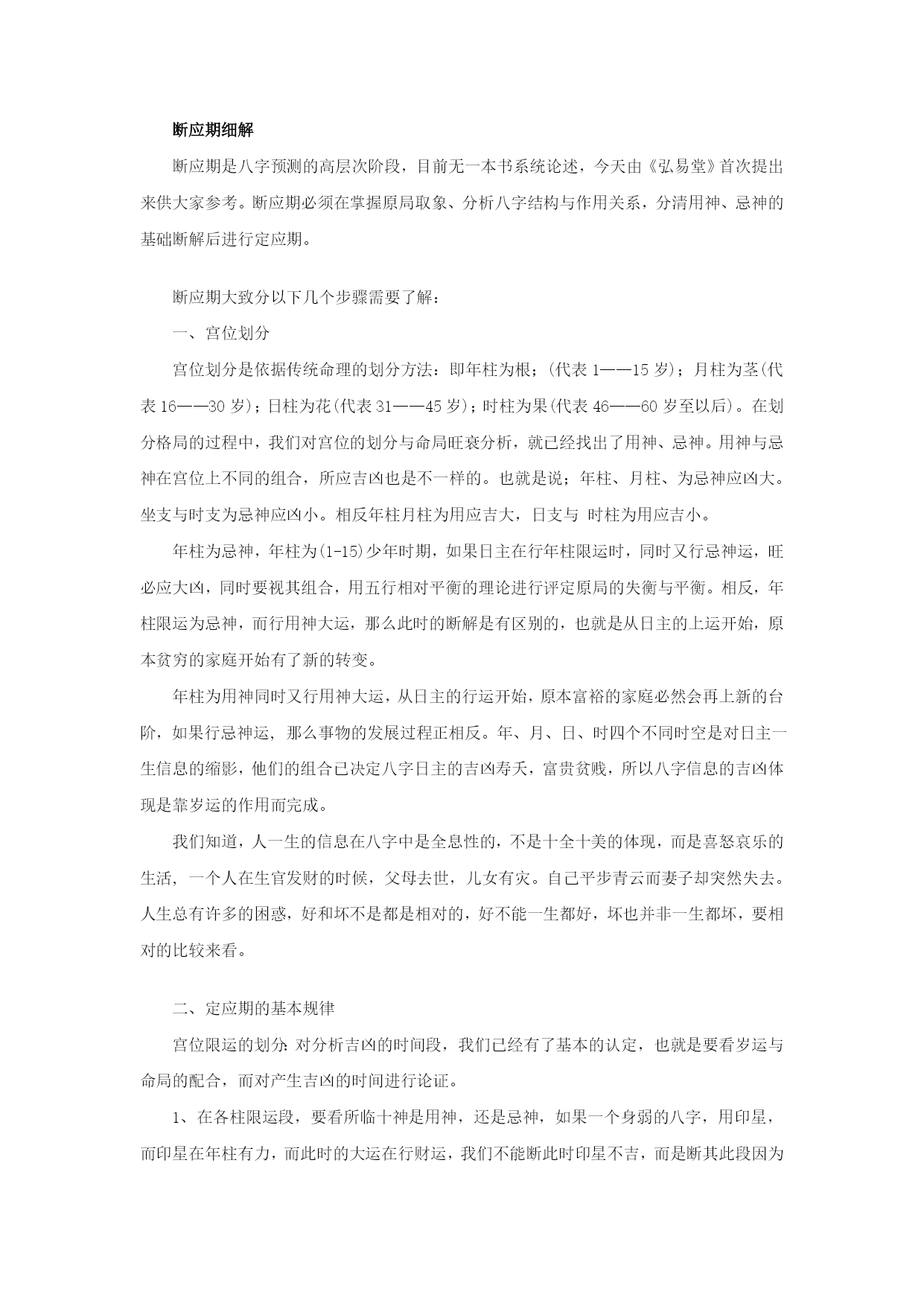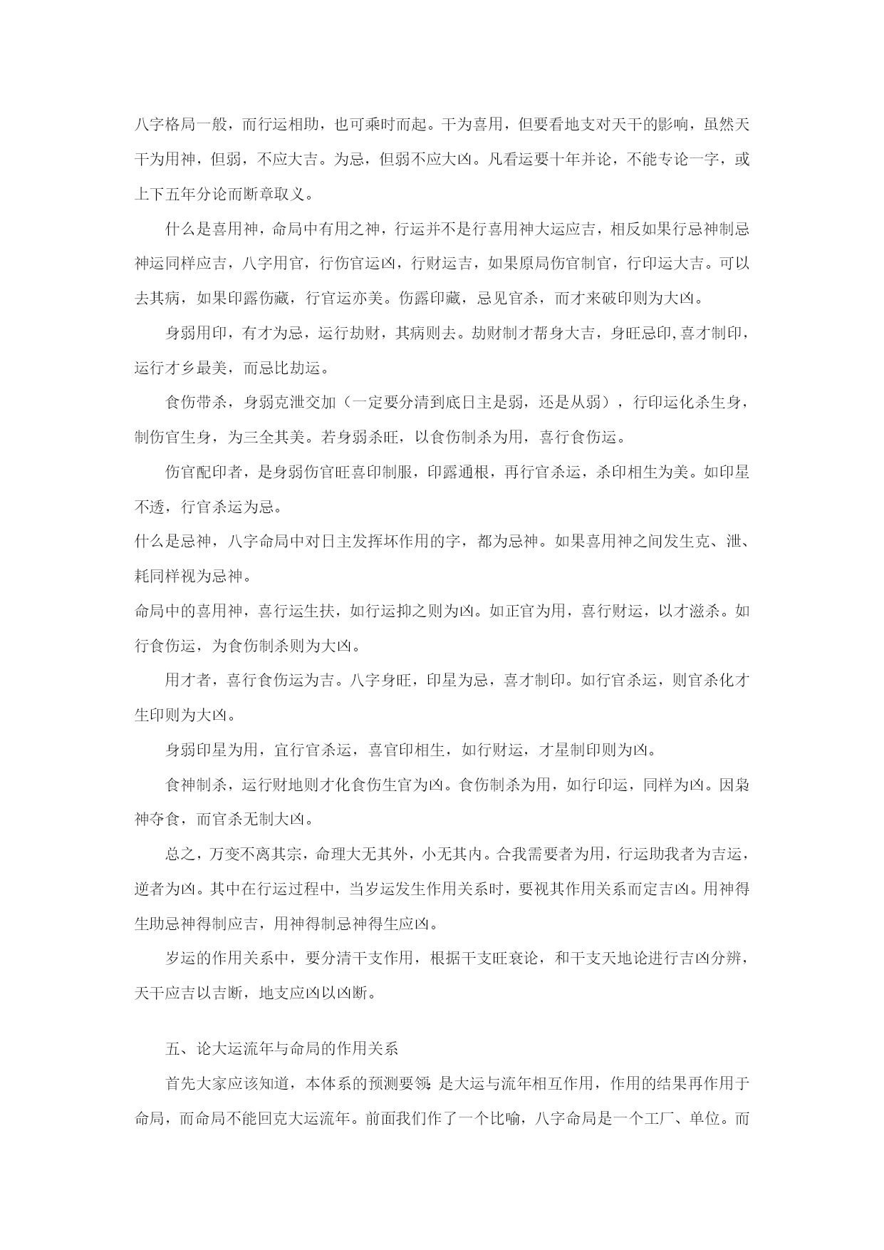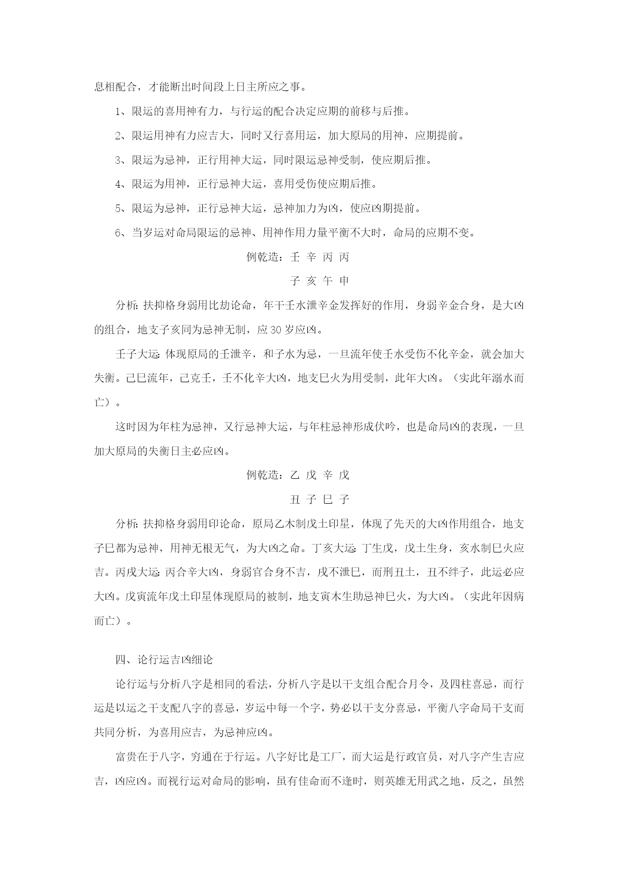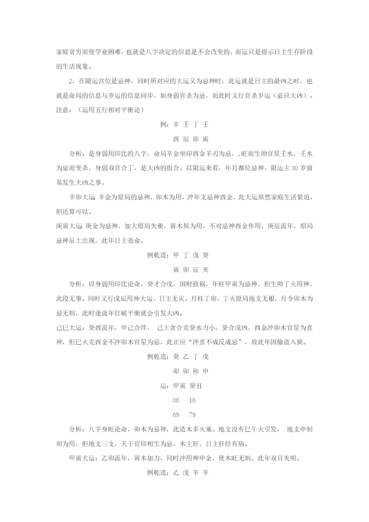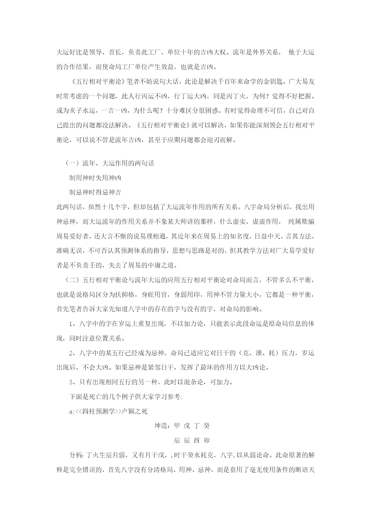 欢迎光临玄玄网易论坛HYPERLINK"http://www.zyyuce.net/bbs/get.asp?get=24"http://www.zyyuce.net/bbs/get.asp?get=24HYPERLINK"http://www.zyyuce.net/bbs/index.asp"http://www.zyyuce.net/bbs/index.asp八字实战讲义赵知易孙海义著张宇审校大运流年八字命局细论一、八字命局命局是一个庞大的信息库,八字日主的富贵贫贱,寿夭荣枯,包括六亲的整体信息,这些信息是与生俱来的,是不可更改的,这些信息不会随岁运的变化而变化,而是经过岁运来体现。因此分析命局是八字预测的第一关,从原局确定日主的先天信息,而不能通过岁运来分析,只有通过岁运的变化来实现,一个不为官的八字,即使走在好的运岁也不可能为官,只是比较平顺而已。八字是富贵双全的八字,走到吉运就会发财、升官是必然的。走到败运,也只是生活、工作不顺罢了。我们学习命理,进行预测,全面分析是至关重要的。只有思路清晰地分析全面,知道目前的状况,与基本情况才能在岁运表现,否则预测的准确度是没有的。二、大运是十年的行政长官,是对命局信息的体现,对命中的用神、忌神起到扶抑作用,但不是走用神运十年全部应吉,它只是提示此阶段大致的吉凶。而真正流年的吉凶,要视大运、流年的作用结果而定。如果八字日主有为官的信息,那么行运阶段正好生扶官星,或原局官为忌神受制,而行制官运,那么日主就会升官。假如日主有发财信息,此大运正好生扶此信息,那么日主发财。我们一定要搞清楚,大运只是对命局信息的体现,把命局中吉凶信息,真正在人生舞台上的体现,不要去分析大运而定人富贵贫贱。三、流年流年是真正体现命局信息阶级的指挥者,它与运的作用关系,而使吉凶产生,他是八字吉凶的形象使者。流年的具体吉凶,也受大运的控制,也就是流年通过大运而作用命局,流年自己不可直接作用命局。如果流年到来时是用神,或忌神,而由于大运的作用,使流年不能完全发挥为吉、为凶的能力。如流年为忌神时,而受制于大运,应吉。此时有二名话可以代表:“制吉不成反为喜,制凶不成反为凶”。我们通过干支天地论已经知道,天干、地支分别代表不同的象,也就是他们所主的事物不一样,做到干支分断。当天干为用神应象时,它所代表的是外象,此时大吉。而地支是忌神,那么内环境所代表的信息主凶。此时必须结合原局信息、宫位、限运信息进行综合论证。干支对流年的作用,可以根据干支旺衰论进行论断,也就是天干旺衰受流年地支的影响,为什么此人在甲戌年应吉,而甲子年应凶,天干的旺衰受地支的作用,我们一定要分清原局信息的体现,进行双向论证,做到信息同步。天干体现流年的外象,地支对天干的事象起到大小的作用,如天干财星用神,而地支为忌神,自然会使其应吉的成度减少,或发财后泄财、破财。流年是以命局信息在某时间段上引发,流年的吉凶大小受到的控制,天干的作用关系以生克制化为主,而地支以刑冲合生为主,地支之间同样论生克。我们要注意地支作用力量的大小,是分析吉凶的关键。大运、流年干支作用关系纲论:首先大家知道学习了干支旺衰论,天干旺衰受地支的影响,天干地支的不同组合,从而决定其自身的旺衰成度,那么大运流年不同的作用而显现吉凶的成度也就不同。下面是笔者是对岁运作用规律概论:1、大运、流年天干为忌神,但地支为用神,同时地支抑制天干,那么天干应凶成度小。当地支受伤,受制时,天干不制忌神而放出另一忌神应凶成度大。2、大运、流年的天干为用神,但地支为忌神,同时地支抑制天干,那么天干应吉成度小。当地支受伤受制时,天干应吉成度大。3、大运、流年的干支同为用神应吉成度大。4、大运、流年的干支同为忌神应凶成度大。5、大运为忌神,流年为用神,同时流年制大运时应吉,但应吉成度小。6、大运为用神,流年为忌神。流年制大运时,应凶成度小。7、大运、流年的作用结合八字命局提示的信息,进行预测论证,大运流年不论怎样作用,都不会改变原局的信息。8、八字命局中的限运信息与大运相同步时,应吉应凶的成度大。例乾:乙庚戊乙运:已戊丁已辰申卯卯寅丑718191分析:八字以身弱论命,食神与官星为病,取印比为用。官为忌而旺为病,是伤灾的信息,日主一生伤病灾常伴。已卯大运:甲寅流年,地支寅卯官星大旺,甲木绊用神已土,日主必应大凶灾。(此年日主烧伤)已卯大运,卯木为忌神,天干已土为用,但地支卯木耗克已土,故已土力弱应吉成度小。1--15岁限运,乙巳,地支已火印星为用神,故走官运应凶,不致死灾。75年已卯,地支忌神官星伏呤,又应伤灾。当大运流年,地支相互作用应注意力量对比大小。岁运论富贵出自格局,八字决定一切。但总需岁运帮扶,所谓穷通在于岁运也,八字日主代表我身,局中喜用忌神为六亲、社会关系,所以我所用之神
