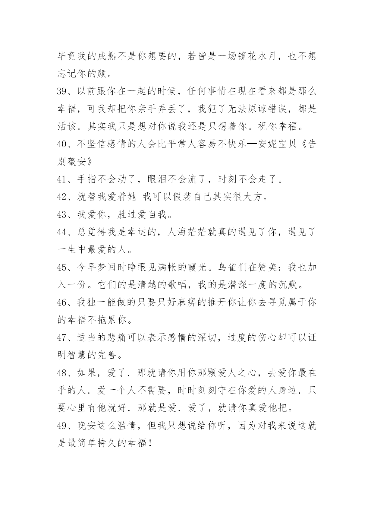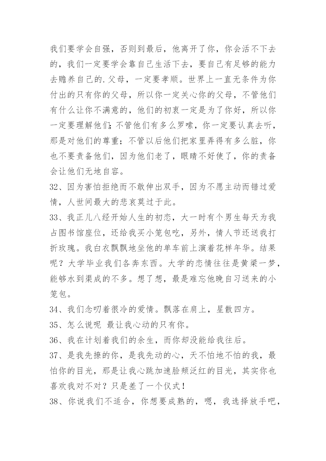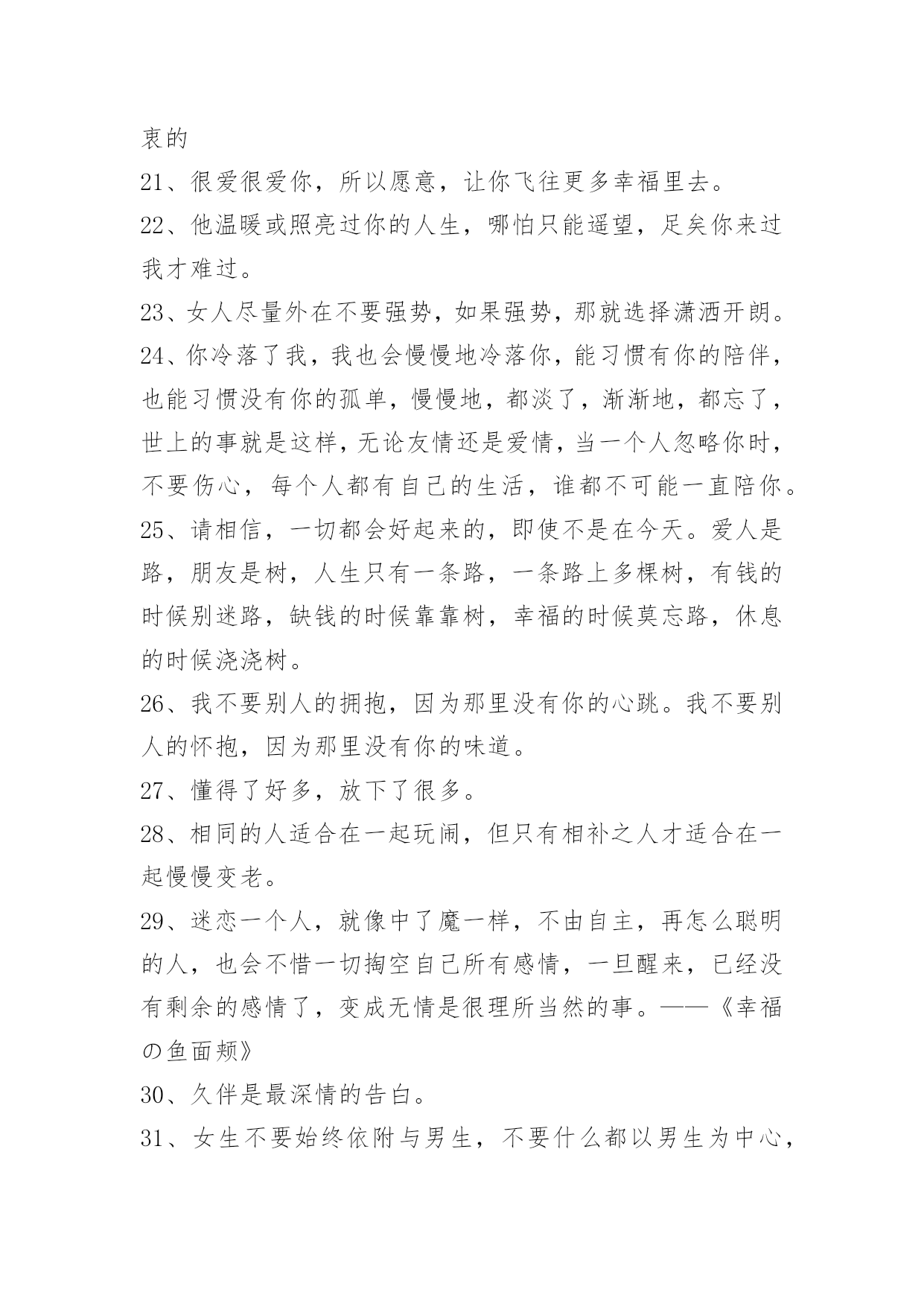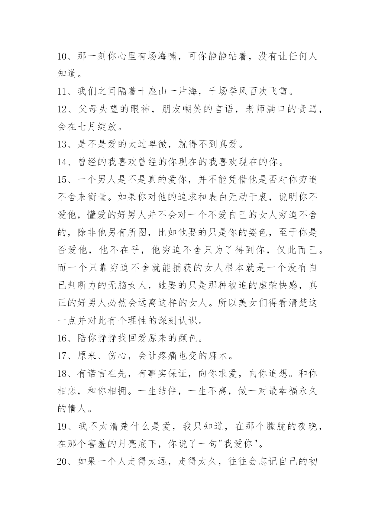 简洁的爱情语录49条简洁的爱情语录汇编49条是不是爱的太过卑微,就不会得到幸福。以下是小编给各位读者分享的爱情语录49条,欢迎大家前来欣赏。1、不管怎么样,相信我是爱你的。2、告诉自己不能闲下来,因为一闲下来,脑子里全部都是关于你。3、以后就别再打电话或是发短信,每天早晨用你泡的咖啡的香味叫我起床,行吗?4、女人想起一个男人,也许是因为一句话,一首歌,一个承诺。男人想起,也许是因为一个吻,一支舞,一场离别。这条温暖的信息,让你记起了我——"天冷了,穿衣服啦"。5、当我们互相理解得越多,互相学习得越多,感动和成长就越多。我们不是在想象和文字中构建爱情的意义、生命的意义。爱的意义是在互相理解、代人着想、真心付出中构建起来的。6、把烦恼写在纸上,装进玻璃瓶,投入河中,越远越好,瓶子不见了,你的烦恼也走了。7、我不要你的全部,只要你的无名指;我不能给你我的全部,只有一个结婚戒指。8、即使下一秒我们没有相遇,上一秒我们也会相见。9、我以为一个人可以很快乐,没想到却是寂寞横生。10、那一刻你心里有场海啸,可你静静站着,没有让任何人知道。11、我们之间隔着十座山一片海,千场季风百次飞雪。12、父母失望的眼神,朋友嘲笑的言语,老师满口的责骂,会在七月绽放。13、是不是爱的太过卑微,就得不到真爱。14、曾经的我喜欢曾经的你现在的我喜欢现在的你。15、一个男人是不是真的爱你,并不能凭借他是否对你穷追不舍来衡量。如果你对他的追求和表白无动于衷,说明你不爱他,懂爱的好男人并不会对一个不爱自已的女人穷追不舍的,除非他另有所图,比如他要的只是你的姿色,至于你是否爱他,他不在乎,他穷追不舍只为了得到你,仅此而已。而一个只靠穷追不舍就能捕获的女人根本就是一个没有自已判断力的无脑女人,她要的只是那种被追的虚荣快感,真正的好男人必然会远离这样的女人。所以美女们得看清楚这一点并对此有个理性的深刻认识。16、陪你静静找回爱原来的颜色。17、原来、伤心,会让疼痛也变的麻木。18、有诺言在先,有事实保证,向你求爱,向你追想。和你相恋,和你相拥。一生结伴,一生不离,做一对最幸福永久的情人。19、我不太清楚什么是爱,我只知道,在那个朦胧的夜晚,在那个害羞的月亮底下,你说了一句"我爱你"。20、如果一个人走得太远,走得太久,往往会忘记自己的初衷的21、很爱很爱你,所以愿意,让你飞往更多幸福里去。22、他温暖或照亮过你的人生,哪怕只能遥望,足矣你来过我才难过。23、女人尽量外在不要强势,如果强势,那就选择潇洒开朗。24、你冷落了我,我也会慢慢地冷落你,能习惯有你的陪伴,也能习惯没有你的孤单,慢慢地,都淡了,渐渐地,都忘了,世上的事就是这样,无论友情还是爱情,当一个人忽略你时,不要伤心,每个人都有自己的生活,谁都不可能一直陪你。25、请相信,一切都会好起来的,即使不是在今天。爱人是路,朋友是树,人生只有一条路,一条路上多棵树,有钱的时候别迷路,缺钱的时候靠靠树,幸福的时候莫忘路,休息的时候浇浇树。26、我不要别人的拥抱,因为那里没有你的心跳。我不要别人的怀抱,因为那里没有你的味道。27、懂得了好多,放下了很多。28、相同的人适合在一起玩闹,但只有相补之人才适合在一起慢慢变老。29、迷恋一个人,就像中了魔一样,不由自主,再怎么聪明的人,也会不惜一切掏空自己所有感情,一旦醒来,已经没有剩余的感情了,变成无情是很理所当然的事。——《幸福の鱼面颊》30、久伴是最深情的告白。31、女生不要始终依附与男生,不要什么都以男生为中心,我们要学会自强,否则到最后,他离开了你,你会活不下去的,我们一定要学会靠自己生活下去,要自己有足够的能力去赡养自己的.父母,一定要孝顺。世界上一直无条件为你付出的只有你的父母,所以你一定关心你的父母,不管他们有什么让你不满意的,他们的初衷一定是为了你好,所以你一定要理解他们;不管他们有多么罗嗦,你一定要认真去听,那是对他们的尊重;不管以后他们把家里弄得有多么脏,你也不要责备他们,因为他们老了,眼睛不好使了,你的责备会让他们无地自容。32、因为害怕拒绝而不敢伸出双手,因为不愿主动而错过爱情,人世间最大的悲哀莫过于此。33、我正儿八经开始人生的初恋,大一时有个男生每天为我占图书馆座位,还给我买小笼包吃,另外,情人节还送我打折玫瑰。我白衣飘飘地坐他的单车前上演着花样年华。结果呢?大学毕业我们各奔东西。大学的恋情往往是黄梁一梦,能够水到渠成的不多。想了想,最是难忘他晚自习送来的小笼包。34、我们念叨着很冷的爱情。飘落在肩上,星散四方。35、怎么说呢最让我心动的只有你。36、我在计划着我们的余生,而你却没能给我往后。37、是我先撩的你,是我先动的心,天不怕地不怕的我,最怕你的目光,那是让我心跳加速脸颊泛红的目光,其实你也喜欢我对不对?只是差了一个仪式!38、你说我们不适合
