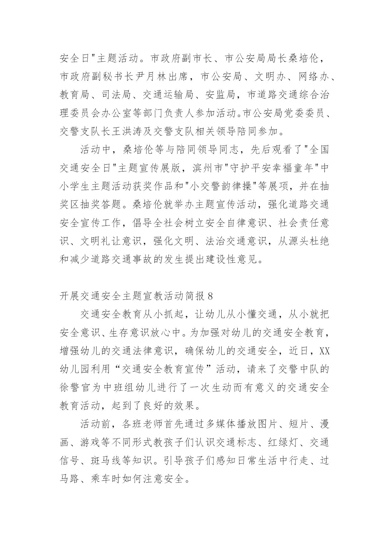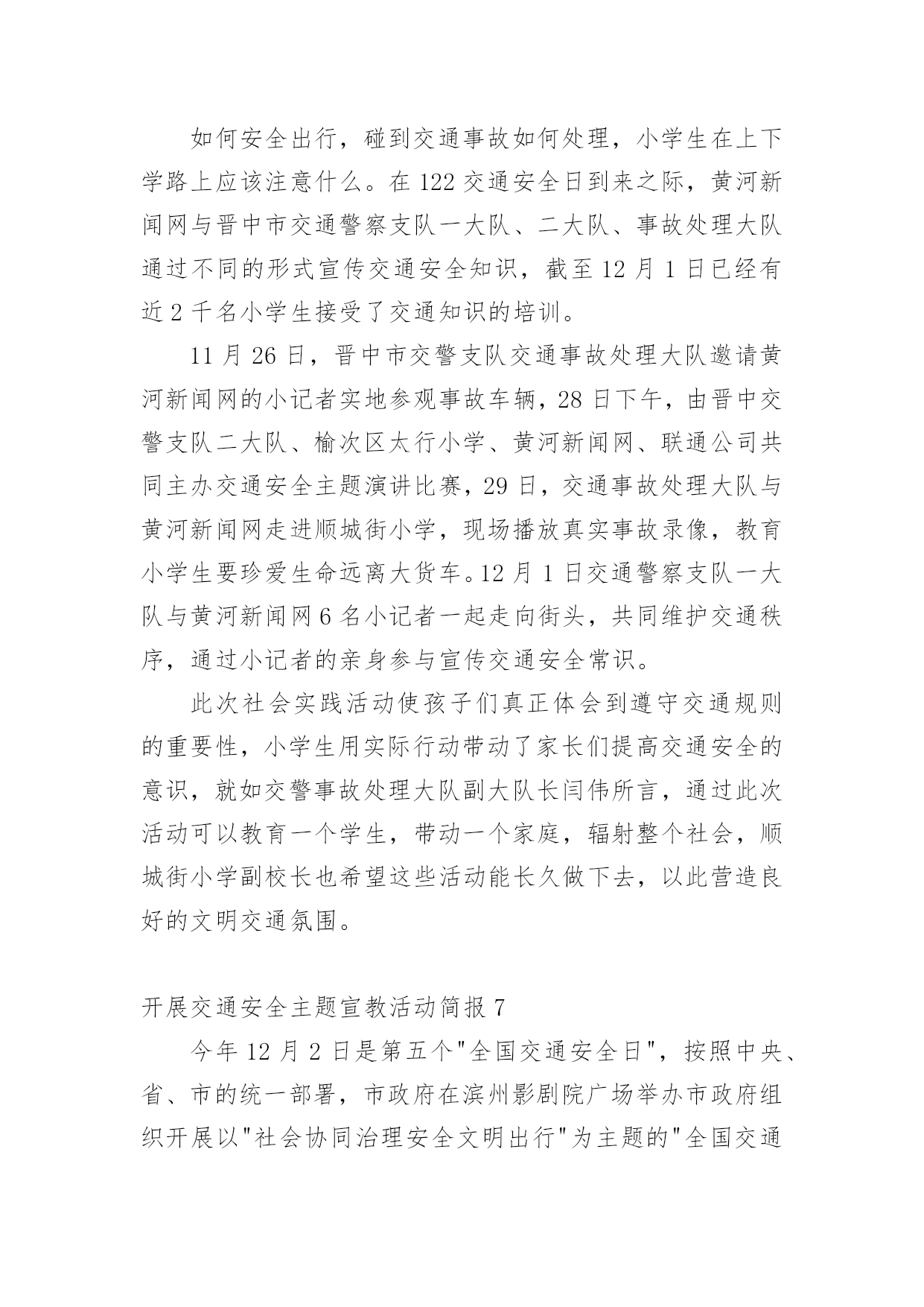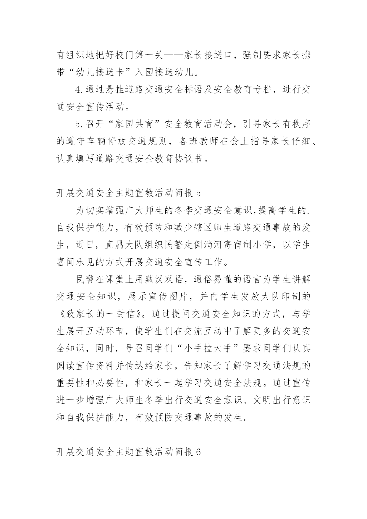 开展交通安全主题宣教活动简报开展交通安全主题宣教活动简报范文(通用8篇)随着社会不断地进步,我们可以接触到简报的地方越来越多,简报是具有汇报性、交流性和指导性特点的简短、灵活、快捷的书面形式。究竟什么样的简报才是好的简报呢?下面是小编收集整理的开展交通安全主题宣教活动简报范文(通用8篇),欢迎阅读,希望大家能够喜欢。开展交通安全主题宣教活动简报1社会的不断进步,科学技术的飞速发展,以及中国汽车行业的崛起,中国的汽车和其他车辆的不断增加,给大家的日常活动带来了各种交通隐患,特别是校园周边交通安全隐患。交通安全,一个永恒的话题;交通安全,一个关系人生质量、家庭幸福的话题。自从1886年德国人发明了世界上第一辆以汽油做燃料的机动车以来,它使人类进一步向现代文明迈进,但同时也带来了交通事故这一灰色阴影。当一个鲜活的生灵瞬间成为车轮下的亡灵时,当一个好端端的家庭因为惨痛的车祸而支离破碎时,怎不让我们为之警醒?行走,要走人行道,没有人行道的道路,要靠路边行走。集体外出时,要有组织、有秩序地列队行走。在没有交通民警指挥的路段,要学会避让机动车辆,不与机动车辆争道抢行。穿越马路时,要遵守交通规则,做到“绿灯行,红灯停”。骑自行车要在非机动车道上靠右边行驶,不要骑车带人或者过快地行驶,不在人行道上骑车,过马路时,推车前进。交通事故离我们并不遥远,它也常常发生在我们的身边,谈起交通事故,大家无不感到形势严峻,谈起事故造成的人员伤亡,无不感叹唏嘘。感叹、震撼之余,请同学们说一说它带给我们的启示或想法。通过本次的主题班会,我深刻意识到遵守交通规则的重要性,希望都能引起重视,为创造和谐的环境,我们需要共同努力。开展交通安全主题宣教活动简报2为了更好营造安全、有序、文明的校园周边交通环境,培养师生良好的交通安全意识,教育学生关爱生命、拒绝违章,严防道路交通事故,提高自我保护能力。为此,养正中心小学特邀晋江市公安局交警大队蔡忠警官一行来校给三年段1-4年级的学生作了交通安全主题宣教活动。讲座中,晋江市公安局交警大队李警官就同学们面临的交通环境、事故发生原因、交通法规、事故后怎么做等几个方面进行讲述,通报了近几年我县交通事故死伤和损失情况。讲座结合生活中的交通违规案例进行分析,用血的事实深入分析违反交通规则、违背交通道德带来的种种危害,强调在座的每一位学生要丰富交通安全知识,增强防范意识,遵守交通安全法规,提高自我保护能力。授课中,李警官根据破出校门就是路,车多的特点,教导学生如何在道路行走、如何过马路、如何乘车才会有安全保障;提醒大家若遇交通事故要保持冷静,及时报警,维持秩序;呼吁全体学生能“小手拉大手,同走文明路”。安全主题宣教活动结束后,同学们纷纷表示,交通安全关乎生命,要珍爱生命,就一定要安全出行,今后除了自觉遵守交通法规,还将努力做好小小宣传员,共同播撒平安的种子,收获更多的祥和、幸福和安宁,形成“珍爱生命,安全出行”的安全氛围,并且要提醒父母长辈,遵守交通规则,安全出行。开展交通安全主题宣教活动简报3为增强全体师生的交通安全意识,丰富交通安全知识,在第四个“全国交通安全日”到来之际,我校采用多种形式开展全国交通安全日主题教育活动。教育日期间,学校利用电子屏、校园网,倡导文明交通新风尚,将“全国交通安全日”活动主题、宣传口号等循环滚动显示在电子屏与校园网上,增强全体师生的交通安全意识,摒弃交通陋习,做到安全文明出行。召开主题班会,传播交通安全知识。各班利用班班通电子设备,展示了一幅幅近年来发生的一些交通事故图片,明确交通事故的严重危害,学习了交通信号、自行车行车安全、安全乘坐交通工具等安全知识,介绍了道路上存在的风险。开展主题板报、手抄报评比活动,营造班级教育文化氛围。活动中,各班师生群策群力,围绕安全教育主题对黑板报和手抄报进行了精心的设计,内容丰富,图文并茂,各具特色。孩子们在动手操作的同时,再一次了解了安全知识,增强了安全防范意识,营造了一个积极向上、安全、有序的班级教育文化氛围。发放致学生家长的.一封信,共搭家校安全教育平台。通过发放致学生家长的一封信,让家长认识到交通安全教育的.重要性,不可麻痹大意,掌握基本的交通安全知识,要求家长自觉遵守交通法规,加强对孩子的交通安全宣传教育,营造全民文明交通的氛围。此外,学校部分班级还采用了观影及交通安全知识问答的形式,让安全知识牢记于每位同学的心中,让交通安全事故远离师生。开展交通安全主题宣教活动简报4根据漳台社教50号文件通知要求,角美幼儿园切实开展“道路交通安全宣传教育”活动,该园结合本园实际情况,主要从幼儿日常交通常规教育抓起,从以下功夫:1.要求幼儿遵守道路行走规则——向右行上下楼。2.国旗下“道路交通安全教育”讲话强调:“过马路要走斑马线”,“不闯马路上人行红灯”,“要左看右看方可行”