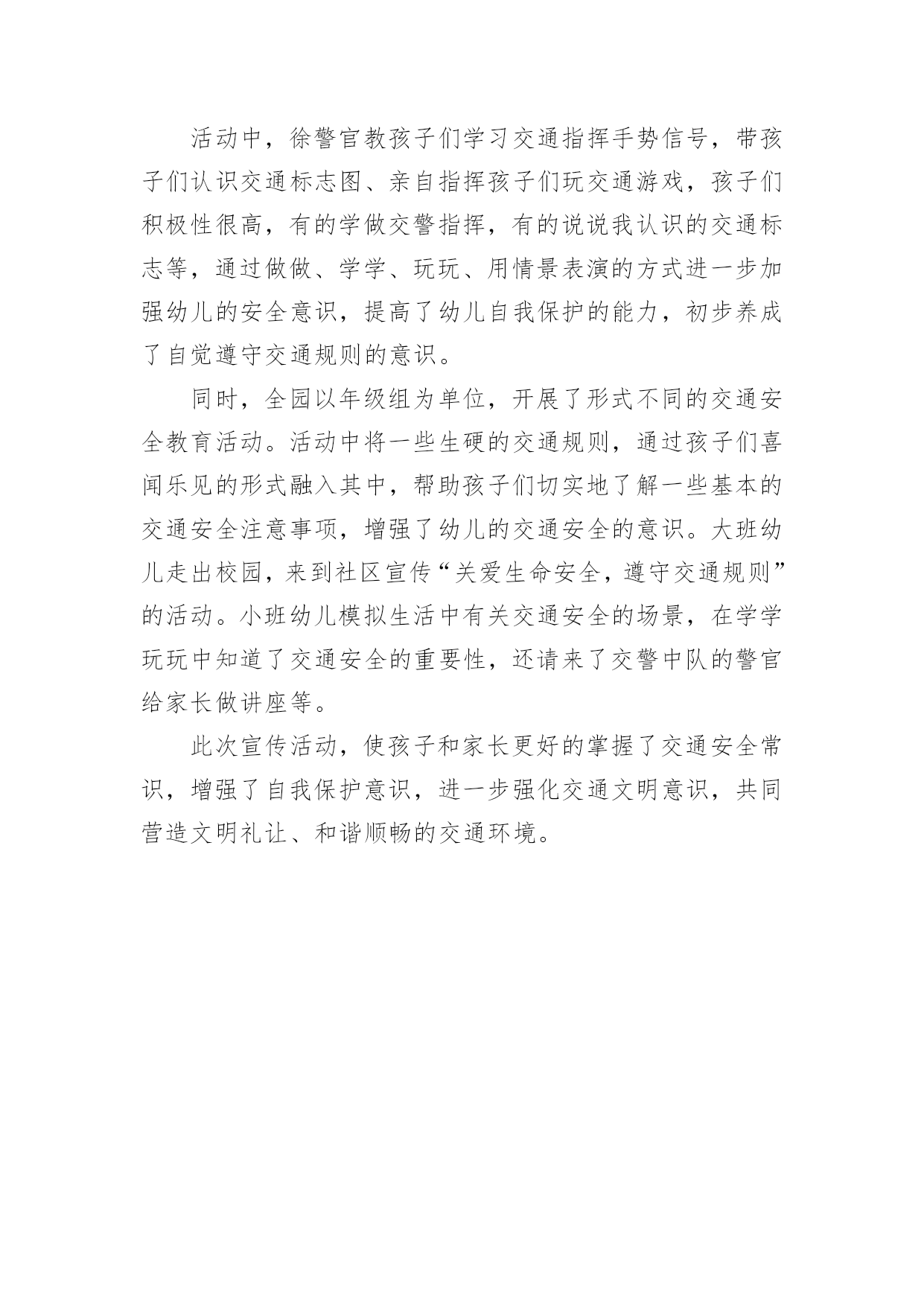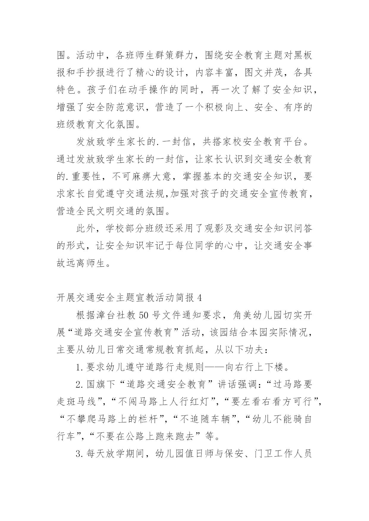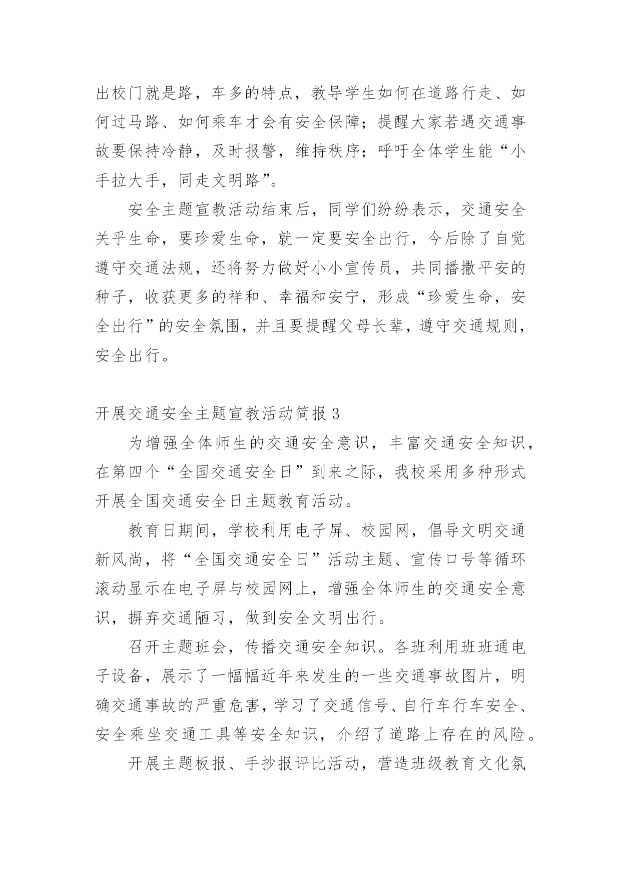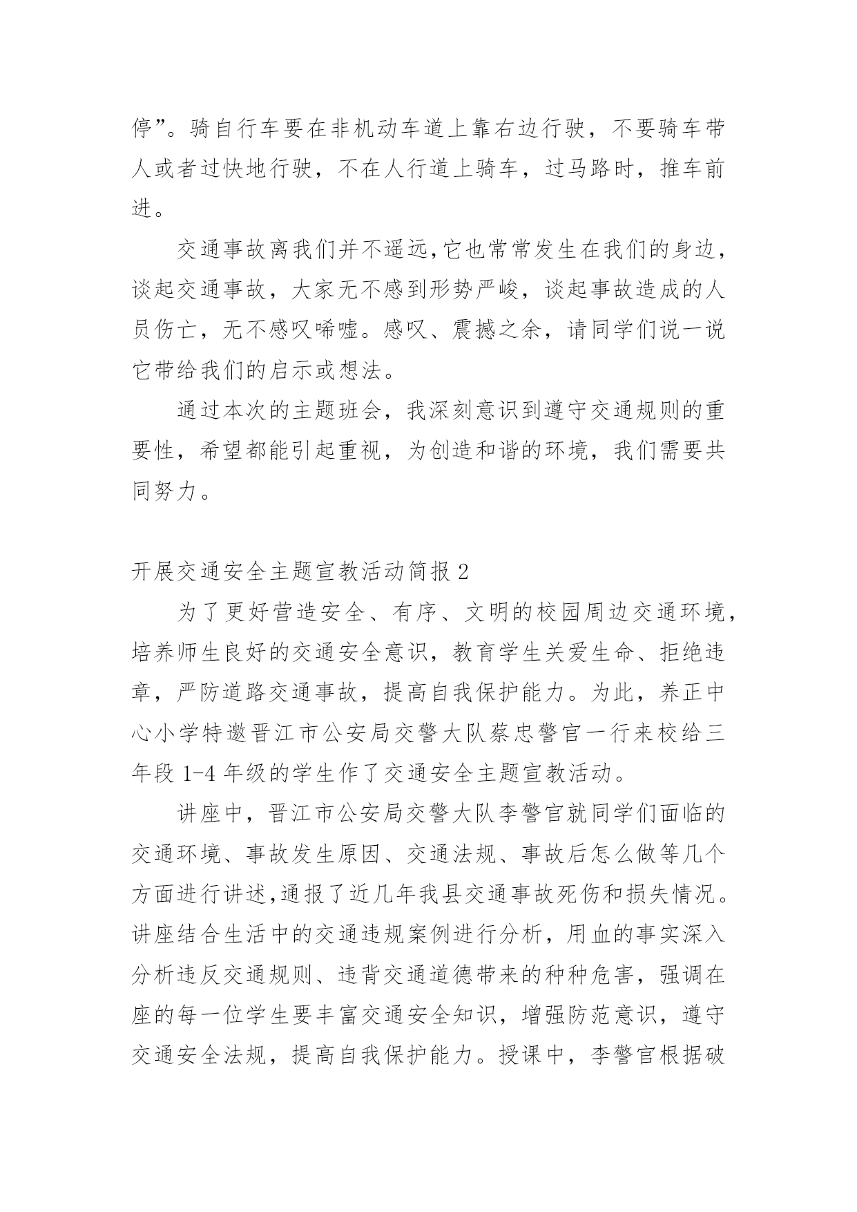 开展交通安全主题宣教活动简报开展交通安全主题宣教活动简报范文(通用8篇)随着社会不断地进步,我们可以接触到简报的地方越来越多,简报是具有汇报性、交流性和指导性特点的简短、灵活、快捷的书面形式。究竟什么样的简报才是好的简报呢?下面是小编收集整理的开展交通安全主题宣教活动简报范文(通用8篇),欢迎阅读,希望大家能够喜欢。开展交通安全主题宣教活动简报1社会的不断进步,科学技术的飞速发展,以及中国汽车行业的崛起,中国的汽车和其他车辆的不断增加,给大家的日常活动带来了各种交通隐患,特别是校园周边交通安全隐患。交通安全,一个永恒的话题;交通安全,一个关系人生质量、家庭幸福的话题。自从1886年德国人发明了世界上第一辆以汽油做燃料的机动车以来,它使人类进一步向现代文明迈进,但同时也带来了交通事故这一灰色阴影。当一个鲜活的生灵瞬间成为车轮下的亡灵时,当一个好端端的家庭因为惨痛的车祸而支离破碎时,怎不让我们为之警醒?行走,要走人行道,没有人行道的道路,要靠路边行走。集体外出时,要有组织、有秩序地列队行走。在没有交通民警指挥的路段,要学会避让机动车辆,不与机动车辆争道抢行。穿越马路时,要遵守交通规则,做到“绿灯行,红灯停”。骑自行车要在非机动车道上靠右边行驶,不要骑车带人或者过快地行驶,不在人行道上骑车,过马路时,推车前进。交通事故离我们并不遥远,它也常常发生在我们的身边,谈起交通事故,大家无不感到形势严峻,谈起事故造成的人员伤亡,无不感叹唏嘘。感叹、震撼之余,请同学们说一说它带给我们的启示或想法。通过本次的主题班会,我深刻意识到遵守交通规则的重要性,希望都能引起重视,为创造和谐的环境,我们需要共同努力。开展交通安全主题宣教活动简报2为了更好营造安全、有序、文明的校园周边交通环境,培养师生良好的交通安全意识,教育学生关爱生命、拒绝违章,严防道路交通事故,提高自我保护能力。为此,养正中心小学特邀晋江市公安局交警大队蔡忠警官一行来校给三年段1-4年级的学生作了交通安全主题宣教活动。讲座中,晋江市公安局交警大队李警官就同学们面临的交通环境、事故发生原因、交通法规、事故后怎么做等几个方面进行讲述,通报了近几年我县交通事故死伤和损失情况。讲座结合生活中的交通违规案例进行分析,用血的事实深入分析违反交通规则、违背交通道德带来的种种危害,强调在座的每一位学生要丰富交通安全知识,增强防范意识,遵守交通安全法规,提高自我保护能力。授课中,李警官根据破出校门就是路,车多的特点,教导学生如何在道路行走、如何过马路、如何乘车才会有安全保障;提醒大家若遇交通事故要保持冷静,及时报警,维持秩序;呼吁全体学生能“小手拉大手,同走文明路”。安全主题宣教活动结束后,同学们纷纷表示,交通安全关乎生命,要珍爱生命,就一定要安全出行,今后除了自觉遵守交通法规,还将努力做好小小宣传员,共同播撒平安的种子,收获更多的祥和、幸福和安宁,形成“珍爱生命,安全出行”的安全氛围,并且要提醒父母长辈,遵守交通规则,安全出行。开展交通安全主题宣教活动简报3为增强全体师生的交通安全意识,丰富交通安全知识,在第四个“全国交通安全日”到来之际,我校采用多种形式开展全国交通安全日主题教育活动。教育日期间,学校利用电子屏、校园网,倡导文明交通新风尚,将“全国交通安全日”活动主题、宣传口号等循环滚动显示在电子屏与校园网上,增强全体师生的交通安全意识,摒弃交通陋习,做到安全文明出行。召开主题班会,传播交通安全知识。各班利用班班通电子设备,展示了一幅幅近年来发生的一些交通事故图片,明确交通事故的严重危害,学习了交通信号、自行车行车安全、安全乘坐交通工具等安全知识,介绍了道路上存在的风险。开展主题板报、手抄报评比活动,营造班级教育文化氛围。活动中,各班师生群策群力,围绕安全教育主题对黑板报和手抄报进行了精心的设计,内容丰富,图文并茂,各具特色。孩子们在动手操作的同时,再一次了解了安全知识,增强了安全防范意识,营造了一个积极向上、安全、有序的班级教育文化氛围。发放致学生家长的.一封信,共搭家校安全教育平台。通过发放致学生家长的一封信,让家长认识到交通安全教育的.重要性,不可麻痹大意,掌握基本的交通安全知识,要求家长自觉遵守交通法规,加强对孩子的交通安全宣传教育,营造全民文明交通的氛围。此外,学校部分班级还采用了观影及交通安全知识问答的形式,让安全知识牢记于每位同学的心中,让交通安全事故远离师生。开展交通安全主题宣教活动简报4根据漳台社教50号文件通知要求,角美幼儿园切实开展“道路交通安全宣传教育”活动,该园结合本园实际情况,主要从幼儿日常交通常规教育抓起,从以下功夫:1.要求幼儿遵守道路行走规则——向右行上下楼。2.国旗下“道路交通安全教育”讲话强调:“过马路要走斑马线”,“不闯马路上人行红灯”,“要左看右看方可行”