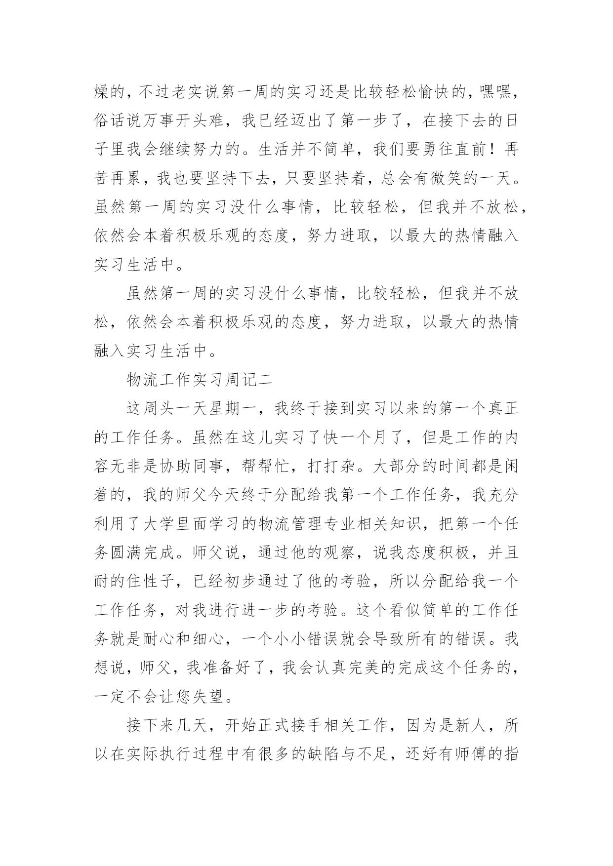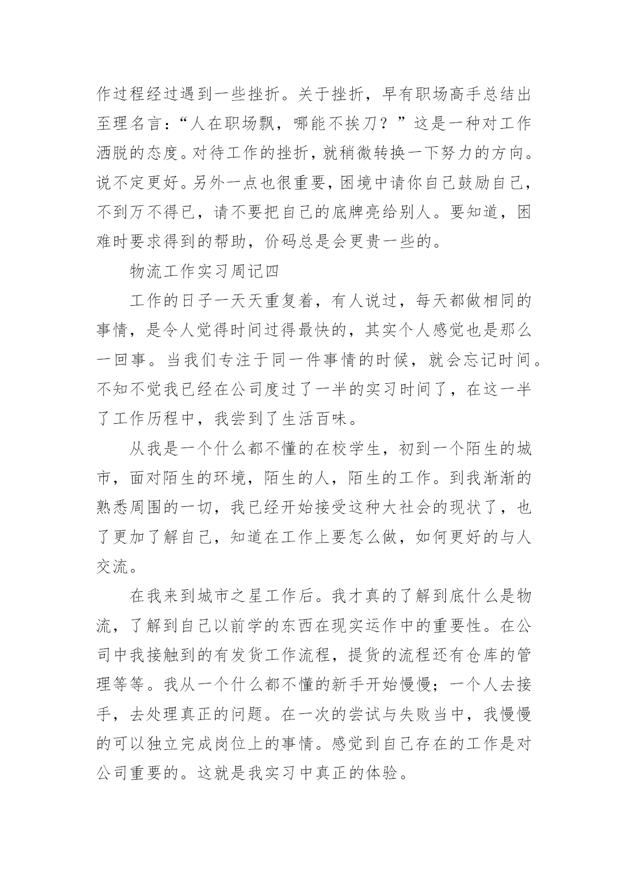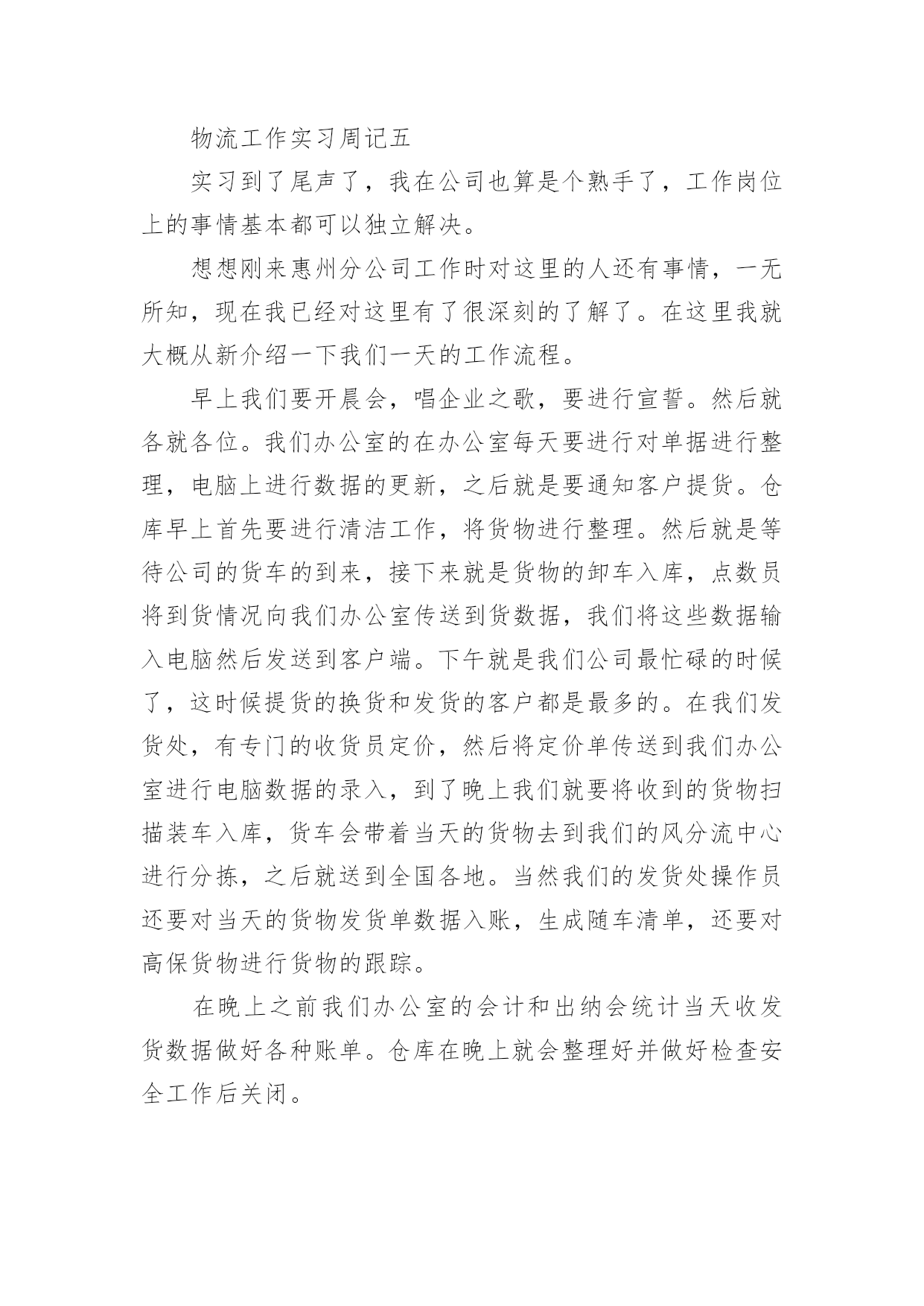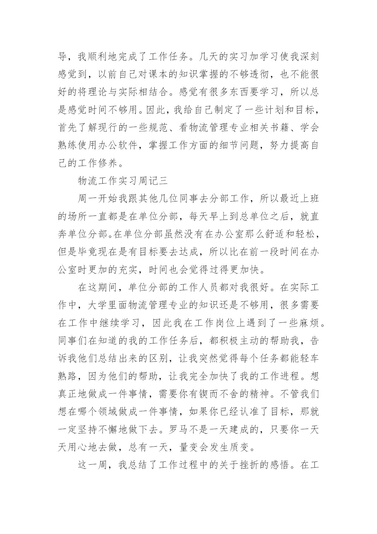 物流工作实习周记物流工作实习周记时间是箭,去来迅疾,转眼一周又结束了,相信大家一定感触颇深吧,是时候认真地做好周记了。周记怎么写才不会流于形式呢?下面是小编为大家收集的物流工作实习周记,欢迎阅读,希望大家能够喜欢。物流工作实习周记一作为物流管理专业的大学生,我很荣幸能够进入物流管理专业相关的岗位实习。相信每个人都有第一天上班的经历,也会对第一天上班有着深刻的感受及体会。尤其是从未有过工作经历的职场大学们。头几天实习,心情自然是激动而又紧张的,激动是觉得自己终于有机会进入职场工作,紧张是因为要面对一个完全陌生的职场环境。刚开始,岗位实习不用做太多的工作,基本都是在熟悉新工作的环境,单位内部文化,以及工作中日常所需要知道的一些事物等。对于这个职位的一切还很陌生,但是学会快速适应陌生的环境,是一种锻炼自我的过程,是我第一件要学的技能。这次实习为以后步入职场打下基础。第一周领导让我和办公室的其他职员相互认识了一下,并给我分配了一个师父,我以后在这里的实习遇到的问题和困难都可以找他帮忙。一周的时间很快就过去了,原以为实习的日子会比较枯燥的,不过老实说第一周的实习还是比较轻松愉快的,嘿嘿,俗话说万事开头难,我已经迈出了第一步了,在接下去的日子里我会继续努力的。生活并不简单,我们要勇往直前!再苦再累,我也要坚持下去,只要坚持着,总会有微笑的一天。虽然第一周的实习没什么事情,比较轻松,但我并不放松,依然会本着积极乐观的态度,努力进取,以最大的热情融入实习生活中。虽然第一周的实习没什么事情,比较轻松,但我并不放松,依然会本着积极乐观的态度,努力进取,以最大的热情融入实习生活中。物流工作实习周记二这周头一天星期一,我终于接到实习以来的第一个真正的工作任务。虽然在这儿实习了快一个月了,但是工作的内容无非是协助同事,帮帮忙,打打杂。大部分的时间都是闲着的,我的师父今天终于分配给我第一个工作任务,我充分利用了大学里面学习的物流管理专业相关知识,把第一个任务圆满完成。师父说,通过他的观察,说我态度积极,并且耐的住性子,已经初步通过了他的考验,所以分配给我一个工作任务,对我进行进一步的考验。这个看似简单的工作任务就是耐心和细心,一个小小错误就会导致所有的错误。我想说,师父,我准备好了,我会认真完美的完成这个任务的,一定不会让您失望。接下来几天,开始正式接手相关工作,因为是新人,所以在实际执行过程中有很多的缺陷与不足,还好有师傅的指导,我顺利地完成了工作任务。几天的实习加学习使我深刻感觉到,以前自己对课本的知识掌握的不够透彻,也不能很好的将理论与实际相结合。感觉有很多东西要学习,所以总是感觉时间不够用。因此,我给自己制定了一些计划和目标,首先了解现行的一些规范、看物流管理专业相关书籍、学会熟练使用办公软件,掌握工作方面的细节问题,努力提高自己的工作修养。物流工作实习周记三周一开始我跟其他几位同事去分部工作,所以最近上班的场所一直都是在单位分部,每天早上到总单位之后,就直奔单位分部。在单位分部虽然没有在办公室那么舒适和轻松,但是毕竟现在是有目标要去达成,所以比在前一段时间在办公室时更加的充实,时间也会觉得过得更加快。在这期间,单位分部的工作人员都对我很好。在实际工作中,大学里面物流管理专业的知识还是不够用,很多需要在工作中继续学习,因此我在工作岗位上遇到了一些麻烦。同事们在知道的我的工作任务后,都积极主动的帮助我,告诉我他们总结出来的区别,让我突然觉得每个任务都能轻车熟路,因为他们的帮助,让我完全加快了我的工作进程。想真正地做成一件事情,需要你有锲而不舍的精神。不管我们想在哪个领域做成一件事情,如果你已经认准了目标,那就一定坚持不懈地做下去。罗马不是一天建成的,只要你一天天用心地去做,总有一天,量变会发生质变。这一周,我总结了工作过程中的关于挫折的感悟。在工作过程经过遇到一些挫折。关于挫折,早有职场高手总结出至理名言:“人在职场飘,哪能不挨刀?”这是一种对工作洒脱的态度。对待工作的挫折,就稍微转换一下努力的方向。说不定更好。另外一点也很重要,困境中请你自己鼓励自己,不到万不得已,请不要把自己的底牌亮给别人。要知道,困难时要求得到的帮助,价码总是会更贵一些的。物流工作实习周记四工作的日子一天天重复着,有人说过,每天都做相同的事情,是令人觉得时间过得最快的,其实个人感觉也是那么一回事。当我们专注于同一件事情的时候,就会忘记时间。不知不觉我已经在公司度过了一半的实习时间了,在这一半了工作历程中,我尝到了生活百味。从我是一个什么都不懂的在校学生,初到一个陌生的城市,面对陌生的环境,陌生的人,陌生的工作。到我渐渐的熟悉周围的一切,我已经开始接受这种大社会的现状了,也了更加了解自己,知道在工作上要怎么做,如何更好的与人交流。在我来到城市之星工作后。我才真的了解到底什么