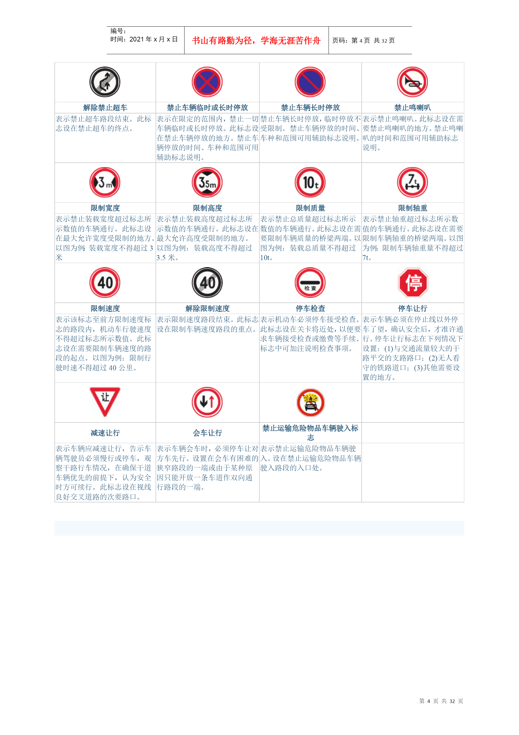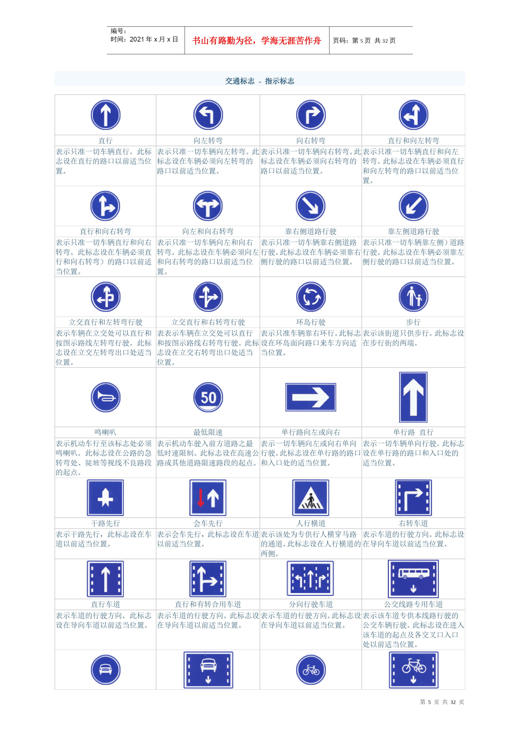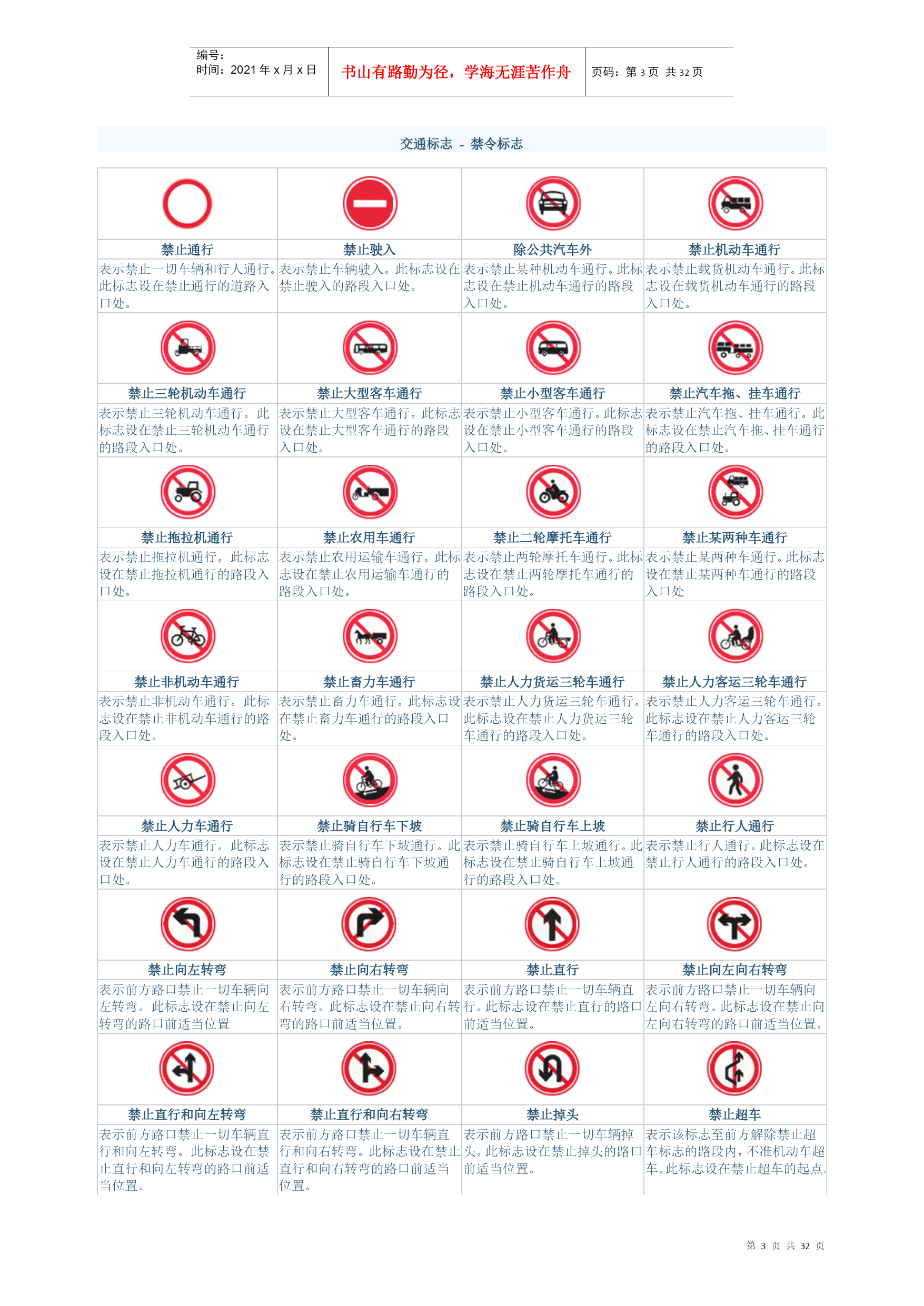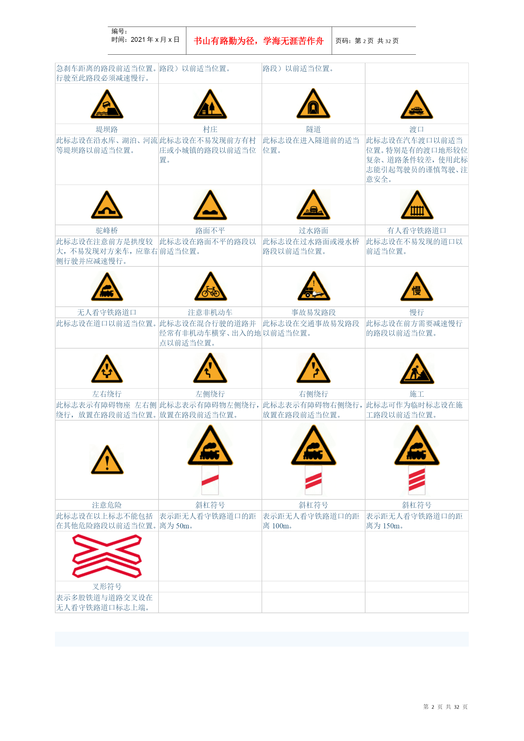编号:时间:2021年x月x日书山有路勤为径,学海无涯苦作舟页码:第PAGE32页共NUMPAGES32页第PAGE\*MERGEFORMAT32页共NUMPAGES\*MERGEFORMAT32页交通标志-警告标志十字交叉禁止驶入T形交叉T形交叉除了基本形十字路口外,还有部分变异的十字路口,如:五路交叉路口、变形十字路口、变形五路交叉路口等。五路以上的路口均按十字路口对待。丁字形标志原则上设在与交叉口形状相符的道路上。右侧丁字路口,此标志设在进入T字路口以前的适当位置。丁字形标志原则上设在与交叉口形状相符的道路上。左侧丁字路口此标志设在进入丁字路口以前的适当位置。丁字形标志原则上设在与交叉口形状相符的道路上。此标志设在进入T字路口以前的适当位置。Y形交叉环形交叉向左急弯路向右急弯路设在Y形路口以前的适当位置。有的环形交叉路口,由于受线形限制或障碍物阻挡,此标志设在面对来车的路口的正面。表向左急弯路标志设在左急转弯的道路前方适当位置。向右急弯路标志,设在右急转弯的道路前方适当位置。反向弯路连续弯路上陡坡下陡坡此标志设在两个相邻的方向相反的弯路前适当位置。此标志设在有连续三个以上弯路的道路以前适当位置。此标志设在纵坡度在7%和市区纵坡度在大于4%的陡坡道路前适当位置。此标志设在纵坡度在7%和市区纵坡度在大于4%的陡坡道路前适当位置。两侧变窄右侧变窄左侧变窄窄桥车行道两侧变窄主要指沿道路中心线对城缩窄的道路;此标志设在窄路以前适当位置。表车行道右侧缩窄。此标志设在窄路以前适当位置。车行道左侧缩窄。此标志设在窄路以前适当位置。此标志设在桥面宽度小于路面宽度的窄桥以前适当位置。双向交通注意行人注意儿童注意牲畜表双向行驶的道路上,采用天然的或人工的隔离措施,把上下行交通完全分离,由于某种原因(施工、桥、隧道)形成无隔离的双向车道时,须设置此标志。一般设在郊外道路上划有人行横道的前方。城市道路上因人行横道线较多,可根据实际需要设置。此标志设在小学、幼儿园、少年宫、儿童游乐场等儿童频繁出入的场所或通道处。此标志设在经常有牲畜活动的路段特别是视线不良的路段以前适当位置。注意信号灯注意落石注意落石注意横风此标志设在不易发现前方位信号灯控制的路口前适当位置。此标志设在左侧有落石危险的傍山路段之前适当位置。此标志设在右侧有落石危险的傍山路段之前适当位置。此标志设在经常有很强的侧风并有必要引起注意的路段前适当位置。易滑傍山险路傍山险路堤坝路此标志设在路面的摩擦系数不能满足相应行驶速度下要求紧急刹车距离的路段前适当位置。行驶至此路段必须减速慢行。此标志设在山区地势险要路段(道路外侧位陡壁、悬崖危险的路段)以前适当位置。此标志设在山区地势险要路段(道路外侧位陡壁、悬崖危险的路段)以前适当位置。此标志设在沿水库、湖泊、河流等堤坝路以前适当位置。堤坝路村庄隧道渡口此标志设在沿水库、湖泊、河流等堤坝路以前适当位置。此标志设在不易发现前方有村庄或小城镇的路段以前适当位置。此标志设在进入隧道前的适当位置。此标志设在汽车渡口以前适当位置。特别是有的渡口地形较位复杂、道路条件较差,使用此标志能引起驾驶员的谨慎驾驶、注意安全。驼峰桥路面不平过水路面有人看守铁路道口此标志设在注意前方是拱度较大,不易发现对方来车,应靠右侧行驶并应减速慢行。此标志设在路面不平的路段以前适当位置。此标志设在过水路面或漫水桥路段以前适当位置。此标志设在不易发现的道口以前适当位置。无人看守铁路道口注意非机动车事故易发路段慢行此标志设在道口以前适当位置。此标志设在混合行驶的道路并经常有非机动车横穿、出入的地点以前适当位置。此标志设在交通事故易发路段以前适当位置。此标志设在前方需要减速慢行的路段以前适当位置。左右绕行左侧绕行右侧绕行施工此标志表示有障碍物座左右侧绕行,放置在路段前适当位置。此标志表示有障碍物左侧绕行,放置在路段前适当位置。此标志表示有障碍物右侧绕行,放置在路段前适当位置。此标志可作为临时标志设在施工路段以前适当位置。注意危险斜杠符号斜杠符号斜杠符号此标志设在以上标志不能包括在其他危险路段以前适当位置。表示距无人看守铁路道口的距离为50m。表示距无人看守铁路道口的距离100m。表示距无人看守铁路道口的距离为150m。叉形符号表示多股铁道与道路交叉设在无人看守铁路道口标志上端。交通标志-禁令标志禁止通行禁止驶入除公共汽车外禁止机动车通行表示禁止一切车辆和行人通行。此标志设在禁止通行的道路入口处。表示禁止车辆驶入。此标志设在禁止驶入的路段入口处。表示禁止某种机动车通行。此标志设在禁止机动车通行的路段入口处。表示禁止载货机动车通行。此标志设在载货机动车通行的路段入口处。禁止三轮机动车通行禁止大型客车通行禁止小型客车通行禁止汽车拖、挂车通行表示禁止三轮机动