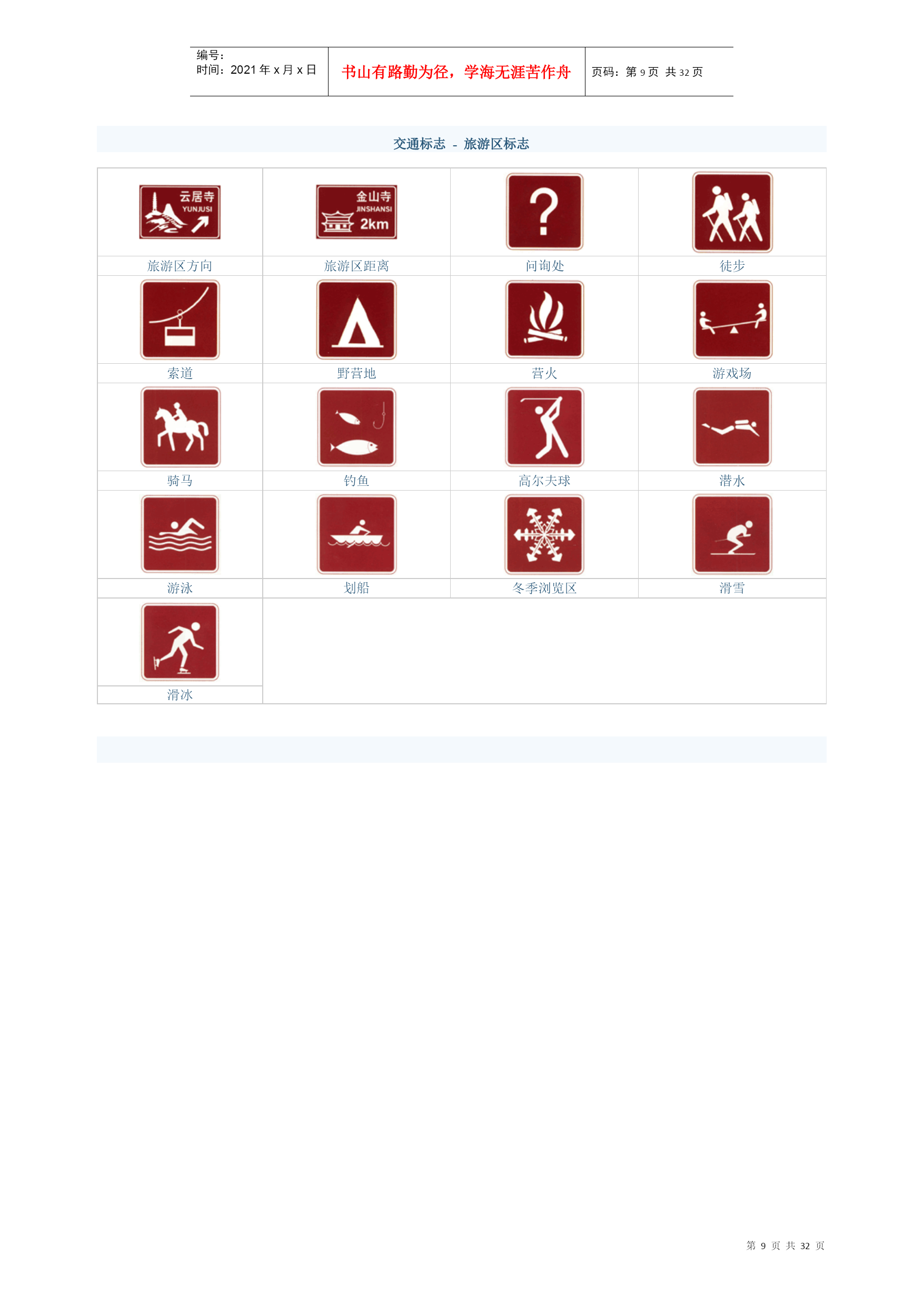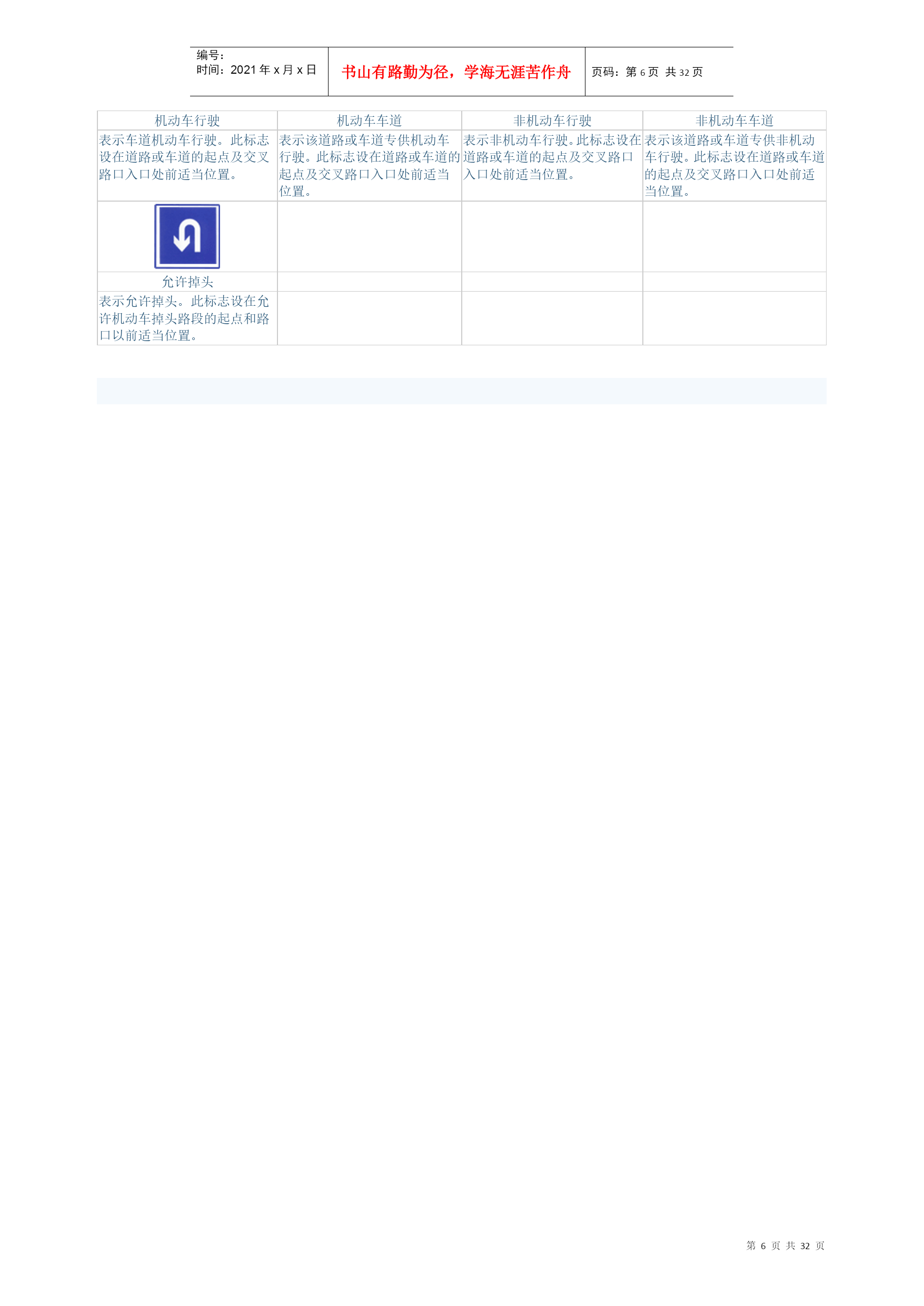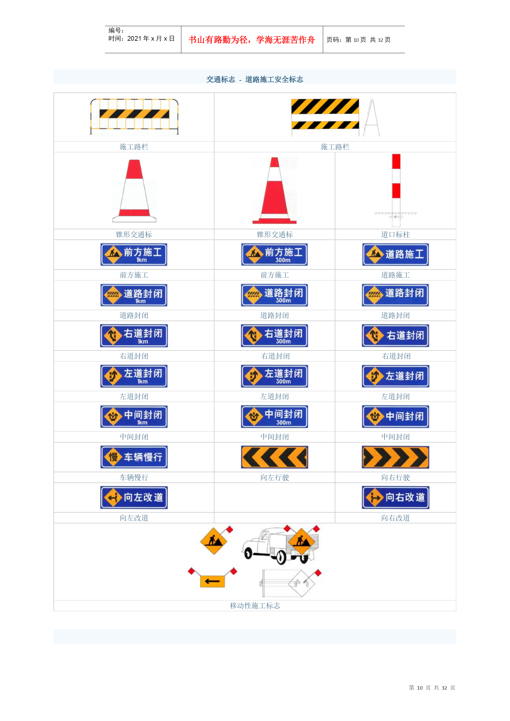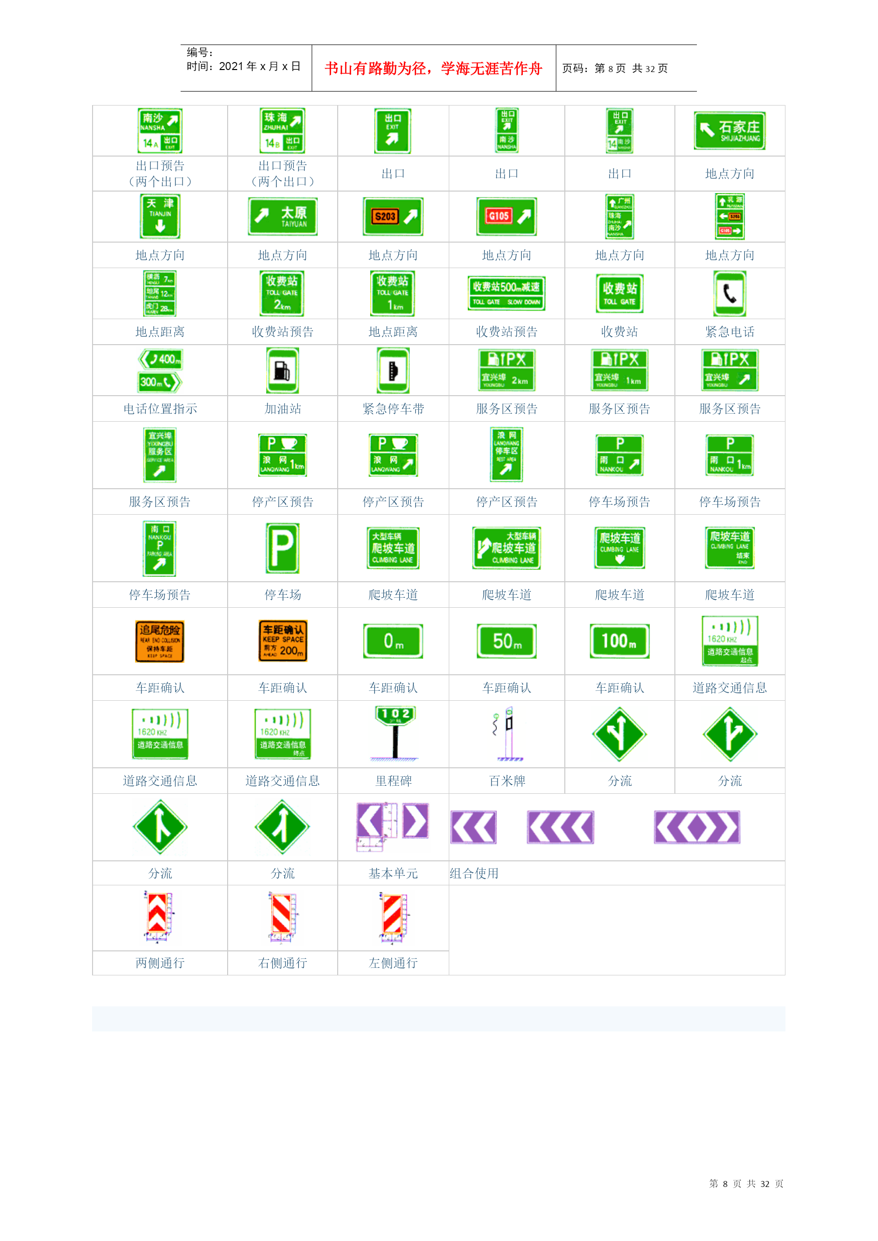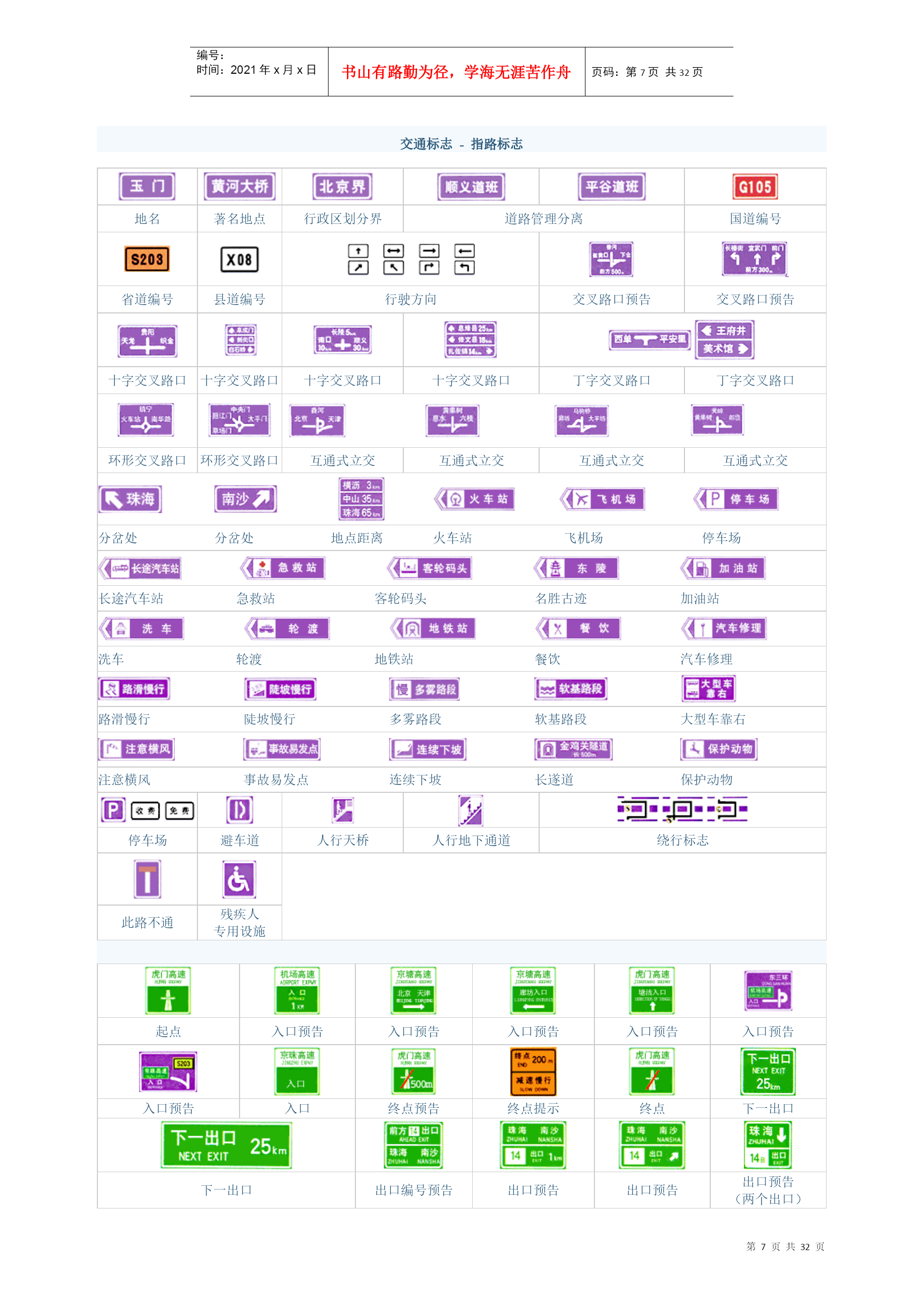 编号:时间:2021年x月x日书山有路勤为径,学海无涯苦作舟页码:第PAGE32页共NUMPAGES32页第PAGE\*MERGEFORMAT32页共NUMPAGES\*MERGEFORMAT32页交通标志-警告标志十字交叉禁止驶入T形交叉T形交叉除了基本形十字路口外,还有部分变异的十字路口,如:五路交叉路口、变形十字路口、变形五路交叉路口等。五路以上的路口均按十字路口对待。丁字形标志原则上设在与交叉口形状相符的道路上。右侧丁字路口,此标志设在进入T字路口以前的适当位置。丁字形标志原则上设在与交叉口形状相符的道路上。左侧丁字路口此标志设在进入丁字路口以前的适当位置。丁字形标志原则上设在与交叉口形状相符的道路上。此标志设在进入T字路口以前的适当位置。Y形交叉环形交叉向左急弯路向右急弯路设在Y形路口以前的适当位置。有的环形交叉路口,由于受线形限制或障碍物阻挡,此标志设在面对来车的路口的正面。表向左急弯路标志设在左急转弯的道路前方适当位置。向右急弯路标志,设在右急转弯的道路前方适当位置。反向弯路连续弯路上陡坡下陡坡此标志设在两个相邻的方向相反的弯路前适当位置。此标志设在有连续三个以上弯路的道路以前适当位置。此标志设在纵坡度在7%和市区纵坡度在大于4%的陡坡道路前适当位置。此标志设在纵坡度在7%和市区纵坡度在大于4%的陡坡道路前适当位置。两侧变窄右侧变窄左侧变窄窄桥车行道两侧变窄主要指沿道路中心线对城缩窄的道路;此标志设在窄路以前适当位置。表车行道右侧缩窄。此标志设在窄路以前适当位置。车行道左侧缩窄。此标志设在窄路以前适当位置。此标志设在桥面宽度小于路面宽度的窄桥以前适当位置。双向交通注意行人注意儿童注意牲畜表双向行驶的道路上,采用天然的或人工的隔离措施,把上下行交通完全分离,由于某种原因(施工、桥、隧道)形成无隔离的双向车道时,须设置此标志。一般设在郊外道路上划有人行横道的前方。城市道路上因人行横道线较多,可根据实际需要设置。此标志设在小学、幼儿园、少年宫、儿童游乐场等儿童频繁出入的场所或通道处。此标志设在经常有牲畜活动的路段特别是视线不良的路段以前适当位置。注意信号灯注意落石注意落石注意横风此标志设在不易发现前方位信号灯控制的路口前适当位置。此标志设在左侧有落石危险的傍山路段之前适当位置。此标志设在右侧有落石危险的傍山路段之前适当位置。此标志设在经常有很强的侧风并有必要引起注意的路段前适当位置。易滑傍山险路傍山险路堤坝路此标志设在路面的摩擦系数不能满足相应行驶速度下要求紧急刹车距离的路段前适当位置。行驶至此路段必须减速慢行。此标志设在山区地势险要路段(道路外侧位陡壁、悬崖危险的路段)以前适当位置。此标志设在山区地势险要路段(道路外侧位陡壁、悬崖危险的路段)以前适当位置。此标志设在沿水库、湖泊、河流等堤坝路以前适当位置。堤坝路村庄隧道渡口此标志设在沿水库、湖泊、河流等堤坝路以前适当位置。此标志设在不易发现前方有村庄或小城镇的路段以前适当位置。此标志设在进入隧道前的适当位置。此标志设在汽车渡口以前适当位置。特别是有的渡口地形较位复杂、道路条件较差,使用此标志能引起驾驶员的谨慎驾驶、注意安全。驼峰桥路面不平过水路面有人看守铁路道口此标志设在注意前方是拱度较大,不易发现对方来车,应靠右侧行驶并应减速慢行。此标志设在路面不平的路段以前适当位置。此标志设在过水路面或漫水桥路段以前适当位置。此标志设在不易发现的道口以前适当位置。无人看守铁路道口注意非机动车事故易发路段慢行此标志设在道口以前适当位置。此标志设在混合行驶的道路并经常有非机动车横穿、出入的地点以前适当位置。此标志设在交通事故易发路段以前适当位置。此标志设在前方需要减速慢行的路段以前适当位置。左右绕行左侧绕行右侧绕行施工此标志表示有障碍物座左右侧绕行,放置在路段前适当位置。此标志表示有障碍物左侧绕行,放置在路段前适当位置。此标志表示有障碍物右侧绕行,放置在路段前适当位置。此标志可作为临时标志设在施工路段以前适当位置。注意危险斜杠符号斜杠符号斜杠符号此标志设在以上标志不能包括在其他危险路段以前适当位置。表示距无人看守铁路道口的距离为50m。表示距无人看守铁路道口的距离100m。表示距无人看守铁路道口的距离为150m。叉形符号表示多股铁道与道路交叉设在无人看守铁路道口标志上端。交通标志-禁令标志禁止通行禁止驶入除公共汽车外禁止机动车通行表示禁止一切车辆和行人通行。此标志设在禁止通行的道路入口处。表示禁止车辆驶入。此标志设在禁止驶入的路段入口处。表示禁止某种机动车通行。此标志设在禁止机动车通行的路段入口处。表示禁止载货机动车通行。此标志设在载货机动车通行的路段入口处。禁止三轮机动车通行禁止大型客车通行禁止小型客车通行禁止汽车拖、挂车通行表示禁止三轮机动