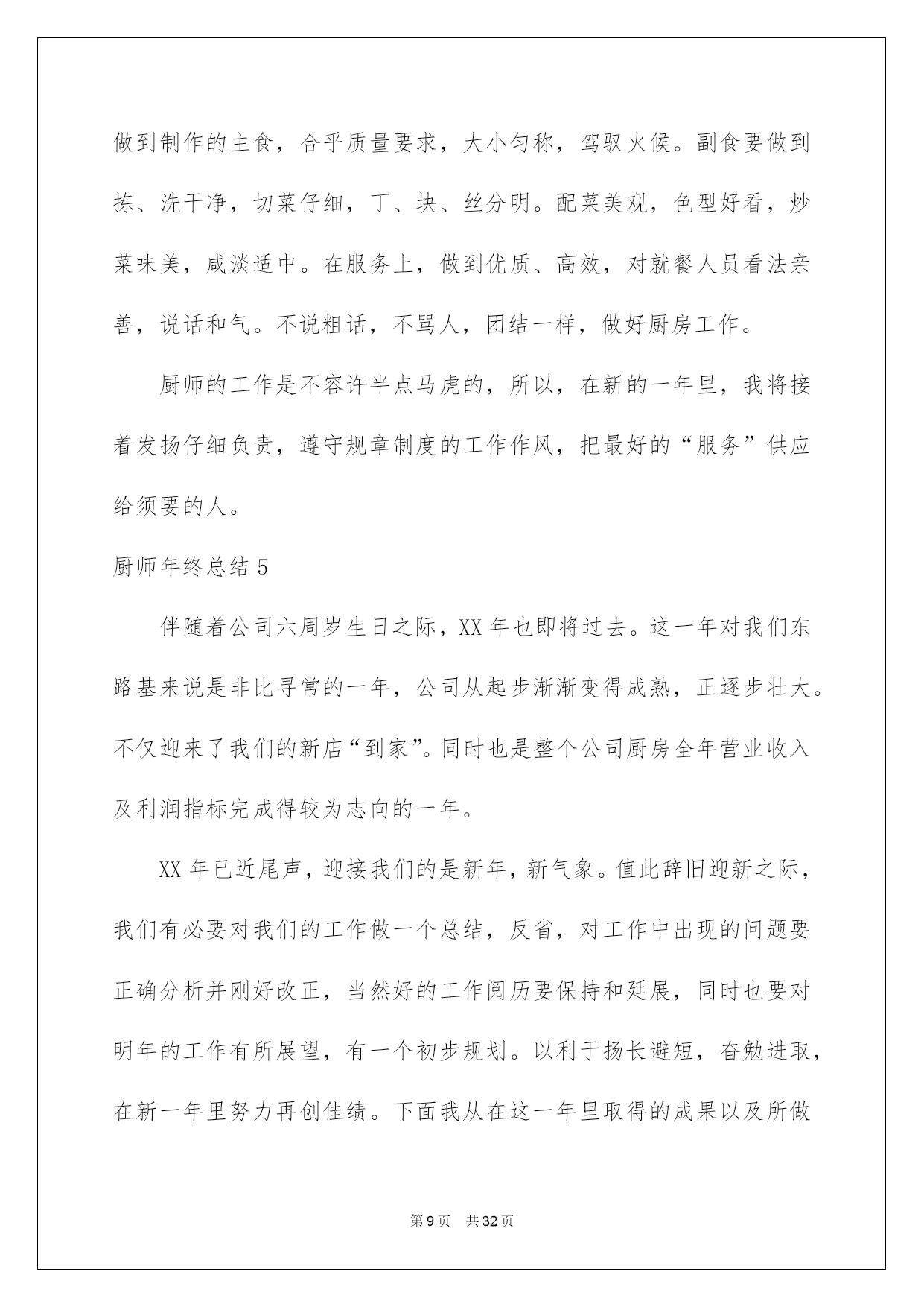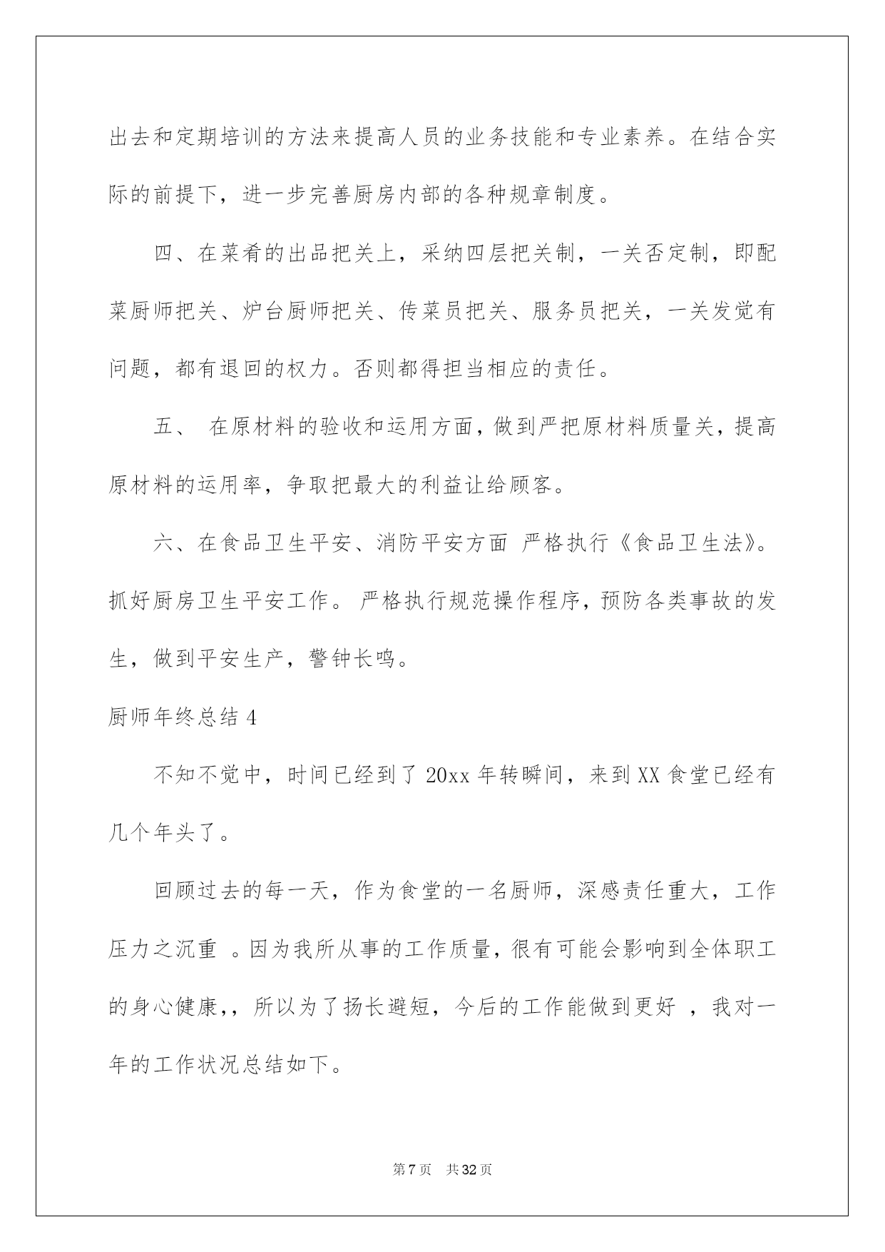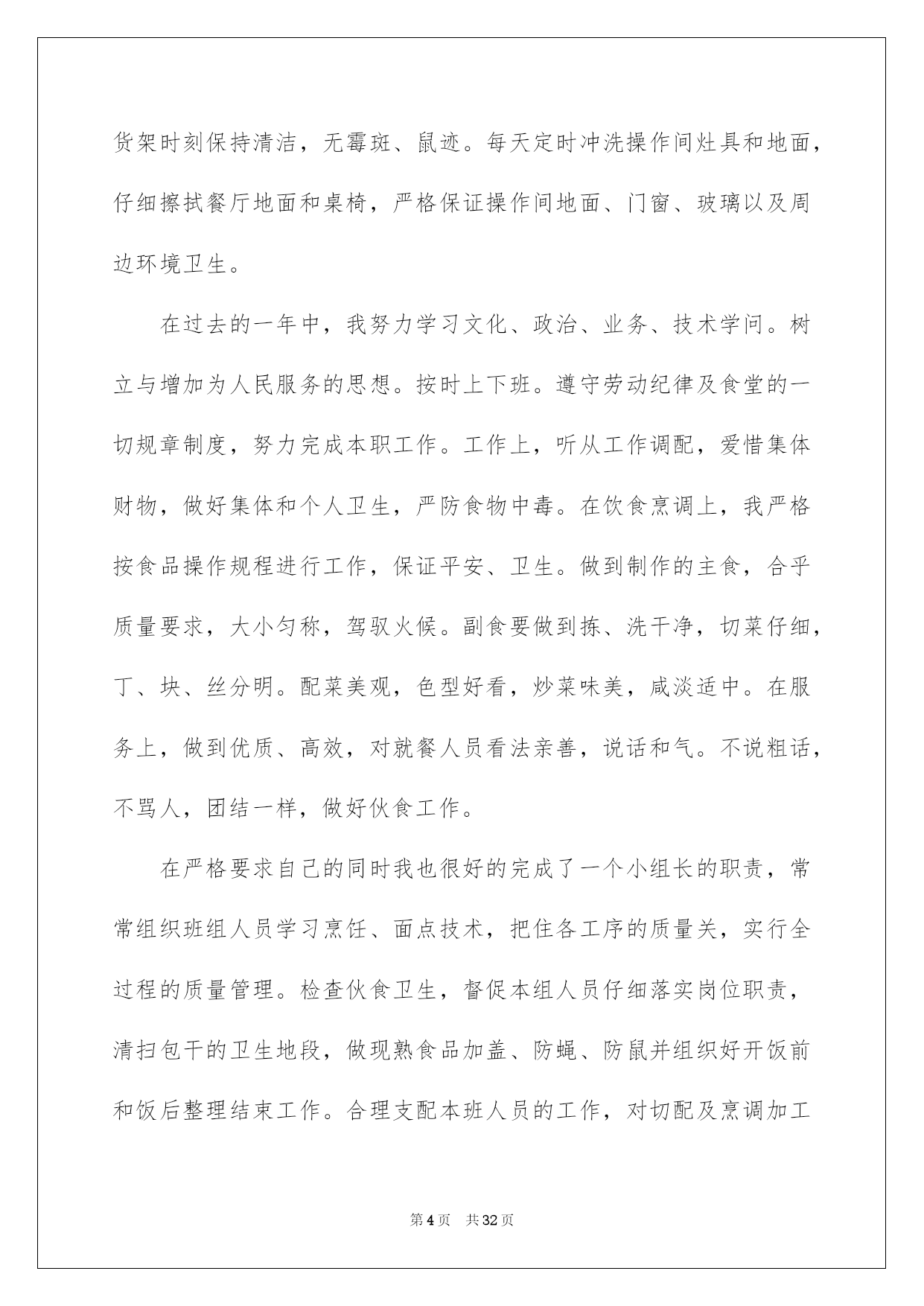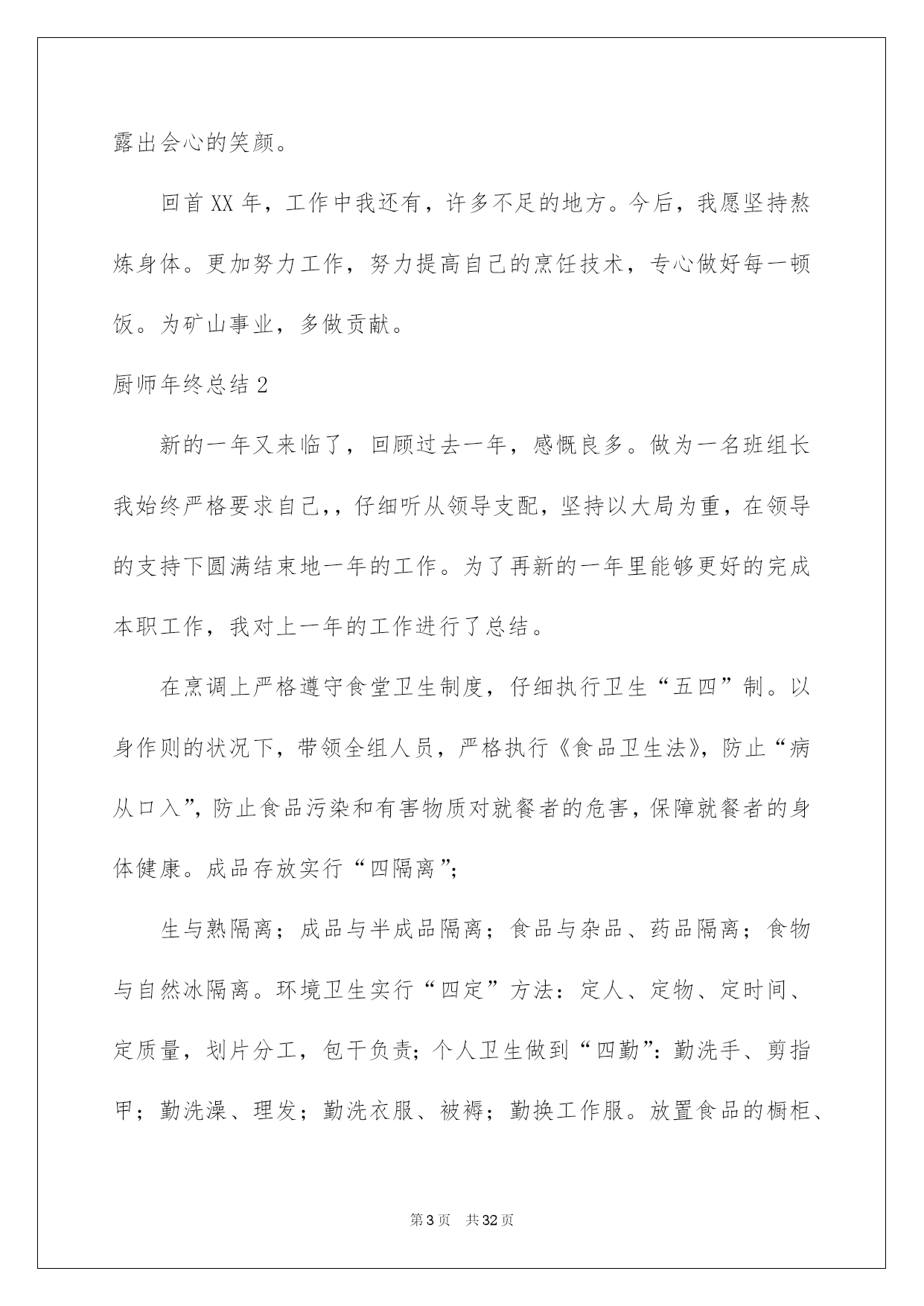 第PAGE\*Arabic\*MERGEFORMAT32页共NUMPAGES\*Arabic\*MERGEFORMAT32页第PAGE\*MERGEFORMAT32页共NUMPAGES\*MERGEFORMAT32页第PAGE\*MERGEFORMAT32页共NUMPAGES\*MERGEFORMAT32页第PAGE\*MERGEFORMAT32页共NUMPAGES\*MERGEFORMAT32页第PAGE\*MERGEFORMAT32页共NUMPAGES\*MERGEFORMAT32页第PAGE\*MERGEFORMAT32页共NUMPAGES\*MERGEFORMAT32页第PAGE\*MERGEFORMAT32页共NUMPAGES\*MERGEFORMAT32页第PAGE\*MERGEFORMAT32页共NUMPAGES\*MERGEFORMAT32页第PAGE\*MERGEFORMAT32页共NUMPAGES\*MERGEFORMAT32页第PAGE\*MERGEFORMAT32页共NUMPAGES\*MERGEFORMAT32页第PAGE\*MERGEFORMAT32页共NUMPAGES\*MERGEFORMAT32页2022厨师年终总结厨师年终总结总结是对取得的成果、存在的问题及得到的阅历和教训等方面状况进行评价与描述的一种书面材料,它可以给我们下一阶段的学习和工作生活做指导,因此我们须要回头归纳,写一份总结了。那么我们该怎么去写总结呢?以下是我为大家收集的厨师年终总结,欢迎大家借鉴与参考,希望对大家有所帮助。厨师年终总结1作为一名从事餐饮工作十几年的厨师,我为自己树立的工作目标:肯定安安心心工作,勤勤恳恳,任劳任怨,努力做好每一顿饭肴。让大家吃的舒心,放心。我坚持不懈,始终都在严格要求自己这样做。XX年2月3日,刚过正月初六,大家都沉醉在喜气洋洋的新年里,我便风尘仆仆的赶回来上班了。被支配到公司采场食堂工作。换刘师傅回家休假。我尽快的适应山上的工作和气候环境,每天20几人就餐,我不断调剂饭菜花样,每天中午6菜1汤,下午,包子,稀饭,扯面,饺子,小菜等,每天变换。2月20号,叶师傅回来了,大部分休假的职工也接连回矿上班了,我们的炊事后勤服务工作也慢慢步入正轨。3月26我被抽调到选场,协作刘师,侯师,一起。圆满完成了,公司职工吴远近和石博,两对新人的结婚喜宴。4月5月份,就餐人数越来越多,起先有外来拉矿司机上灶就餐。每天5个餐桌,桌桌爆满。我和叶师傅,紧密协作,努力工作,每天忙劳碌碌,加班加点。5月10号,叶师傅休假回家。办公室刚好支配了帮灶人员,食堂工作顺当进行着。叶师傅休假回来后,6月4号,我休假回家。7月份,我和x师傅,团结一心,接着努力工作。8月12日由于我身染恶疾,口眼歪斜,不能正常上班,被支配x治病回家了。经过70悉心治疗,我的病情渐渐康复。于10月23日回来上班。10月26日,我被抽调选场,和刘师,侯师一起顺当操办了捛博同志的结婚喜宴。11月,我和叶师傅,工作热忱高涨,紧密协作,每天变换花样,专心做好每一顿饭。顺当接待了巡山武警x人的就餐。和公司董事长,朱总一行的款待工作。12月份,我们每天按时上班,准点开饭。每天看着大家吃着,香喷喷,热腾腾可口的饭肴,我们也露出会心的笑颜。回首XX年,工作中我还有,许多不足的地方。今后,我愿坚持熬炼身体。更加努力工作,努力提高自己的烹饪技术,专心做好每一顿饭。为矿山事业,多做贡献。厨师年终总结2新的一年又来临了,回顾过去一年,感慨良多。做为一名班组长我始终严格要求自己,,仔细听从领导支配,坚持以大局为重,在领导的支持下圆满结束地一年的工作。为了再新的一年里能够更好的完成本职工作,我对上一年的工作进行了总结。在烹调上严格遵守食堂卫生制度,仔细执行卫生“五四”制。以身作则的状况下,带领全组人员,严格执行《食品卫生法》,防止“病从口入”,防止食品污染和有害物质对就餐者的危害,保障就餐者的身体健康。成品存放实行“四隔离”;生与熟隔离;成品与半成品隔离;食品与杂品、药品隔离;食物与自然冰隔离。环境卫生实行“四定”方法:定人、定物、定时间、定质量,划片分工,包干负责;个人卫生做到“四勤”:勤洗手、剪指甲;勤洗澡、理发;勤洗衣服、被褥;勤换工作服。放置食品的橱柜、货架时刻保持清洁,无霉斑、鼠迹。每天定时冲洗操作间灶具和地面,仔细擦拭餐厅地面和桌椅,严格保证操作间地面、门窗、玻璃以及周边环境卫生。在过去的一年中,我努力学习文化、政治、业务、技术学问。树立与增加为人民服务的思想。按时上下班。遵守劳动纪律及食堂的一切规章制度,努力完