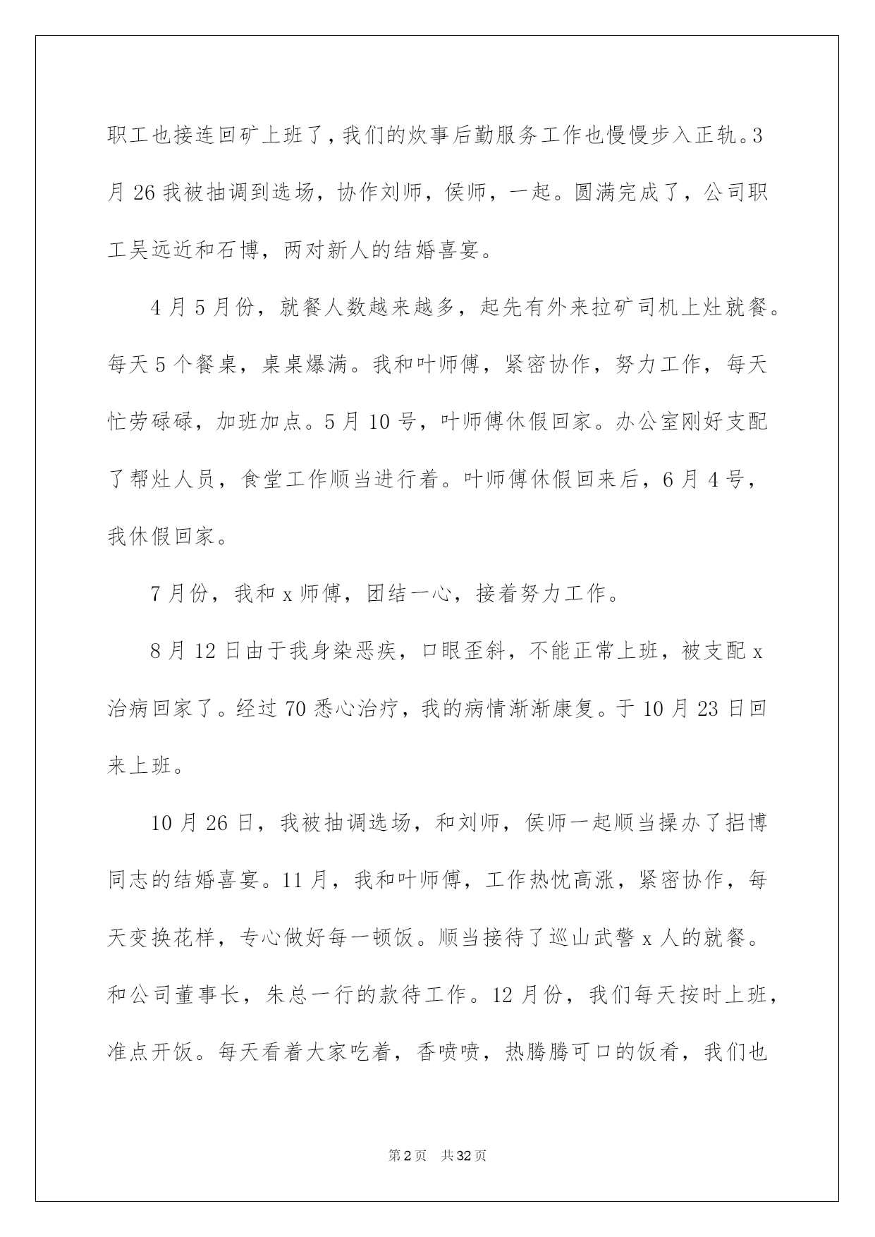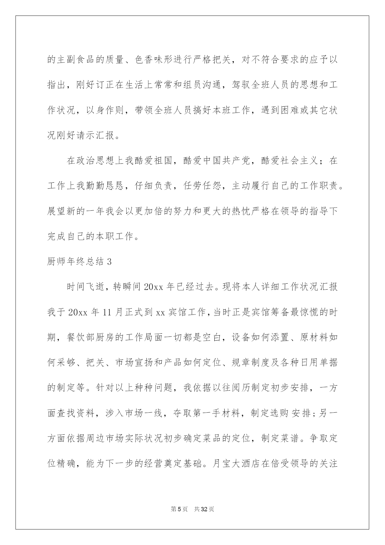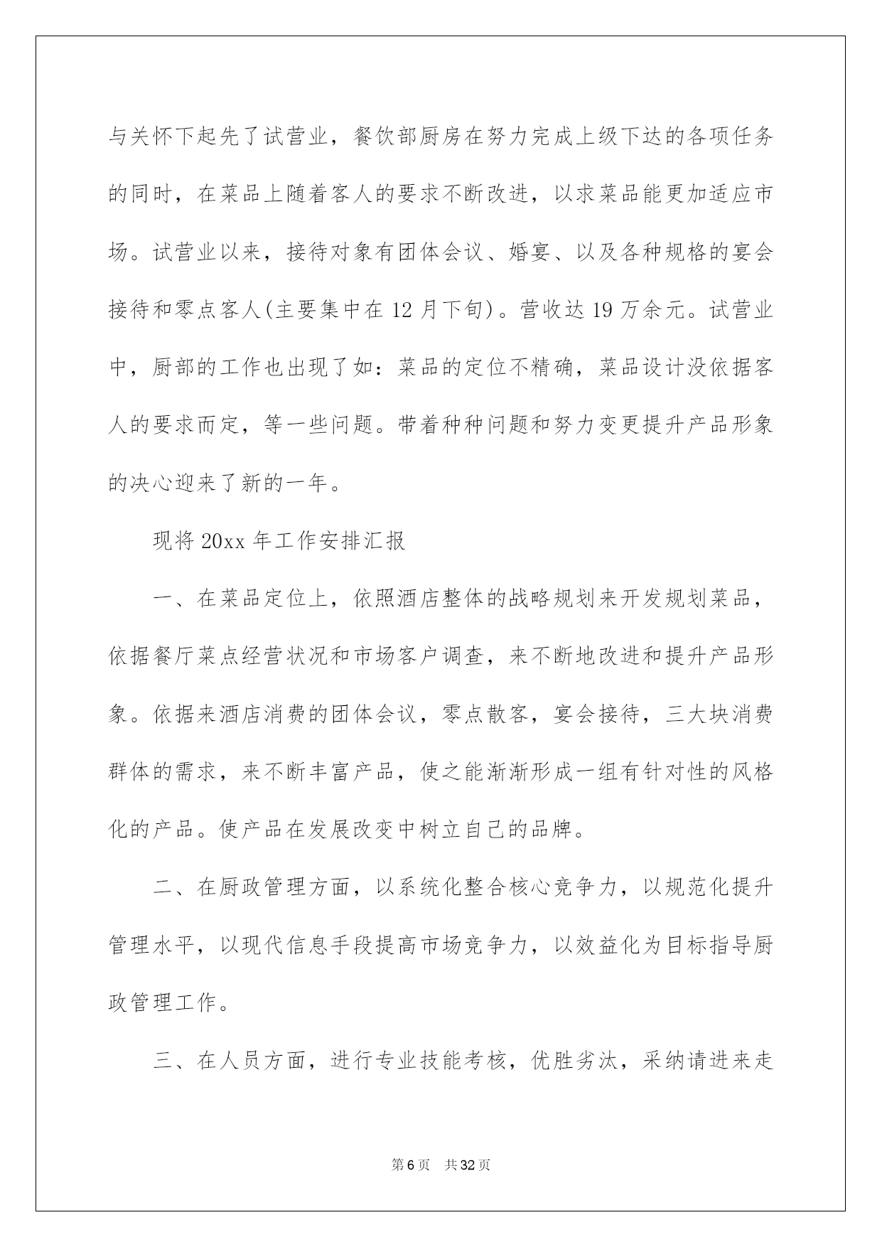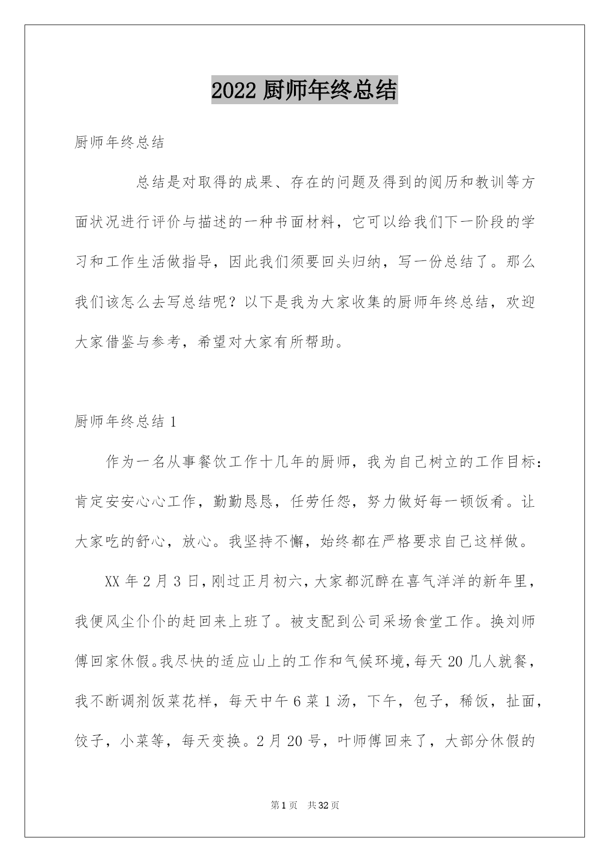 第PAGE\*Arabic\*MERGEFORMAT32页共NUMPAGES\*Arabic\*MERGEFORMAT32页第PAGE\*MERGEFORMAT32页共NUMPAGES\*MERGEFORMAT32页第PAGE\*MERGEFORMAT32页共NUMPAGES\*MERGEFORMAT32页第PAGE\*MERGEFORMAT32页共NUMPAGES\*MERGEFORMAT32页第PAGE\*MERGEFORMAT32页共NUMPAGES\*MERGEFORMAT32页第PAGE\*MERGEFORMAT32页共NUMPAGES\*MERGEFORMAT32页第PAGE\*MERGEFORMAT32页共NUMPAGES\*MERGEFORMAT32页第PAGE\*MERGEFORMAT32页共NUMPAGES\*MERGEFORMAT32页第PAGE\*MERGEFORMAT32页共NUMPAGES\*MERGEFORMAT32页第PAGE\*MERGEFORMAT32页共NUMPAGES\*MERGEFORMAT32页第PAGE\*MERGEFORMAT32页共NUMPAGES\*MERGEFORMAT32页2022厨师年终总结厨师年终总结总结是对取得的成果、存在的问题及得到的阅历和教训等方面状况进行评价与描述的一种书面材料,它可以给我们下一阶段的学习和工作生活做指导,因此我们须要回头归纳,写一份总结了。那么我们该怎么去写总结呢?以下是我为大家收集的厨师年终总结,欢迎大家借鉴与参考,希望对大家有所帮助。厨师年终总结1作为一名从事餐饮工作十几年的厨师,我为自己树立的工作目标:肯定安安心心工作,勤勤恳恳,任劳任怨,努力做好每一顿饭肴。让大家吃的舒心,放心。我坚持不懈,始终都在严格要求自己这样做。XX年2月3日,刚过正月初六,大家都沉醉在喜气洋洋的新年里,我便风尘仆仆的赶回来上班了。被支配到公司采场食堂工作。换刘师傅回家休假。我尽快的适应山上的工作和气候环境,每天20几人就餐,我不断调剂饭菜花样,每天中午6菜1汤,下午,包子,稀饭,扯面,饺子,小菜等,每天变换。2月20号,叶师傅回来了,大部分休假的职工也接连回矿上班了,我们的炊事后勤服务工作也慢慢步入正轨。3月26我被抽调到选场,协作刘师,侯师,一起。圆满完成了,公司职工吴远近和石博,两对新人的结婚喜宴。4月5月份,就餐人数越来越多,起先有外来拉矿司机上灶就餐。每天5个餐桌,桌桌爆满。我和叶师傅,紧密协作,努力工作,每天忙劳碌碌,加班加点。5月10号,叶师傅休假回家。办公室刚好支配了帮灶人员,食堂工作顺当进行着。叶师傅休假回来后,6月4号,我休假回家。7月份,我和x师傅,团结一心,接着努力工作。8月12日由于我身染恶疾,口眼歪斜,不能正常上班,被支配x治病回家了。经过70悉心治疗,我的病情渐渐康复。于10月23日回来上班。10月26日,我被抽调选场,和刘师,侯师一起顺当操办了捛博同志的结婚喜宴。11月,我和叶师傅,工作热忱高涨,紧密协作,每天变换花样,专心做好每一顿饭。顺当接待了巡山武警x人的就餐。和公司董事长,朱总一行的款待工作。12月份,我们每天按时上班,准点开饭。每天看着大家吃着,香喷喷,热腾腾可口的饭肴,我们也露出会心的笑颜。回首XX年,工作中我还有,许多不足的地方。今后,我愿坚持熬炼身体。更加努力工作,努力提高自己的烹饪技术,专心做好每一顿饭。为矿山事业,多做贡献。厨师年终总结2新的一年又来临了,回顾过去一年,感慨良多。做为一名班组长我始终严格要求自己,,仔细听从领导支配,坚持以大局为重,在领导的支持下圆满结束地一年的工作。为了再新的一年里能够更好的完成本职工作,我对上一年的工作进行了总结。在烹调上严格遵守食堂卫生制度,仔细执行卫生“五四”制。以身作则的状况下,带领全组人员,严格执行《食品卫生法》,防止“病从口入”,防止食品污染和有害物质对就餐者的危害,保障就餐者的身体健康。成品存放实行“四隔离”;生与熟隔离;成品与半成品隔离;食品与杂品、药品隔离;食物与自然冰隔离。环境卫生实行“四定”方法:定人、定物、定时间、定质量,划片分工,包干负责;个人卫生做到“四勤”:勤洗手、剪指甲;勤洗澡、理发;勤洗衣服、被褥;勤换工作服。放置食品的橱柜、货架时刻保持清洁,无霉斑、鼠迹。每天定时冲洗操作间灶具和地面,仔细擦拭餐厅地面和桌椅,严格保证操作间地面、门窗、玻璃以及周边环境卫生。在过去的一年中,我努力学习文化、政治、业务、技术学问。树立与增加为人民服务的思想。按时上下班。遵守劳动纪律及食堂的一切规章制度,努力完