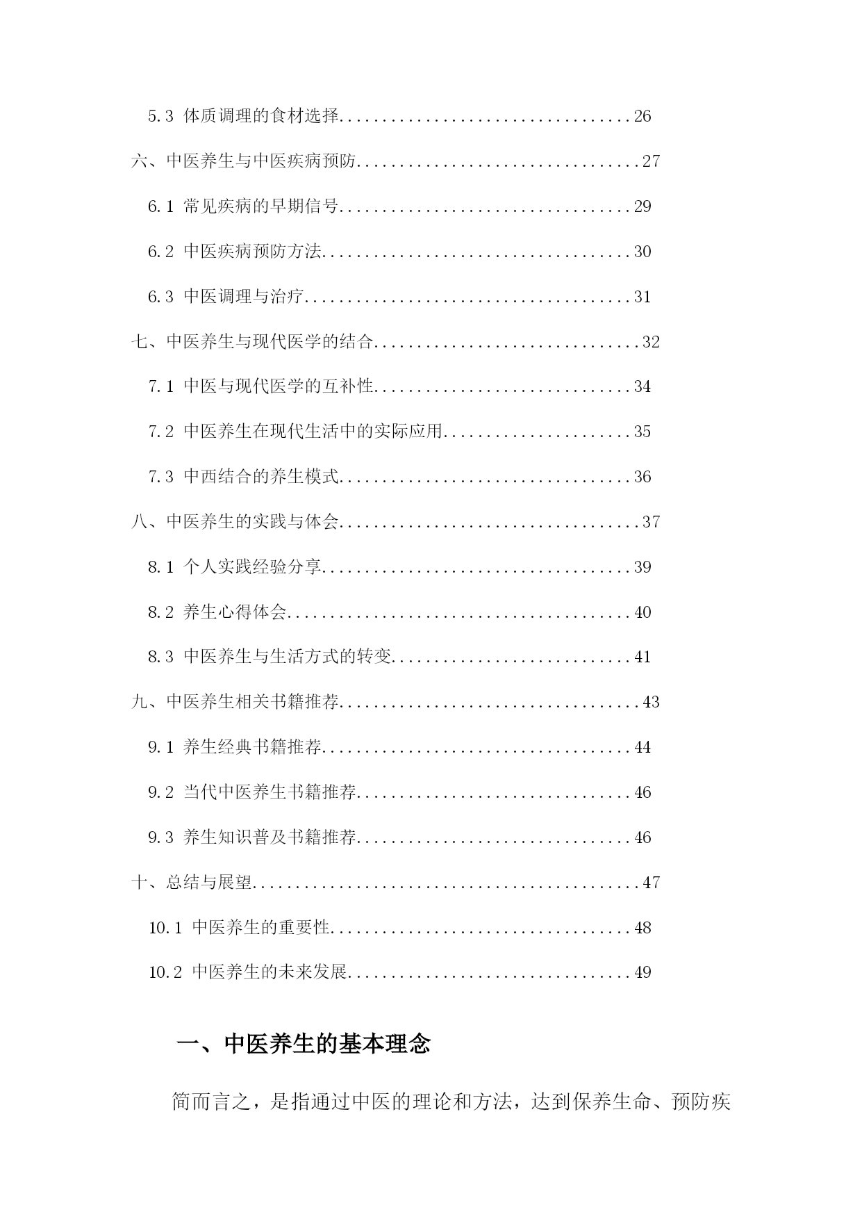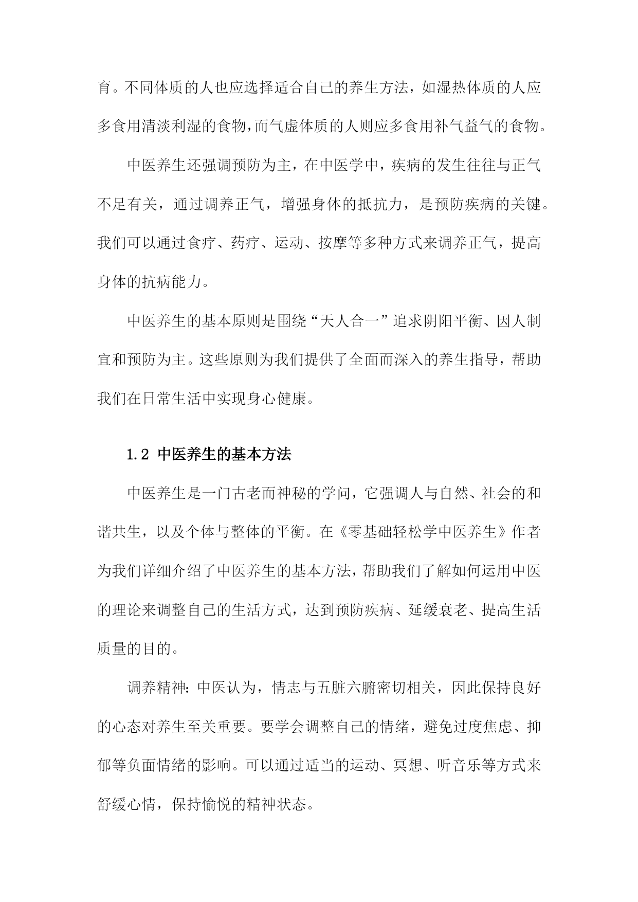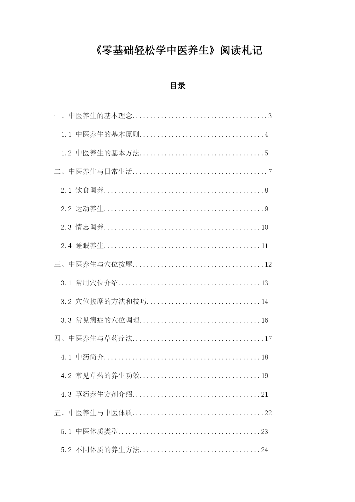 《零基础轻松学中医养生》阅读札记目录一、中医养生的基本理念......................................31.1中医养生的基本原则...................................41.2中医养生的基本方法...................................5二、中医养生与日常生活......................................72.1饮食调养.............................................82.2运动养生.............................................92.3情志调养............................................102.4睡眠养生............................................11三、中医养生与穴位按摩.....................................123.1常用穴位介绍........................................133.2穴位按摩的方法和技巧................................143.3常见病症的穴位调理..................................16四、中医养生与草药疗法.....................................174.1中药简介............................................184.2常见草药的养生功效..................................194.3草药养生方剂介绍....................................21五、中医养生与中医体质.....................................225.1中医体质类型........................................235.2不同体质的养生方法..................................245.3体质调理的食材选择..................................26六、中医养生与中医疾病预防.................................276.1常见疾病的早期信号..................................296.2中医疾病预防方法....................................306.3中医调理与治疗......................................31七、中医养生与现代医学的结合...............................327.1中医与现代医学的互补性..............................347.2中医养生在现代生活中的实际应用......................357.3中西结合的养生模式..................................36八、中医养生的实践与体会...................................378.1个人实践经验分享....................................398.2养生心得体会........................................408.3中医养生与生活方式的转变............................41九、中医养生相关书籍推荐...................................439.1养生经典书籍推荐....................................449.2当代中医养生书籍推荐................................469.3养生知识普及书籍推荐................................46十、总结与展望.............................................4710.1中医养生的重要性...................................4810.2中医养生的未来发展.................................49一、中医养生的基本理念简而言之,是指通过中医的理