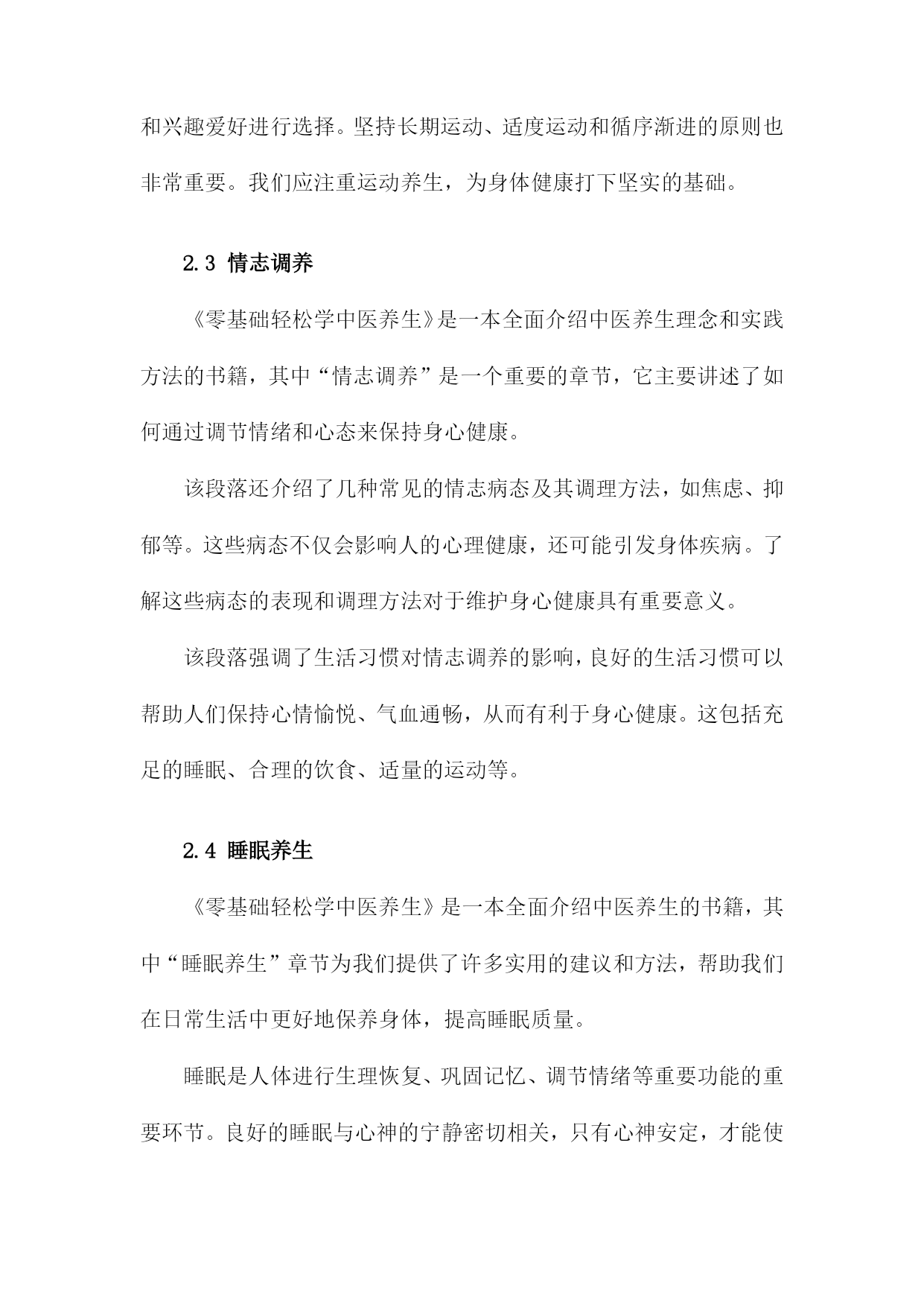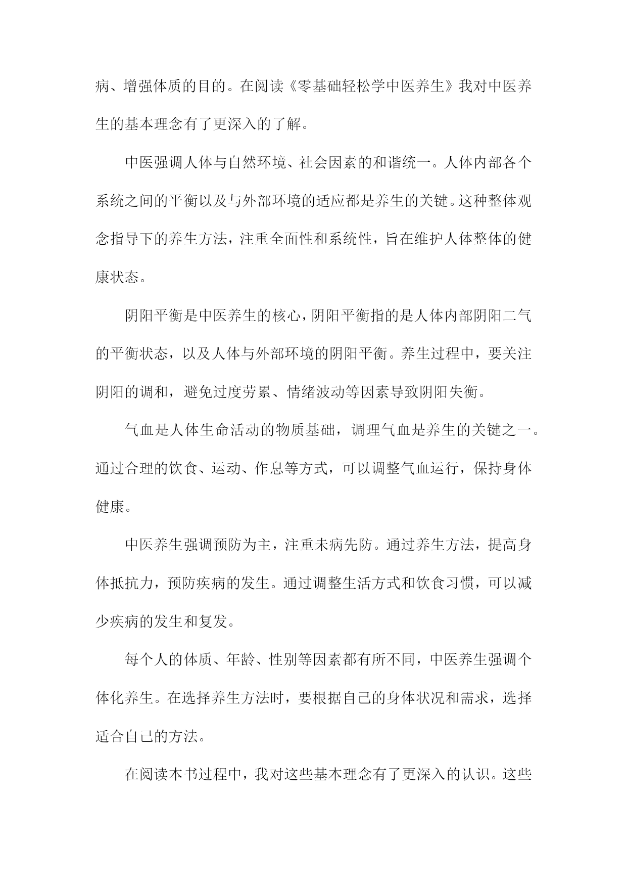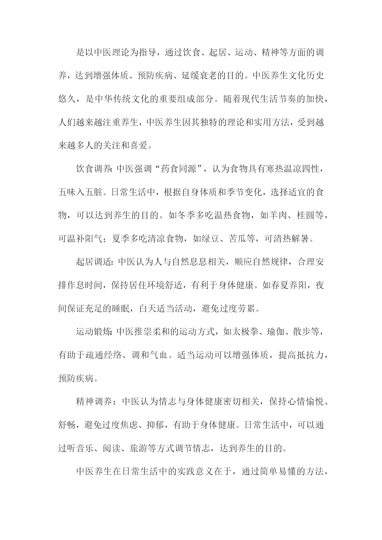 《零基础轻松学中医养生》阅读札记目录一、中医养生的基本理念......................................31.1中医养生的基本原则...................................41.2中医养生的基本方法...................................5二、中医养生与日常生活......................................72.1饮食调养.............................................82.2运动养生.............................................92.3情志调养............................................102.4睡眠养生............................................11三、中医养生与穴位按摩.....................................123.1常用穴位介绍........................................133.2穴位按摩的方法和技巧................................143.3常见病症的穴位调理..................................16四、中医养生与草药疗法.....................................174.1中药简介............................................184.2常见草药的养生功效..................................194.3草药养生方剂介绍....................................21五、中医养生与中医体质.....................................225.1中医体质类型........................................235.2不同体质的养生方法..................................245.3体质调理的食材选择..................................26六、中医养生与中医疾病预防.................................276.1常见疾病的早期信号..................................296.2中医疾病预防方法....................................306.3中医调理与治疗......................................31七、中医养生与现代医学的结合...............................327.1中医与现代医学的互补性..............................347.2中医养生在现代生活中的实际应用......................357.3中西结合的养生模式..................................36八、中医养生的实践与体会...................................378.1个人实践经验分享....................................398.2养生心得体会........................................408.3中医养生与生活方式的转变............................41九、中医养生相关书籍推荐...................................439.1养生经典书籍推荐....................................449.2当代中医养生书籍推荐................................469.3养生知识普及书籍推荐................................46十、总结与展望.............................................4710.1中医养生的重要性...................................4810.2中医养生的未来发展.................................49一、中医养生的基本理念简而言之,是指通过中医的理