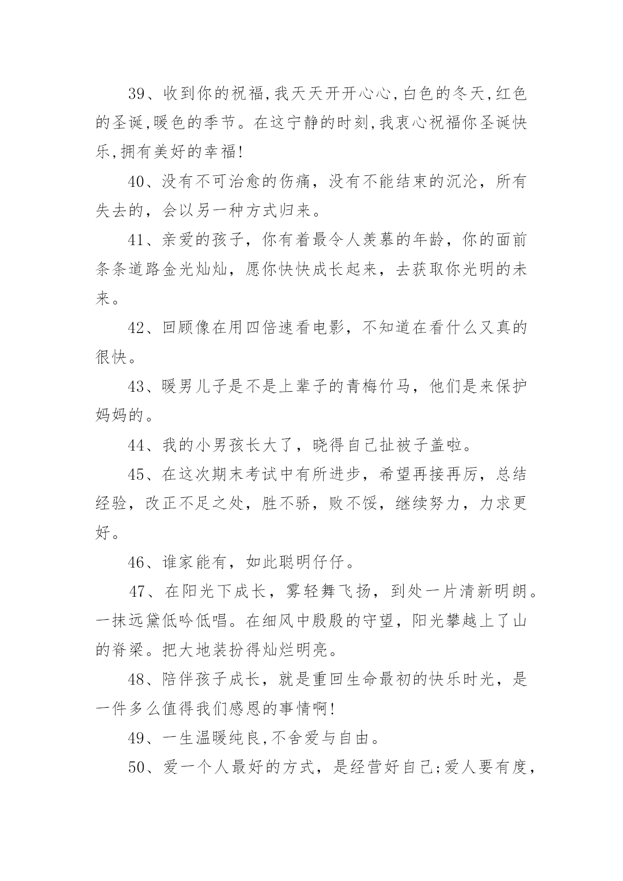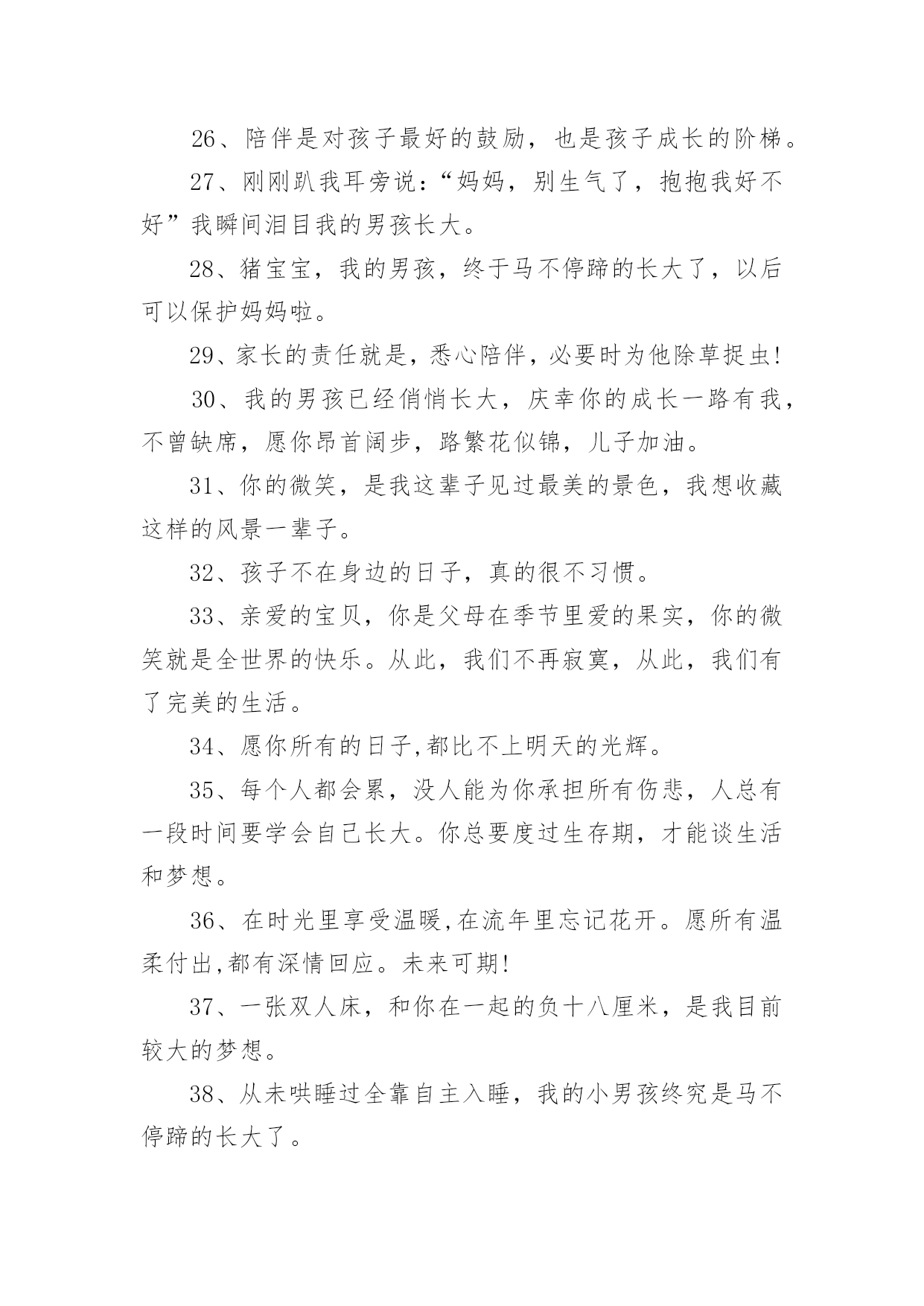 小男生一起长大的文案小男生一起长大的文案随着社交网络和信息技术的迅猛发展,越来越多人钟情于在社交平台上发布文案,文案用于记录和分享生活中有意义的事。你知道什么样的文案才能算得上是好的文案吗?以下是小编收集整理的小男生一起长大的文案,希望能够帮助到大家。1、如此陪伴着小暖男长大,我是多幸福。2、陪伴孩子成长,与孩子一起成为更好的自己。3、愿你永远嘴角上扬,愿你永远健康幸福。我的男孩终究是马不停蹄的长大了,生日快乐。4、可以吸烟,但为了我和你自己的健康要努力戒烟。5、磨快乐的针,画愉快的线,穿上幸福的衣服,为宝宝缝好运,祝宝宝百天幸福,万事如意,顺利。6、晒娃结合晒风景,标准人生赢家照。7、我希望有个如你一般的人,如山间清爽的风,如古城温暖的阳光从清晨到夜晚,从山野到书房,只要最后是你,就好。8、我的小男孩,长大了!也懂事了!接下来的日子,希望你多点自律,让妈省心。9、成功不是将来才有的,而是从决定去做的那一刻起,持续累积而成。10、纵有千古,横有八荒。前途似海,来日方长。11、快乐要懂得分享,才能加倍地快乐。12、每个人都不容易,每个人也都有优点,学会给别人掌声,你也会收获更多的掌声。13、成功有个副作用,就是以为过去的做法同样适应于将来。14、可爱的脸蛋,挥舞的腿,还有那不时噘起的小嘴,宝宝百日显富贵,一眼便知前程亮,两眼望去状元郎,多看几眼不一般,似锦的前程尽显。祝宝宝活泼健康,开心成长!15、努力到无能为力,拼搏到感动自己。16、人,总是希望自己越来越好。17、每次过安检,我总是过不去,他们说我心里装着一个你。18、以前自拍拍自己,现在和娃一起拍。19、情人节已过,不还是一样的活着。20、别着急,你看这年复一年,春光不必趁早,冬霜不会迟到,过去的都会过去,该来的都在路上,一切都是刚刚好。21、我的`小男孩长大了会担心妈妈了。22、不要相信别人会为你创造,也不允许别人取代或控制你的创造。相信自己,做自己的主人,创造自己的人生。23、爱你爱的很甜蜜,很舒服,很开心,很愉快,很幸福。24、疲惫的生活需要一个温柔的梦想和一个久违的你。25、不许你们欺负他!全世界只有我才可以!26、陪伴是对孩子最好的鼓励,也是孩子成长的阶梯。27、刚刚趴我耳旁说:“妈妈,别生气了,抱抱我好不好”我瞬间泪目我的男孩长大。28、猪宝宝,我的男孩,终于马不停蹄的长大了,以后可以保护妈妈啦。29、家长的责任就是,悉心陪伴,必要时为他除草捉虫!30、我的男孩已经俏悄长大,庆幸你的成长一路有我,不曾缺席,愿你昂首阔步,路繁花似锦,儿子加油。31、你的微笑,是我这辈子见过最美的景色,我想收藏这样的风景一辈子。32、孩子不在身边的日子,真的很不习惯。33、亲爱的宝贝,你是父母在季节里爱的果实,你的微笑就是全世界的快乐。从此,我们不再寂寞,从此,我们有了完美的生活。34、愿你所有的日子,都比不上明天的光辉。35、每个人都会累,没人能为你承担所有伤悲,人总有一段时间要学会自己长大。你总要度过生存期,才能谈生活和梦想。36、在时光里享受温暖,在流年里忘记花开。愿所有温柔付出,都有深情回应。未来可期!37、一张双人床,和你在一起的负十八厘米,是我目前较大的梦想。38、从未哄睡过全靠自主入睡,我的小男孩终究是马不停蹄的长大了。39、收到你的祝福,我天天开开心心,白色的冬天,红色的圣诞,暖色的季节。在这宁静的时刻,我衷心祝福你圣诞快乐,拥有美好的幸福!40、没有不可治愈的伤痛,没有不能结束的沉沦,所有失去的,会以另一种方式归来。41、亲爱的孩子,你有着最令人羡慕的年龄,你的面前条条道路金光灿灿,愿你快快成长起来,去获取你光明的未来。42、回顾像在用四倍速看电影,不知道在看什么又真的很快。43、暖男儿子是不是上辈子的青梅竹马,他们是来保护妈妈的。44、我的小男孩长大了,晓得自己扯被子盖啦。45、在这次期末考试中有所进步,希望再接再厉,总结经验,改正不足之处,胜不骄,败不馁,继续努力,力求更好。46、谁家能有,如此聪明仔仔。47、在阳光下成长,雾轻舞飞扬,到处一片清新明朗。一抹远黛低吟低唱。在细风中殷殷的守望,阳光攀越上了山的脊梁。把大地装扮得灿烂明亮。48、陪伴孩子成长,就是重回生命最初的快乐时光,是一件多么值得我们感恩的事情啊!49、一生温暖纯良,不舍爱与自由。50、爱一个人最好的方式,是经营好自己;爱人要有度,留一点自我,才会有自尊,你的付出才会有人重视。