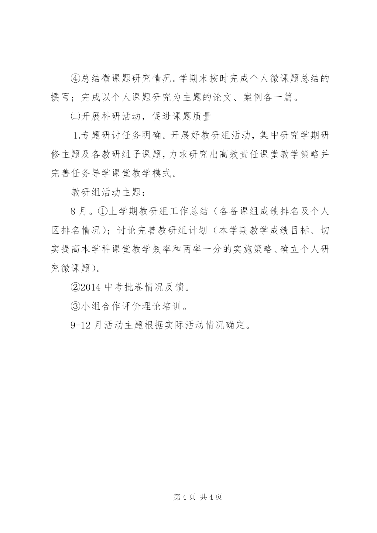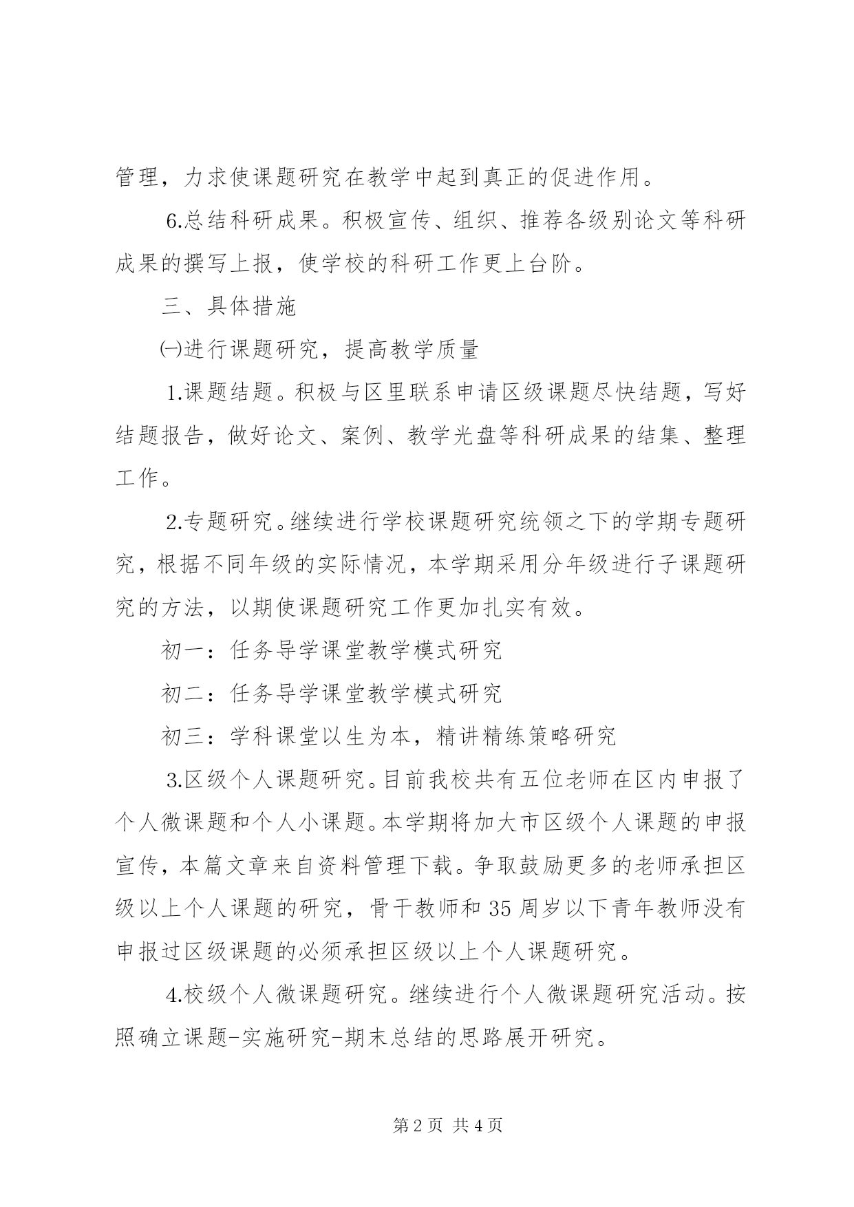 第PAGE\*Arabic\*MERGEFORMAT4页共NUMPAGES\*MERGEFORMAT4页20XX年中学科研工作计划一、指导思想以区科研室201x年工作要点为依据,以《xx市第七十七中学201x-201x学年度第一学期工作计划》为指标,以学校科研课题研究为核心,以打造高效责任课堂为目标,充分发挥科研研究、指导、服务的职能作用,深入研究提升教师科研水平,打造高效课堂,促进教学质量提升的途径和方法,为彰显学校责任教育特色,促进学校内涵发展服务。二、主要工作⒈区级课题结题。依据课题实施方案,做好学校课题《初中生课堂学习责任感培养策略与实施的研究》的论文与案例的后期整理工作和结集出版工作,做好光盘刻制工作和写好结题报告。⒉开展课题研究。继续进行责任课堂高效策略的研究,分年级进行子课题研究,以期根据不同年级的学情和特点达到提高教学质量的目的。⒊坚持科研活动。以校本论坛、教研组备课组活动为平台,围绕责任课堂高效策略研究开展主题鲜明的课题研究活动。⒋区级个人课题管理。做好201x年区级个人课题结题工作指导、审核、上报工作;做好201x年区级个人课题立项的宣传、培训、指导、审核工作。⒌校级个人微课题管理。加强教师个人微课题的确定及过程管理,力求使课题研究在教学中起到真正的促进作用。⒍总结科研成果。积极宣传、组织、推荐各级别论文等科研成果的撰写上报,使学校的科研工作更上台阶。三、具体措施㈠进行课题研究,提高教学质量⒈课题结题。积极与区里联系申请区级课题尽快结题,写好结题报告,做好论文、案例、教学光盘等科研成果的结集、整理工作。⒉专题研究。继续进行学校课题研究统领之下的学期专题研究,根据不同年级的实际情况,本学期采用分年级进行子课题研究的方法,以期使课题研究工作更加扎实有效。初一:任务导学课堂教学模式研究初二:任务导学课堂教学模式研究初三:学科课堂以生为本,精讲精练策略研究⒊区级个人课题研究。目前我校共有五位老师在区内申报了个人微课题和个人小课题。本学期将加大市区级个人课题的申报宣传,本篇文章来自资料管理下载。争取鼓励更多的老师承担区级以上个人课题的研究,骨干教师和35周岁以下青年教师没有申报过区级课题的必须承担区级以上个人课题研究。⒋校级个人微课题研究。继续进行个人微课题研究活动。按照确立课题-实施研究-期末总结的思路展开研究。①确立微课题。每位教师根据学校分学科确定的课题指南,结合本人在教学中遇到的小问题,确立本学期个人要研究的微课题。个人课题于第一次教研活动中上报给教研组长,教研组长整理到教导处下发的表格中,于8月29日下班前上交教导处。(教研组工作计划上交电子稿,教导处统一格式)。语文:初中生阅读(写作)能力培养策略研究;数学:初中数学课堂精讲多练策略研究;英语:初中英语课堂培优辅差策略研究;物化:初中物理化学实验教学在课堂上的应用研究;会考:初中某某学科生本课堂策略研究;音体美信:初中某某学科兴趣培养课堂教学策略研究。②撰写个人微课题研修计划。教师个人微课题一旦确立,将成为本学期备课、课堂实践、课后反思的一个核心问题,所有的展示课、公开课要能体现个人微课题的研究痕迹,在期末总结中要有研究心得(问题解决)的总结。通过半个学期的研究能真正解决教学实践中的某个小问题,从而对自己的教学质量提高有帮助。本篇文章来自资料管理下载。8月29日下班前上交。③进行个人课堂观察。个人课堂及所有形式的公开课均要体现个人微课题的研究。每人每学期要进行一次个人课堂观察,即观看个人课堂录像,写好观课反思,对自己的微课题研究进行评价、反思、整改。观课反思时间由教导处统一安排观课时间和地点。④总结微课题研究情况。学期末按时完成个人微课题总结的撰写;完成以个人课题研究为主题的论文、案例各一篇。㈡开展科研活动,促进课题质量⒈专题研讨任务明确。开展好教研组活动,集中研究学期研修主题及各教研组子课题,力求研究出高效责任课堂教学策略并完善任务导学课堂教学模式。教研组活动主题:8月。①上学期教研组工作总结(各备课组成绩排名及个人区排名情况);讨论完善教研组计划(本学期教学成绩目标、切实提高本学科课堂教学效率和两率一分的实施策略、确立个人研究微课题)。②2014中考批卷情况反馈。③小组合作评价理论培训。9-12月活动主题根据实际活动情况确定。