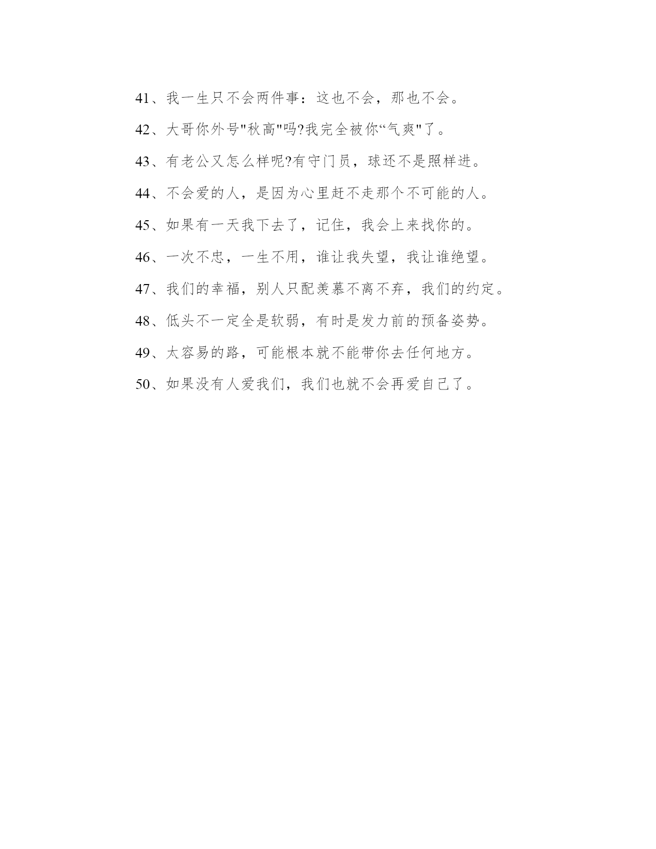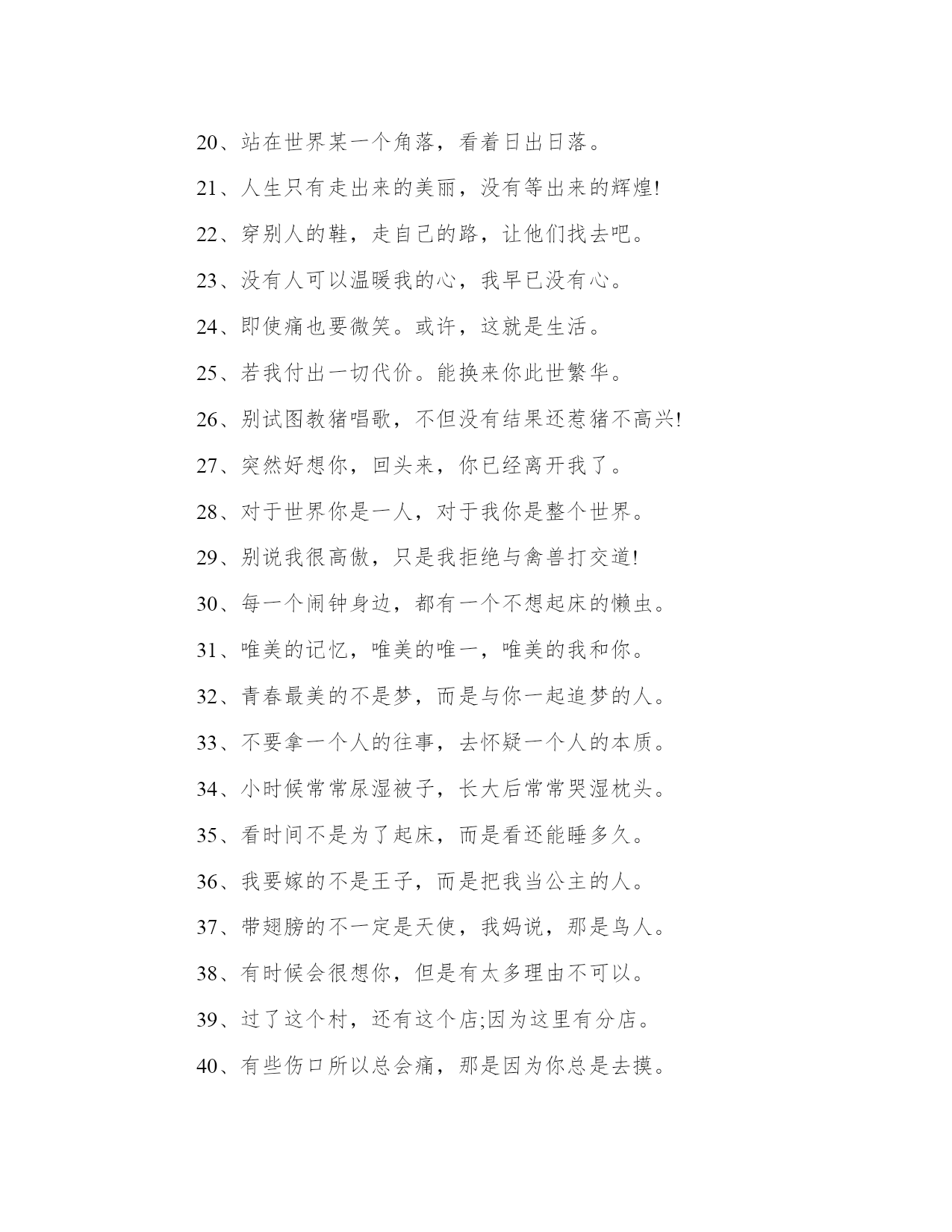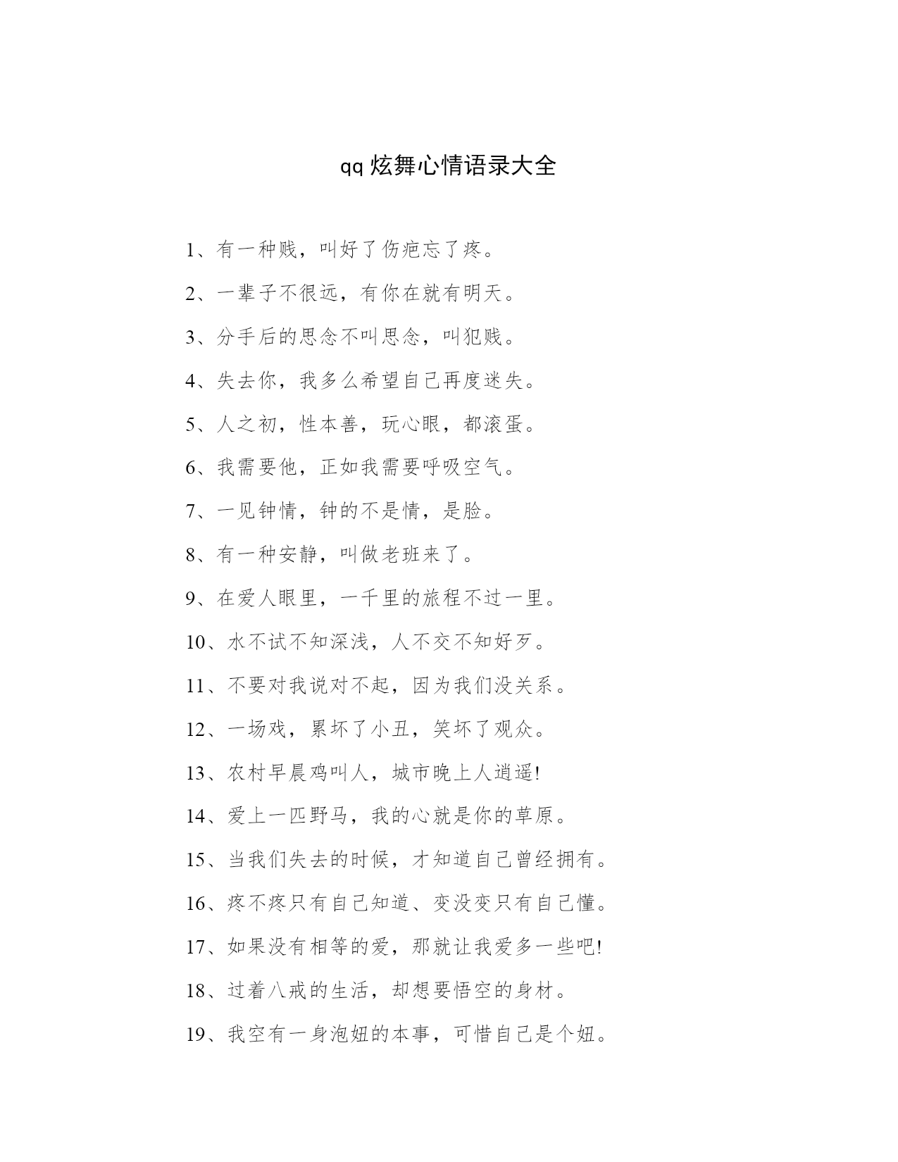 qq炫舞心情语录大全1、有一种贱,叫好了伤疤忘了疼。2、一辈子不很远,有你在就有明天。3、分手后的思念不叫思念,叫犯贱。4、失去你,我多么希望自己再度迷失。5、人之初,性本善,玩心眼,都滚蛋。6、我需要他,正如我需要呼吸空气。7、一见钟情,钟的不是情,是脸。8、有一种安静,叫做老班来了。9、在爱人眼里,一千里的旅程不过一里。10、水不试不知深浅,人不交不知好歹。11、不要对我说对不起,因为我们没关系。12、一场戏,累坏了小丑,笑坏了观众。13、农村早晨鸡叫人,城市晚上人逍遥!14、爱上一匹野马,我的心就是你的草原。15、当我们失去的时候,才知道自己曾经拥有。16、疼不疼只有自己知道、变没变只有自己懂。17、如果没有相等的爱,那就让我爱多一些吧!18、过着八戒的生活,却想要悟空的身材。19、我空有一身泡妞的本事,可惜自己是个妞。20、站在世界某一个角落,看着日出日落。21、人生只有走出来的美丽,没有等出来的辉煌!22、穿别人的鞋,走自己的路,让他们找去吧。23、没有人可以温暖我的心,我早已没有心。24、即使痛也要微笑。或许,这就是生活。25、若我付出一切代价。能换来你此世繁华。26、别试图教猪唱歌,不但没有结果还惹猪不高兴!27、突然好想你,回头来,你已经离开我了。28、对于世界你是一人,对于我你是整个世界。29、别说我很高傲,只是我拒绝与禽兽打交道!30、每一个闹钟身边,都有一个不想起床的懒虫。31、唯美的记忆,唯美的唯一,唯美的我和你。32、青春最美的不是梦,而是与你一起追梦的人。33、不要拿一个人的往事,去怀疑一个人的本质。34、小时候常常尿湿被子,长大后常常哭湿枕头。35、看时间不是为了起床,而是看还能睡多久。36、我要嫁的不是王子,而是把我当公主的人。37、带翅膀的不一定是天使,我妈说,那是鸟人。38、有时候会很想你,但是有太多理由不可以。39、过了这个村,还有这个店;因为这里有分店。40、有些伤口所以总会痛,那是因为你总是去摸。41、我一生只不会两件事:这也不会,那也不会。42、大哥你外号"秋高"吗?我完全被你“气爽"了。43、有老公又怎么样呢?有守门员,球还不是照样进。44、不会爱的人,是因为心里赶不走那个不可能的人。45、如果有一天我下去了,记住,我会上来找你的。46、一次不忠,一生不用,谁让我失望,我让谁绝望。47、我们的幸福,别人只配羡慕不离不弃,我们的约定。48、低头不一定全是软弱,有时是发力前的预备姿势。49、太容易的路,可能根本就不能带你去任何地方。50、如果没有人爱我们,我们也就不会再爱自己了。