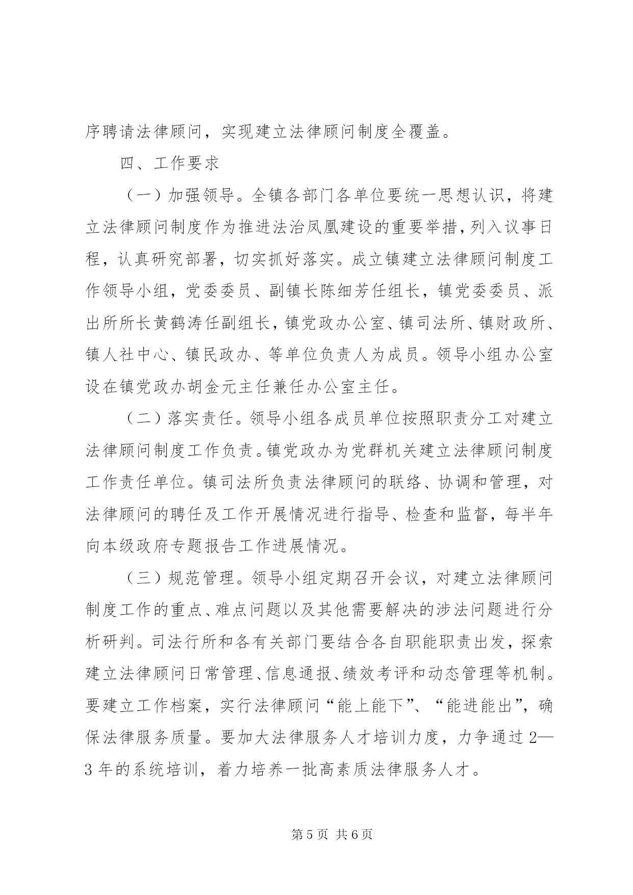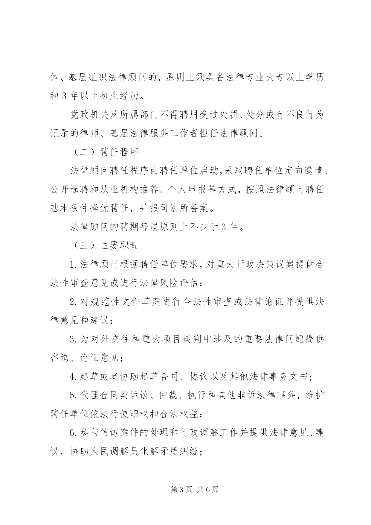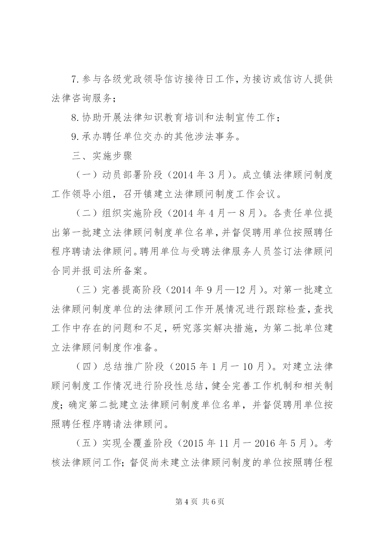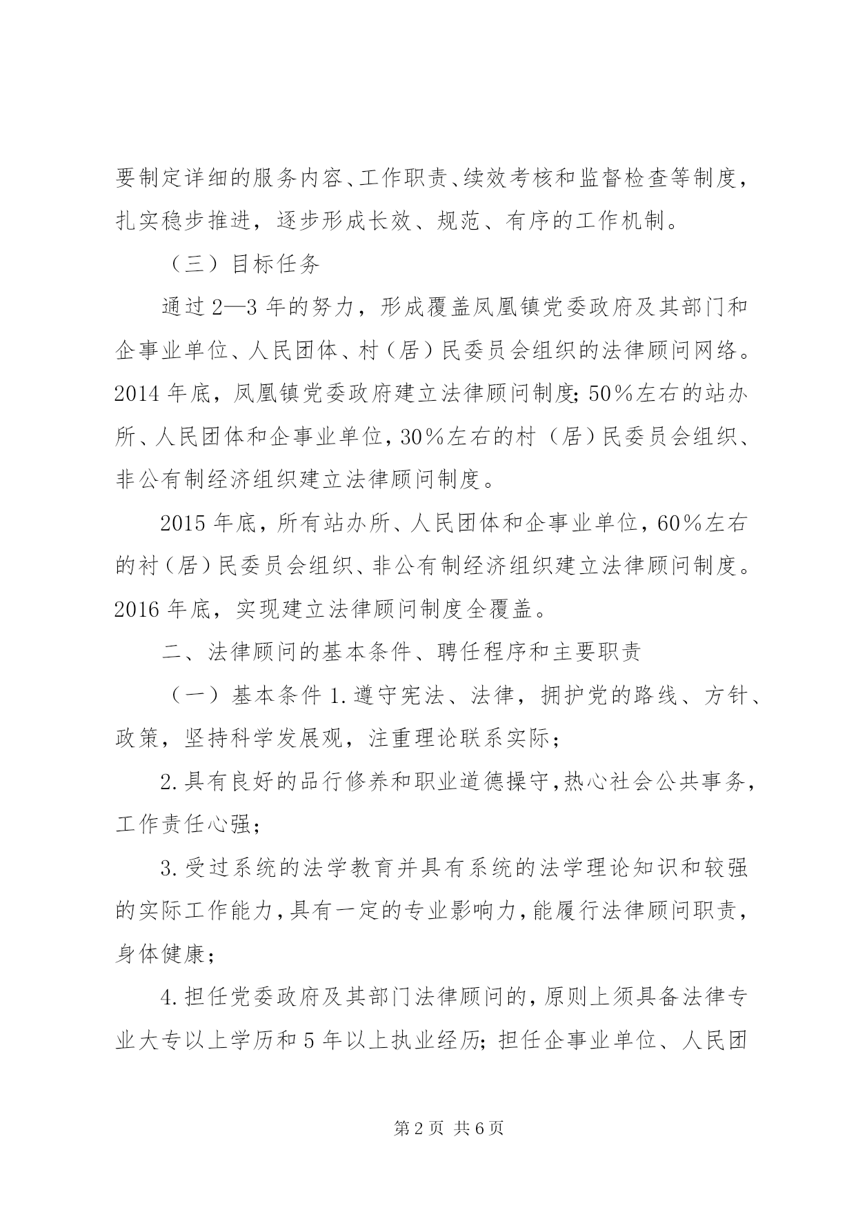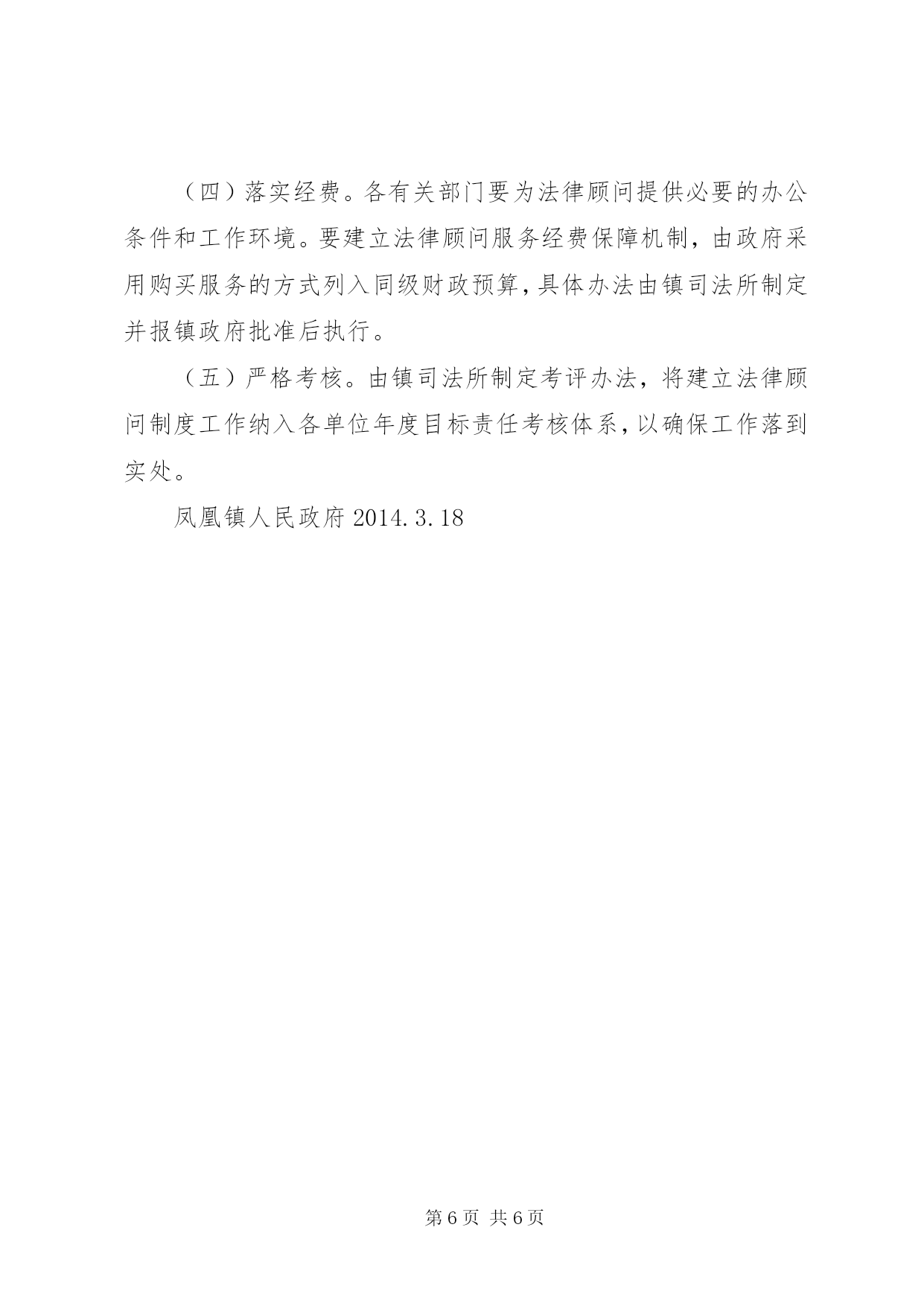 第PAGE\*Arabic\*MERGEFORMAT6页共NUMPAGES\*MERGEFORMAT6页法律顾问发言稿凤凰镇建立法律顾问制度的实施方案为全面贯彻落实党的十八届三中全会关于建立法律顾问制度的精神,加快法治凤凰建设步伐,结合实际,制定本实施方案。一、指导思想基本原则和目标任务(一)指导思想以邓小平理论、“三个代表”重要思想、科学发展观为指导,深入贯彻落实党的十八大和十八届三中全会精神,通过建立法律顾问制度,促进依法执政、依法行政、依法办事,确保各项决策和行为的科学性、正确性、合法性,进一步加快法治凤凰建设。(二)基本原则1.服务优先原则。法律顾问要从讲政治、讲大局的高度,最大限度地为聘任单位提供有效的法律咨询和法律帮助。2.正确引导原则。法律顾问在提供法律服务时,要正确引导聘任单位通过合理合法方式行使权利,维护自身权益,理性表达利益诉求,防止矛盾激化,维护社会和谐稳定。3.相互尊重原则。法律顾问要充分尊重聘任单位意愿,与聘任单位在服务方式和服务内容上努力达成共识。聘任单位要认真对待并积极采纳法律顾问提出的法律意见和建议。4.逐步规范原则。建立法律顾问制度是一项长期系统的工程,要制定详细的服务内容、工作职责、续效考核和监督检查等制度,扎实稳步推进,逐步形成长效、规范、有序的工作机制。(三)目标任务通过2—3年的努力,形成覆盖凤凰镇党委政府及其部门和企事业单位、人民团体、村(居)民委员会组织的法律顾问网络。2014年底,凤凰镇党委政府建立法律顾问制度;50%左右的站办所、人民团体和企事业单位,30%左右的村(居)民委员会组织、非公有制经济组织建立法律顾问制度。2015年底,所有站办所、人民团体和企事业单位,60%左右的衬(居)民委员会组织、非公有制经济组织建立法律顾问制度。2016年底,实现建立法律顾问制度全覆盖。二、法律顾问的基本条件、聘任程序和主要职责(一)基本条件1.遵守宪法、法律,拥护党的路线、方针、政策,坚持科学发展观,注重理论联系实际;2.具有良好的品行修养和职业道德操守,热心社会公共事务,工作责任心强;3.受过系统的法学教育并具有系统的法学理论知识和较强的实际工作能力,具有一定的专业影响力,能履行法律顾问职责,身体健康;4.担任党委政府及其部门法律顾问的,原则上须具备法律专业大专以上学历和5年以上执业经历;担任企事业单位、人民团体、基层组织法律顾问的,原则上须具备法律专业大专以上学历和3年以上执业经历。党政机关及所属部门不得聘用受过处罚、处分或有不良行为记录的律师、基层法律服务工作者担任法律顾问。(二)聘任程序法律顾问聘任程序由聘任单位启动,采取聘任单位定向邀请、公开选聘和从业机构推荐、个人申报等方式,按照法律顾问聘任基本条件择优聘任,并报司法所备案。法律顾问的聘期每届原则上不少于3年。(三)主要职责1.法律顾问根据聘任单位要求,对重大行政决策议案提供合法性审查意见或进行法律风险评估:2.对规范性文件草案进行合法性审查或法律论证并提供法律意见和建议;3.为对外交往和重大项目谈判中涉及的重要法律问题提供咨询、论证意见;4.起草或者协助起草合同、协议以及其他法律事务文书;5.代理合同类诉讼、仲裁、执行和其他非诉法律事务,维护聘任单位依法行使职权和合法权益;6.参与信访案件的处理和行政调解工作并提供法律意见、建议,协助人民调解员化解矛盾纠纷;7.参与各级党政领导信访接待日工作,为接访或信访人提供法律咨询服务;8.协助开展法律知识教育培训和法制宣传工作;9.承办聘任单位交办的其他涉法事务。三、实施步骤(一)动员部署阶段(2014年3月)。成立镇法律顾问制度工作领导小组,召开镇建立法律顾问制度工作会议。(二)组织实施阶段(2014年4月一8月)。各责任单位提出第一批建立法律顾问制度单位名单,并督促聘用单位按照聘任程序聘请法律顾问。聘用单位与受聘法律服务人员签订法律顾问合同并报司法所备案。(三)完善提高阶段(2014年9月—12月)。对第一批建立法律顾问制度单位的法律顾问工作开展情况进行跟踪检查,查找工作中存在的问题和不足,研究落实解决措施,为第二批单位建立法律顾问制度作准备。(四)总结推广阶段(2015年1月一10月)。对建立法律顾问制度工作情况进行阶段性总结,健全完善工作机制和相关制度;确定第二批建立法律顾问制度单位名单,并督促聘用单位按照聘任程序聘请法律顾问。(五)实现全覆盖阶段(2015年11月一2016年5月)。考核法律顾问工作;督促尚未建立法律顾问制度的单位按照聘任程序聘请法律顾问,实现建立法律顾问制度全覆盖。四、工作要求(一)加强领导。全镇各部门各单位要统一思想认识,将建立法律顾问制度作为推进法治凤凰建设的重要举措,列入议事日程,认真研究部署,切实抓好落实。成立镇建立法律顾问制