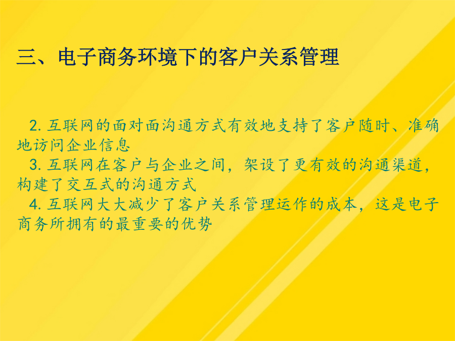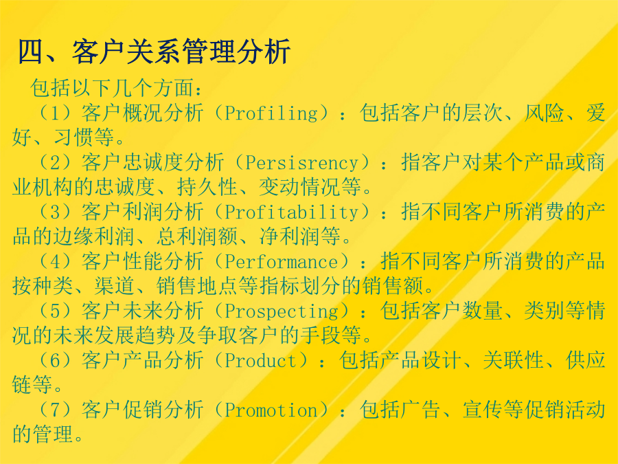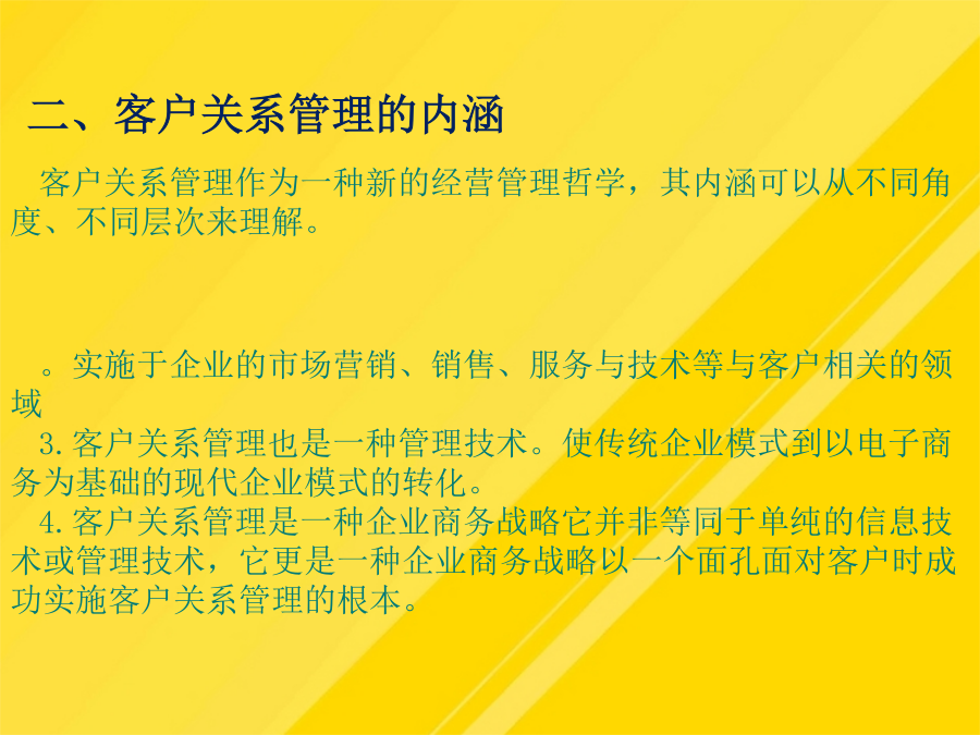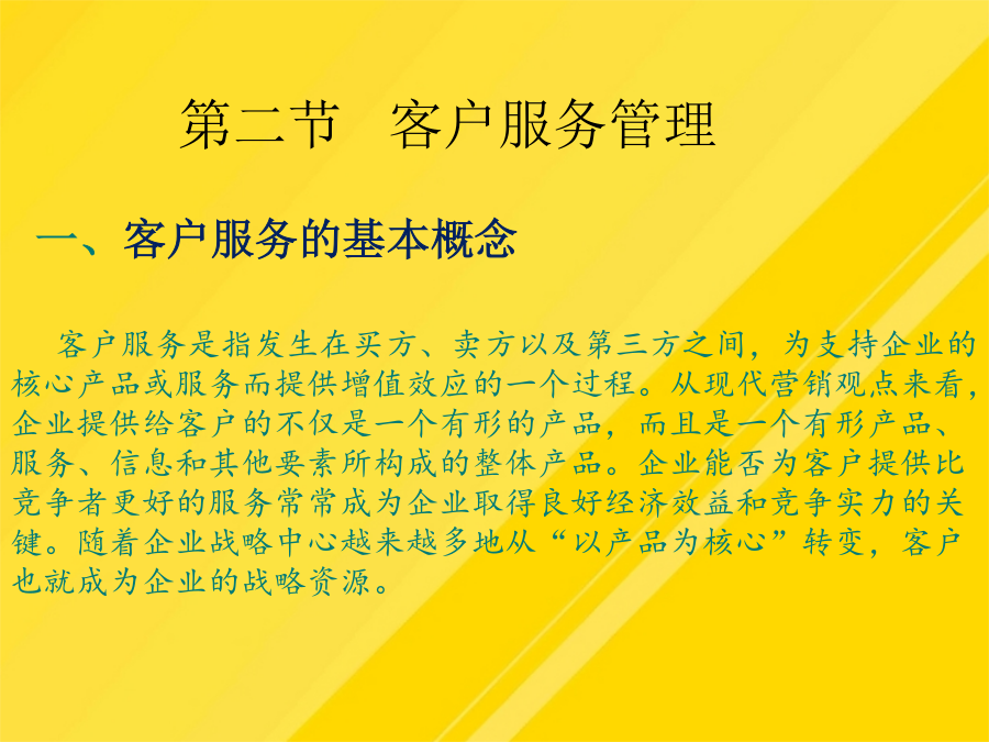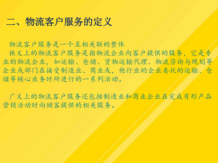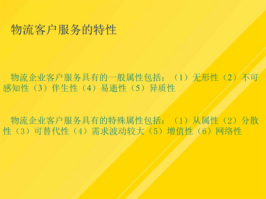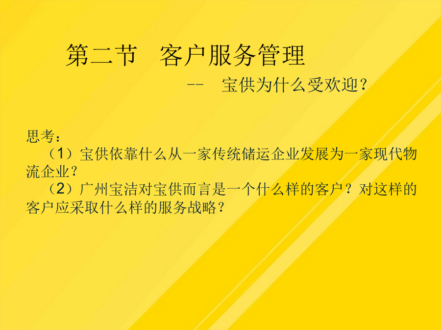 【导入案例】第一节认识客户关系管理二、客户关系管理的内涵三、电子商务环境下的客户关系管理四、客户关系管理分析五、客户关系管理的实施什么是物流客户服务?物流客户服务有哪些特点?客户服务是物流活动的主要产出功能,它能完整反映物流活动的根本目标,提供物流活动的准绳,在物流服务中发挥着越来越大的作用。(1)客户概况分析(Profiling):包括客户的层次、风险、爱好、习惯等。物流企业客户服务包含的基本内容有哪些?服务可靠性是衡量物流质量的指标(5)这些措施取得了哪些效益?服务可靠性是衡量物流质量的指标物流企业的客户增值服务有哪些分类?物流企业的客户增值服务有哪些分类?随着企业战略中心越来越多地从“以产品为核心”转变,客户也就成为企业的战略资源。三、电子商务环境下的客户关系管理(1)宝供依靠什么从一家传统储运企业发展为一家现代物流企业?优化物流企业客户服务管理的措施有哪些?(1)宝供依靠什么从一家传统储运企业发展为一家现代物流企业?概括而言,物流服务水平和物流服务成本之间有4种类型的关系如下:作业绩效是指从完成顾客订货到交付订货整个周期内的具体物流活动(3)送货服务是指从货物出库被装上货车开始,直到抵达客户处的这段时间内进行的所有活动(4)佳盈公司为提高服务质量采取了哪些措施?第二节客户服务管理二、物流客户服务的定义物流客户服务的特性四、客户服务在物流企业中的作用服务可靠性是衡量物流质量的指标为了使资料能够帮助企业决策者认识现状,就必须对客户信息进行规范与整合。三、电子商务环境下的客户关系管理优化物流企业客户服务管理的措施有哪些?让业务来驱动客户关系管理项目的实施。(1)阿尔法集团如何让麦当劳在物流服务方面具有领先优势?(四)进行“以人为本”的内部客户管理(3)送货服务是指从货物出库被装上货车开始,直到抵达客户处的这段时间内进行的所有活动(5)客户未来分析(Prospecting):包括客户数量、类别等情况的未来发展趋势及争取客户的手段等。(1)客户概况分析(Profiling):包括客户的层次、风险、爱好、习惯等。物流企业客户增值服务是指物流企业在完成物流基本功能的基础上,根据客户需求提供的各种延伸业务活动。二、物流客户服务的定义(2)广州宝洁对宝供而言是一个什么样的客户?对这样的客户应采取什么样的服务战略?一、客户服务的基本概念一、物流企业客户基本服务四、客户服务在物流企业中的作用第三节提高物流企业客户服务水平第三节提高物流企业客户服务水平二、物流企业客户增值服务(二)物流企业客户增值服务的分类三、物流企业客户服务水平的确定(二)明确服务和成本之间的关系(三)确定合适的客户服务水平第四节优化物流企业客户服务第四节优化物流企业客户服务二、物流企业客户的开发与巩固三、物流企业客户服务创新(二)物流企业客户管理创新【复习思考】【案例讨论】——物流企业阿尔法的客户服务管理讨论:(1)阿尔法集团如何让麦当劳在物流服务方面具有领先优势?(2)阿尔法集团创新客户受惠的方法有哪些?你还有什么方法?谢谢观看