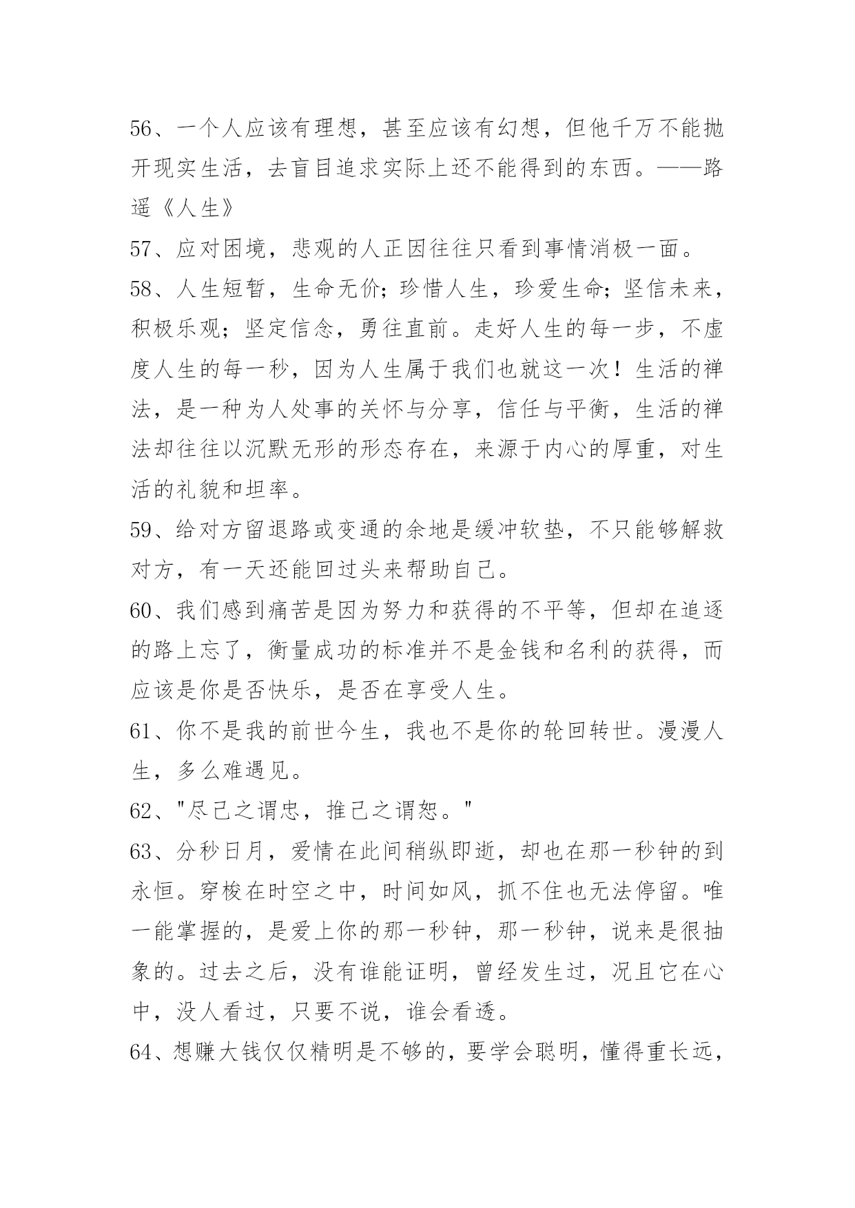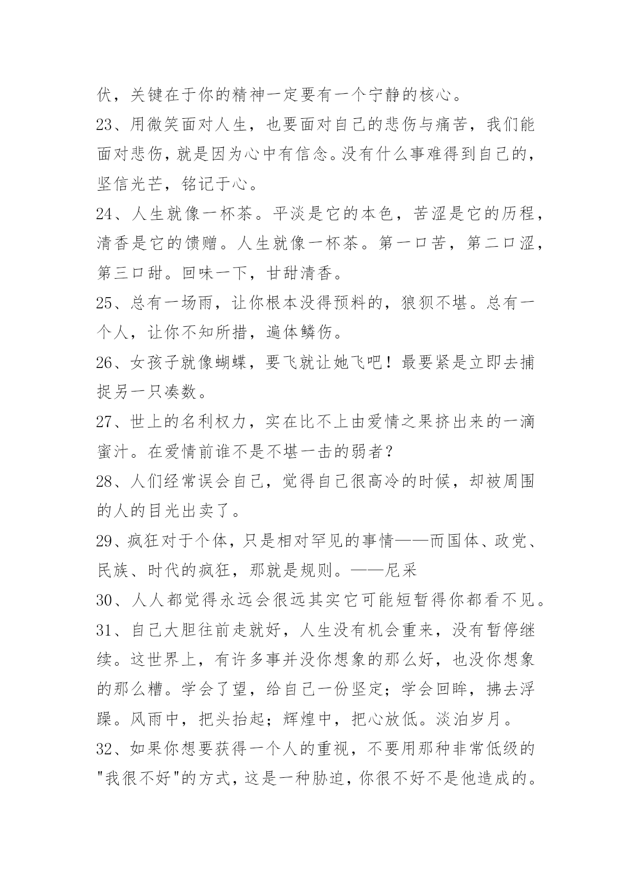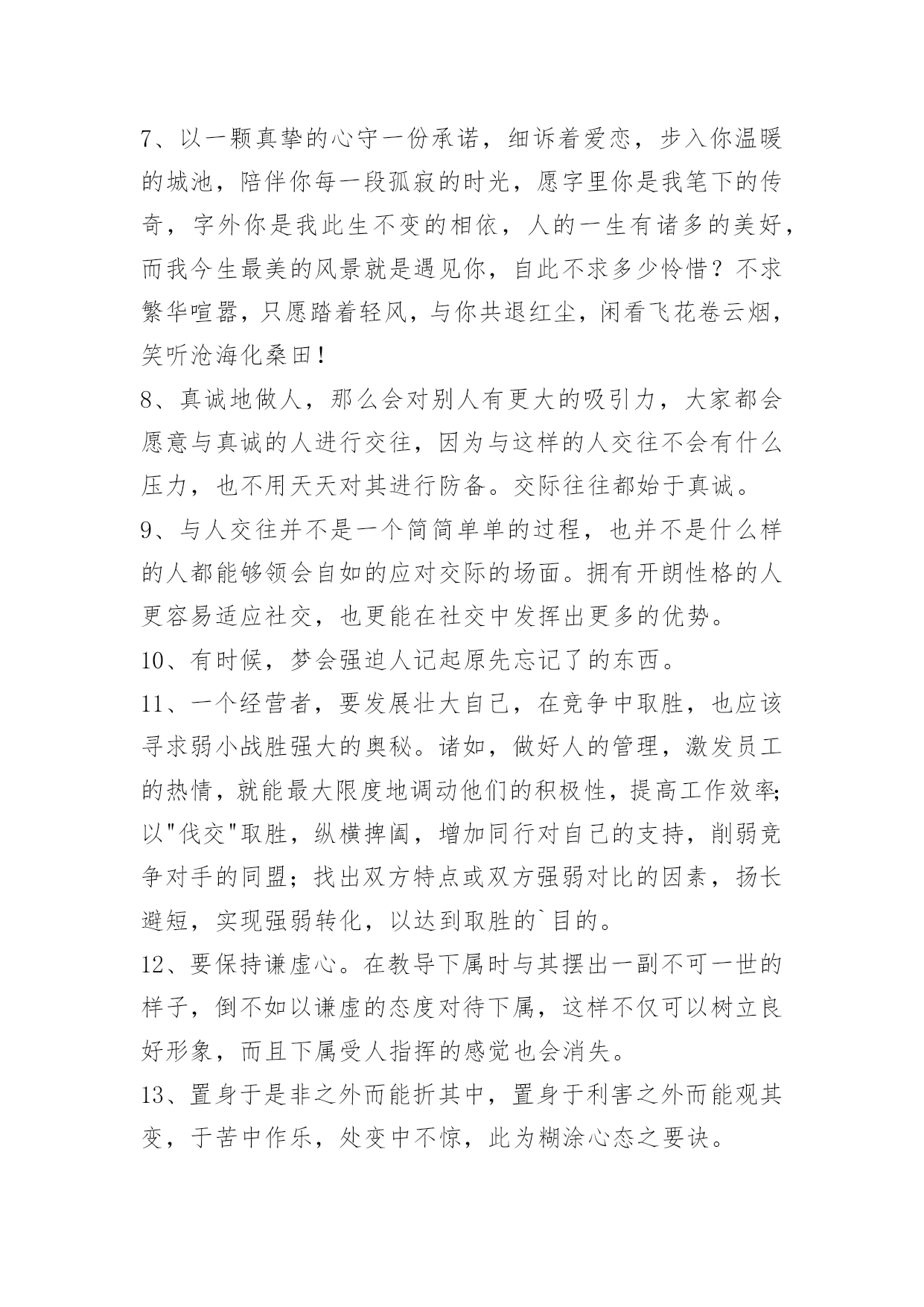 人生的哲理语录66条2022年有关人生的哲理语录集锦66条大多数人的人生,在前二三十年是一出独立播放的电影,后几十年,就成了循环播放。所以他们的人生,在前一个三十年已经过完了。以下是小编帮大家整理的人生的哲理语录66条,希望对大家有所帮助。1、几天甚至几小时此刻却有幸在岁月还未耗逝的时候就一窥究竟:别人多少年才走完的路!几十天:其中一个益处。是能填补个人人生阅历的苍白。那些原本要历经沧桑才能体会的情绪:读书如同电影镜头为你回放。2、昨天是已知的,明天是未知的,只有今天才是需要珍惜和为之努力的。3、精进努力,奋起飞扬。4、人们常常慨叹生活中缺少美,那是因为他们缺少了双发现美的眼睛。5、一个真正强大的人,不会把太多心思花在取悦和亲附别人上面。所谓圈子、资源,都只是衍生品。最重要的是提高自己的内功。只有自己修炼好了,才会有别人来亲附。自己是梧桐,凤凰才会来栖;自己是大海,百川才来汇聚,花香自有蝶飞来。你只有到了那个层次,才会有相应的圈子,而不是倒过来。6、叹气是最浪费时间的事情,哭泣是最浪费体力的行径。7、以一颗真挚的心守一份承诺,细诉着爱恋,步入你温暖的城池,陪伴你每一段孤寂的时光,愿字里你是我笔下的传奇,字外你是我此生不变的相依,人的一生有诸多的美好,而我今生最美的风景就是遇见你,自此不求多少怜惜?不求繁华喧嚣,只愿踏着轻风,与你共退红尘,闲看飞花卷云烟,笑听沧海化桑田!8、真诚地做人,那么会对别人有更大的吸引力,大家都会愿意与真诚的人进行交往,因为与这样的人交往不会有什么压力,也不用天天对其进行防备。交际往往都始于真诚。9、与人交往并不是一个简简单单的过程,也并不是什么样的人都能够领会自如的应对交际的场面。拥有开朗性格的人更容易适应社交,也更能在社交中发挥出更多的优势。10、有时候,梦会强迫人记起原先忘记了的东西。11、一个经营者,要发展壮大自己,在竞争中取胜,也应该寻求弱小战胜强大的奥秘。诸如,做好人的管理,激发员工的热情,就能最大限度地调动他们的积极性,提高工作效率;以"伐交"取胜,纵横捭阖,增加同行对自己的支持,削弱竞争对手的同盟;找出双方特点或双方强弱对比的因素,扬长避短,实现强弱转化,以达到取胜的`目的。12、要保持谦虚心。在教导下属时与其摆出一副不可一世的样子,倒不如以谦虚的态度对待下属,这样不仅可以树立良好形象,而且下属受人指挥的感觉也会消失。13、置身于是非之外而能折其中,置身于利害之外而能观其变,于苦中作乐,处变中不惊,此为糊涂心态之要诀。14、时间在流逝,每一天,都值得被认真对待。15、金钱能圆无钱时的梦,也能断无钱时的情。16、当你遇到真正爱的人时:要努力争取和他相伴一生的机会,因为当他离去时,一切都来不及了。17、有才能的人,一般都拥有相对复杂的知识结构。复杂有好处也有坏处,好处是便于融会贯通,坏处是自己经常迷路。18、有一种文明是孝道,有一种追求是完美,有一种幸福是宽容,有一种心态是放下,有一种智慧是忍耐,有一种快乐是随缘,有一种自在是舍得,澄怀悟道。19、姑姑,倘若我有不是,你尽管能够打我骂我,就算你一剑杀了我,我也心甘情愿!但是你不能不认我!20、听到一曲哀伤的音乐,听到一个凄清的故事,看到一段悲怆的文字,看到一个酸楚的画面,就会有伤感袭上心头。让人的情感,随着情景的变换,而起伏不定,引发出慈善的同情和怜悯。21、人生有很多改变自己命运的机会,人你可以不相信爱情,但是不可以不相信爱。可以冷漠,不可以冷血。比如你在街上看见一个乞丐,你可以不给他钱,因为你冷漠,不要说他可能是骗子,这不是你不帮他的理由;你如果看也不看一眼扔给他几毛钱,那是冷血。22、当你试图解开困惑,这只是迈入成熟的第一步。真正的熟润,是突然有一天,觉得所有困惑都无所谓了。内心能够容纳困惑生长的时候,才是真正与这个世界和平共处之际。你的身体尽可能在世界上奔波,你的心情尽可以在红尘中起伏,关键在于你的精神一定要有一个宁静的核心。23、用微笑面对人生,也要面对自己的悲伤与痛苦,我们能面对悲伤,就是因为心中有信念。没有什么事难得到自己的,坚信光芒,铭记于心。24、人生就像一杯茶。平淡是它的本色,苦涩是它的历程,清香是它的馈赠。人生就像一杯茶。第一口苦,第二口涩,第三口甜。回味一下,甘甜清香。25、总有一场雨,让你根本没得预料的,狼狈不堪。总有一个人,让你不知所措,遍体鳞伤。26、女孩子就像蝴蝶,要飞就让她飞吧!最要紧是立即去捕捉另一只凑数。27、世上的名利权力,实在比不上由爱情之果挤出来的一滴蜜汁。在爱情前谁不是不堪一击的弱者?28、人们经常误会自己,觉得自己很高冷的时候,却被周围的人的目光出卖了。29、疯狂对于个体,只是相对罕见的事情——而国体、政党、民族、时代的疯狂,那就是规则。——尼采30、人人都觉得永远会很远其实它可能短暂得你都