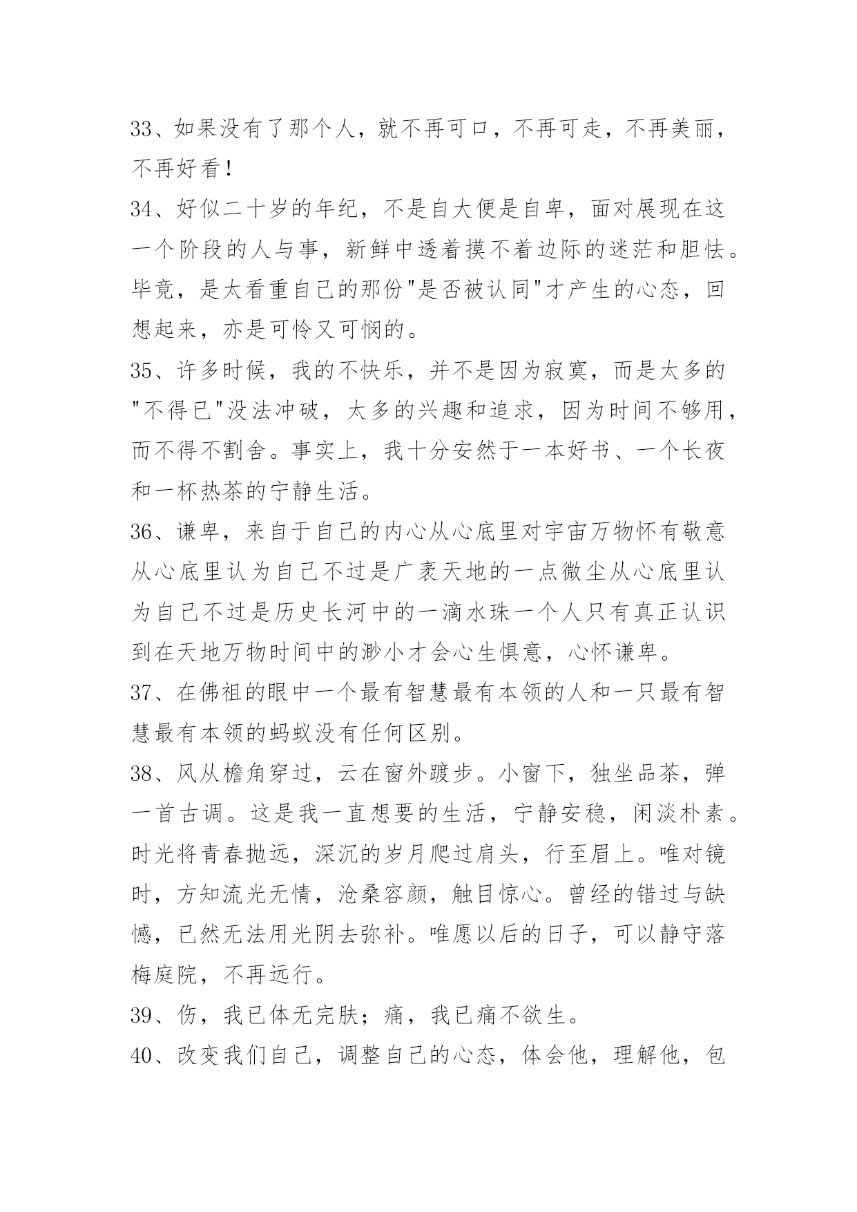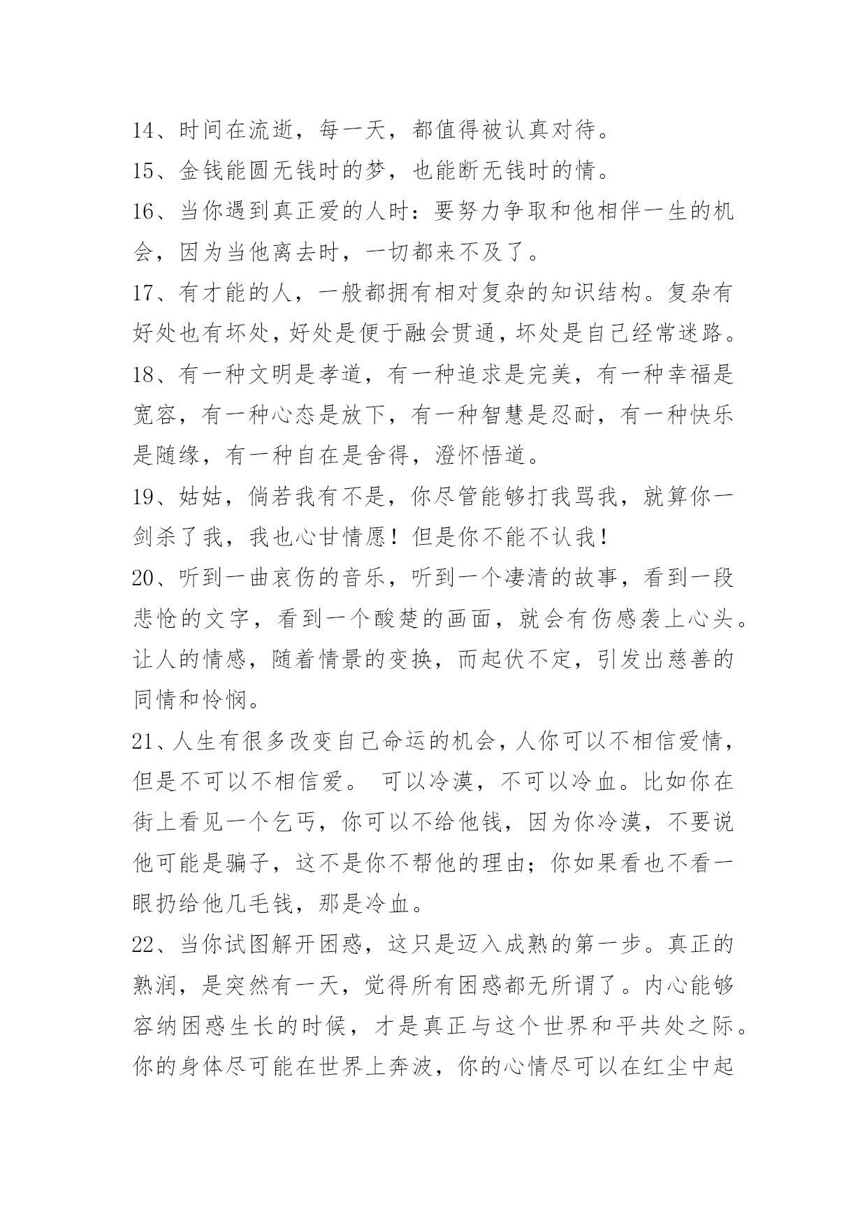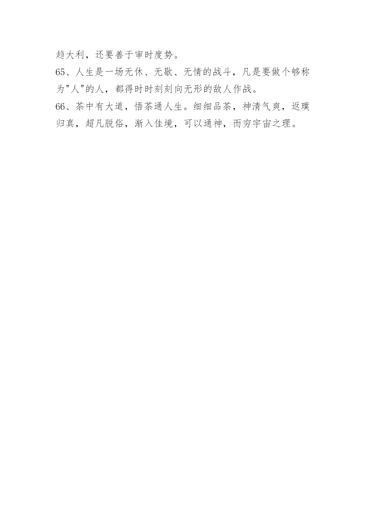 人生的哲理语录66条2022年有关人生的哲理语录集锦66条大多数人的人生,在前二三十年是一出独立播放的电影,后几十年,就成了循环播放。所以他们的人生,在前一个三十年已经过完了。以下是小编帮大家整理的人生的哲理语录66条,希望对大家有所帮助。1、几天甚至几小时此刻却有幸在岁月还未耗逝的时候就一窥究竟:别人多少年才走完的路!几十天:其中一个益处。是能填补个人人生阅历的苍白。那些原本要历经沧桑才能体会的情绪:读书如同电影镜头为你回放。2、昨天是已知的,明天是未知的,只有今天才是需要珍惜和为之努力的。3、精进努力,奋起飞扬。4、人们常常慨叹生活中缺少美,那是因为他们缺少了双发现美的眼睛。5、一个真正强大的人,不会把太多心思花在取悦和亲附别人上面。所谓圈子、资源,都只是衍生品。最重要的是提高自己的内功。只有自己修炼好了,才会有别人来亲附。自己是梧桐,凤凰才会来栖;自己是大海,百川才来汇聚,花香自有蝶飞来。你只有到了那个层次,才会有相应的圈子,而不是倒过来。6、叹气是最浪费时间的事情,哭泣是最浪费体力的行径。7、以一颗真挚的心守一份承诺,细诉着爱恋,步入你温暖的城池,陪伴你每一段孤寂的时光,愿字里你是我笔下的传奇,字外你是我此生不变的相依,人的一生有诸多的美好,而我今生最美的风景就是遇见你,自此不求多少怜惜?不求繁华喧嚣,只愿踏着轻风,与你共退红尘,闲看飞花卷云烟,笑听沧海化桑田!8、真诚地做人,那么会对别人有更大的吸引力,大家都会愿意与真诚的人进行交往,因为与这样的人交往不会有什么压力,也不用天天对其进行防备。交际往往都始于真诚。9、与人交往并不是一个简简单单的过程,也并不是什么样的人都能够领会自如的应对交际的场面。拥有开朗性格的人更容易适应社交,也更能在社交中发挥出更多的优势。10、有时候,梦会强迫人记起原先忘记了的东西。11、一个经营者,要发展壮大自己,在竞争中取胜,也应该寻求弱小战胜强大的奥秘。诸如,做好人的管理,激发员工的热情,就能最大限度地调动他们的积极性,提高工作效率;以"伐交"取胜,纵横捭阖,增加同行对自己的支持,削弱竞争对手的同盟;找出双方特点或双方强弱对比的因素,扬长避短,实现强弱转化,以达到取胜的`目的。12、要保持谦虚心。在教导下属时与其摆出一副不可一世的样子,倒不如以谦虚的态度对待下属,这样不仅可以树立良好形象,而且下属受人指挥的感觉也会消失。13、置身于是非之外而能折其中,置身于利害之外而能观其变,于苦中作乐,处变中不惊,此为糊涂心态之要诀。14、时间在流逝,每一天,都值得被认真对待。15、金钱能圆无钱时的梦,也能断无钱时的情。16、当你遇到真正爱的人时:要努力争取和他相伴一生的机会,因为当他离去时,一切都来不及了。17、有才能的人,一般都拥有相对复杂的知识结构。复杂有好处也有坏处,好处是便于融会贯通,坏处是自己经常迷路。18、有一种文明是孝道,有一种追求是完美,有一种幸福是宽容,有一种心态是放下,有一种智慧是忍耐,有一种快乐是随缘,有一种自在是舍得,澄怀悟道。19、姑姑,倘若我有不是,你尽管能够打我骂我,就算你一剑杀了我,我也心甘情愿!但是你不能不认我!20、听到一曲哀伤的音乐,听到一个凄清的故事,看到一段悲怆的文字,看到一个酸楚的画面,就会有伤感袭上心头。让人的情感,随着情景的变换,而起伏不定,引发出慈善的同情和怜悯。21、人生有很多改变自己命运的机会,人你可以不相信爱情,但是不可以不相信爱。可以冷漠,不可以冷血。比如你在街上看见一个乞丐,你可以不给他钱,因为你冷漠,不要说他可能是骗子,这不是你不帮他的理由;你如果看也不看一眼扔给他几毛钱,那是冷血。22、当你试图解开困惑,这只是迈入成熟的第一步。真正的熟润,是突然有一天,觉得所有困惑都无所谓了。内心能够容纳困惑生长的时候,才是真正与这个世界和平共处之际。你的身体尽可能在世界上奔波,你的心情尽可以在红尘中起伏,关键在于你的精神一定要有一个宁静的核心。23、用微笑面对人生,也要面对自己的悲伤与痛苦,我们能面对悲伤,就是因为心中有信念。没有什么事难得到自己的,坚信光芒,铭记于心。24、人生就像一杯茶。平淡是它的本色,苦涩是它的历程,清香是它的馈赠。人生就像一杯茶。第一口苦,第二口涩,第三口甜。回味一下,甘甜清香。25、总有一场雨,让你根本没得预料的,狼狈不堪。总有一个人,让你不知所措,遍体鳞伤。26、女孩子就像蝴蝶,要飞就让她飞吧!最要紧是立即去捕捉另一只凑数。27、世上的名利权力,实在比不上由爱情之果挤出来的一滴蜜汁。在爱情前谁不是不堪一击的弱者?28、人们经常误会自己,觉得自己很高冷的时候,却被周围的人的目光出卖了。29、疯狂对于个体,只是相对罕见的事情——而国体、政党、民族、时代的疯狂,那就是规则。——尼采30、人人都觉得永远会很远其实它可能短暂得你都