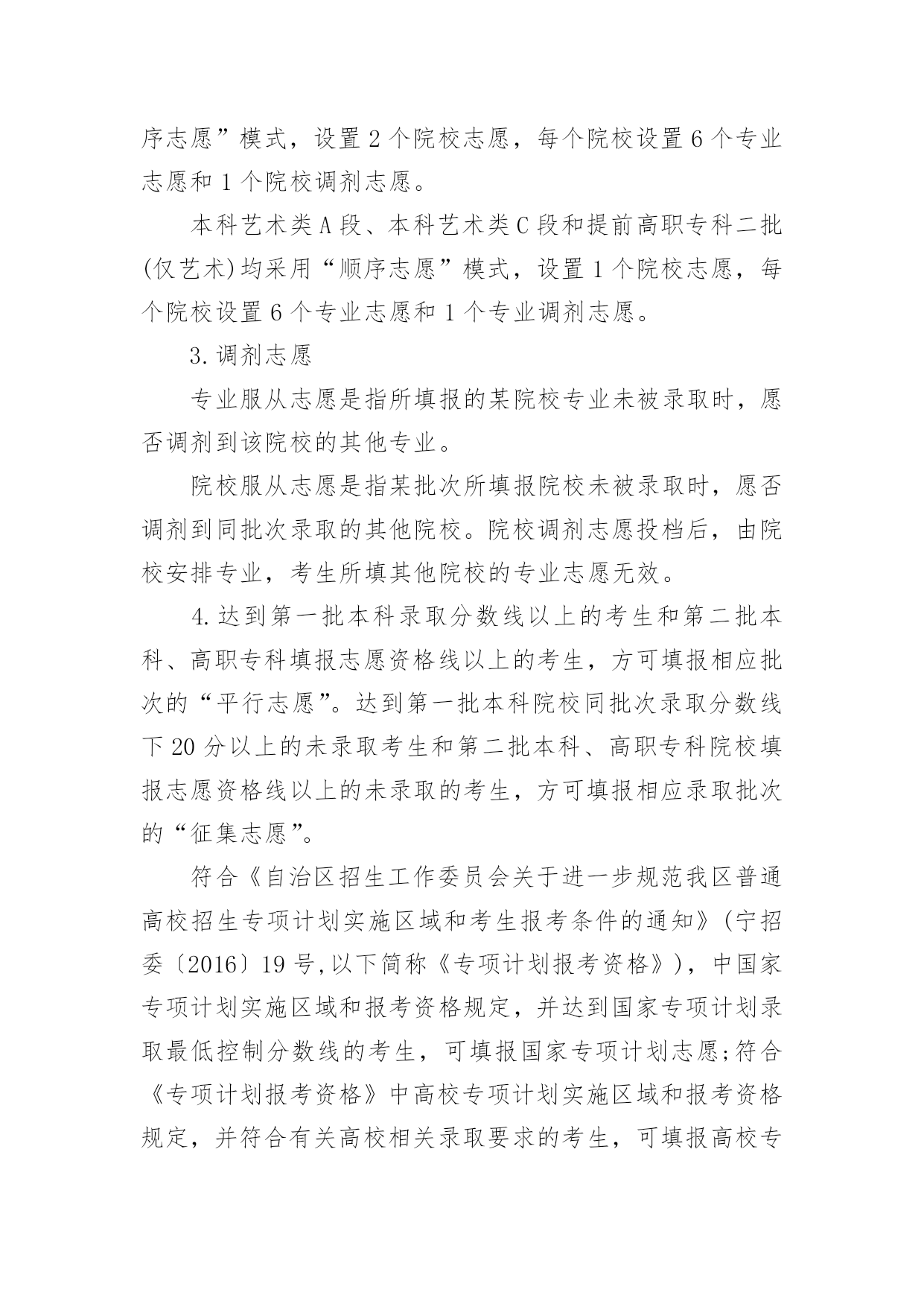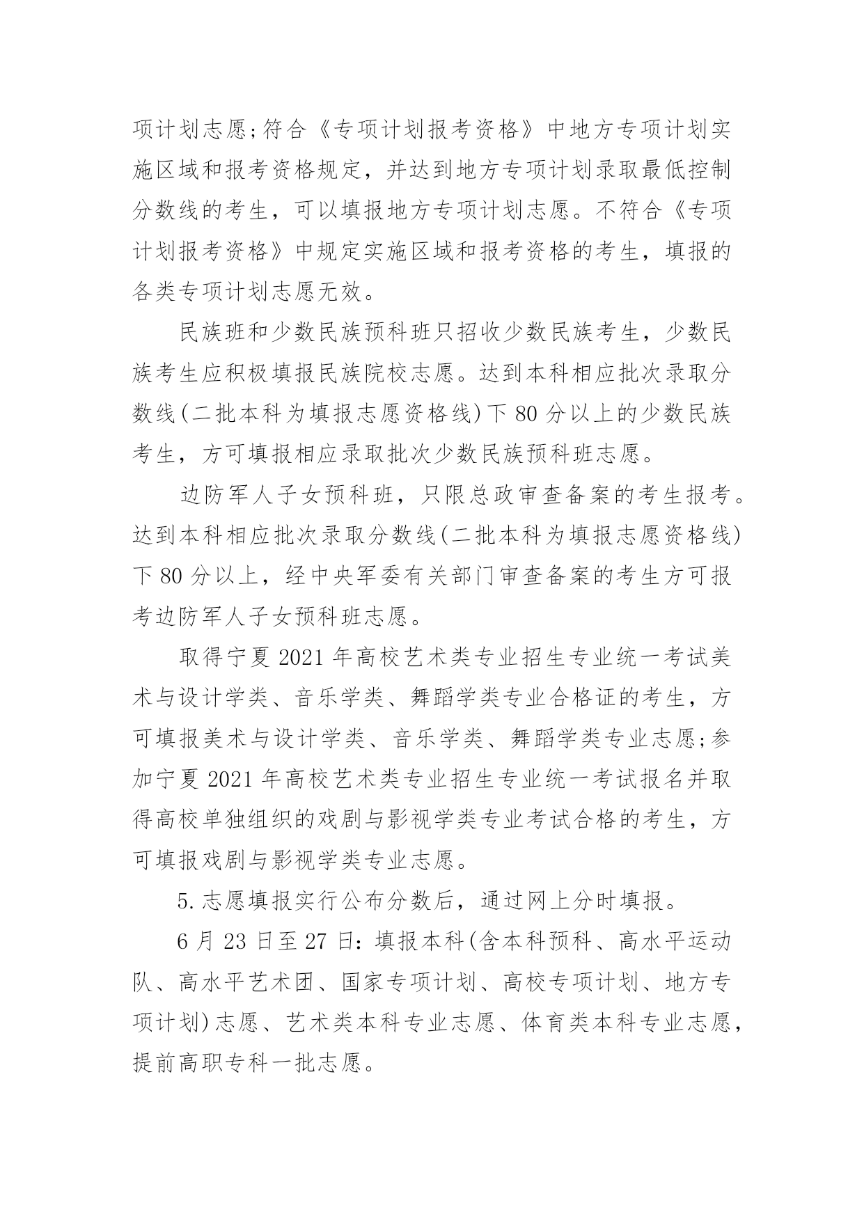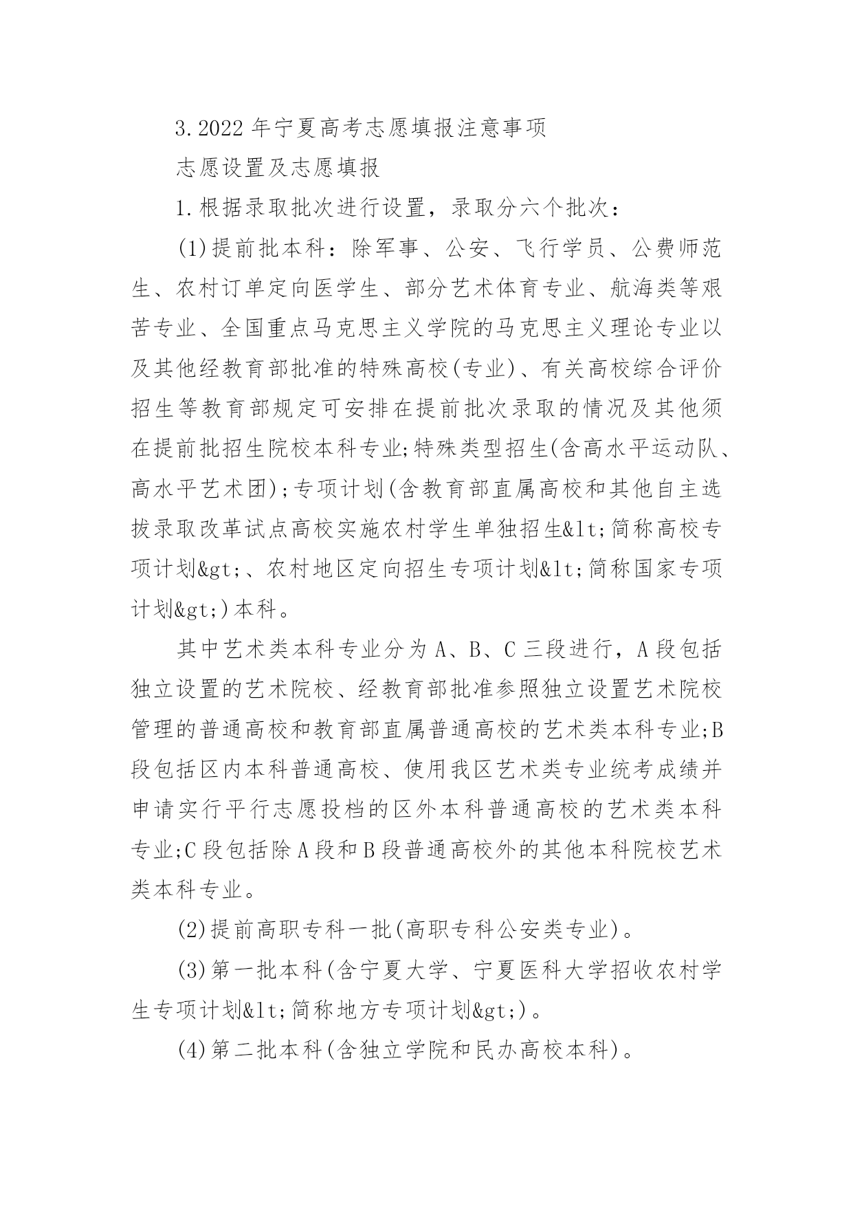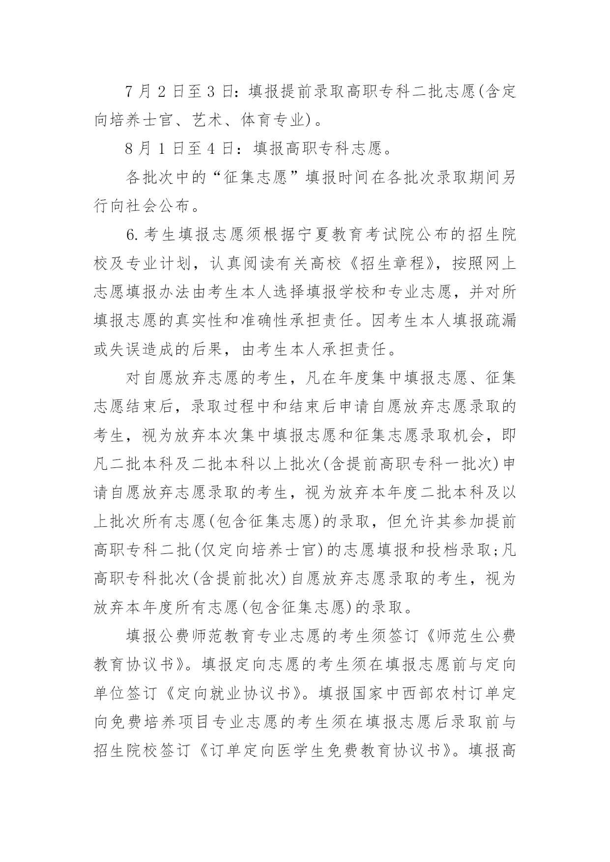 宁夏高考志愿填报指南2022宁夏高考志愿填报指南当高考结束之后,考生和家长最关心的就是什么时候出成绩了,小编今天给大家带来2022宁夏高考志愿填报指南,来看看吧!2022宁夏高考志愿填报指南1.2022年宁夏高考成绩排名及成绩查询时间各个省份高考排名一分一段表公布时间不同,高考成绩公布时间各省也都不同,考生们可以关注各个省市招生考试院及时查看。根据往年高考成绩公布时间预测,2022年宁夏高考成绩及成绩排名查询时间大概在6月23-25日,届时考生可以查询自己的成绩。2.2022年宁夏高考成绩查询方法高考生在查询高考分数的时候方法是比较多的,以下就是几种查询高考分数的方法:1、考生可以通过微信查询,考生及家长可通过微信找到所在高考省份进行查询。2、考生可以通过官网查询,考生可通过各省市教育考试官网上进行对高考成绩的查询。3、考生可能需要输入自己的准考证号和姓名或者通过身份证号进行查询。4、考生还可以电话查询,考生和家长可以通过电话查询高考成绩。3.2022年宁夏高考志愿填报注意事项志愿设置及志愿填报1.根据录取批次进行设置,录取分六个批次:(1)提前批本科:除军事、公安、飞行学员、公费师范生、农村订单定向医学生、部分艺术体育专业、航海类等艰苦专业、全国重点马克思主义学院的马克思主义理论专业以及其他经教育部批准的特殊高校(专业)、有关高校综合评价招生等教育部规定可安排在提前批次录取的情况及其他须在提前批招生院校本科专业;特殊类型招生(含高水平运动队、高水平艺术团);专项计划(含教育部直属高校和其他自主选拔录取改革试点高校实施农村学生单独招生<简称高校专项计划>、农村地区定向招生专项计划<简称国家专项计划>)本科。其中艺术类本科专业分为A、B、C三段进行,A段包括独立设置的艺术院校、经教育部批准参照独立设置艺术院校管理的普通高校和教育部直属普通高校的艺术类本科专业;B段包括区内本科普通高校、使用我区艺术类专业统考成绩并申请实行平行志愿投档的区外本科普通高校的艺术类本科专业;C段包括除A段和B段普通高校外的其他本科院校艺术类本科专业。(2)提前高职专科一批(高职专科公安类专业)。(3)第一批本科(含宁夏大学、宁夏医科大学招收农村学生专项计划<简称地方专项计划>)。(4)第二批本科(含独立学院和民办高校本科)。(5)提前高职专科二批(含定向培养士官、艺术、体育专业)。(6)高职专科批次。2.志愿设置本科艺术类B段,体育类专业,国家专项计划、高校专项计划、地方专项计划、特殊类型招生,第一批本科、第二批本科、提前高职专科二批(仅定向培养士官)、高职专科批次和各批次的少数民族预科班采取“平行志愿”投档录取模式,志愿按照“平行志愿”的要求进行设置;体育类专业、国家专项计划、地方专项计划、各批次中的少数民族预科班设置A、B、C三个并列的院校志愿;第一批本科设置A、B、C、D四个并列的院校志愿,第二批本科设置A、B、C、D、E、F、G、H八个并列的院校志愿,提前高职专科二批(仅定向培养士官)、高职专科批设置A、B、C、D四个并列的院校志愿。每个院校志愿均设置6个专业志愿及1个专业服从志愿;本科艺术类B段实行平行志愿投档录取模式,按专业大类投档,每个专业大类分别设6个并列的院校志愿,每个院校志愿设置6个专业志愿和1个专业调剂志愿;“平行志愿”录取结束后,对未完成的.招生计划,设置“征集志愿”。“征集志愿”的填报同样采用“平行志愿”模式。提前批本科中除艺术类B段、体育类专业、国家专项计划、高校专项计划、特殊类型招生,其他本科专业采用“顺序志愿”模式,设置2个院校志愿,每个院校设置6个专业志愿和1个院校调剂志愿。本科艺术类A段、本科艺术类C段和提前高职专科二批(仅艺术)均采用“顺序志愿”模式,设置1个院校志愿,每个院校设置6个专业志愿和1个专业调剂志愿。3.调剂志愿专业服从志愿是指所填报的某院校专业未被录取时,愿否调剂到该院校的其他专业。院校服从志愿是指某批次所填报院校未被录取时,愿否调剂到同批次录取的其他院校。院校调剂志愿投档后,由院校安排专业,考生所填其他院校的专业志愿无效。4.达到第一批本科录取分数线以上的考生和第二批本科、高职专科填报志愿资格线以上的考生,方可填报相应批次的“平行志愿”。达到第一批本科院校同批次录取分数线下20分以上的未录取考生和第二批本科、高职专科院校填报志愿资格线以上的未录取的考生,方可填报相应录取批次的“征集志愿”。符合《自治区招生工作委员会关于进一步规范我区普通高校招生专项计划实施区域和考生报考条件的通知》(宁招委〔2016〕19号,以下简称《专项计划报考资格》),中国家专项计划实施区域和报考资格规定,并达到国家专项计划录取最低控制分数线的考生,可填报国家专项计划志愿;符合《专项计划报