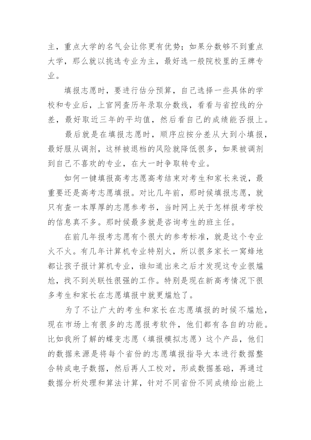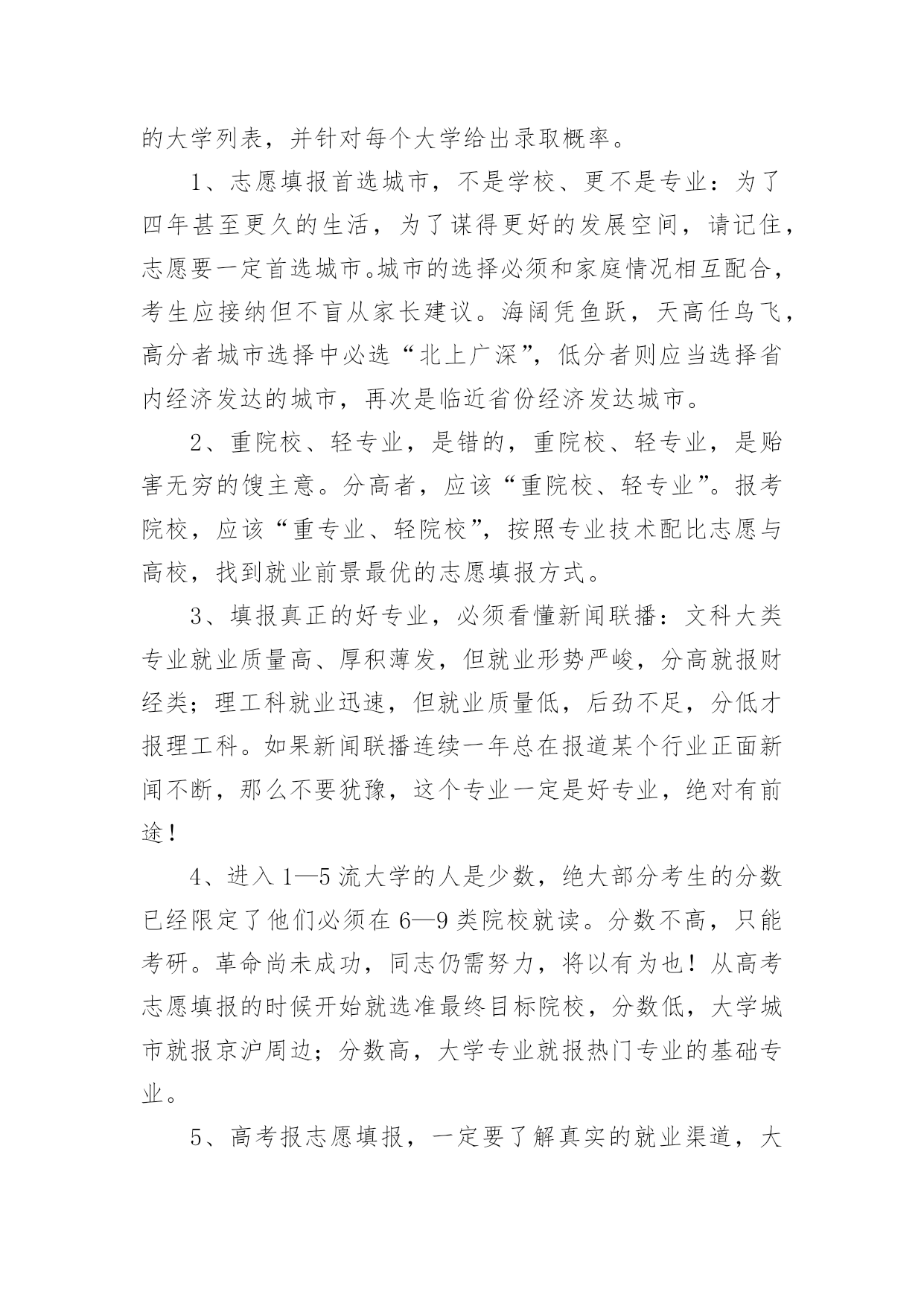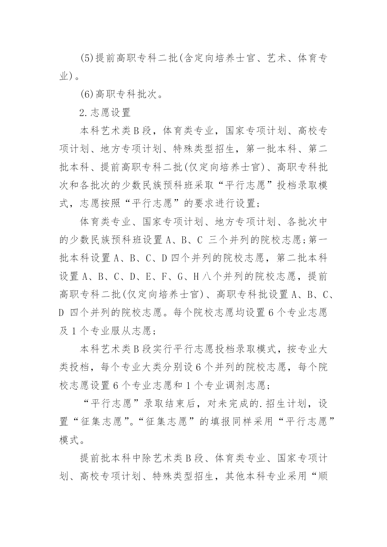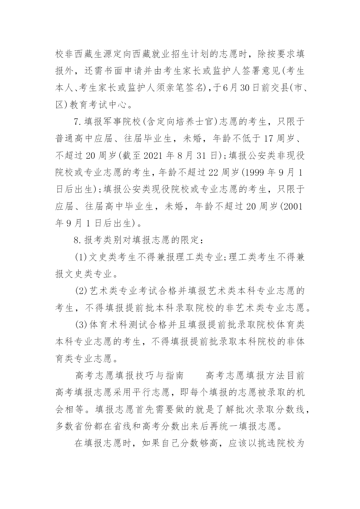 宁夏高考志愿填报指南2022宁夏高考志愿填报指南当高考结束之后,考生和家长最关心的就是什么时候出成绩了,小编今天给大家带来2022宁夏高考志愿填报指南,来看看吧!2022宁夏高考志愿填报指南1.2022年宁夏高考成绩排名及成绩查询时间各个省份高考排名一分一段表公布时间不同,高考成绩公布时间各省也都不同,考生们可以关注各个省市招生考试院及时查看。根据往年高考成绩公布时间预测,2022年宁夏高考成绩及成绩排名查询时间大概在6月23-25日,届时考生可以查询自己的成绩。2.2022年宁夏高考成绩查询方法高考生在查询高考分数的时候方法是比较多的,以下就是几种查询高考分数的方法:1、考生可以通过微信查询,考生及家长可通过微信找到所在高考省份进行查询。2、考生可以通过官网查询,考生可通过各省市教育考试官网上进行对高考成绩的查询。3、考生可能需要输入自己的准考证号和姓名或者通过身份证号进行查询。4、考生还可以电话查询,考生和家长可以通过电话查询高考成绩。3.2022年宁夏高考志愿填报注意事项志愿设置及志愿填报1.根据录取批次进行设置,录取分六个批次:(1)提前批本科:除军事、公安、飞行学员、公费师范生、农村订单定向医学生、部分艺术体育专业、航海类等艰苦专业、全国重点马克思主义学院的马克思主义理论专业以及其他经教育部批准的特殊高校(专业)、有关高校综合评价招生等教育部规定可安排在提前批次录取的情况及其他须在提前批招生院校本科专业;特殊类型招生(含高水平运动队、高水平艺术团);专项计划(含教育部直属高校和其他自主选拔录取改革试点高校实施农村学生单独招生<简称高校专项计划>、农村地区定向招生专项计划<简称国家专项计划>)本科。其中艺术类本科专业分为A、B、C三段进行,A段包括独立设置的艺术院校、经教育部批准参照独立设置艺术院校管理的普通高校和教育部直属普通高校的艺术类本科专业;B段包括区内本科普通高校、使用我区艺术类专业统考成绩并申请实行平行志愿投档的区外本科普通高校的艺术类本科专业;C段包括除A段和B段普通高校外的其他本科院校艺术类本科专业。(2)提前高职专科一批(高职专科公安类专业)。(3)第一批本科(含宁夏大学、宁夏医科大学招收农村学生专项计划<简称地方专项计划>)。(4)第二批本科(含独立学院和民办高校本科)。(5)提前高职专科二批(含定向培养士官、艺术、体育专业)。(6)高职专科批次。2.志愿设置本科艺术类B段,体育类专业,国家专项计划、高校专项计划、地方专项计划、特殊类型招生,第一批本科、第二批本科、提前高职专科二批(仅定向培养士官)、高职专科批次和各批次的少数民族预科班采取“平行志愿”投档录取模式,志愿按照“平行志愿”的要求进行设置;体育类专业、国家专项计划、地方专项计划、各批次中的少数民族预科班设置A、B、C三个并列的院校志愿;第一批本科设置A、B、C、D四个并列的院校志愿,第二批本科设置A、B、C、D、E、F、G、H八个并列的院校志愿,提前高职专科二批(仅定向培养士官)、高职专科批设置A、B、C、D四个并列的院校志愿。每个院校志愿均设置6个专业志愿及1个专业服从志愿;本科艺术类B段实行平行志愿投档录取模式,按专业大类投档,每个专业大类分别设6个并列的院校志愿,每个院校志愿设置6个专业志愿和1个专业调剂志愿;“平行志愿”录取结束后,对未完成的.招生计划,设置“征集志愿”。“征集志愿”的填报同样采用“平行志愿”模式。提前批本科中除艺术类B段、体育类专业、国家专项计划、高校专项计划、特殊类型招生,其他本科专业采用“顺序志愿”模式,设置2个院校志愿,每个院校设置6个专业志愿和1个院校调剂志愿。本科艺术类A段、本科艺术类C段和提前高职专科二批(仅艺术)均采用“顺序志愿”模式,设置1个院校志愿,每个院校设置6个专业志愿和1个专业调剂志愿。3.调剂志愿专业服从志愿是指所填报的某院校专业未被录取时,愿否调剂到该院校的其他专业。院校服从志愿是指某批次所填报院校未被录取时,愿否调剂到同批次录取的其他院校。院校调剂志愿投档后,由院校安排专业,考生所填其他院校的专业志愿无效。4.达到第一批本科录取分数线以上的考生和第二批本科、高职专科填报志愿资格线以上的考生,方可填报相应批次的“平行志愿”。达到第一批本科院校同批次录取分数线下20分以上的未录取考生和第二批本科、高职专科院校填报志愿资格线以上的未录取的考生,方可填报相应录取批次的“征集志愿”。符合《自治区招生工作委员会关于进一步规范我区普通高校招生专项计划实施区域和考生报考条件的通知》(宁招委〔2016〕19号,以下简称《专项计划报考资格》),中国家专项计划实施区域和报考资格规定,并达到国家专项计划录取最低控制分数线的考生,可填报国家专项计划志愿;符合《专项计划报