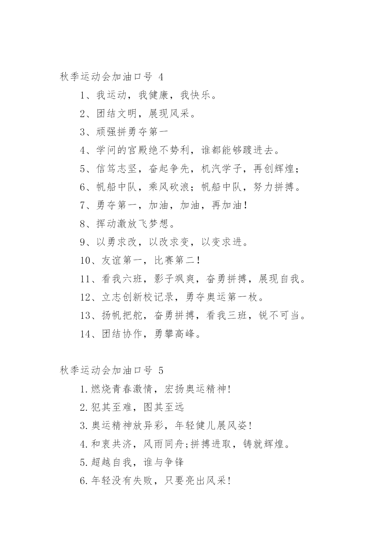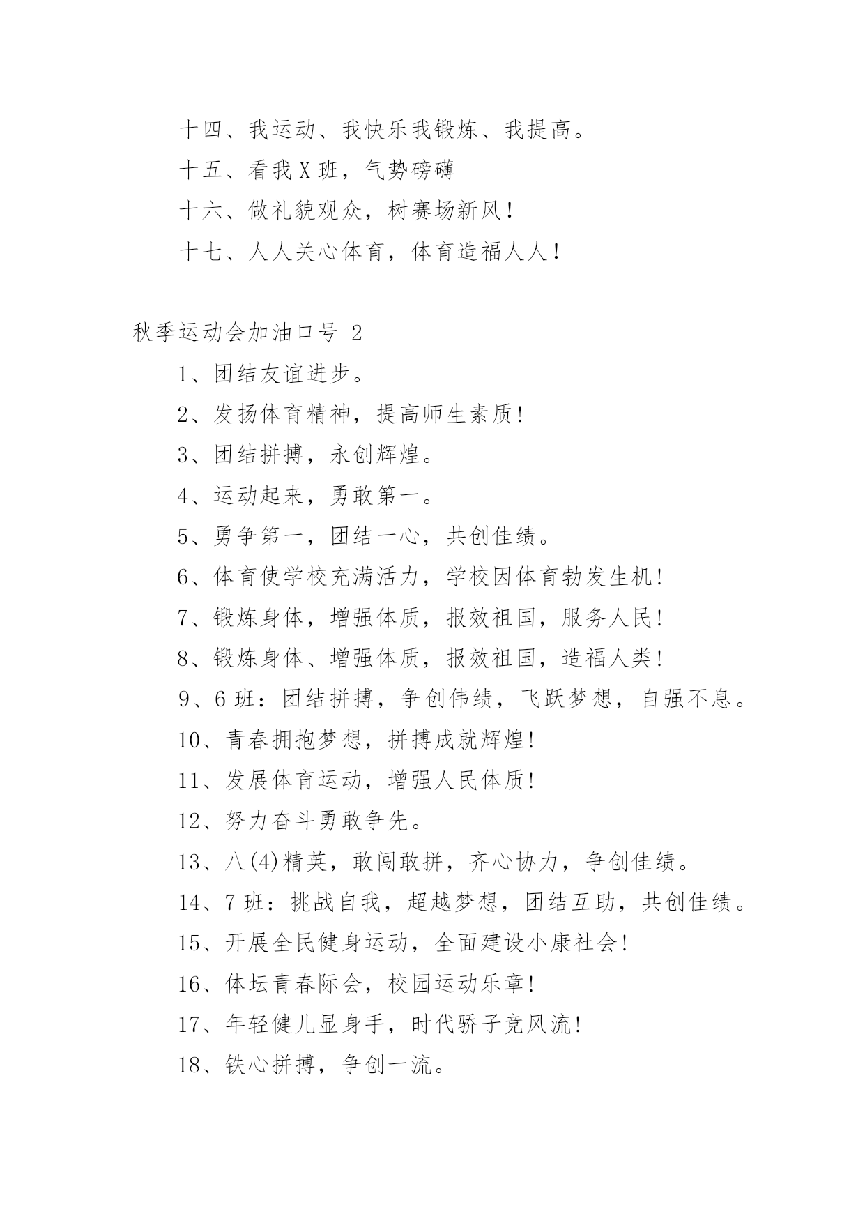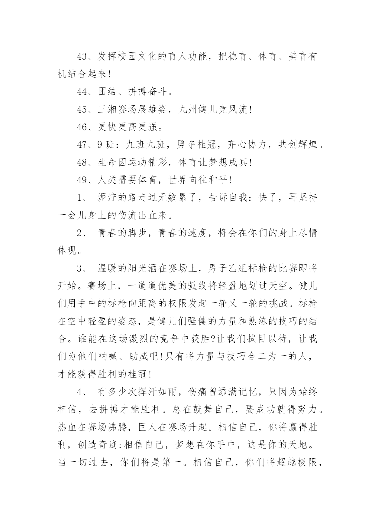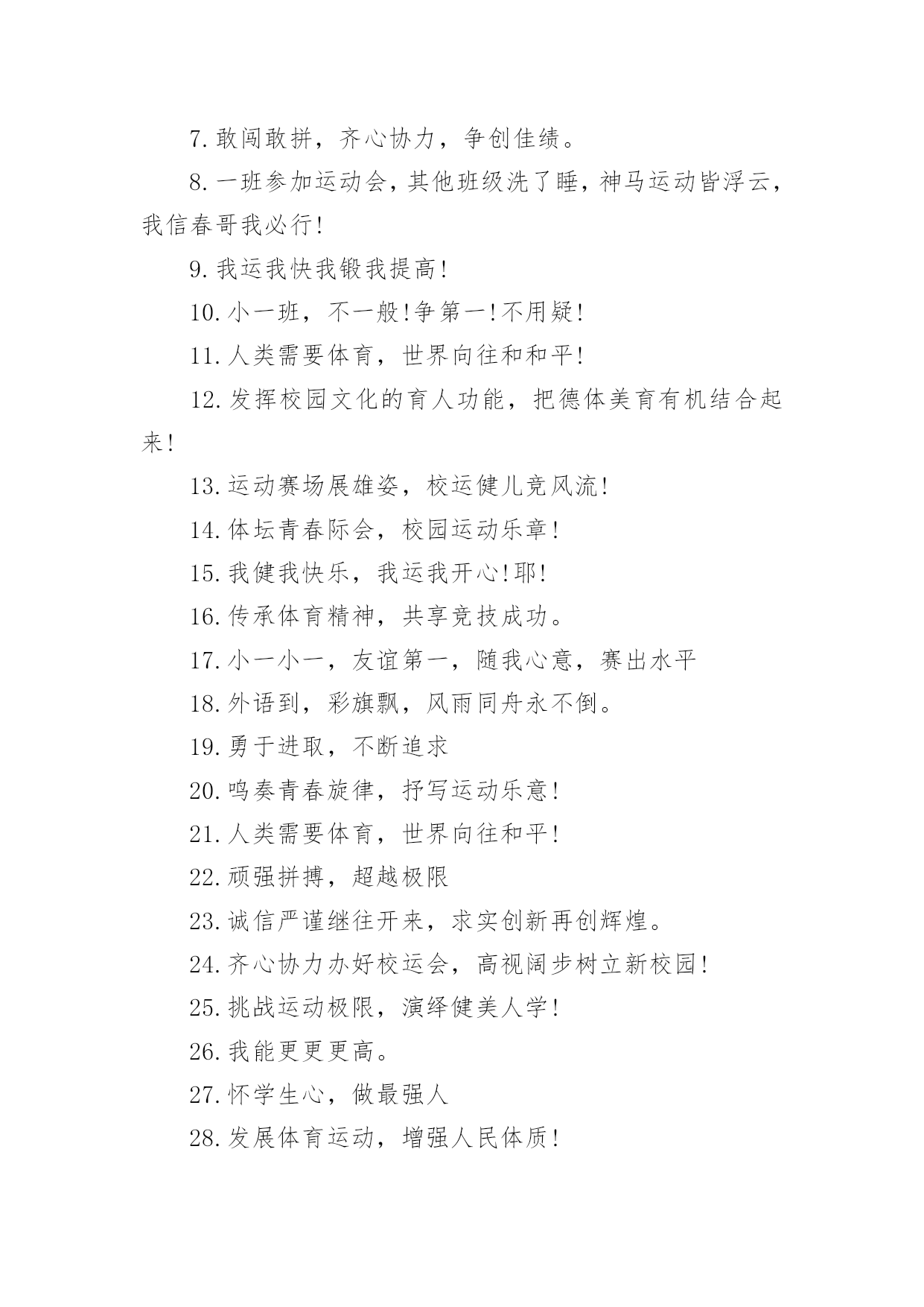 秋季运动会加油口号秋季运动会加油口号15篇在生活、工作和学习中,大家一定都接触过一些使用较为普遍的口号吧,不同时期不同的口号可以看出,意识对物质具有能动作用。你所见过的口号是什么样的呢?以下是小编帮大家整理的秋季运动会加油口号,仅供参考,欢迎大家阅读。秋季运动会加油口号1一、年轻健儿显身手,时代骄子竞风流!二、今天的骄傲将从这诞生,明日的太阳将从这里升起!三、小一小一,勇夺桂冠;齐心协力,共创辉煌四、顽强拼搏,赛出风格!五、挑战自我,超越梦想六、赛出水平,赛出风格,全面提高综合素质!七、赛出风格,赛出水平八、三湘赛场展雄姿,九州健儿竞风流!九、励精图治绘蓝图,凝神聚力谱新篇。十、奥运精神,永驻我心十一、超越梦想,激情无限十二、开展全民健身运动,全面建设小康社会!十三、齐心协力办好校运会,昂首阔步建设新校园!十四、我运动、我快乐我锻炼、我提高。十五、看我X班,气势磅礴十六、做礼貌观众,树赛场新风!十七、人人关心体育,体育造福人人!秋季运动会加油口号21、团结友谊进步。2、发扬体育精神,提高师生素质!3、团结拼搏,永创辉煌。4、运动起来,勇敢第一。5、勇争第一,团结一心,共创佳绩。6、体育使学校充满活力,学校因体育勃发生机!7、锻炼身体,增强体质,报效祖国,服务人民!8、锻炼身体、增强体质,报效祖国,造福人类!9、6班:团结拼搏,争创伟绩,飞跃梦想,自强不息。10、青春拥抱梦想,拼搏成就辉煌!11、发展体育运动,增强人民体质!12、努力奋斗勇敢争先。13、八(4)精英,敢闯敢拼,齐心协力,争创佳绩。14、7班:挑战自我,超越梦想,团结互助,共创佳绩。15、开展全民健身运动,全面建设小康社会!16、体坛青春际会,校园运动乐章!17、年轻健儿显身手,时代骄子竞风流!18、铁心拼搏,争创一流。19、赛出成绩,安全第一。20、10班:团结进取,开拓创新,顽强拼搏,争创一流。21、发展体育运动,推行全民健身!22、追梦扬威,奋勇争先。23、互相学习,取长补短,再接再厉,勇攀高峰!24、齐心协力办好城运会,昂首阔步建设新长沙!25、振兴中华,扬我班威。26、扬帆把舵,奋勇拼搏,看我三班,锐不可当。27、青春运动,友谊健康。28、激情燃烧希望,励志赢来成功!29、与时俱进,开拓创新,顽强拼搏,勇夺第一。30、比拼激扬梦想,搏击磨砺锋芒!31、超越极限,超越自我。32、11班:互相学习,取长补短,再接再厉,勇攀高峰。33、我运动,我健康,我快乐。34、九班九班,勇夺桂冠,齐心协力,共创辉煌。35、全民健身,利国利民,功在当代,利在千秋!36、健体魄强素质,促发展上水平。37、与时俱进,奋力拼搏,齐心协力,争创一流。38、友谊第一,比赛第二。39、团结拼搏拼搏进。40、互相学习,取长补短,再接再厉,勇攀高峰。41、团结拼搏,争创伟绩,飞跃梦想,自强不息。42、诚信严谨继往开来,求实创新再创辉煌。43、发挥校园文化的育人功能,把德育、体育、美育有机结合起来!44、团结、拼搏奋斗。45、三湘赛场展雄姿,九州健儿竞风流!46、更快更高更强。47、9班:九班九班,勇夺桂冠,齐心协力,共创辉煌。48、生命因运动精彩,体育让梦想成真!49、人类需要体育,世界向往和平!1、泥泞的路走过无数累了,告诉自我:快了,再坚持一会儿身上的伤流出血来。2、青春的脚步,青春的速度,将会在你们的身上尽情体现。3、温暖的阳光洒在赛场上,男子乙组标枪的比赛即将开始。赛场上,一道道优美的弧线将轻盈地划过天空。健儿们用手中的标枪向距离的权限发起一轮又一轮的挑战。标枪在空中轻盈的姿态,是健儿们强健的力量和熟练的技巧的结合。谁能在这场激烈的竞争中获胜?让我们拭目以待,让我们为他们呐喊、助威吧!只有将力量与技巧合二为一的人,才能获得胜利的桂冠!4、有多少次挥汗如雨,伤痛曾添满记忆,只因为始终相信,去拼搏才能胜利。总在鼓舞自己,要成功就得努力。热血在赛场沸腾,巨人在赛场升起。相信自己,你将赢得胜利,创造奇迹;相信自己,梦想在你手中,这是你的天地。当一切过去,你们将是第一。相信自己,你们将超越极限,超越自己!相信自己,加油吧,健儿们,相信你自己。5、顽强拼搏,超越极限。6、无论第几坚持胜利的信心,只要跑下来,你们就是英雄。7、热血在沸腾,辉煌在你脚下铸就。加油吧,健儿们!8、只是一道过场,几秒钟转瞬即逝,可是这背后承载的是多少成败,加油吧,少年。9、年轻的我们自信飞扬,青春的气息如同出生的朝阳,蓬勃的力量如同阳光的挥洒。此时此刻,跑道便是我们精彩的舞台,声声加油便是我们的奖项!论何成功,谈何荣辱,心中的信念只有一个:拼搏!萧瑟的.秋风,挡不住你们破竹的锐气。10、广阔的绿茵场,是为你们搭建的舞台。张扬吧,年轻的心,我们将为你永远喝彩!11、泰戈尔在诗中说,天空没有翅膀的影子,但我已飞过;艾青