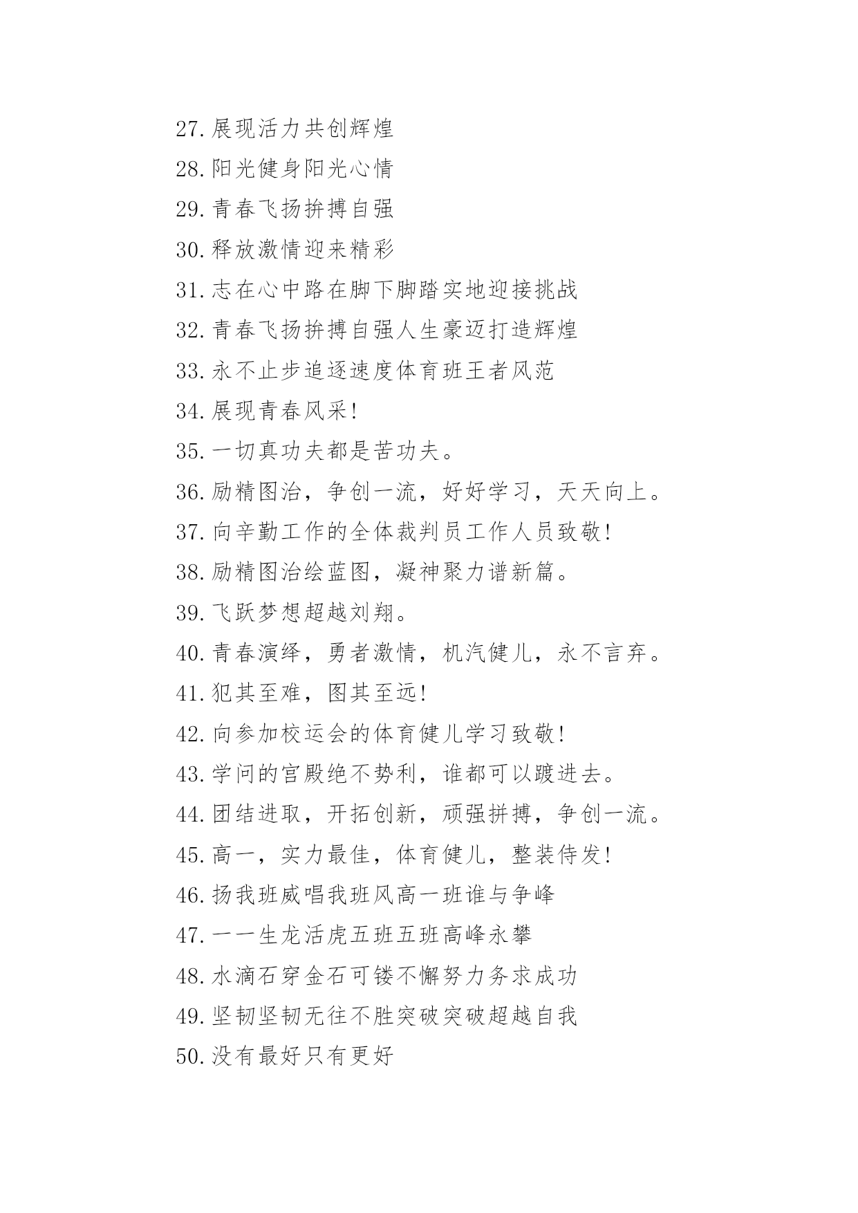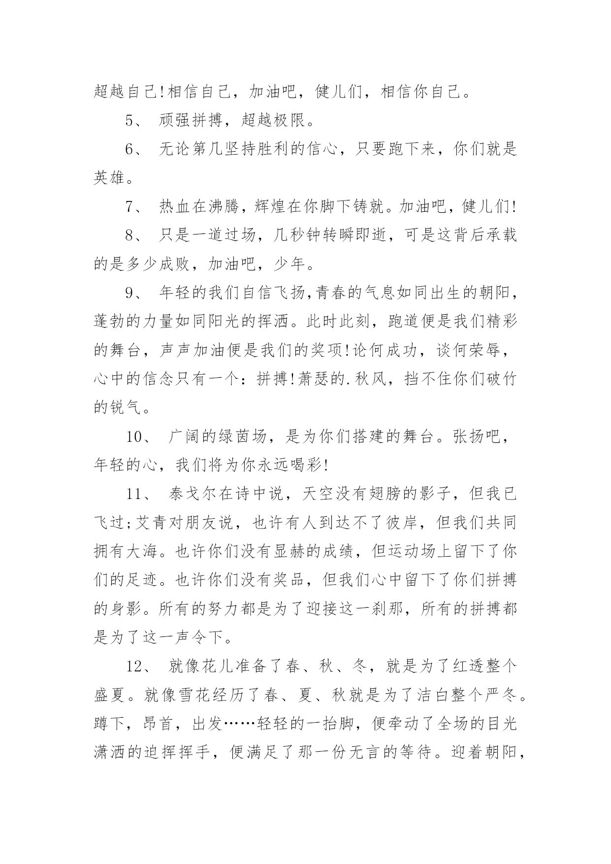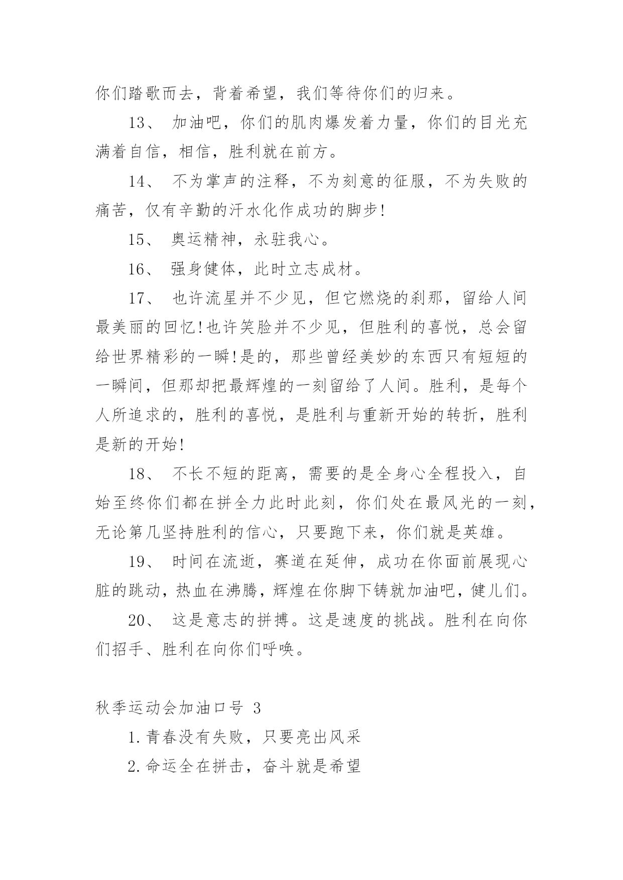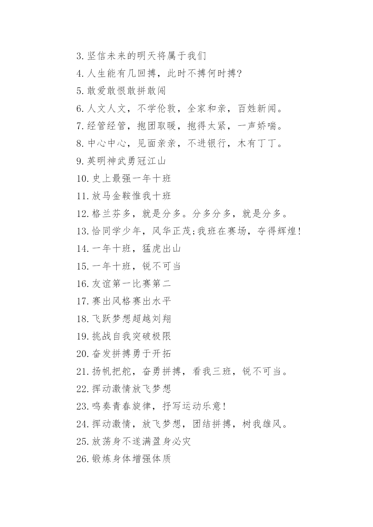 秋季运动会加油口号秋季运动会加油口号15篇在生活、工作和学习中,大家一定都接触过一些使用较为普遍的口号吧,不同时期不同的口号可以看出,意识对物质具有能动作用。你所见过的口号是什么样的呢?以下是小编帮大家整理的秋季运动会加油口号,仅供参考,欢迎大家阅读。秋季运动会加油口号1一、年轻健儿显身手,时代骄子竞风流!二、今天的骄傲将从这诞生,明日的太阳将从这里升起!三、小一小一,勇夺桂冠;齐心协力,共创辉煌四、顽强拼搏,赛出风格!五、挑战自我,超越梦想六、赛出水平,赛出风格,全面提高综合素质!七、赛出风格,赛出水平八、三湘赛场展雄姿,九州健儿竞风流!九、励精图治绘蓝图,凝神聚力谱新篇。十、奥运精神,永驻我心十一、超越梦想,激情无限十二、开展全民健身运动,全面建设小康社会!十三、齐心协力办好校运会,昂首阔步建设新校园!十四、我运动、我快乐我锻炼、我提高。十五、看我X班,气势磅礴十六、做礼貌观众,树赛场新风!十七、人人关心体育,体育造福人人!秋季运动会加油口号21、团结友谊进步。2、发扬体育精神,提高师生素质!3、团结拼搏,永创辉煌。4、运动起来,勇敢第一。5、勇争第一,团结一心,共创佳绩。6、体育使学校充满活力,学校因体育勃发生机!7、锻炼身体,增强体质,报效祖国,服务人民!8、锻炼身体、增强体质,报效祖国,造福人类!9、6班:团结拼搏,争创伟绩,飞跃梦想,自强不息。10、青春拥抱梦想,拼搏成就辉煌!11、发展体育运动,增强人民体质!12、努力奋斗勇敢争先。13、八(4)精英,敢闯敢拼,齐心协力,争创佳绩。14、7班:挑战自我,超越梦想,团结互助,共创佳绩。15、开展全民健身运动,全面建设小康社会!16、体坛青春际会,校园运动乐章!17、年轻健儿显身手,时代骄子竞风流!18、铁心拼搏,争创一流。19、赛出成绩,安全第一。20、10班:团结进取,开拓创新,顽强拼搏,争创一流。21、发展体育运动,推行全民健身!22、追梦扬威,奋勇争先。23、互相学习,取长补短,再接再厉,勇攀高峰!24、齐心协力办好城运会,昂首阔步建设新长沙!25、振兴中华,扬我班威。26、扬帆把舵,奋勇拼搏,看我三班,锐不可当。27、青春运动,友谊健康。28、激情燃烧希望,励志赢来成功!29、与时俱进,开拓创新,顽强拼搏,勇夺第一。30、比拼激扬梦想,搏击磨砺锋芒!31、超越极限,超越自我。32、11班:互相学习,取长补短,再接再厉,勇攀高峰。33、我运动,我健康,我快乐。34、九班九班,勇夺桂冠,齐心协力,共创辉煌。35、全民健身,利国利民,功在当代,利在千秋!36、健体魄强素质,促发展上水平。37、与时俱进,奋力拼搏,齐心协力,争创一流。38、友谊第一,比赛第二。39、团结拼搏拼搏进。40、互相学习,取长补短,再接再厉,勇攀高峰。41、团结拼搏,争创伟绩,飞跃梦想,自强不息。42、诚信严谨继往开来,求实创新再创辉煌。43、发挥校园文化的育人功能,把德育、体育、美育有机结合起来!44、团结、拼搏奋斗。45、三湘赛场展雄姿,九州健儿竞风流!46、更快更高更强。47、9班:九班九班,勇夺桂冠,齐心协力,共创辉煌。48、生命因运动精彩,体育让梦想成真!49、人类需要体育,世界向往和平!1、泥泞的路走过无数累了,告诉自我:快了,再坚持一会儿身上的伤流出血来。2、青春的脚步,青春的速度,将会在你们的身上尽情体现。3、温暖的阳光洒在赛场上,男子乙组标枪的比赛即将开始。赛场上,一道道优美的弧线将轻盈地划过天空。健儿们用手中的标枪向距离的权限发起一轮又一轮的挑战。标枪在空中轻盈的姿态,是健儿们强健的力量和熟练的技巧的结合。谁能在这场激烈的竞争中获胜?让我们拭目以待,让我们为他们呐喊、助威吧!只有将力量与技巧合二为一的人,才能获得胜利的桂冠!4、有多少次挥汗如雨,伤痛曾添满记忆,只因为始终相信,去拼搏才能胜利。总在鼓舞自己,要成功就得努力。热血在赛场沸腾,巨人在赛场升起。相信自己,你将赢得胜利,创造奇迹;相信自己,梦想在你手中,这是你的天地。当一切过去,你们将是第一。相信自己,你们将超越极限,超越自己!相信自己,加油吧,健儿们,相信你自己。5、顽强拼搏,超越极限。6、无论第几坚持胜利的信心,只要跑下来,你们就是英雄。7、热血在沸腾,辉煌在你脚下铸就。加油吧,健儿们!8、只是一道过场,几秒钟转瞬即逝,可是这背后承载的是多少成败,加油吧,少年。9、年轻的我们自信飞扬,青春的气息如同出生的朝阳,蓬勃的力量如同阳光的挥洒。此时此刻,跑道便是我们精彩的舞台,声声加油便是我们的奖项!论何成功,谈何荣辱,心中的信念只有一个:拼搏!萧瑟的.秋风,挡不住你们破竹的锐气。10、广阔的绿茵场,是为你们搭建的舞台。张扬吧,年轻的心,我们将为你永远喝彩!11、泰戈尔在诗中说,天空没有翅膀的影子,但我已飞过;艾青