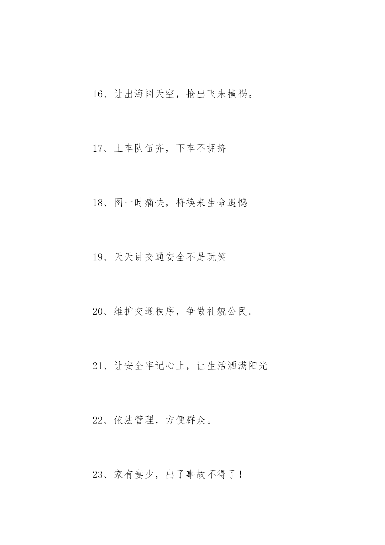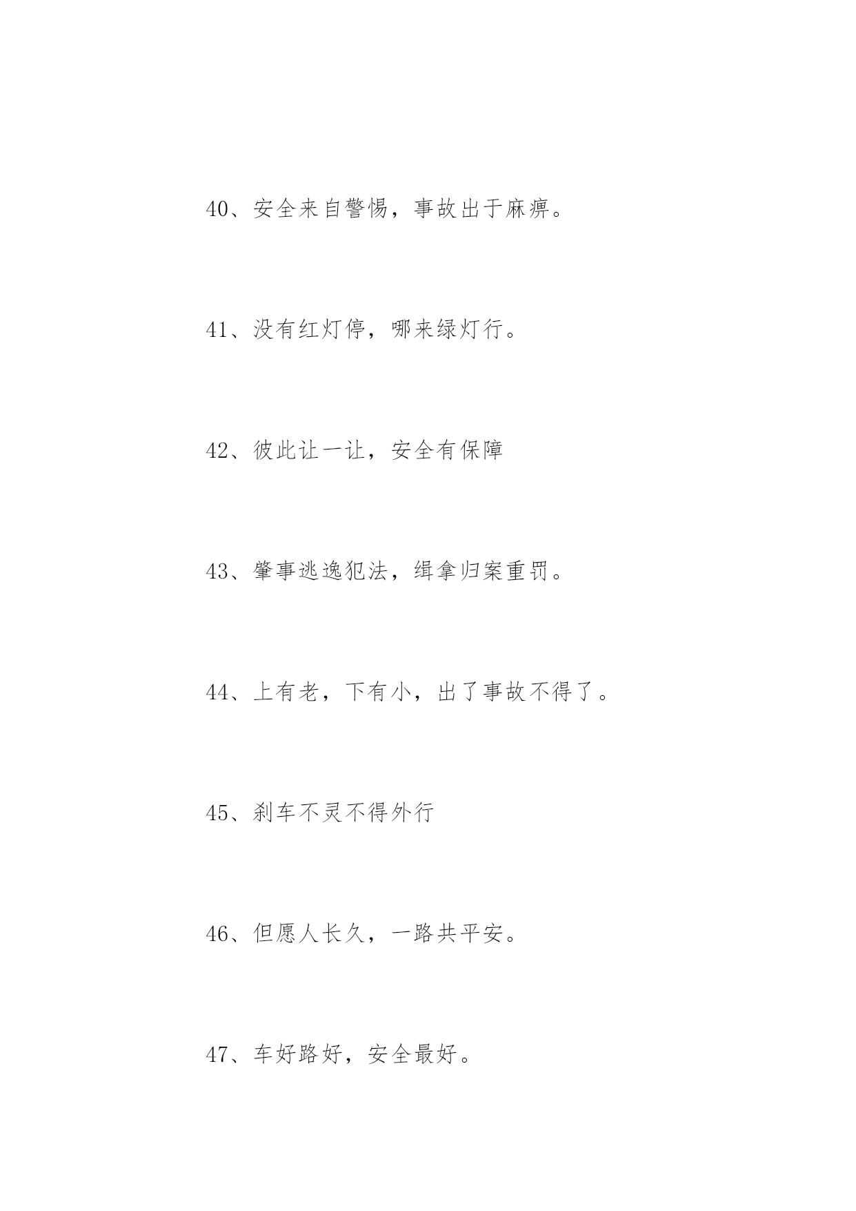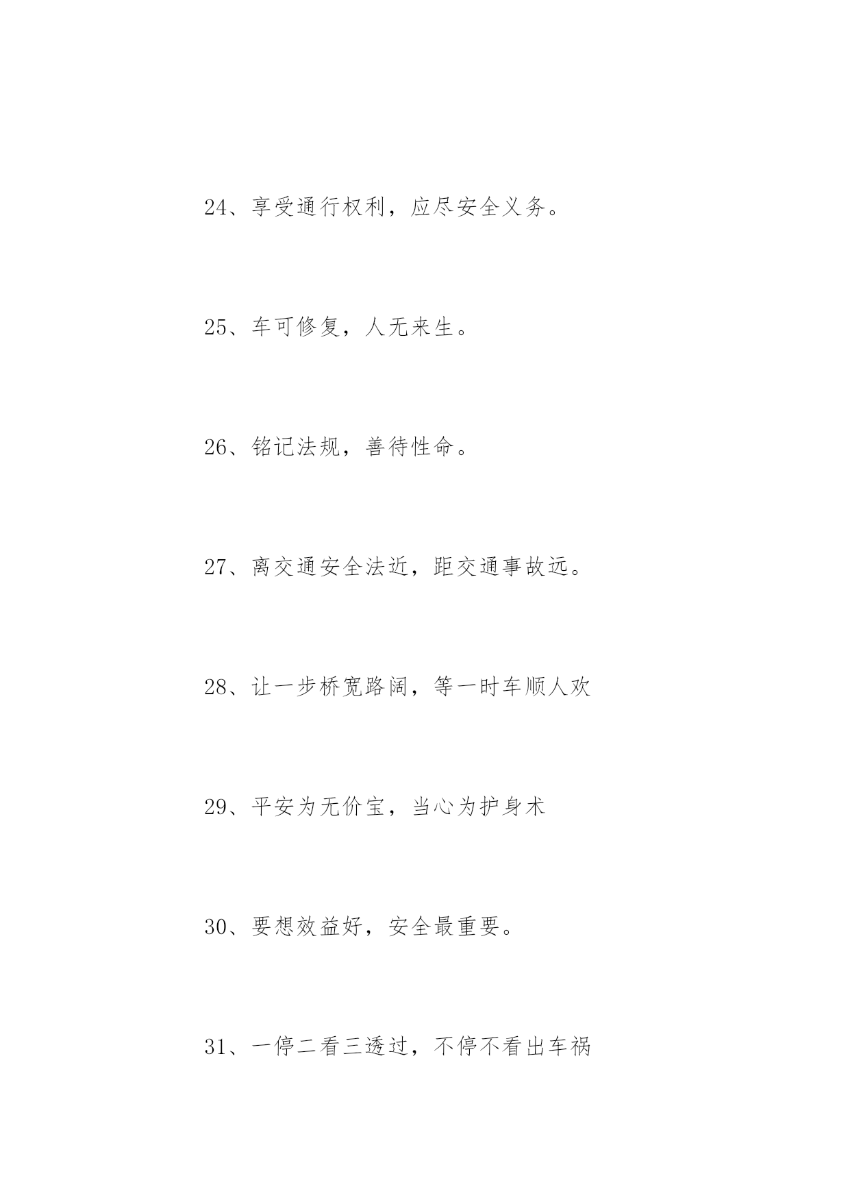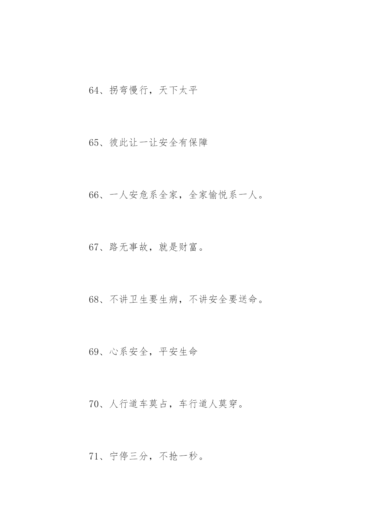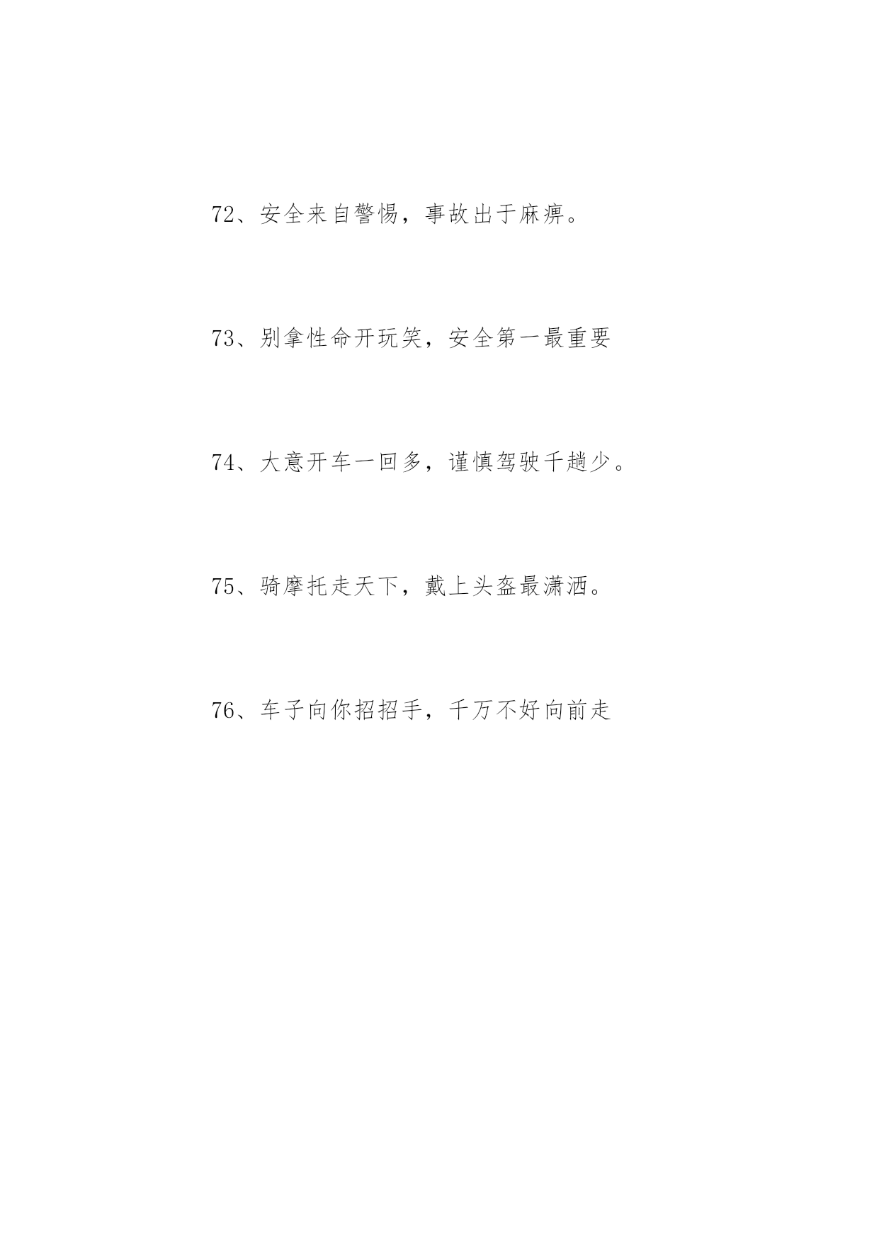 交通安全口号交通安全口号1、保险赔钱不赔命。2、各行其道,安全可靠。3、性命只有一次安全开车多好。4、爱你爱我爱大家,注意安全靠大家5、安全来自警惕,你我务必牢记6、让与争一闪念,生与死一瞬间。7、来往车辆看仔细,安全意识要牢记8、安全与守法同在,事故与违法相随。9、法规记心中,三思而后行。10、超速行驶是抢占死亡线。11、让出平安,抢出祸端。12、车铃开口叫,请你让开道13、上学安全,放学团圆14、马路不是户外场,追逐玩耍要上当15、红灯停绿灯行,交通安全我能行16、让出海阔天空,抢出飞来横祸。17、上车队伍齐,下车不拥挤18、图一时痛快,将换来生命遗憾19、天天讲交通安全不是玩笑20、维护交通秩序,争做礼貌公民。21、让安全牢记心上,让生活洒满阳光22、依法管理,方便群众。23、家有妻少,出了事故不得了!24、享受通行权利,应尽安全义务。25、车可修复,人无来生。26、铭记法规,善待性命。27、离交通安全法近,距交通事故远。28、让一步桥宽路阔,等一时车顺人欢29、平安为无价宝,当心为护身术30、要想效益好,安全最重要。31、一停二看三透过,不停不看出车祸32、以人为本,关爱性命。33、占道摆摊设点,妨碍交通安全。34、守法才能平安,平安才能回家。35、礼让礼让,人车无恙36、彼此让一让,安全有保障。37、道路连着你我他,安全系着千万家38、穿马路越护栏,不守法是隐患。39、人过马路口,斑马线内走40、安全来自警惕,事故出于麻痹。41、没有红灯停,哪来绿灯行。42、彼此让一让,安全有保障43、肇事逃逸犯法,缉拿归案重罚。44、上有老,下有小,出了事故不得了。45、刹车不灵不得外行46、但愿人长久,一路共平安。47、车好路好,安全最好。48、司机一滴酒,亲人千行泪。49、心存侥幸,必遭不幸。50、但愿人长久,千里路畅通!51、道路交通安全法,伴您平安万里行。52、严是爱,松是害,发生事故祸三代。53、安全出行,拐弯打铃54、高高兴兴出门,平平安安回家。55、法规在心中,平安在手中。56、你让我让,路路通畅。57、遵守交通法,安全你我他。58、头戴小黄帽上学必不可少59、爬高爬低安全第一,60、戴好小黄帽,走好人行道61、良药苦口利于病,交通法规利于行。62、安全在心中,一切好简单63、高高兴兴上班来,平平安安回家去。64、拐弯慢行,天下太平65、彼此让一让安全有保障66、一人安危系全家,全家愉悦系一人。67、路无事故,就是财富。68、不讲卫生要生病,不讲安全要送命。69、心系安全,平安生命70、人行道车莫占,车行道人莫穿。71、宁停三分,不抢一秒。72、安全来自警惕,事故出于麻痹。73、别拿性命开玩笑,安全第一最重要74、大意开车一回多,谨慎驾驶千趟少。75、骑摩托走天下,戴上头盔最潇洒。76、车子向你招招手,千万不好向前走