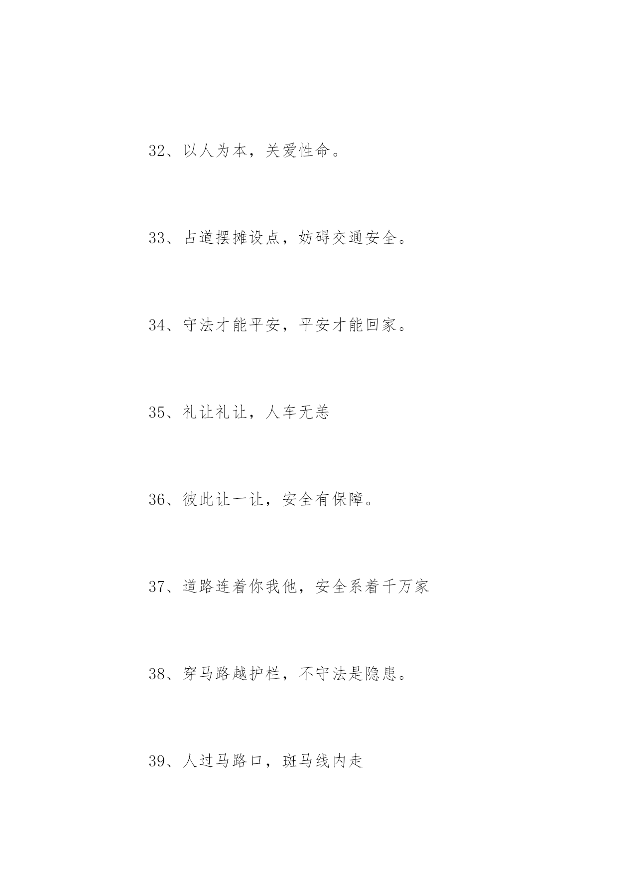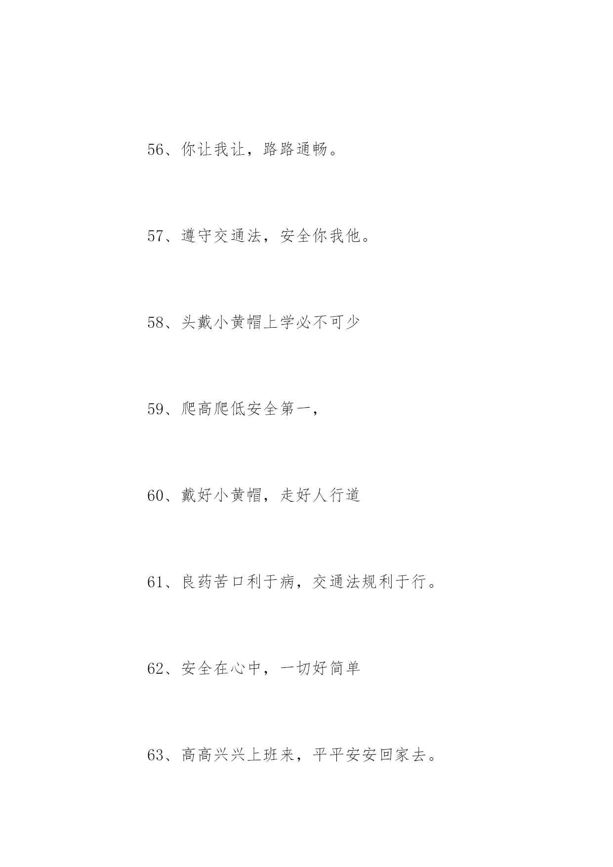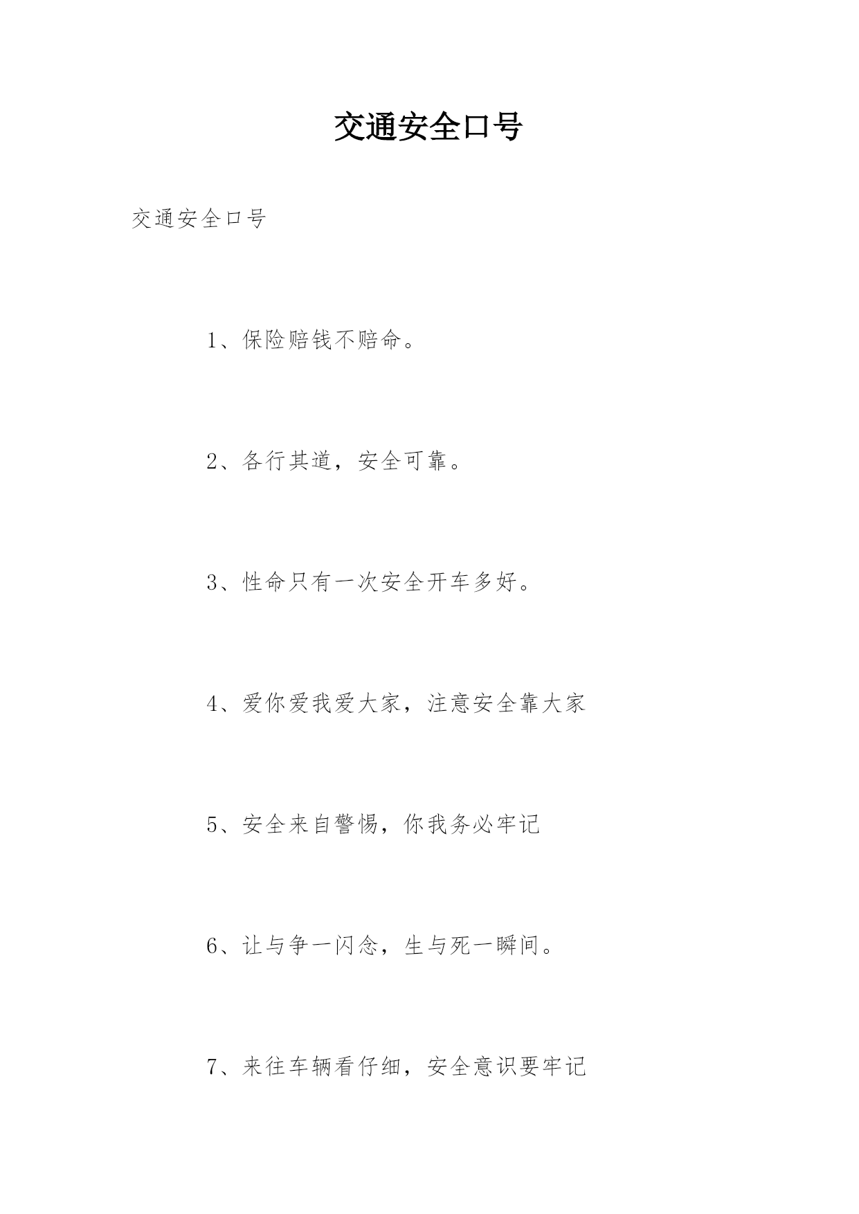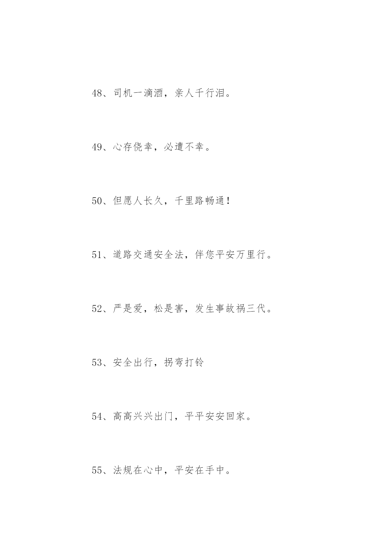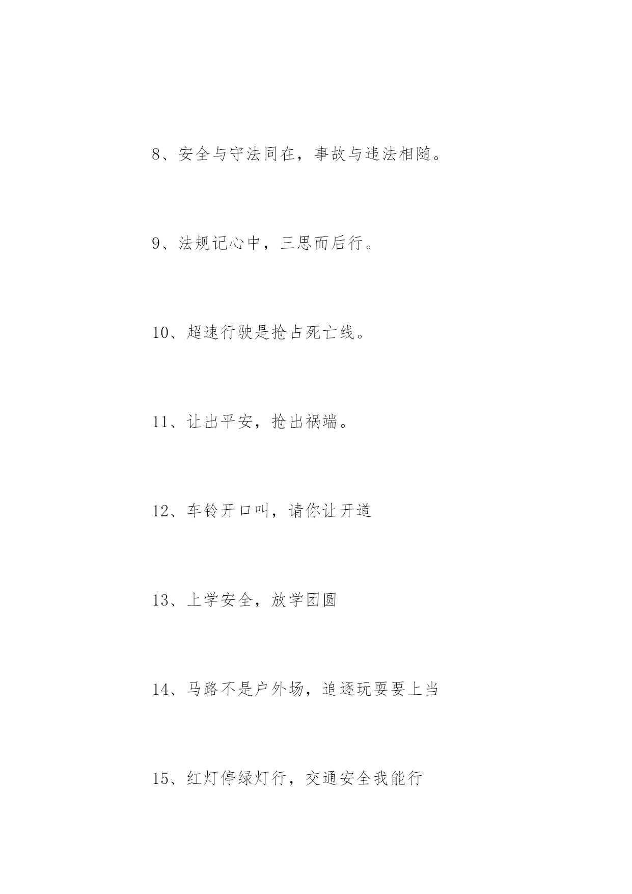 交通安全口号交通安全口号1、保险赔钱不赔命。2、各行其道,安全可靠。3、性命只有一次安全开车多好。4、爱你爱我爱大家,注意安全靠大家5、安全来自警惕,你我务必牢记6、让与争一闪念,生与死一瞬间。7、来往车辆看仔细,安全意识要牢记8、安全与守法同在,事故与违法相随。9、法规记心中,三思而后行。10、超速行驶是抢占死亡线。11、让出平安,抢出祸端。12、车铃开口叫,请你让开道13、上学安全,放学团圆14、马路不是户外场,追逐玩耍要上当15、红灯停绿灯行,交通安全我能行16、让出海阔天空,抢出飞来横祸。17、上车队伍齐,下车不拥挤18、图一时痛快,将换来生命遗憾19、天天讲交通安全不是玩笑20、维护交通秩序,争做礼貌公民。21、让安全牢记心上,让生活洒满阳光22、依法管理,方便群众。23、家有妻少,出了事故不得了!24、享受通行权利,应尽安全义务。25、车可修复,人无来生。26、铭记法规,善待性命。27、离交通安全法近,距交通事故远。28、让一步桥宽路阔,等一时车顺人欢29、平安为无价宝,当心为护身术30、要想效益好,安全最重要。31、一停二看三透过,不停不看出车祸32、以人为本,关爱性命。33、占道摆摊设点,妨碍交通安全。34、守法才能平安,平安才能回家。35、礼让礼让,人车无恙36、彼此让一让,安全有保障。37、道路连着你我他,安全系着千万家38、穿马路越护栏,不守法是隐患。39、人过马路口,斑马线内走40、安全来自警惕,事故出于麻痹。41、没有红灯停,哪来绿灯行。42、彼此让一让,安全有保障43、肇事逃逸犯法,缉拿归案重罚。44、上有老,下有小,出了事故不得了。45、刹车不灵不得外行46、但愿人长久,一路共平安。47、车好路好,安全最好。48、司机一滴酒,亲人千行泪。49、心存侥幸,必遭不幸。50、但愿人长久,千里路畅通!51、道路交通安全法,伴您平安万里行。52、严是爱,松是害,发生事故祸三代。53、安全出行,拐弯打铃54、高高兴兴出门,平平安安回家。55、法规在心中,平安在手中。56、你让我让,路路通畅。57、遵守交通法,安全你我他。58、头戴小黄帽上学必不可少59、爬高爬低安全第一,60、戴好小黄帽,走好人行道61、良药苦口利于病,交通法规利于行。62、安全在心中,一切好简单63、高高兴兴上班来,平平安安回家去。64、拐弯慢行,天下太平65、彼此让一让安全有保障66、一人安危系全家,全家愉悦系一人。67、路无事故,就是财富。68、不讲卫生要生病,不讲安全要送命。69、心系安全,平安生命70、人行道车莫占,车行道人莫穿。71、宁停三分,不抢一秒。72、安全来自警惕,事故出于麻痹。73、别拿性命开玩笑,安全第一最重要74、大意开车一回多,谨慎驾驶千趟少。75、骑摩托走天下,戴上头盔最潇洒。76、车子向你招招手,千万不好向前走