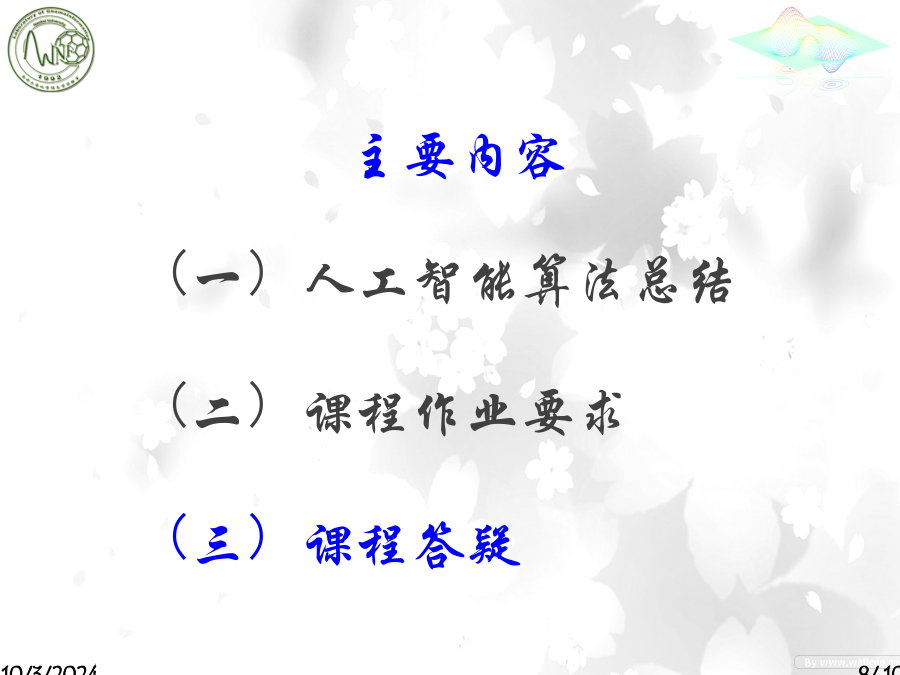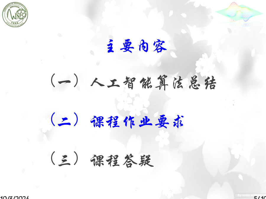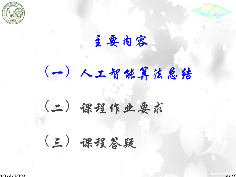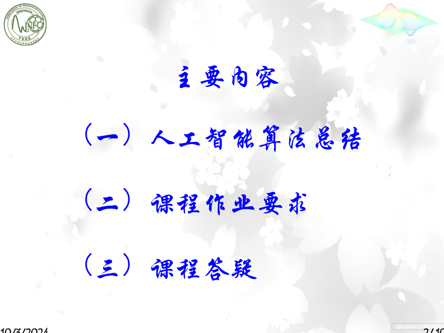 智能优化算法总结(一)人工智能算法总结(二)课程作业要求(三)课程答疑(一)人工智能算法总结(二)课程作业要求(三)课程答疑10/3/2024(一)人工智能算法总结(二)课程作业要求(三)课程答疑文稿架构顺序标题序号格式(一)人工智能算法总结(二)课程作业要求(三)课程答疑QQ:121138836(郝勇)Email:haonm@163.com办公室电话:87046156#6-2012024/10/3