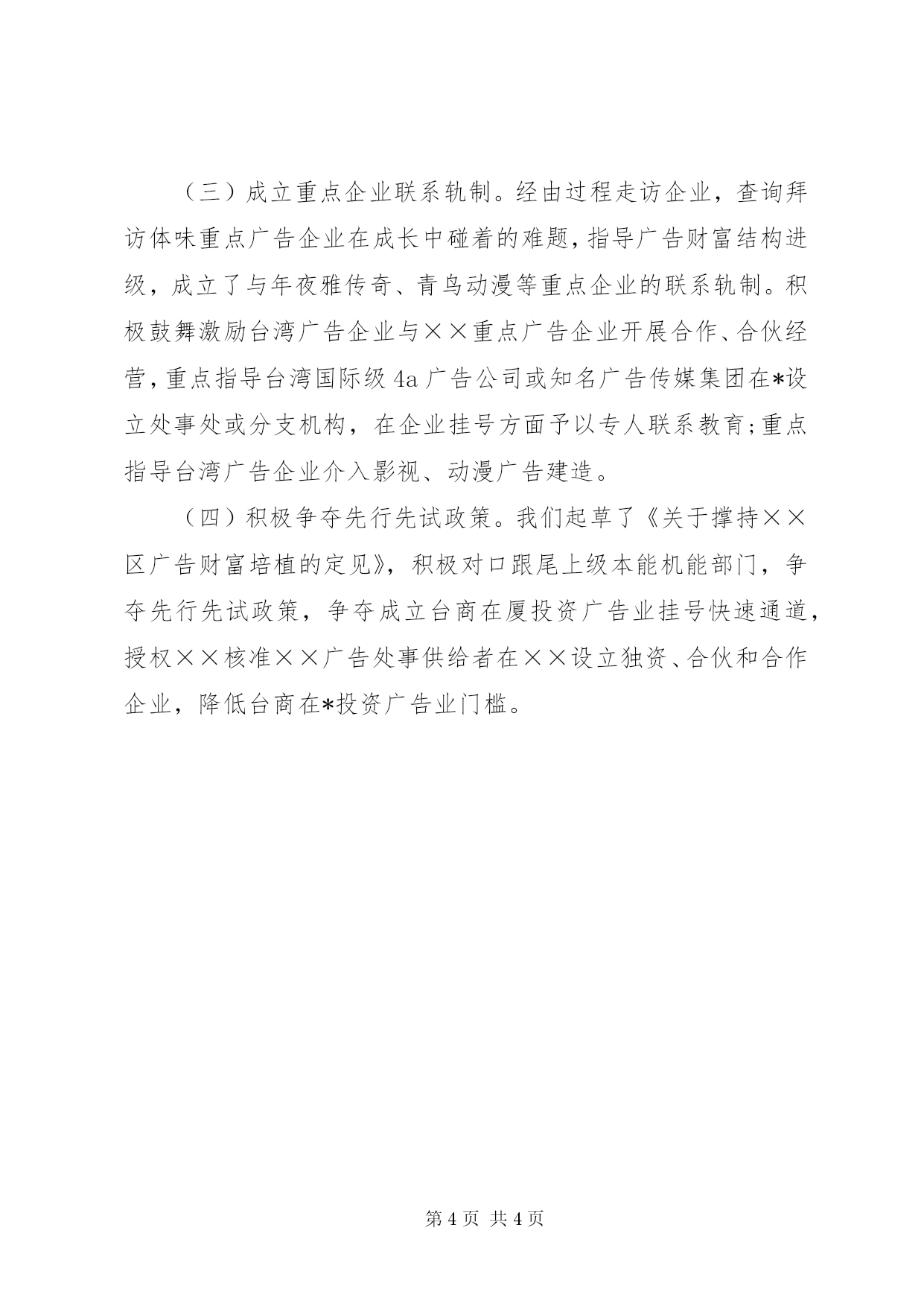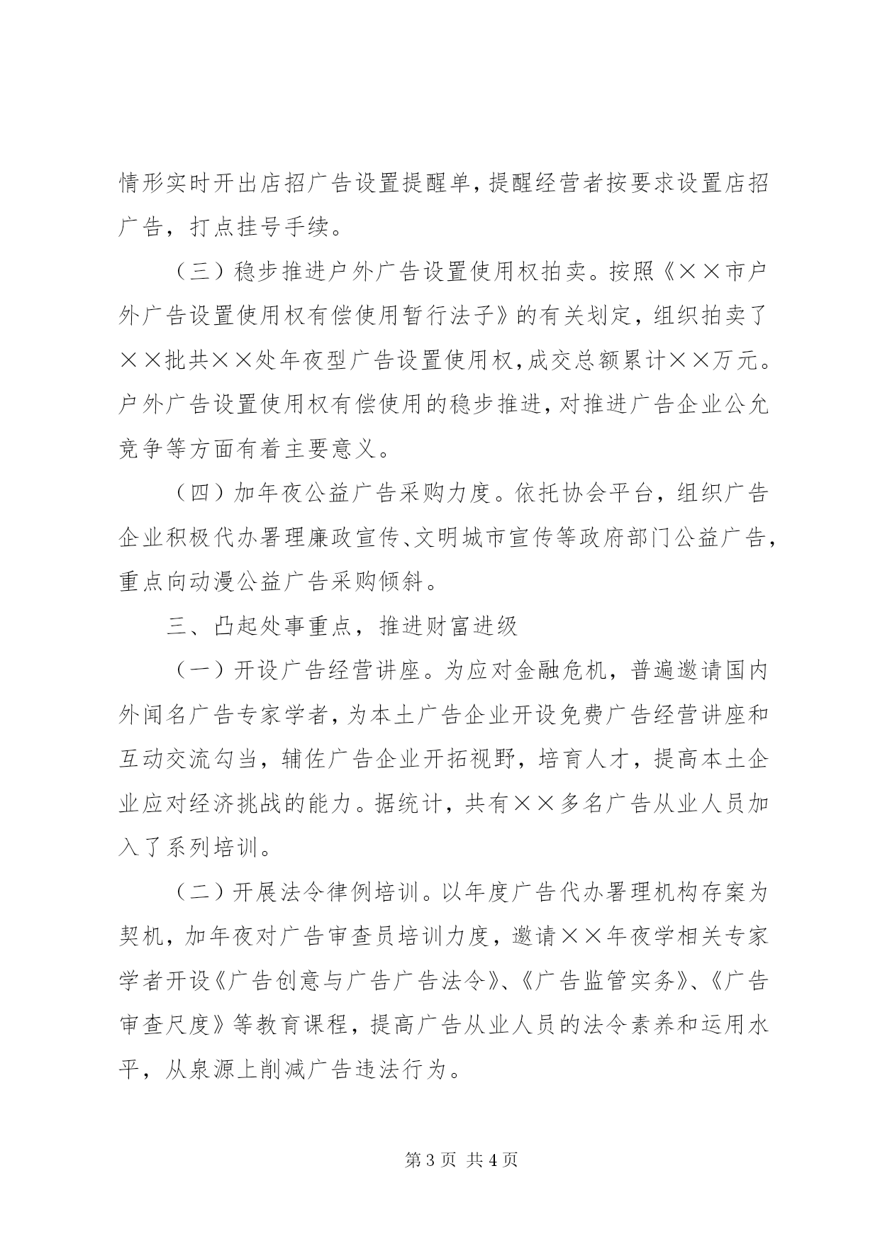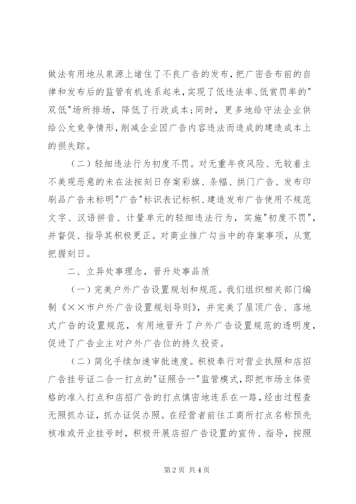 第PAGE\*Arabic\*MERGEFORMAT4页共NUMPAGES\*MERGEFORMAT4页工商职能发展情况汇报编者按:本文主要从改变监管体例,奉行柔性功令;立异处事理念,晋升处事品质;凸起处事重点,推进财富进级进行讲述。其中,主要包括:媒体广密告布事前咨询审查、轻细违法行为初度不罚、完美户外广告设置规划和规范、简化手续加速审批速度、稳步推进户外广告设置使用权拍卖、开设广告经营讲座、开展法令律例培训、成立重点企业联系轨制、积极争夺先行先试政策等,具体材料请详见:近年,××市工商局紧紧环绕处事处所经济又好又快成长的方针,周全贯彻落实国家工商总局"四高"培植要乞降××市工商局"人道化监管、零距离处事"理念,不竭立异处事行动,积极指导和促进广告行业健康成长。出格是针对金融危机以来,××市广告行业成长受经济危机冲击的新情形,深切企业调研,实时调整打点策略,切近企业需求,采纳有力法子帮助企业共渡难关。一、改变监管体例,奉行柔性功令(一)媒体广密告布事前咨询审查。在媒体自愿的情形下,我们向*家首要媒体派驻广告咨询审查员,为广告经营者、发布者和广告主供给相关法令律例咨询,指导媒体广告部门实时调整改削广告内容使其顺遂刊播。今年来,派驻广审员共审查咨询各类广告××多条,改削调整和劝退各类违法广告××多条。这一做法有用地从泉源上堵住了不良广告的发布,把广密告布前的自律和发布后的监管有机连系起来,实现了低违法率、低赏罚率的"双低"场所排场,降低了行政成本;同时,更多地给守法企业供给公允竞争情形,削减企业因广告内容违法而造成的建造成本上的损失踪。(二)轻细违法行为初度不罚。对无重年夜风险、无较着主不美观恶意的未在法按刻日存案彩旗、条幅、拱门广告、发布印刷品广告未标明"广告"标识表记标帜、建造发布广告使用不规范文字、汉语拼音、计量单元的轻细违法行为,实施"初度不罚",并督促、指导其积极更正。对商业推广勾当中的存案事项,从宽把握刻日。二、立异处事理念,晋升处事品质(一)完美户外广告设置规划和规范。我们组织相关部门编制《××市户外广告设置规划导则》,并完美了屋顶广告、落地式广告的设置规范,有用地晋升了户外广告设置规范的透明度,促进了广告业主对户外广告位的持久投资。(二)简化手续加速审批速度。积极奉行对营业执照和店招广告挂号证二合一打点的"证照合一"监管模式,即把市场主体资格的准入打点和店招广告的打点慎密地连系在一路,经由过程查无照抓办证,抓办证促办照。在经营者前往工商所打点名称预先核准或开业挂号时,积极开展店招广告设置的宣传、指导,按照情形实时开出店招广告设置提醒单,提醒经营者按要求设置店招广告,打点挂号手续。(三)稳步推进户外广告设置使用权拍卖。按照《××市户外广告设置使用权有偿使用暂行法子》的有关划定,组织拍卖了××批共××处年夜型广告设置使用权,成交总额累计××万元。户外广告设置使用权有偿使用的稳步推进,对推进广告企业公允竞争等方面有着主要意义。(四)加年夜公益广告采购力度。依托协会平台,组织广告企业积极代办署理廉政宣传、文明城市宣传等政府部门公益广告,重点向动漫公益广告采购倾斜。三、凸起处事重点,推进财富进级(一)开设广告经营讲座。为应对金融危机,普遍邀请国内外闻名广告专家学者,为本土广告企业开设免费广告经营讲座和互动交流勾当,辅佐广告企业开拓视野,培育人才,提高本土企业应对经济挑战的能力。据统计,共有××多名广告从业人员加入了系列培训。(二)开展法令律例培训。以年度广告代办署理机构存案为契机,加年夜对广告审查员培训力度,邀请××年夜学相关专家学者开设《广告创意与广告广告法令》、《广告监管实务》、《广告审查尺度》等教育课程,提高广告从业人员的法令素养和运用水平,从泉源上削减广告违法行为。(三)成立重点企业联系轨制。经由过程走访企业,查询拜访体味重点广告企业在成长中碰着的难题,指导广告财富结构进级,成立了与年夜雅传奇、青鸟动漫等重点企业的联系轨制。积极鼓舞激励台湾广告企业与××重点广告企业开展合作、合伙经营,重点指导台湾国际级4a广告公司或知名广告传媒集团在*设立处事处或分支机构,在企业挂号方面予以专人联系教育;重点指导台湾广告企业介入影视、动漫广告建造。(四)积极争夺先行先试政策。我们起草了《关于撑持××区广告财富培植的定见》,积极对口跟尾上级本能机能部门,争夺先行先试政策,争夺成立台商在厦投资广告业挂号快速通道,授权××核准××广告处事供给者在××设立独资、合伙和合作企业,降低台商在*投资广告业门槛。