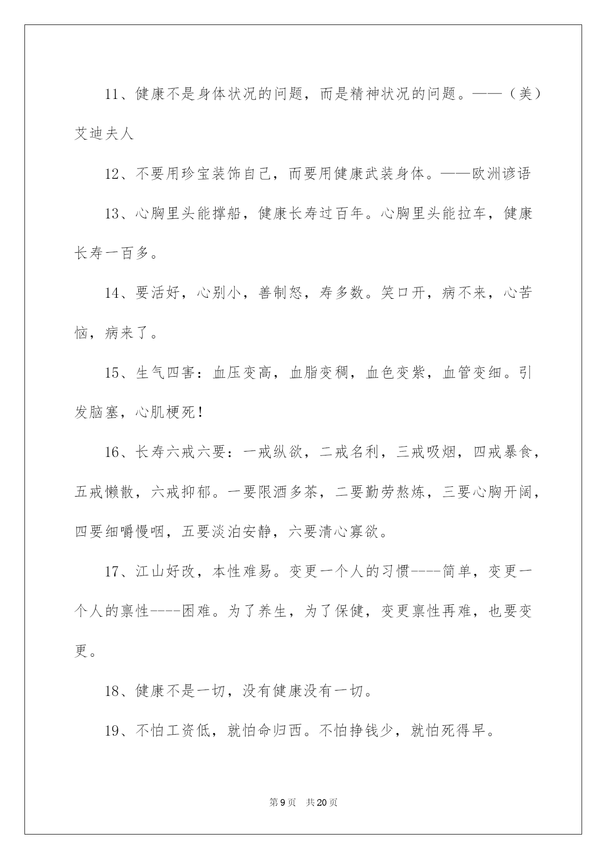 第PAGE\*Arabic\*MERGEFORMAT20页共NUMPAGES\*Arabic\*MERGEFORMAT20页第PAGE\*MERGEFORMAT20页共NUMPAGES\*MERGEFORMAT20页第PAGE\*MERGEFORMAT20页共NUMPAGES\*MERGEFORMAT20页第PAGE\*MERGEFORMAT20页共NUMPAGES\*MERGEFORMAT20页第PAGE\*MERGEFORMAT20页共NUMPAGES\*MERGEFORMAT20页第PAGE\*MERGEFORMAT20页共NUMPAGES\*MERGEFORMAT20页第PAGE\*MERGEFORMAT20页共NUMPAGES\*MERGEFORMAT20页第PAGE\*MERGEFORMAT20页共NUMPAGES\*MERGEFORMAT20页第PAGE\*MERGEFORMAT20页共NUMPAGES\*MERGEFORMAT20页第PAGE\*MERGEFORMAT20页共NUMPAGES\*MERGEFORMAT20页第PAGE\*MERGEFORMAT20页共NUMPAGES\*MERGEFORMAT20页2022健康的名言警句关于健康的名言警句无论在学习、工作或是生活中,大家总少不了接触优秀的名言警句吧,熟记名言警句有助于加深对学问理解类题目的理解。名言警句的类型多样,你所见过的名言警句是什么样的呢?下面是我帮大家整理的关于健康的名言警句,供大家参考借鉴,希望可以帮助到有须要的挚友。关于健康的名言警句11.只有身体好才能学习好、工作好,才能均衡地发展。——周恩来2.早睡早起,使人健康、富有、明智。——富兰克林3.预防胜于治疗。——狄更斯4.有规律的生活原是健康与长寿的秘诀。——巴尔扎克5.世界上最好听的话是“我爱你”,比“我爱你”更好听的话是“你的肿瘤是良性的”,比“你的肿瘤是良性的”更好听的话是“你很健康”。——莱曼师兄6.悲伤足以致命。——莎士比亚7.一个人须要有一个目标来达到真正健康。——安德森8.健康不是身体状况的问题,而是精神状况的问题。——(美)艾迪夫人9.健康的身体乃是灵魂的客厅,有病的身体则是灵魂的禁闭室。——培根10.健康是人生第一财宝。——爱默生11.健康是这样一个东西,它使你感到现在是一年中最好的时间。——亚当斯12.健康是最好的天赋,知足为最大的财宝,信任为最佳的品德。——释迦牟尼13.健康尤胜于财宝。——雷14.健全的精神,寓于健全的体格。——朱文奴15.欢乐首先在于有健康的身体。——柯蒂斯16.欢乐最利于健康。——爱迪生17.志向的人是品德、健康、才能三位一体的人。——(日)木村久一18.清洁仅次于圣洁。——培根19.人的健全,不但靠饮食,尤靠运动。——蔡元培《运动的须要》20.身勤则强,逸则病。——蔡锷《序及按语》21、生命在于运动。——(法)伏尔泰22、午夜前一小时的睡眠等于午夜后睡三小时。——赫伯特23、一个人的身体,决不是个人的,要把它看作是社会的珍贵财宝。凡是有志为社会出力,为国家成大事的青年,肯定要非常珍视自己的身体健康。——徐特立24、一个人无法不变老,但是他可以抵制苍老。——塞缪尔25、疾病是可以感觉到的,但健康则完全不觉得。——富勒26、好静不好动,眼花耳朵聋。——佚名27、常用的刀不锈,常练的人不病。——佚名28、常动则筋骨竦,气脉舒。——清·颜元《习斋言行录》29、不要用珍宝装饰自己,而要用健康武装身体。——佚名30、必需从年轻时期就打好基础,随时随地去熬炼身体。——徐特立31、保持健康是做人的责任。——(荷兰)斯宾诺莎关于健康的名言警句21、生命在于运动。──卢梭2、欢乐最利于健康。──爱迪生3、健康是人生第一财宝。──爱默生4、健康就是金子一样的东西。──高尔基5、人的健全,不但靠饮食,尤靠运动。──蔡元培6、早睡早起,使人健康、富有、明智。──富兰克林7、生活就是运动。人的生活就是运动。──托尔斯泰8、开心的笑声,是精神健康的牢靠标记。──契珂夫9、有规律的生活原是健康与长寿的秘诀。──巴尔扎克10、只有身体好才能学习好、工作好,才能均衡地发展。──周恩来11、保持健康,这是对自己的义务,甚至是对社会的义务。──富兰克林12、健康的身体乃是灵魂的客厅,有病的身体则是灵魂的禁闭室。──培根13、一种美妙的心情,比十付良药更能解除生理上的乏累和痛楚。──马克思14、健康是最好的天赋,知足为最大的财宝,信任为最佳的品德。──释迦牟尼15、身体健康,起居有节,能延年益寿。生命没有节制,往往缩短生命。─