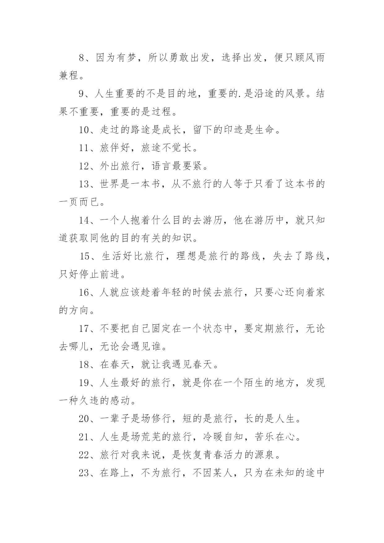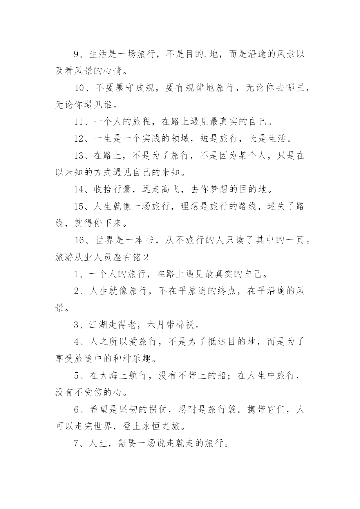 旅游从业人员座右铭旅游从业人员座右铭无论是在学校还是在社会中,大家总免不了要接触或使用座右铭吧,古今中外的成功人士几乎都有自己的人生格言——座右铭。那么问题来了,到底什么样的座右铭才经典呢?以下是小编帮大家整理的旅游从业人员座右铭,欢迎阅读与收藏。旅游从业人员座右铭11、一个人旅行的目的是什么,在他旅行的过程中,他只获得与他的目的有关的知识。2、旅行,对我来说,是恢复活力的源泉。3、希望是一根铁棍,耐心是一个袋子。有了它们,一个人可以走遍世界,开始一段永恒的旅程。4、因为有梦想,所以才有勇气去开始,选择去开始,然后才有风雨兼程。5、人生是一场不毛之旅,冷暖自知,苦在心头。6、成长的道路是,留下脚印的是生命。7、人生重要的不是目的地,而是沿途的风景。结果并不重要,重要的是过程。8、旅行、阅读和认识他人是丰富人生经历的三种方式。9、生活是一场旅行,不是目的.地,而是沿途的风景以及看风景的心情。10、不要墨守成规,要有规律地旅行,无论你去哪里,无论你遇见谁。11、一个人的旅程,在路上遇见最真实的自己。12、一生是一个实践的领域,短是旅行,长是生活。13、在路上,不是为了旅行,不是因为某个人,只是在以未知的方式遇见自己的未知。14、收拾行囊,远走高飞,去你梦想的目的地。15、人生就像一场旅行,理想是旅行的路线,迷失了路线,就得停下来。16、世界是一本书,从不旅行的人只读了其中的一页。旅游从业人员座右铭21、一个人的旅行,在路上遇见最真实的自己。2、人生就像旅行,不在乎旅途的终点,在乎沿途的风景。3、江湖走得老,六月带棉袄。4、人之所以爱旅行,不是为了抵达目的地,而是为了享受旅途中的种种乐趣。5、在大海上航行,没有不带上的船;在人生中旅行,没有不受伤的心。6、希望是坚韧的拐仗,忍耐是旅行袋。携带它们,人可以走完世界,登上永恒之旅。7、人生,需要一场说走就走的旅行。8、因为有梦,所以勇敢出发,选择出发,便只顾风雨兼程。9、人生重要的不是目的地,重要的.是沿途的风景。结果不重要,重要的是过程。10、走过的路途是成长,留下的印迹是生命。11、旅伴好,旅途不觉长。12、外出旅行,语言最要紧。13、世界是一本书,从不旅行的人等于只看了这本书的一页而已。14、一个人抱着什么目的去游历,他在游历中,就只知道获取同他的目的有关的知识。15、生活好比旅行,理想是旅行的路线,失去了路线,只好停止前进。16、人就应该趁着年轻的时候去旅行,只要心还向着家的方向。17、不要把自己固定在一个状态中,要定期旅行,无论去哪儿,无论会遇见谁。18、在春天,就让我遇见春天。19、人生最好的旅行,就是你在一个陌生的地方,发现一种久违的感动。20、一辈子是场修行,短的是旅行,长的是人生。21、人生是场荒芜的旅行,冷暖自知,苦乐在心。22、旅行对我来说,是恢复青春活力的源泉。23、在路上,不为旅行,不因某人,只为在未知的途中遇见未知的自己。24、据说每个人心里.都有一只想旅行的小魔鬼。25、背上行囊去远方,那个梦寐以求的目的地。26、人生是一场旅行,在乎的不是目的地,是沿途的风景以及看风景的心情。27、背起行囊,独自旅行。