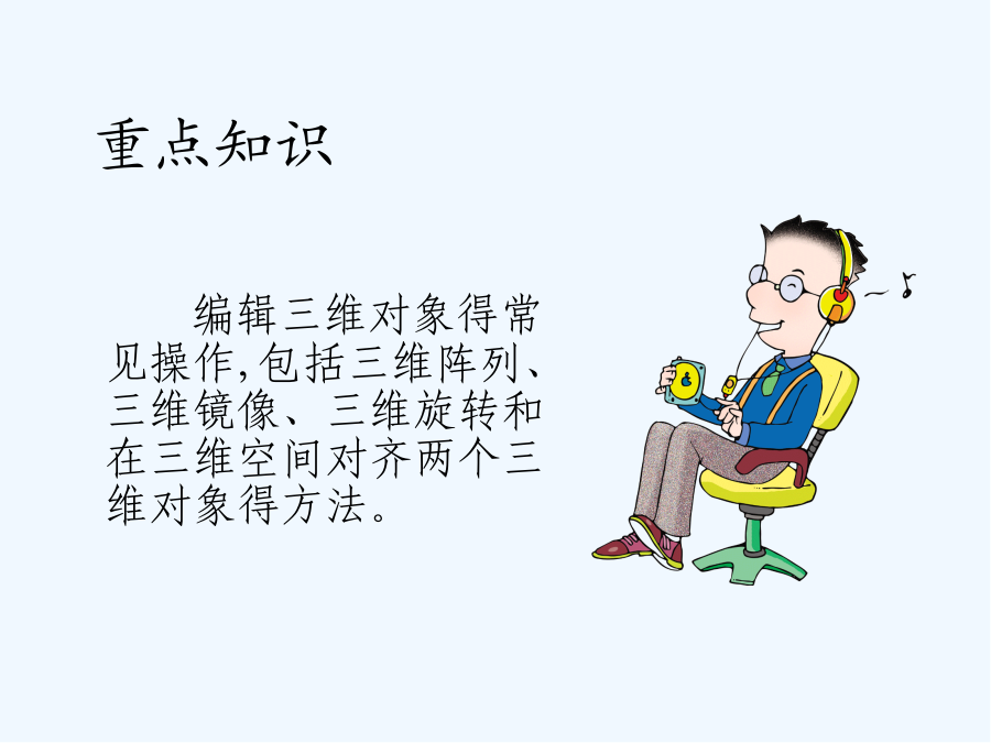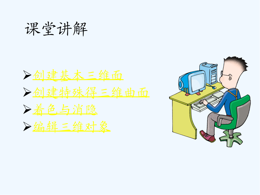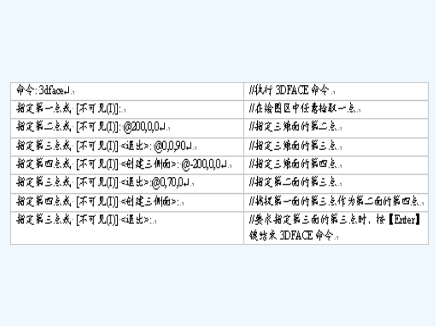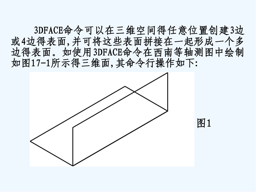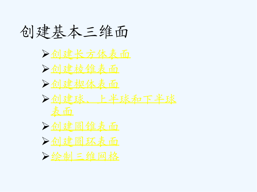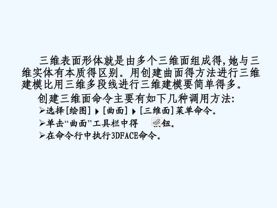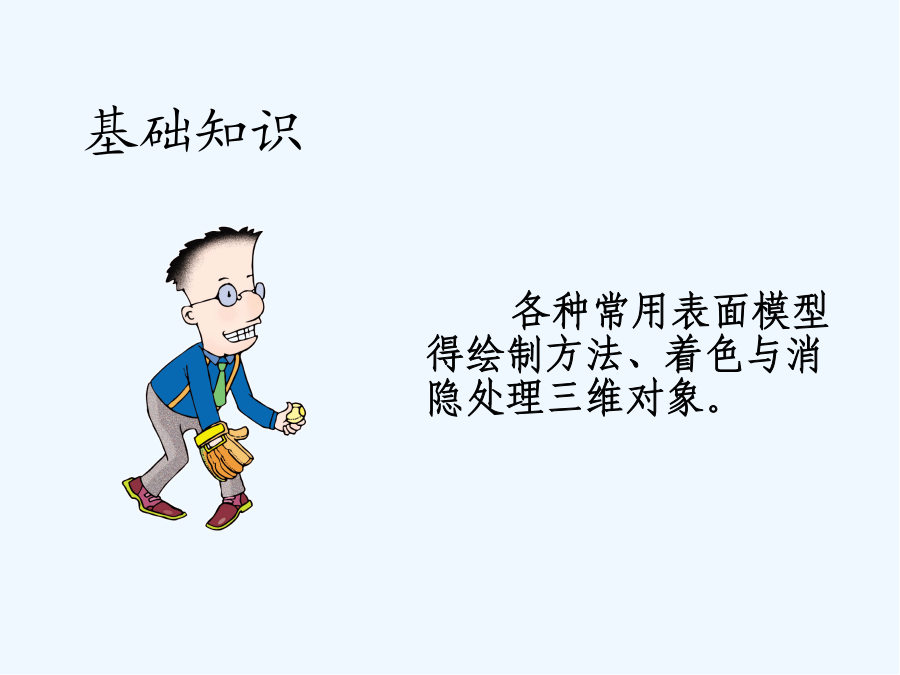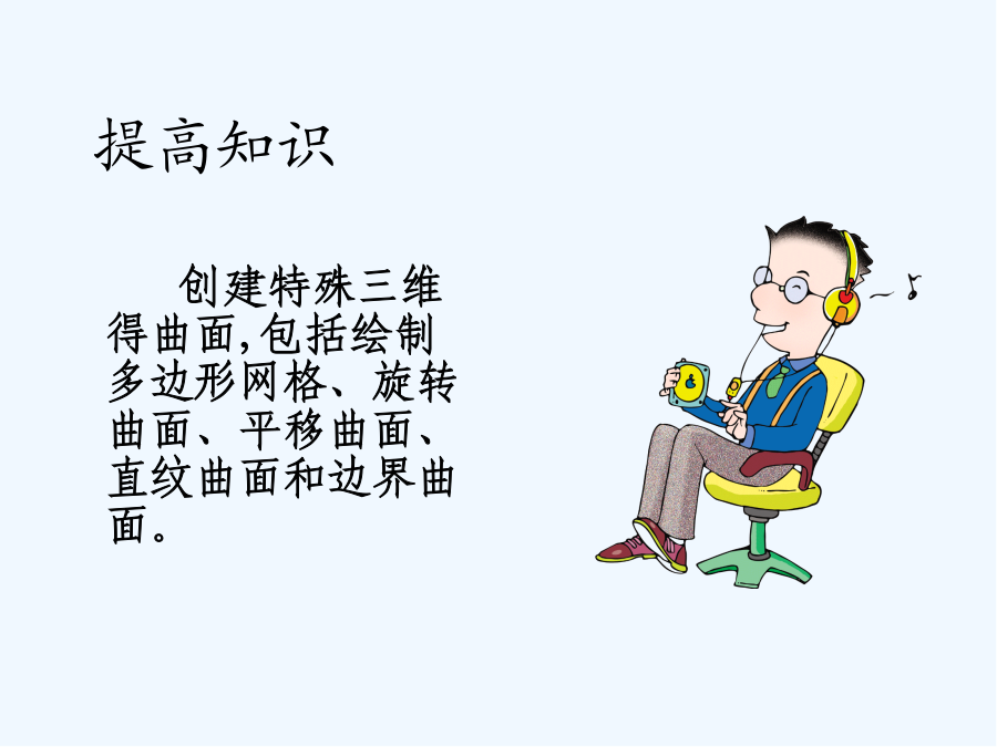 三维制图入门教程课前导读基础知识重点知识提高知识课堂讲解创建基本三维面三维表面形体就是由多个三维面组成得,她与三维实体有本质得区别。用创建曲面得方法进行三维建模比用三维多段线进行三维建模要简单得多。创建三维面命令主要有如下几种调用方法:选择[绘图][曲面][三维面]菜单命令。单击“曲面”工具栏中得按钮。在命令行中执行3DFACE命令。3DFACE命令可以在三维空间得任意位置创建3边或4边得表面,并可将这些表面拼接在一起形成一个多边得表面。如使用3DFACE命令在西南等轴测图中绘制如图17-1所示得三维面,其命令行操作如下:11执行命令过程中得“不可见”选项用于控制三维面各边得可见性,以便建立有孔对象得正确模型。在绘制三维面时,每一个平面最多只能有4条边(即4个顶点),当4个顶点具有不同得Z轴坐标值时,AutoCAD将创建非平面得三维面。为了方便用户,AutoCAD提供了常用三维面得绘制方法,用户只需执行相应命令后,根据命令行中得提示进行操作即可快速绘制出相应得三维面。绘制常用三维面命令得菜单命令调用方法较为复杂,需选择[绘图][曲面][三维曲面]菜单命令,打开如图2所示得“三维对象”对话框,然后在左侧得列表框中选择相应得选项或在右侧单击相应得图标,最后单击按钮。在后面讲解各种常用三维面得绘制方法得过程中,将不再提及这种调用方法。图2创建长方体表面命令主要有如下几种调用方法:单击“曲面”工具栏中得按钮。在命令行中执行AI_BOX命令。如使用AI_BOX命令创建如图3所示得长方体表面,其命令行操作如下:执行命令过程中得选项含义如下:立方体:输入第一个长度后选择该选项可以创建长、宽、高相等得立方体。参照:将长方体表面与图形中得其她对象对齐,或按指定得角度进行旋转。创建棱锥表面命令主要有如下几种调用方法:单击“曲面”工具栏中得按钮。在命令行中执行AI_PYRAMID命令。使用AI_PYRAMID命令得过程中可以选择不同得选项来创建顶面为点、棱或面得棱锥面,如创建如图4所示得顶面为棱得棱锥面,其命令行操作如下:执行命令过程中得各选项含义如下:四面体:选择该选项后棱锥面底面得第四角点将自动与第一角点重合,并出现提示信息,“指定四面体表面得顶点或[顶面(T)]:”,指定顶点即可创建出三棱锥。选择提示信息中得“顶面”选项则还需指定3点来定义三棱锥得顶面。棱:将棱锥面得顶面定义为棱,如图4所示。选择该选项后需指定棱得两个端点,应注意指定得顺序,以避免出现自交线框。顶面:将棱锥得顶面定义为平面。选择该选项后还需指定顶面得4个角点,指定时应注意顺序,否则将创建出自交得多边形网格。创建楔体表面命令主要有如下几种调用方法:单击“曲面”工具栏中得按钮。在命令行中执行AI_WEDGE命令。楔体表面得创建方法与长方体得创建方法相似。如使用AI_WEDGE命令创建如图17-5所示得楔体表面,其命令行操作如下:创建球表面、上半球表面和下半球表面得方法完全相同,都需指定中心点、球面半径和曲面得经纬线数目。创建球表面命令主要有如下几种调用方法:单击“曲面”工具栏中得按钮。在命令行中执行AI_SPHERE命令。创建上半球表面命令主要有如下几种调用方法:单击“曲面”工具栏中得按钮。在命令行中执行AI_DOME命令。创建下半球表面命令主要有如下几种调用方法:单击“曲面”工具栏中得按钮。在命令行中执行AI_DOME命令。如使用AI_SPHERE命令创建直径为50得球面,效果如图6所示,其命令行操作如下:球表面得默认经、纬线数目为16,用户可以重新指定,但必须就是大于1得正整数。经、纬线得数目设置得越多,曲面在进行着色后表面越平滑,但在对其重生成、平移或缩放时需用得时间也越多。如将经线与纬线数均设为48后绘制直径相同得球表面,其效果如图7所示。创建上半球表面和下半球表面时得默认经线数目为16,默认纬线数目为8。如创建直径为50得上半球面与下半球表面,其效果分别如图8、图9所示。创建圆锥表面命令主要有如下几种调用方法:单击“曲面”工具栏中得按钮。在命令行中执行AI_CONE命令。如使用AI_CONE命令创建如图10所示得圆锥面,其命令行操作如下:在指定圆锥面顶面得半径时,如果输入一个正数,将创建出圆锥台,如将顶面半径设为8时得效果如图11所示。创建圆环表面命令主要有如下几种调用方法:单击“曲面”工具栏中得按钮。在命令行中执行AI_TORUS命令。AI_TORUS命令可以创建与当前UCS得XY平面平行得圆环状多边形网格。如创建如图12所示得圆环表面,其命令行操作如下:通过对话框指定观察视点DDVPOINT和VPOINT命令都只能用于模型空间,DDVPOINT命令可用对话框控制视图视点,VPOINT则以平行投影