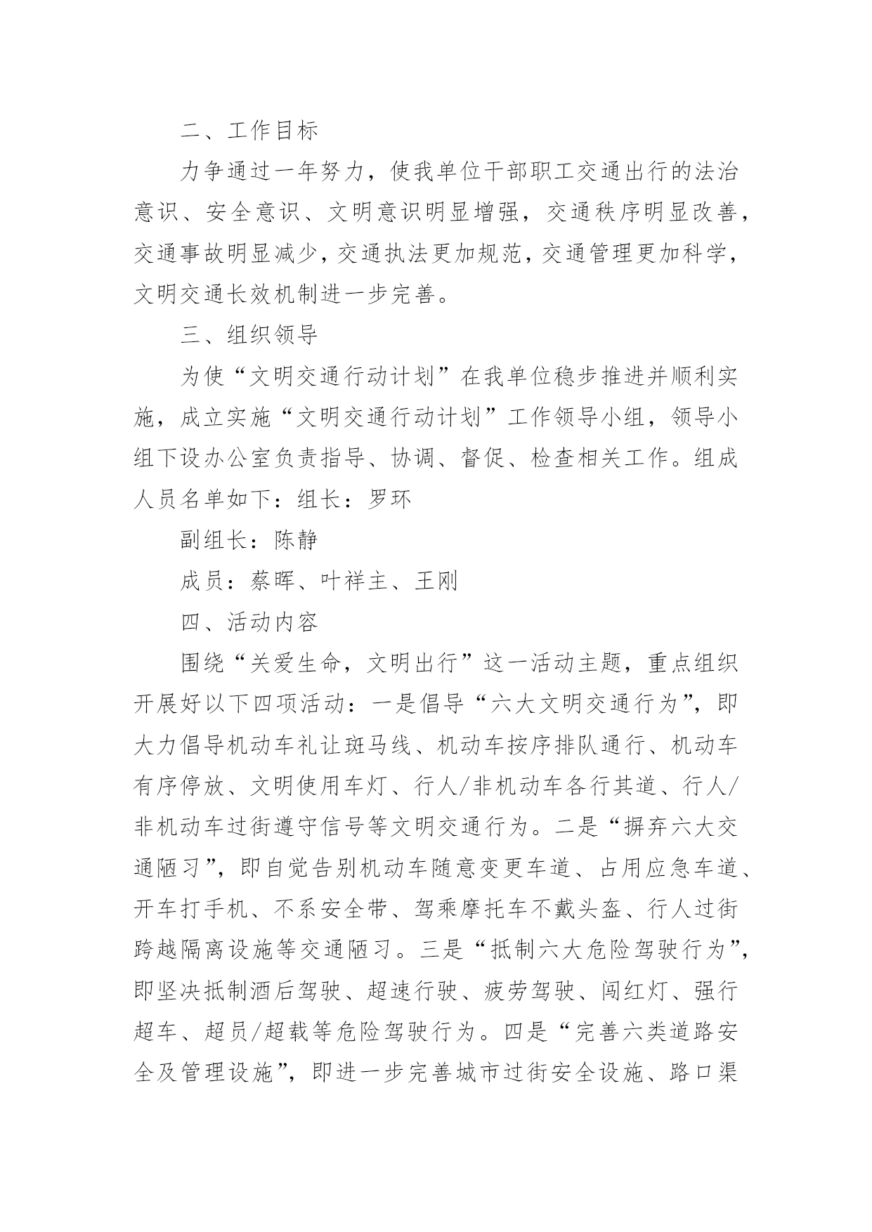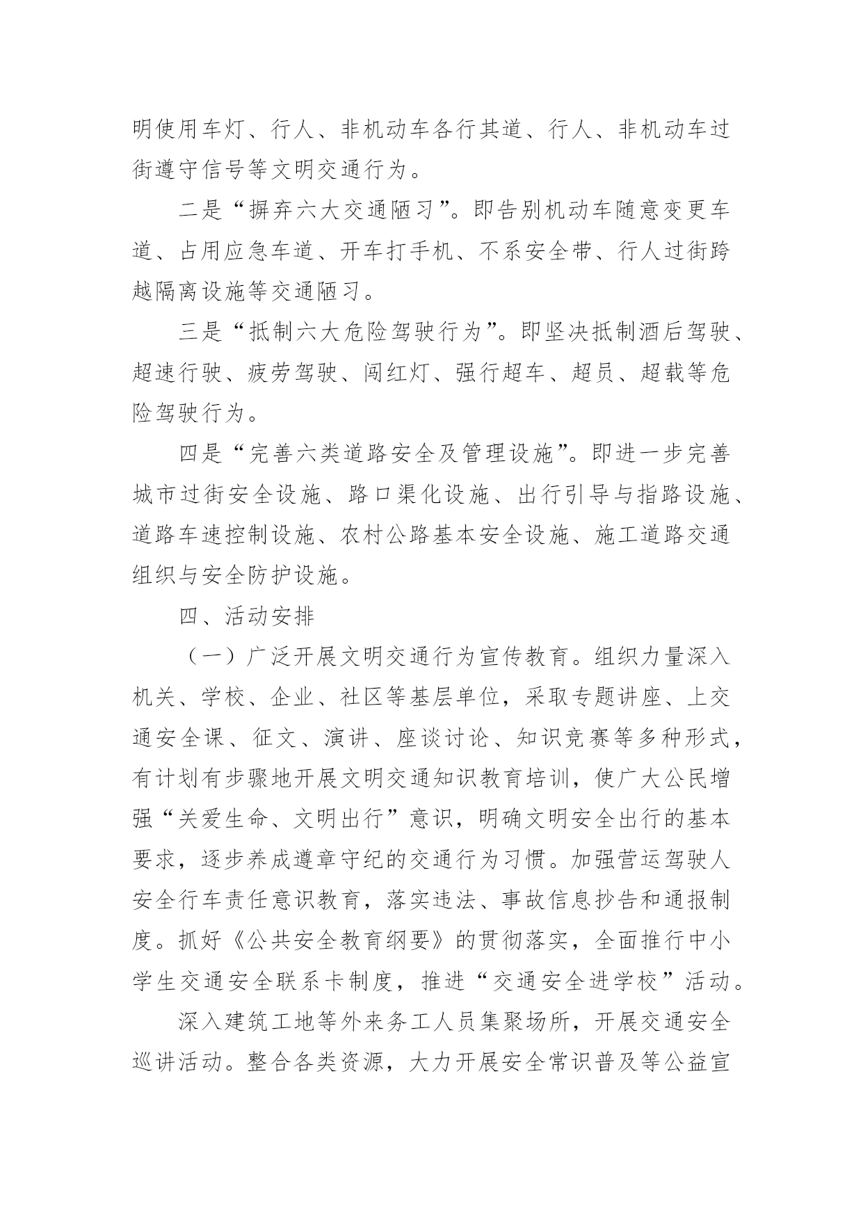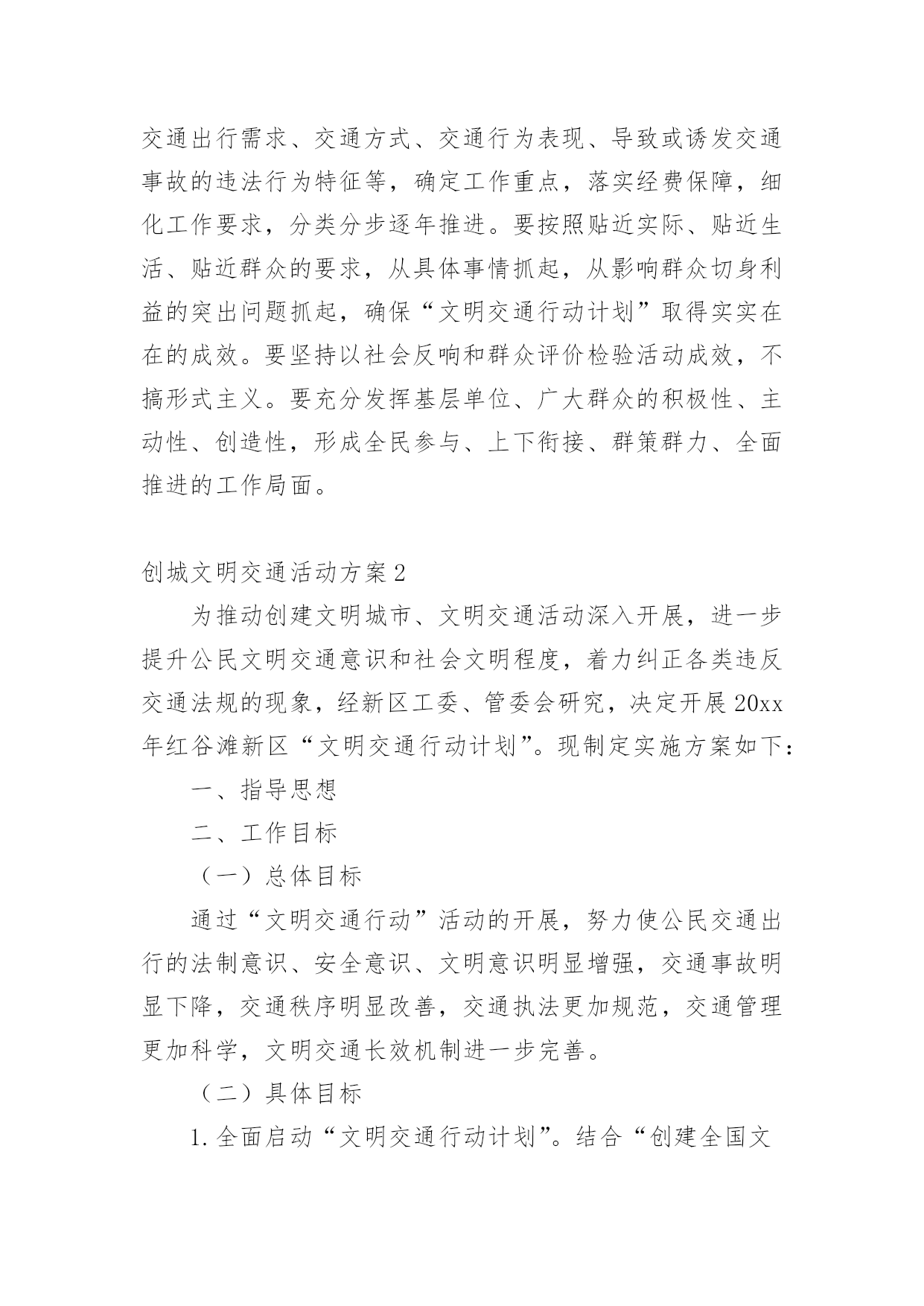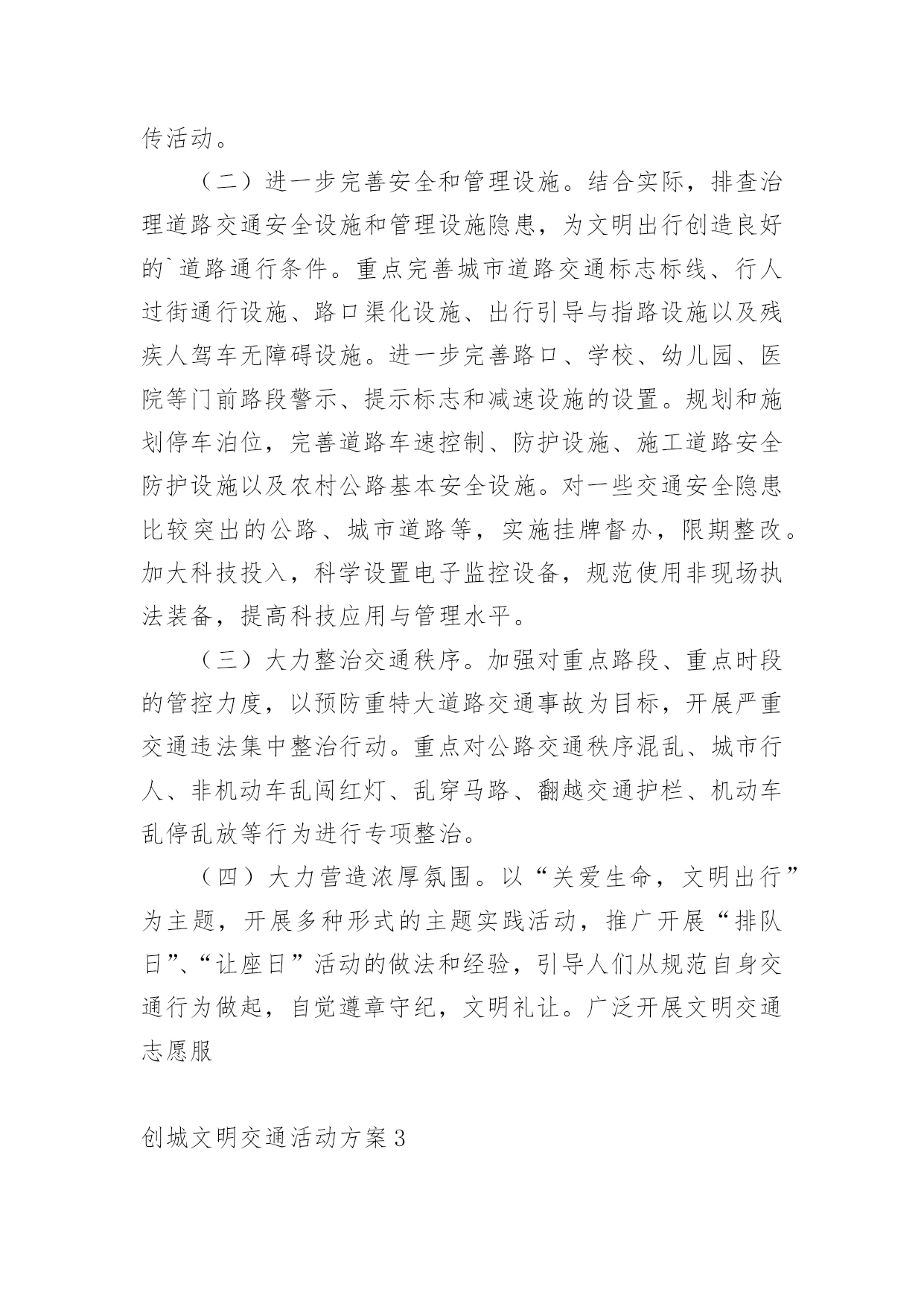 创城文明交通活动方案创城文明交通活动方案范文(通用10篇)为确保活动顺利开展,通常需要提前准备好一份活动方案,活动方案的内容和形式都要围绕着活动的主题来展开,最终达到活动的目的或者意义。制定活动方案需要注意哪些问题呢?下面是小编收集整理的创城文明交通活动方案范文(通用10篇),仅供参考,希望能够帮助到大家。创城文明交通活动方案1为深化“讲文明树新风”活动,着力纠正各类违反交通法规行为,切实增强本单位干部职工交通法治、安全和文明意识,创造良好道路通行环境,进一步提升全县公民文明素质和社会文明程度,根据县文明办、公安局的统一部署,制定了我单位文明交通行动计划实施方案。一、指导思想以邓小平理论和“三个代表”重要思想为指导,深入贯彻落实科学发展观,坚持以人为本,以努力提高公民文明交通素质为主线,以解决影响道路交通安全畅通的突出问题为切入点,以动员社会各界和人民群众共同参与为抓手,以“关爱生命、文明出行”为主题,大力开展文明交通活动,立足当前,着眼长远,科学精细管理,严格规范执法,为推进科学发展、促进尉犁崛起创造安全畅通、文明和谐的道路交通环境。二、工作目标力争通过一年努力,使我单位干部职工交通出行的法治意识、安全意识、文明意识明显增强,交通秩序明显改善,交通事故明显减少,交通执法更加规范,交通管理更加科学,文明交通长效机制进一步完善。三、组织领导为使“文明交通行动计划”在我单位稳步推进并顺利实施,成立实施“文明交通行动计划”工作领导小组,领导小组下设办公室负责指导、协调、督促、检查相关工作。组成人员名单如下:组长:罗环副组长:陈静成员:蔡晖、叶祥主、王刚四、活动内容围绕“关爱生命,文明出行”这一活动主题,重点组织开展好以下四项活动:一是倡导“六大文明交通行为”,即大力倡导机动车礼让斑马线、机动车按序排队通行、机动车有序停放、文明使用车灯、行人/非机动车各行其道、行人/非机动车过街遵守信号等文明交通行为。二是“摒弃六大交通陋习”,即自觉告别机动车随意变更车道、占用应急车道、开车打手机、不系安全带、驾乘摩托车不戴头盔、行人过街跨越隔离设施等交通陋习。三是“抵制六大危险驾驶行为”,即坚决抵制酒后驾驶、超速行驶、疲劳驾驶、闯红灯、强行超车、超员/超载等危险驾驶行为。四是“完善六类道路安全及管理设施”,即进一步完善城市过街安全设施、路口渠化设施、出行引导与指路设施、道路车速控制设施、农村公路基本安全设施、施工道路交通组织与安全防护设施。五、主要措施(一)广泛开展文明交通行为教育。要紧紧围绕“关爱生命、文明出行”主题,以深化交通安全宣传“五进”为载体,以新闻媒体为依托,整合社会资源,组织力量深入学校、企业、社区等基层单位,通过采取专题讲座、征文、演讲、座谈讨论、知识竞赛、文明交通参与者评选等多种形式,广泛宣传交通安全法律法规、文明安全出行的基本常识和礼仪,有计划有步骤地开展文明交通知识教育培训,逐步养成遵章守法的交通行为习惯。要积极主动会同工会、共青团、妇联等群众团体一起动作,把活动覆盖到不同群体。要组织协调新闻媒体及时报道活动进展情况和有效做法,倡导文明行为,批评不良现象,强化社会监督,形成有利的舆论环境。要注重发挥利用车友会、汽车俱乐部、汽车安全组织等团体和组织的作用,对私家车驾驶人进行文明交通教育引导。(二)进一步完善安全和管理设施。要认真排查治理本地道路交通安全隐患,改善道路交通安全管理设施,为文明出行创造良好道路通行条件。(三)大力营造浓厚氛围。要结合每年的“春运”、“五一”、“十一”等重要活动和节假日,紧紧围绕“关爱生命,文明出行”宣传主题,以“倡导六大文明交通行为”、“摒弃六大交通陋习”、“抵制六大危险驾驶行为”为主要内容,广泛开展多种形式教育实践体验活动,推广“排队日”、“让座日”活动的做法和经验,引导人们从规范自身做起,自觉遵章守法,文明礼让;要动员党员干部、企事业单位员工、学生、社区居民广泛开展文明交通志愿服务活动,开展经常性交通违法劝导活动,六、工作要求实施“文明交通行动计划”,是为适应社会发展和人民群众愿望、推动城乡文明进步、构建和谐社会面,直接面向公众开展的精神文明建设实践活动,要按照“政府主导、部门联动、综合治理、全民参与”的.原则,结合本单位实际,推动“文明交通行动计划”健康顺利开展。(一)提高认识,加强领导。要充分认识实施“文明交通行动计划”的重要意义,把这项活动作为坚持以人为本、促进经济社会协调发展的生动实践,作为提升公民文明素质和社会文明程度的重要举措,作为群众性创建活动的重要抓手,作为改善道路通行秩序、缓解道路交通拥堵、预防和减少道路交通事故,创建文明和谐道路交通环境的重要措施,列入重要工作日程,制定具体实施计划,做出周密部署。为确保“文明交通行动计划”有组织、有计划地开展并切实取得成效。(二)明确职责,