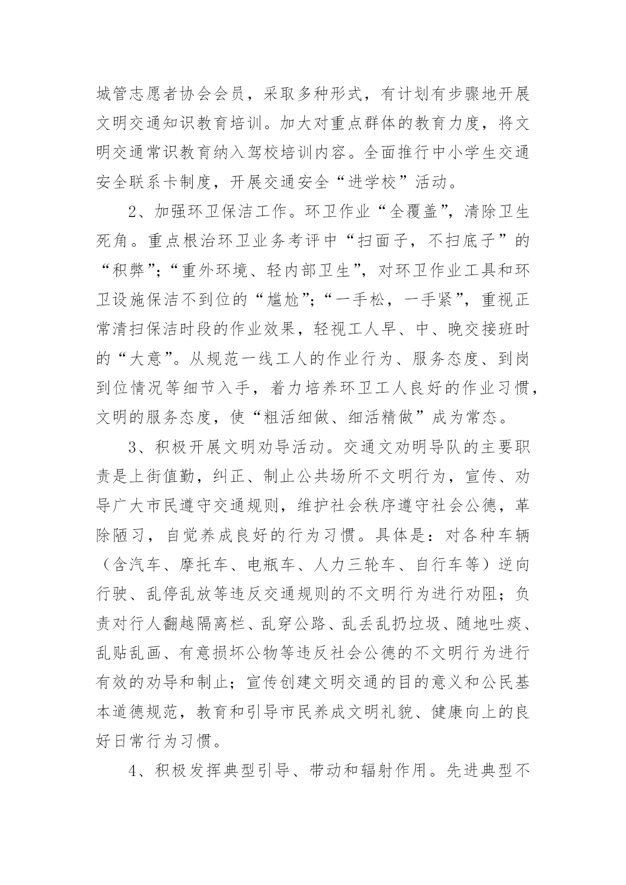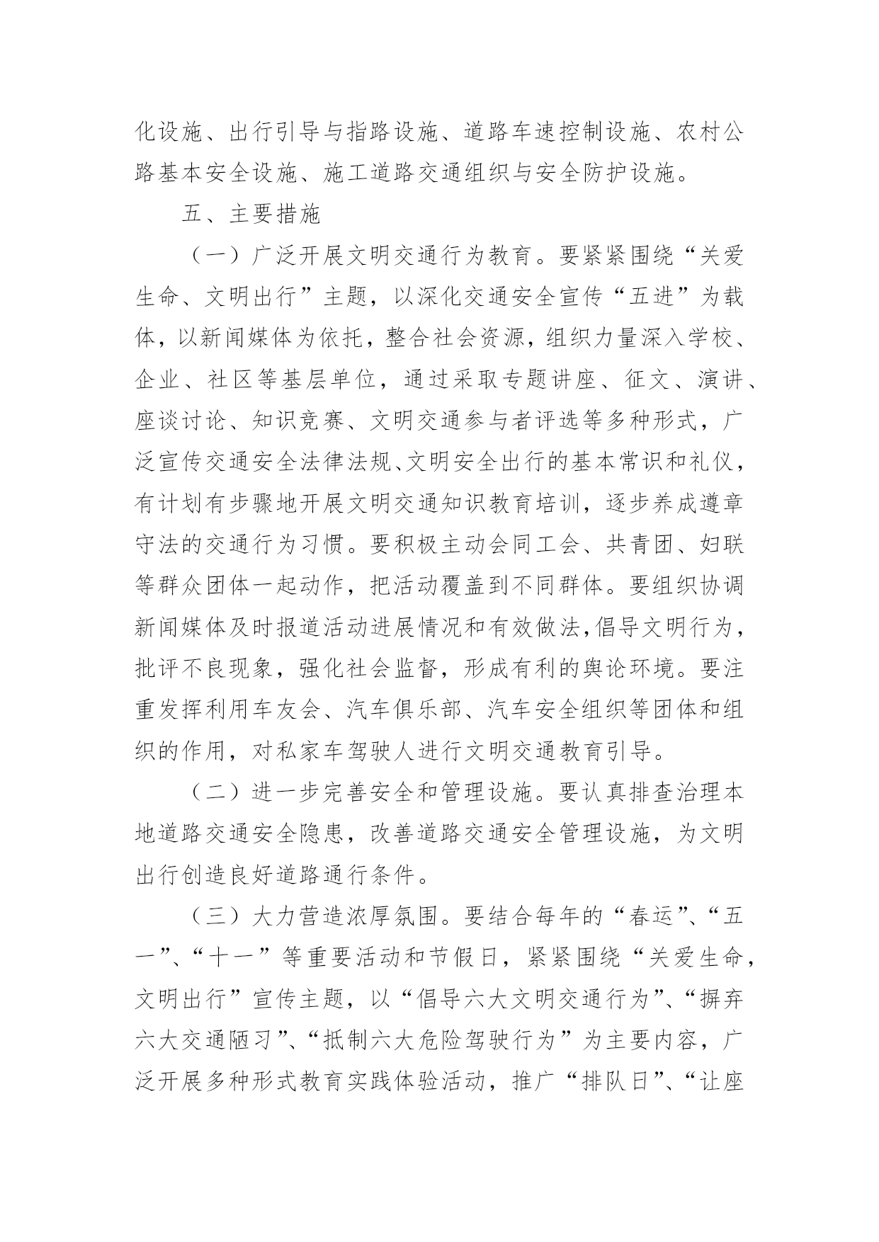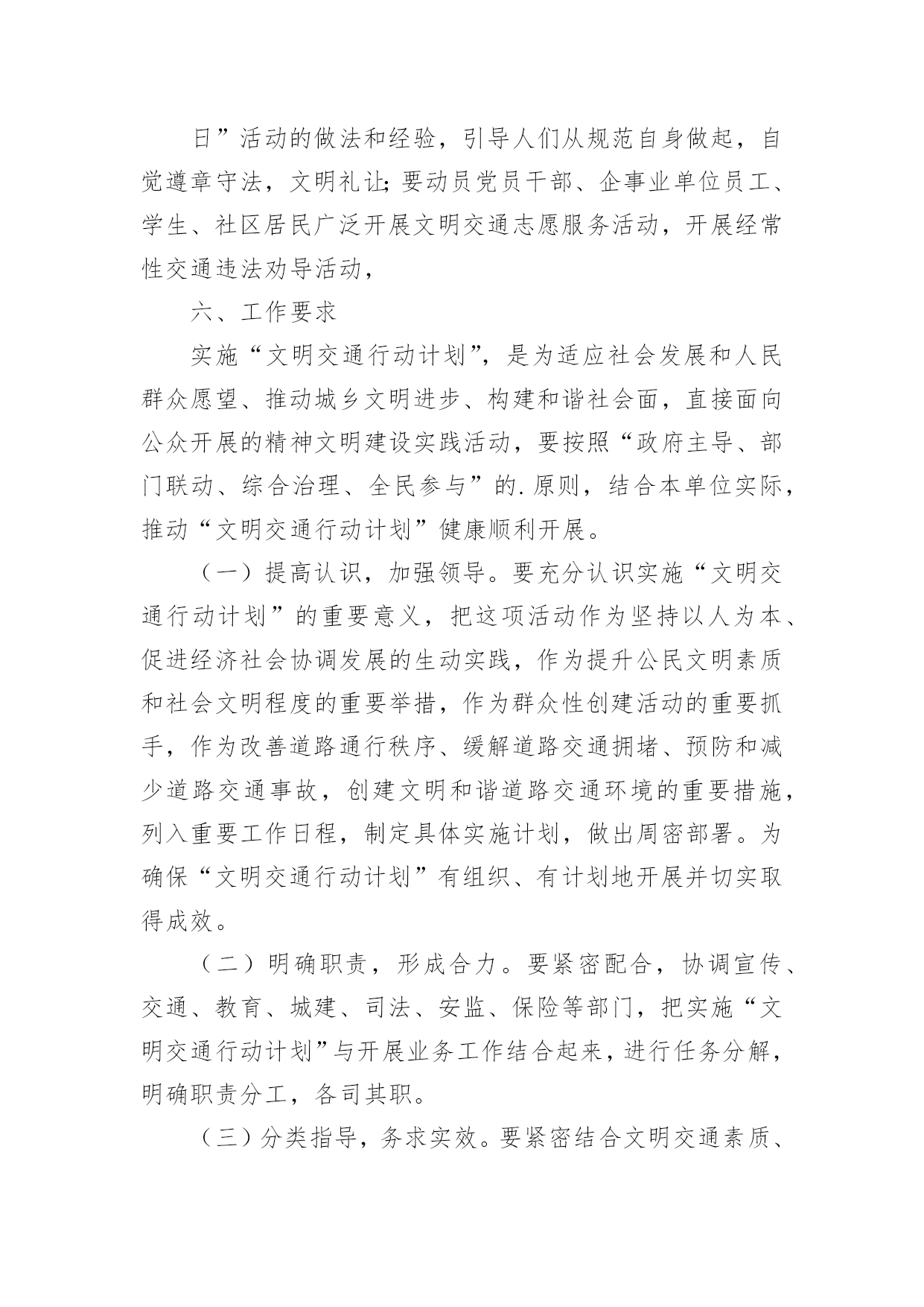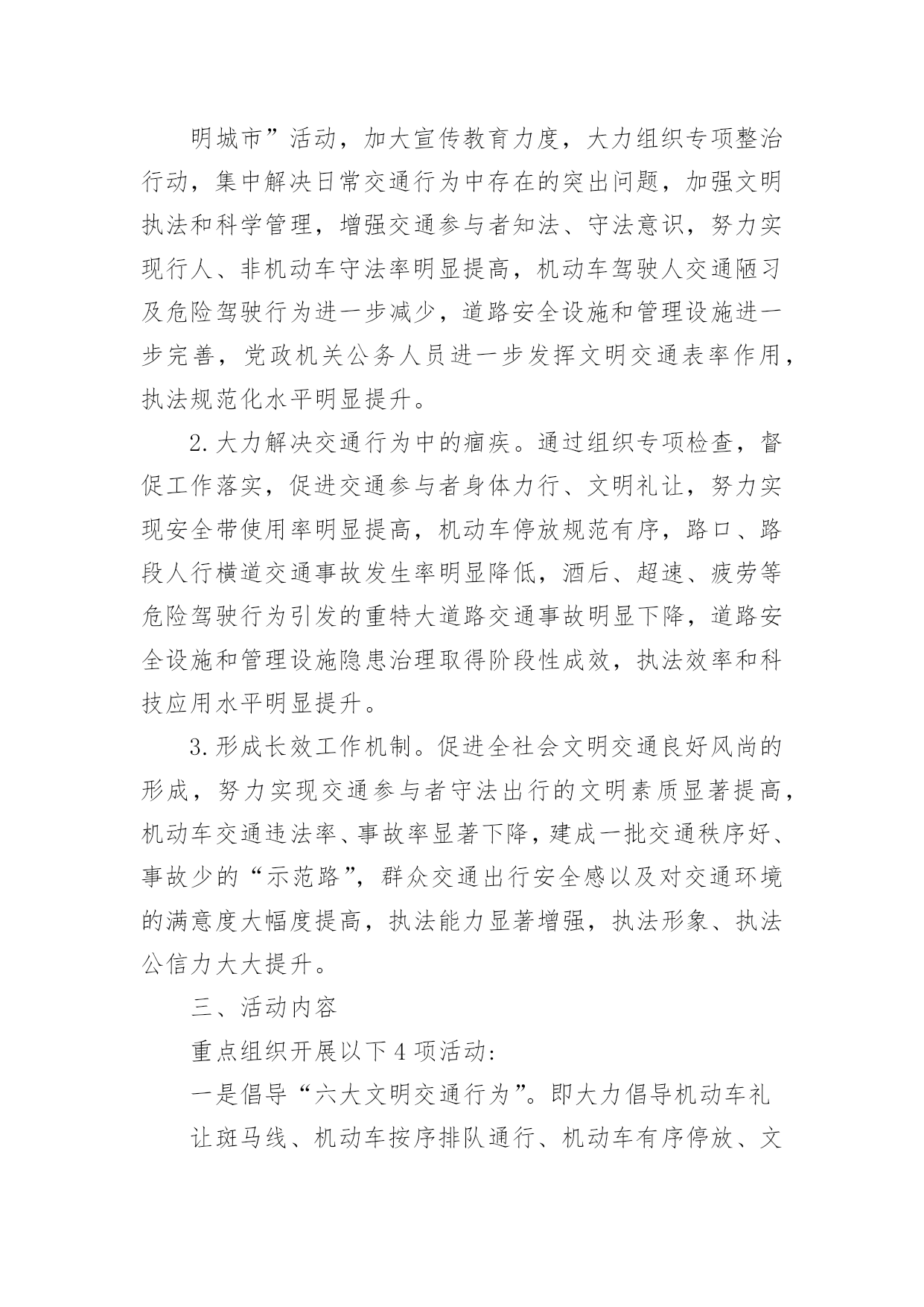 创城文明交通活动方案创城文明交通活动方案范文(通用10篇)为确保活动顺利开展,通常需要提前准备好一份活动方案,活动方案的内容和形式都要围绕着活动的主题来展开,最终达到活动的目的或者意义。制定活动方案需要注意哪些问题呢?下面是小编收集整理的创城文明交通活动方案范文(通用10篇),仅供参考,希望能够帮助到大家。创城文明交通活动方案1为深化“讲文明树新风”活动,着力纠正各类违反交通法规行为,切实增强本单位干部职工交通法治、安全和文明意识,创造良好道路通行环境,进一步提升全县公民文明素质和社会文明程度,根据县文明办、公安局的统一部署,制定了我单位文明交通行动计划实施方案。一、指导思想以邓小平理论和“三个代表”重要思想为指导,深入贯彻落实科学发展观,坚持以人为本,以努力提高公民文明交通素质为主线,以解决影响道路交通安全畅通的突出问题为切入点,以动员社会各界和人民群众共同参与为抓手,以“关爱生命、文明出行”为主题,大力开展文明交通活动,立足当前,着眼长远,科学精细管理,严格规范执法,为推进科学发展、促进尉犁崛起创造安全畅通、文明和谐的道路交通环境。二、工作目标力争通过一年努力,使我单位干部职工交通出行的法治意识、安全意识、文明意识明显增强,交通秩序明显改善,交通事故明显减少,交通执法更加规范,交通管理更加科学,文明交通长效机制进一步完善。三、组织领导为使“文明交通行动计划”在我单位稳步推进并顺利实施,成立实施“文明交通行动计划”工作领导小组,领导小组下设办公室负责指导、协调、督促、检查相关工作。组成人员名单如下:组长:罗环副组长:陈静成员:蔡晖、叶祥主、王刚四、活动内容围绕“关爱生命,文明出行”这一活动主题,重点组织开展好以下四项活动:一是倡导“六大文明交通行为”,即大力倡导机动车礼让斑马线、机动车按序排队通行、机动车有序停放、文明使用车灯、行人/非机动车各行其道、行人/非机动车过街遵守信号等文明交通行为。二是“摒弃六大交通陋习”,即自觉告别机动车随意变更车道、占用应急车道、开车打手机、不系安全带、驾乘摩托车不戴头盔、行人过街跨越隔离设施等交通陋习。三是“抵制六大危险驾驶行为”,即坚决抵制酒后驾驶、超速行驶、疲劳驾驶、闯红灯、强行超车、超员/超载等危险驾驶行为。四是“完善六类道路安全及管理设施”,即进一步完善城市过街安全设施、路口渠化设施、出行引导与指路设施、道路车速控制设施、农村公路基本安全设施、施工道路交通组织与安全防护设施。五、主要措施(一)广泛开展文明交通行为教育。要紧紧围绕“关爱生命、文明出行”主题,以深化交通安全宣传“五进”为载体,以新闻媒体为依托,整合社会资源,组织力量深入学校、企业、社区等基层单位,通过采取专题讲座、征文、演讲、座谈讨论、知识竞赛、文明交通参与者评选等多种形式,广泛宣传交通安全法律法规、文明安全出行的基本常识和礼仪,有计划有步骤地开展文明交通知识教育培训,逐步养成遵章守法的交通行为习惯。要积极主动会同工会、共青团、妇联等群众团体一起动作,把活动覆盖到不同群体。要组织协调新闻媒体及时报道活动进展情况和有效做法,倡导文明行为,批评不良现象,强化社会监督,形成有利的舆论环境。要注重发挥利用车友会、汽车俱乐部、汽车安全组织等团体和组织的作用,对私家车驾驶人进行文明交通教育引导。(二)进一步完善安全和管理设施。要认真排查治理本地道路交通安全隐患,改善道路交通安全管理设施,为文明出行创造良好道路通行条件。(三)大力营造浓厚氛围。要结合每年的“春运”、“五一”、“十一”等重要活动和节假日,紧紧围绕“关爱生命,文明出行”宣传主题,以“倡导六大文明交通行为”、“摒弃六大交通陋习”、“抵制六大危险驾驶行为”为主要内容,广泛开展多种形式教育实践体验活动,推广“排队日”、“让座日”活动的做法和经验,引导人们从规范自身做起,自觉遵章守法,文明礼让;要动员党员干部、企事业单位员工、学生、社区居民广泛开展文明交通志愿服务活动,开展经常性交通违法劝导活动,六、工作要求实施“文明交通行动计划”,是为适应社会发展和人民群众愿望、推动城乡文明进步、构建和谐社会面,直接面向公众开展的精神文明建设实践活动,要按照“政府主导、部门联动、综合治理、全民参与”的.原则,结合本单位实际,推动“文明交通行动计划”健康顺利开展。(一)提高认识,加强领导。要充分认识实施“文明交通行动计划”的重要意义,把这项活动作为坚持以人为本、促进经济社会协调发展的生动实践,作为提升公民文明素质和社会文明程度的重要举措,作为群众性创建活动的重要抓手,作为改善道路通行秩序、缓解道路交通拥堵、预防和减少道路交通事故,创建文明和谐道路交通环境的重要措施,列入重要工作日程,制定具体实施计划,做出周密部署。为确保“文明交通行动计划”有组织、有计划地开展并切实取得成效。(二)明确职责,