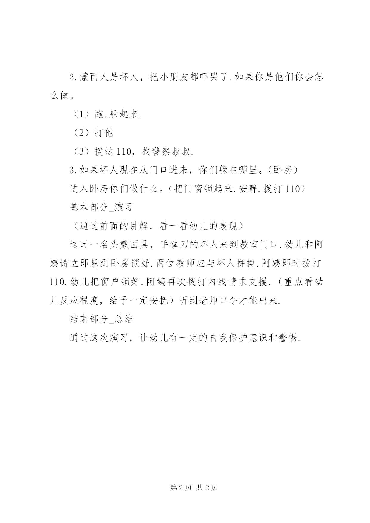 第PAGE\*Arabic\*MERGEFORMAT2页共NUMPAGES\*MERGEFORMAT2页防恐演习活动方案为吸取坏人对幼儿造成重大伤亡事故的教训,提高全校师生应急能力,特制定本次防恐演练活动方案。一、成立突发事件应急指挥领导小组总指挥:xx副指挥:xx成员:许阿姨及幼儿医务救助:肖医生二、参加人员:本班师生三、活动时间:xx年5月7日(星期五)9:00-9:30四、活动地点:小六班内五、活动目标:1、遇到坏人时,有初步的自我保护意识。2、遇到突发事件时,幼儿能及时快捷地撤离到安全地带。六、活动准备:面具、刀、电话七、活动过程:开始部分:_说一说1.幼儿看挂图,说出图片里发生了什么事情.(1)有蒙面人手里有刀.(2)有的小朋友哭了.在叫……(3)老师手里有东西……2.蒙面人是坏人,把小朋友都吓哭了.如果你是他们你会怎么做。(1)跑.躲起来.(2)打他(3)拨达110,找警察叔叔.3.如果坏人现在从门口进来,你们躲在哪里。(卧房)进入卧房你们做什么。(把门窗锁起来.安静.拨打110)基本部分_演习(通过前面的讲解,看一看幼儿的表现)这时一名头戴面具,手拿刀的坏人来到教室门口.幼儿和阿姨请立即躲到卧房锁好.两位教师应与坏人拼搏.阿姨即时拨打110.幼儿把窗户锁好.阿姨再次拨打内线请求支援.(重点看幼儿反应程度,给予一定安抚)听到老师口令才能出来.结束部分_总结通过这次演习,让幼儿有一定的自我保护意识和警惕.