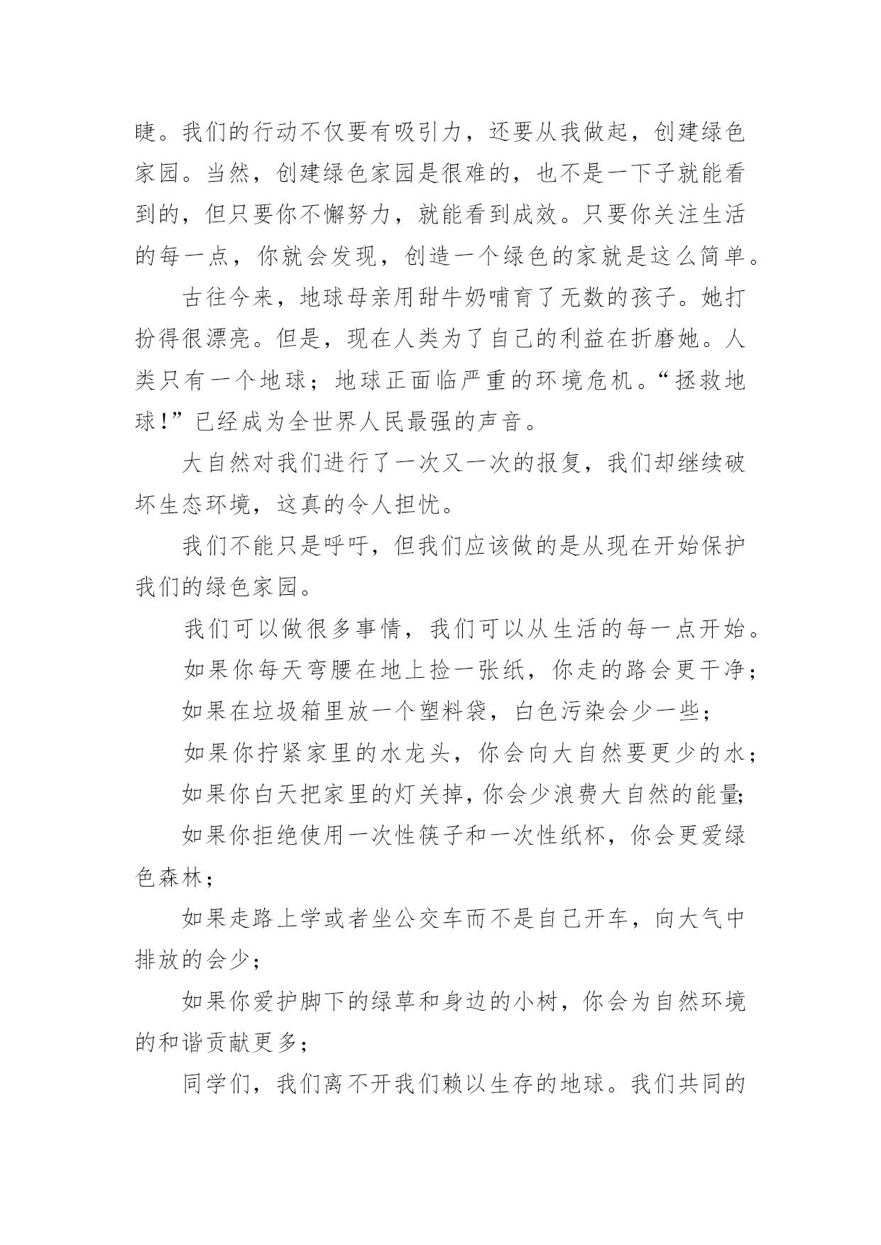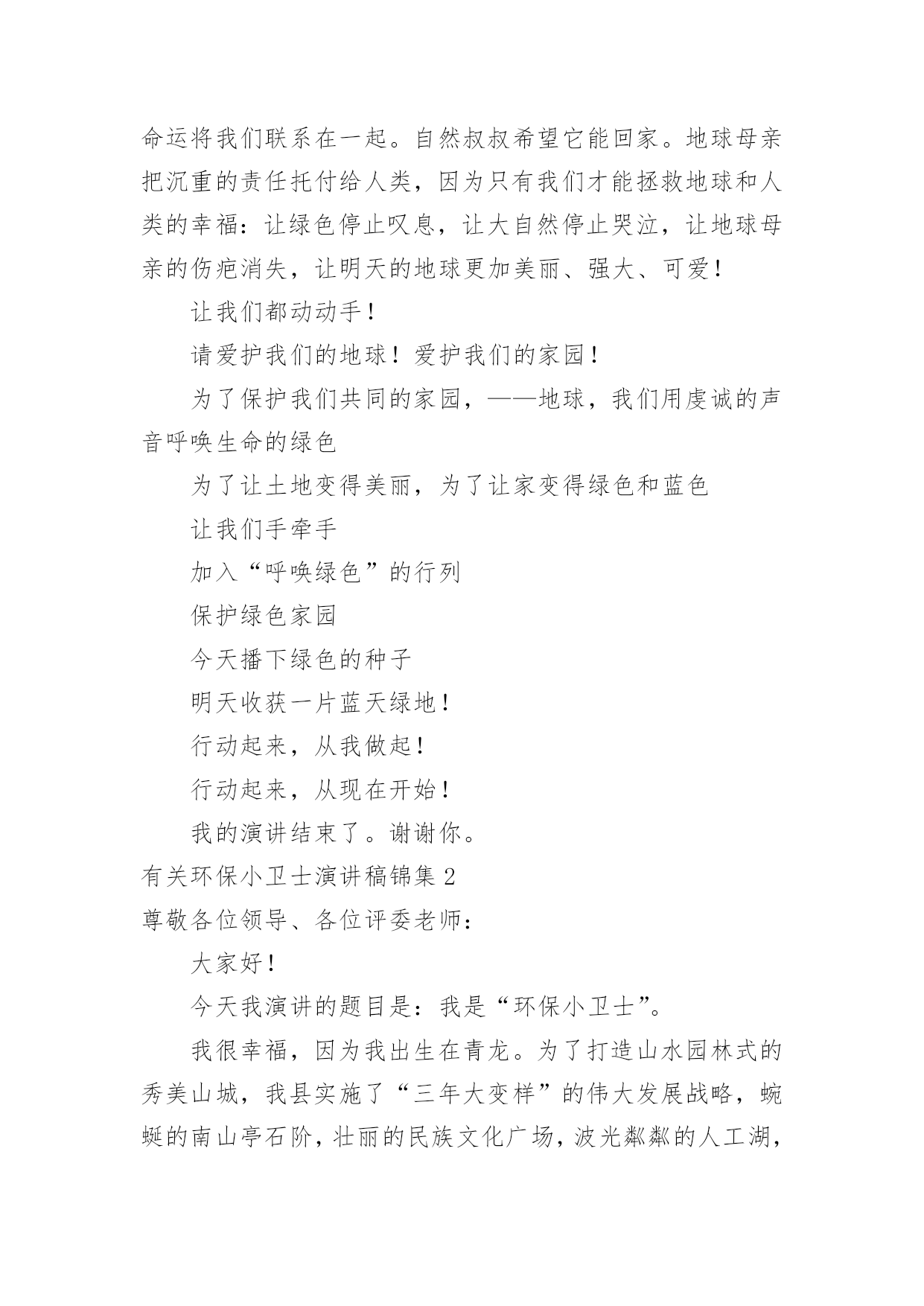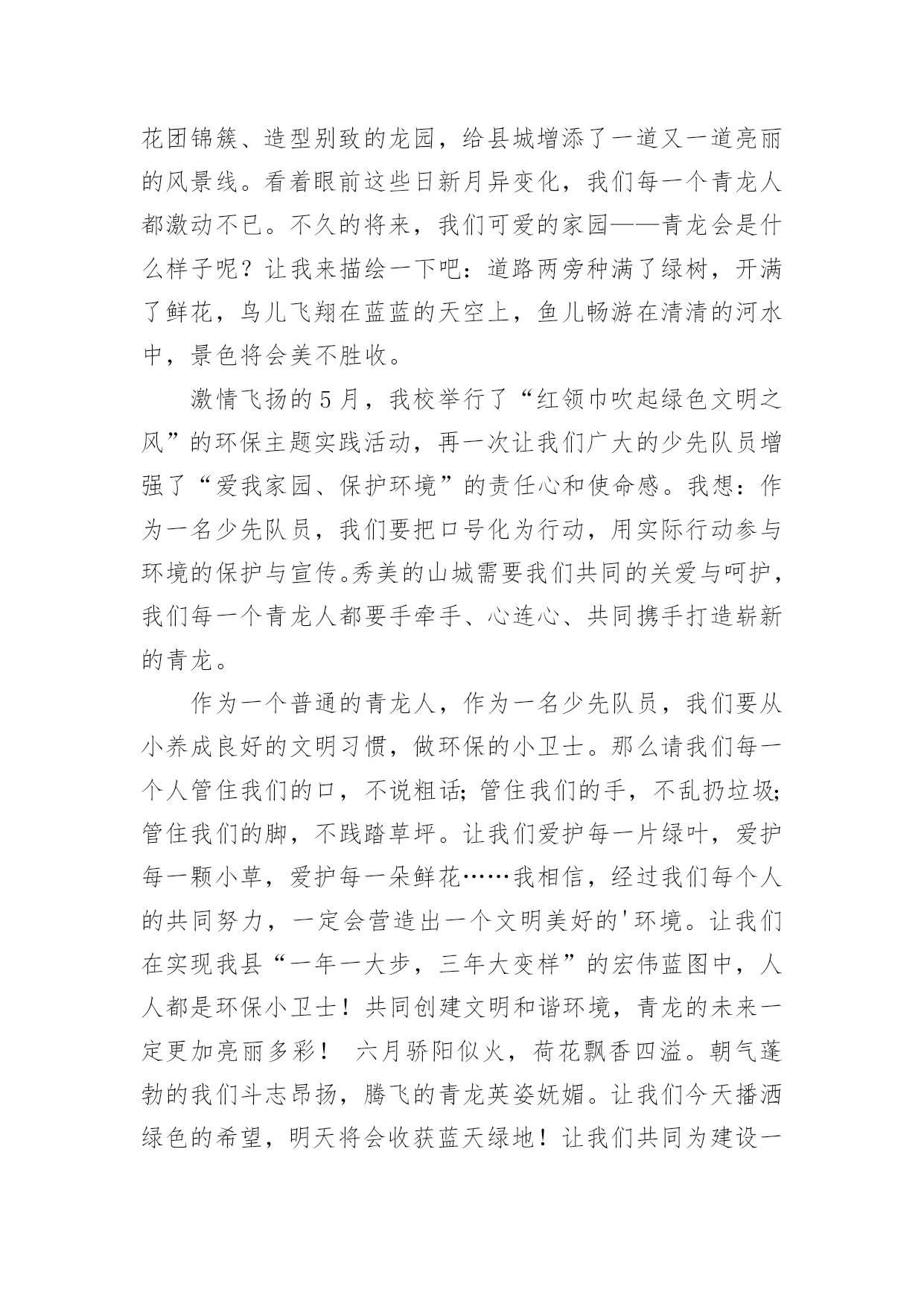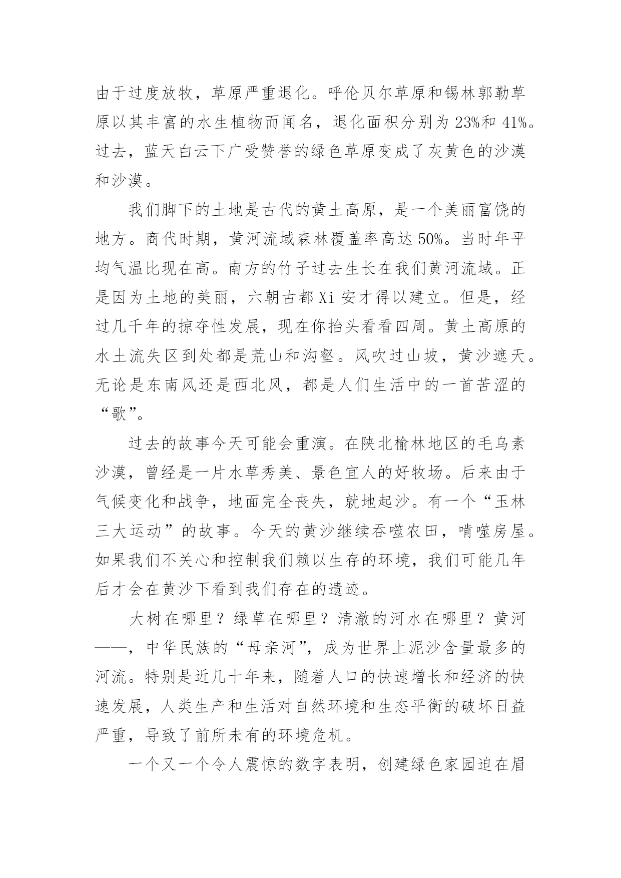 环保小卫士演讲稿有关环保小卫士演讲稿锦集演讲稿的写法比较灵活,可以根据会议的内容、一件事事后的感想、需要等情况而有所区别。在社会发展不断提速的今天,接触并使用演讲稿的人越来越多,如何写一份恰当的演讲稿呢?下面是小编精心整理的有关环保小卫士演讲稿锦集,仅供参考,欢迎大家阅读。有关环保小卫士演讲稿锦集1亲爱的老师们,亲爱的学生们:大家好!谁不想头顶的天空像镜子一样蓝,谁不想他们脚下的土地是绿色和绿色的,谁不想湖水清澈,谁不想太阳像金子一样发光?是啊,谁不想有这么自然的画面呢?但是现在我们离它越来越远了。生态环境的破坏已经严重威胁到我们的家园。天空蓝如镜,大地绿草如茵,几乎荡然无存。然而,我们执着于破坏环境。这种情况确实令人担忧。温暖的春风吹拂着每个人的脸庞,明媚的阳光温暖着每个人的心。“蓝天,清澈的湖水,绿色的草原,这是我的家,飞奔的马,白色的羊,还有我的女孩……”多美的旋律啊!多么美妙动听的歌声!腾格尔歌手唱的'《天堂》,是最近的内蒙古草原。然而,由于过度放牧,草原严重退化。呼伦贝尔草原和锡林郭勒草原以其丰富的水生植物而闻名,退化面积分别为23%和41%。过去,蓝天白云下广受赞誉的绿色草原变成了灰黄色的沙漠和沙漠。我们脚下的土地是古代的黄土高原,是一个美丽富饶的地方。商代时期,黄河流域森林覆盖率高达50%。当时年平均气温比现在高。南方的竹子过去生长在我们黄河流域。正是因为土地的美丽,六朝古都Xi安才得以建立。但是,经过几千年的掠夺性发展,现在你抬头看看四周。黄土高原的水土流失区到处都是荒山和沟壑。风吹过山坡,黄沙遮天。无论是东南风还是西北风,都是人们生活中的一首苦涩的“歌”。过去的故事今天可能会重演。在陕北榆林地区的毛乌素沙漠,曾经是一片水草秀美、景色宜人的好牧场。后来由于气候变化和战争,地面完全丧失,就地起沙。有一个“玉林三大运动”的故事。今天的黄沙继续吞噬农田,啃噬房屋。如果我们不关心和控制我们赖以生存的环境,我们可能几年后才会在黄沙下看到我们存在的遗迹。大树在哪里?绿草在哪里?清澈的河水在哪里?黄河——,中华民族的“母亲河”,成为世界上泥沙含量最多的河流。特别是近几十年来,随着人口的快速增长和经济的快速发展,人类生产和生活对自然环境和生态平衡的破坏日益严重,导致了前所未有的环境危机。一个又一个令人震惊的数字表明,创建绿色家园迫在眉睫。我们的行动不仅要有吸引力,还要从我做起,创建绿色家园。当然,创建绿色家园是很难的,也不是一下子就能看到的,但只要你不懈努力,就能看到成效。只要你关注生活的每一点,你就会发现,创造一个绿色的家就是这么简单。古往今来,地球母亲用甜牛奶哺育了无数的孩子。她打扮得很漂亮。但是,现在人类为了自己的利益在折磨她。人类只有一个地球;地球正面临严重的环境危机。“拯救地球!”已经成为全世界人民最强的声音。大自然对我们进行了一次又一次的报复,我们却继续破坏生态环境,这真的令人担忧。我们不能只是呼吁,但我们应该做的是从现在开始保护我们的绿色家园。我们可以做很多事情,我们可以从生活的每一点开始。如果你每天弯腰在地上捡一张纸,你走的路会更干净;如果在垃圾箱里放一个塑料袋,白色污染会少一些;如果你拧紧家里的水龙头,你会向大自然要更少的水;如果你白天把家里的灯关掉,你会少浪费大自然的能量;如果你拒绝使用一次性筷子和一次性纸杯,你会更爱绿色森林;如果走路上学或者坐公交车而不是自己开车,向大气中排放的会少;如果你爱护脚下的绿草和身边的小树,你会为自然环境的和谐贡献更多;同学们,我们离不开我们赖以生存的地球。我们共同的命运将我们联系在一起。自然叔叔希望它能回家。地球母亲把沉重的责任托付给人类,因为只有我们才能拯救地球和人类的幸福:让绿色停止叹息,让大自然停止哭泣,让地球母亲的伤疤消失,让明天的地球更加美丽、强大、可爱!让我们都动动手!请爱护我们的地球!爱护我们的家园!为了保护我们共同的家园,——地球,我们用虔诚的声音呼唤生命的绿色为了让土地变得美丽,为了让家变得绿色和蓝色让我们手牵手加入“呼唤绿色”的行列保护绿色家园今天播下绿色的种子明天收获一片蓝天绿地!行动起来,从我做起!行动起来,从现在开始!我的演讲结束了。谢谢你。有关环保小卫士演讲稿锦集2尊敬各位领导、各位评委老师:大家好!今天我演讲的题目是:我是“环保小卫士”。我很幸福,因为我出生在青龙。为了打造山水园林式的秀美山城,我县实施了“三年大变样”的伟大发展战略,蜿蜒的南山亭石阶,壮丽的民族文化广场,波光粼粼的人工湖,花团锦簇、造型别致的龙园,给县城增添了一道又一道亮丽的风景线。看着眼前这些日新月异变化,我们每一个青龙人都激动不已。不久的将来,我们可爱的家园——青龙会是什么样子呢?让我来描绘一下吧:道路两旁种满了绿树,开满了鲜花,鸟儿飞翔在蓝蓝的天空上,鱼儿畅游在清清的河