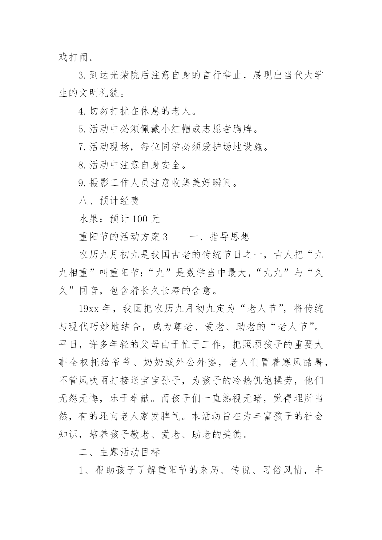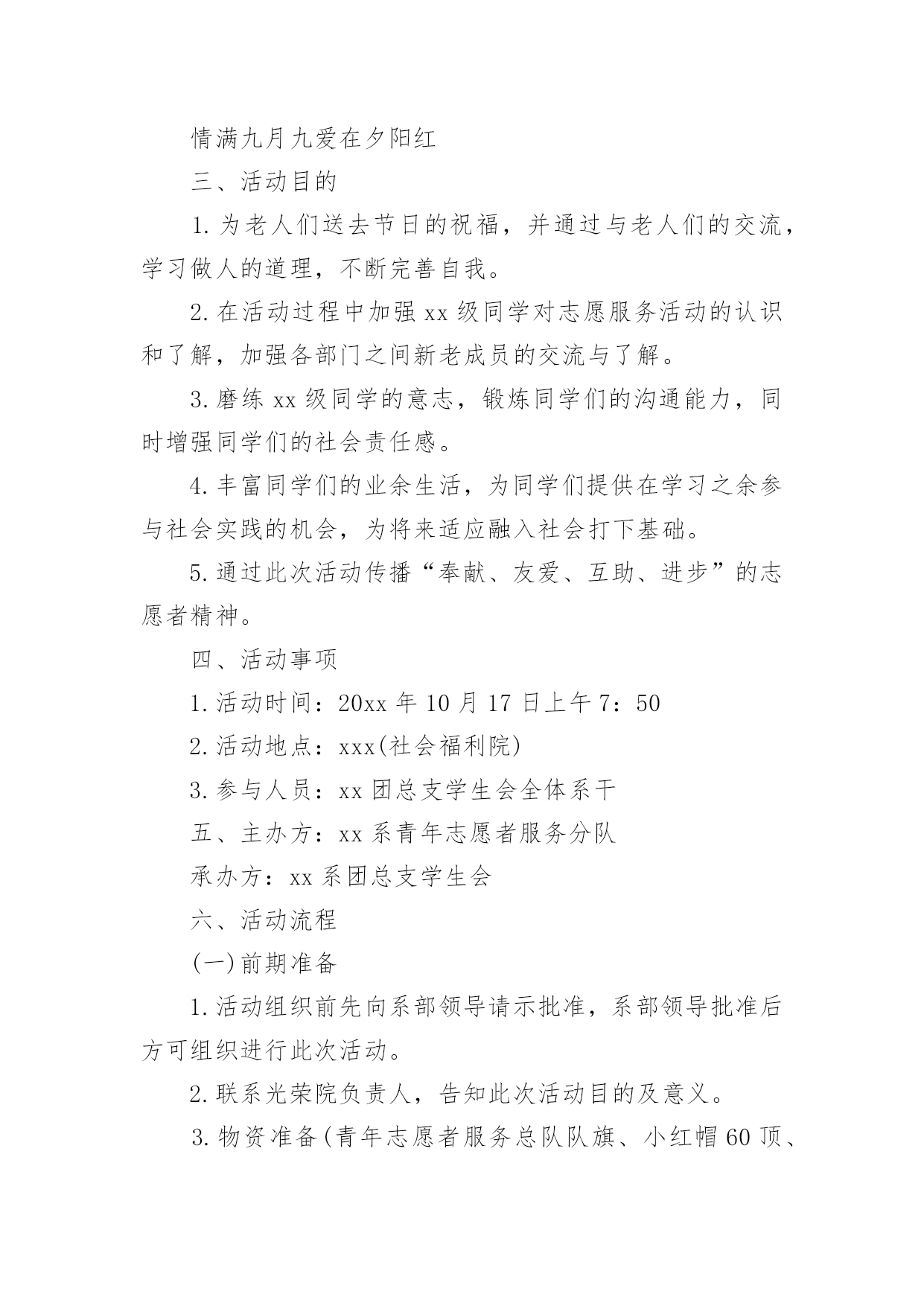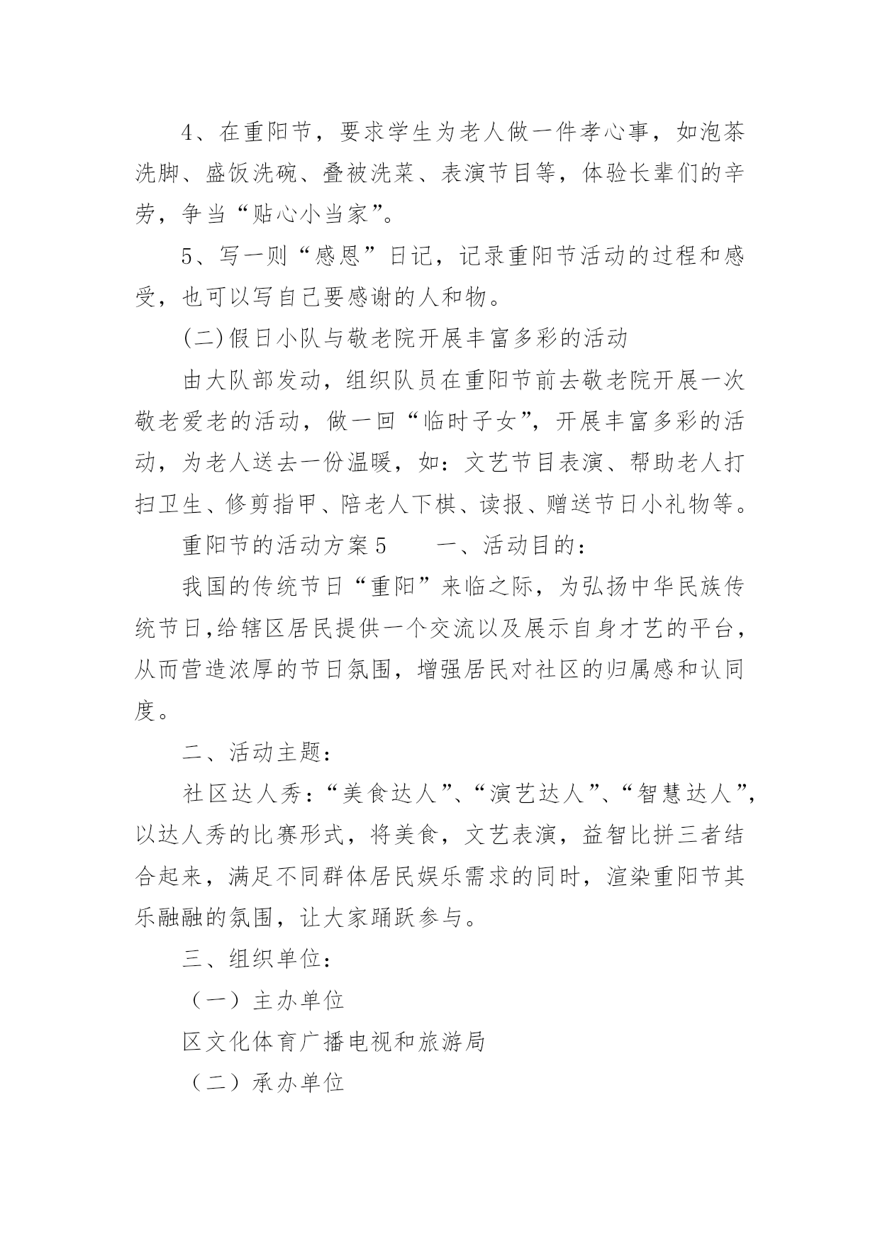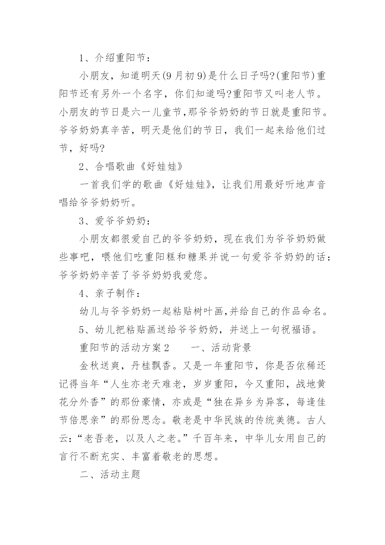 重阳节的活动方案关于重阳节的活动方案(通用5篇)为了确保活动扎实开展,常常需要提前准备一份具体、详细、针对性强的活动方案,活动方案是从活动的目的、要求、方式、方法、进度等方面进行安排的书面计划。怎样写活动方案才更能起到其作用呢?下面是小编为大家收集的重阳节的活动方案(通用5篇),欢迎阅读,希望大家能够喜欢。重阳节的活动方案1设计意图:金秋时节,重阳已至,中国的传统节日重阳节。是一个登高望远、品糕登高的日子,是一个属于敬老爱老的日子,我们中班的孩子们邀请了自己的爷爷奶奶、外公外婆来到幼儿园,开展了一次丰富多彩的九九重阳亲子活动,为老人送上自己的美好祝福。活动目标:1、初步了解重阳节是爷爷奶奶的节日。2、使幼儿从小有关心爷爷奶奶的意识,为爷爷奶奶做力所能及的事。3、与爷爷奶奶们一起操作粘贴画,体验亲子间欢乐气氛。活动准备:糖果、重阳糕、各种树叶、胶水等活动过程:1、介绍重阳节:小朋友,知道明天(9月初9)是什么日子吗?(重阳节)重阳节还有另外一个名字,你们知道吗?重阳节又叫老人节。小朋友的节日是六一儿童节,那爷爷奶奶的节日就是重阳节。爷爷奶奶真辛苦,明天是他们的节日,我们一起来给他们过节,好吗?2、合唱歌曲《好娃娃》一首我们学的歌曲《好娃娃》,让我们用最好听地声音唱给爷爷奶奶听。3、爱爷爷奶奶:小朋友都很爱自己的爷爷奶奶,现在我们为爷爷奶奶做些事吧,喂他们吃重阳糕和糖果并说一句爱爷爷奶奶的话:爷爷奶奶辛苦了爷爷奶奶我爱您。4、亲子制作:幼儿与爷爷奶奶一起粘贴树叶画,并给自己的作品命名。5、幼儿把粘贴画送给爷爷奶奶,并送上一句祝福语。重阳节的活动方案2一、活动背景金秋送爽,丹桂飘香。又是一年重阳节,你是否依稀还记得当年“人生亦老天难老,岁岁重阳,今又重阳,战地黄花分外香”的那份豪情,亦或是“独在异乡为异客,每逢佳节倍思亲”的那份思念。敬老是中华民族的传统美德。古人云:“老吾老,以及人之老。”千百年来,中华儿女用自己的言行不断充实、丰富着敬老的思想。二、活动主题情满九月九爱在夕阳红三、活动目的1.为老人们送去节日的祝福,并通过与老人们的交流,学习做人的道理,不断完善自我。2.在活动过程中加强xx级同学对志愿服务活动的认识和了解,加强各部门之间新老成员的交流与了解。3.磨练xx级同学的意志,锻炼同学们的沟通能力,同时增强同学们的社会责任感。4.丰富同学们的业余生活,为同学们提供在学习之余参与社会实践的机会,为将来适应融入社会打下基础。5.通过此次活动传播“奉献、友爱、互助、进步”的志愿者精神。四、活动事项1.活动时间:20xx年10月17日上午7:502.活动地点:xxx(社会福利院)3.参与人员:xx团总支学生会全体系干五、主办方:xx系青年志愿者服务分队承办方:xx系团总支学生会六、活动流程(一)前期准备1.活动组织前先向系部领导请示批准,系部领导批准后方可组织进行此次活动。2.联系光荣院负责人,告知此次活动目的及意义。3.物资准备(青年志愿者服务总队队旗、小红帽60顶、志愿者胸牌60个、抹布若干、相机一台、水果)4.由宣传部负责制作两张海报,用于宣传此次活动。5.由文艺部计划好活动中的节目安排。(二)中期安排1.9月24日上午7:50全体参与人员在灯光篮球场集合,各部门负责人点到,分派小红帽、志愿者胸牌。2.8:00按设定路线出发前去光荣院。3.9:00左右到达目的地后与光荣院负责人会面,并分配任务。4.分多组人,每组人进行一对一形式服务负责该老人的房间卫生,陪老人聊天。5.剩下的同学分五组分别打扫光荣院各区域的卫生。6.卫生工作做完后,将老人们带到院子,由文艺部安排节目演出。7.至11:40左右,将老人们送去食堂吃饭,然后在光荣院门口集合清点人数。8.将所有工具回收,收队回校。(三)活动后期1.参与同学在一周内将活动心得交给各部门部长。2.出活动后期宣传板。七、活动事项1.参与人员严格遵守纪律,活动过程中不允许中途无故离开,有事请假。2.绝对服从各部门部长及带队安排,不允许在行程中嬉戏打闹。3.到达光荣院后注意自身的言行举止,展现出当代大学生的文明礼貌。4.切勿打扰在休息的老人。5.活动中必须佩戴小红帽或志愿者胸牌。7.活动现场,每位同学必须爱护场地设施。8.活动中注意自身安全。9.摄影工作人员注意收集美好瞬间。八、预计经费水果:预计100元重阳节的活动方案3一、指导思想农历九月初九是我国古老的传统节日之一,古人把“九九相重”叫重阳节;“九”是数学当中最大,“九九”与“久久”同音,包含着长久长寿的含意。19xx年,我国把农历九月初九定为“老人节”,将传统与现代巧妙地结合,成为尊老、爱老、助老的“老人节”。平日,许多年轻的父母由于忙于工作,把照顾孩子的重要大事全权托给爷爷、奶奶或外公外婆,老人们冒着寒风酷暑,不管风吹雨打接送宝