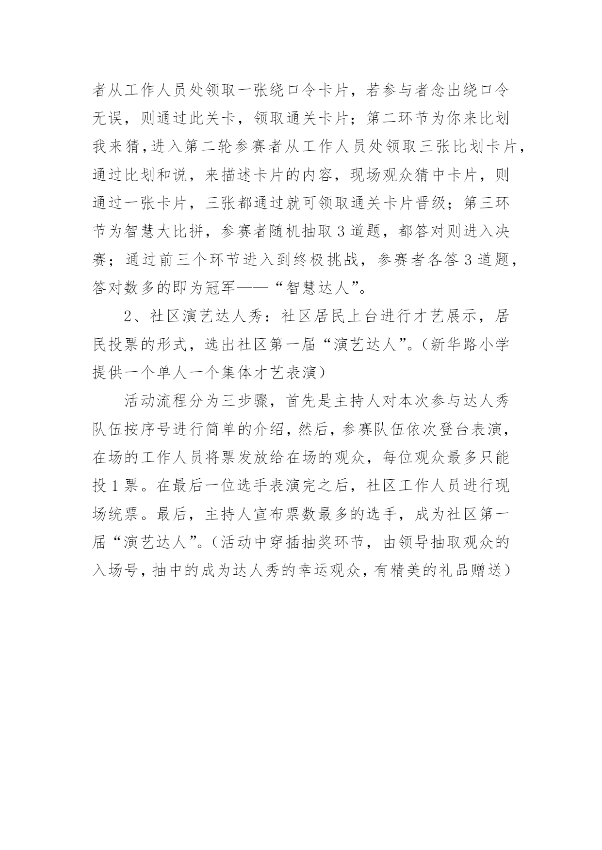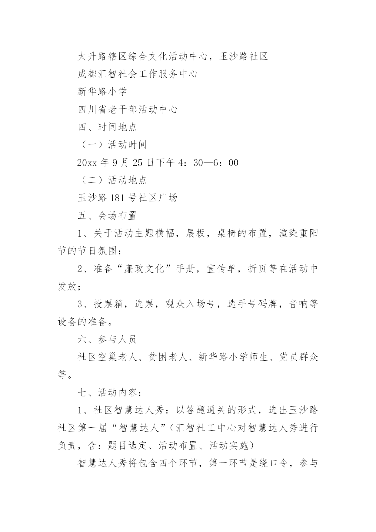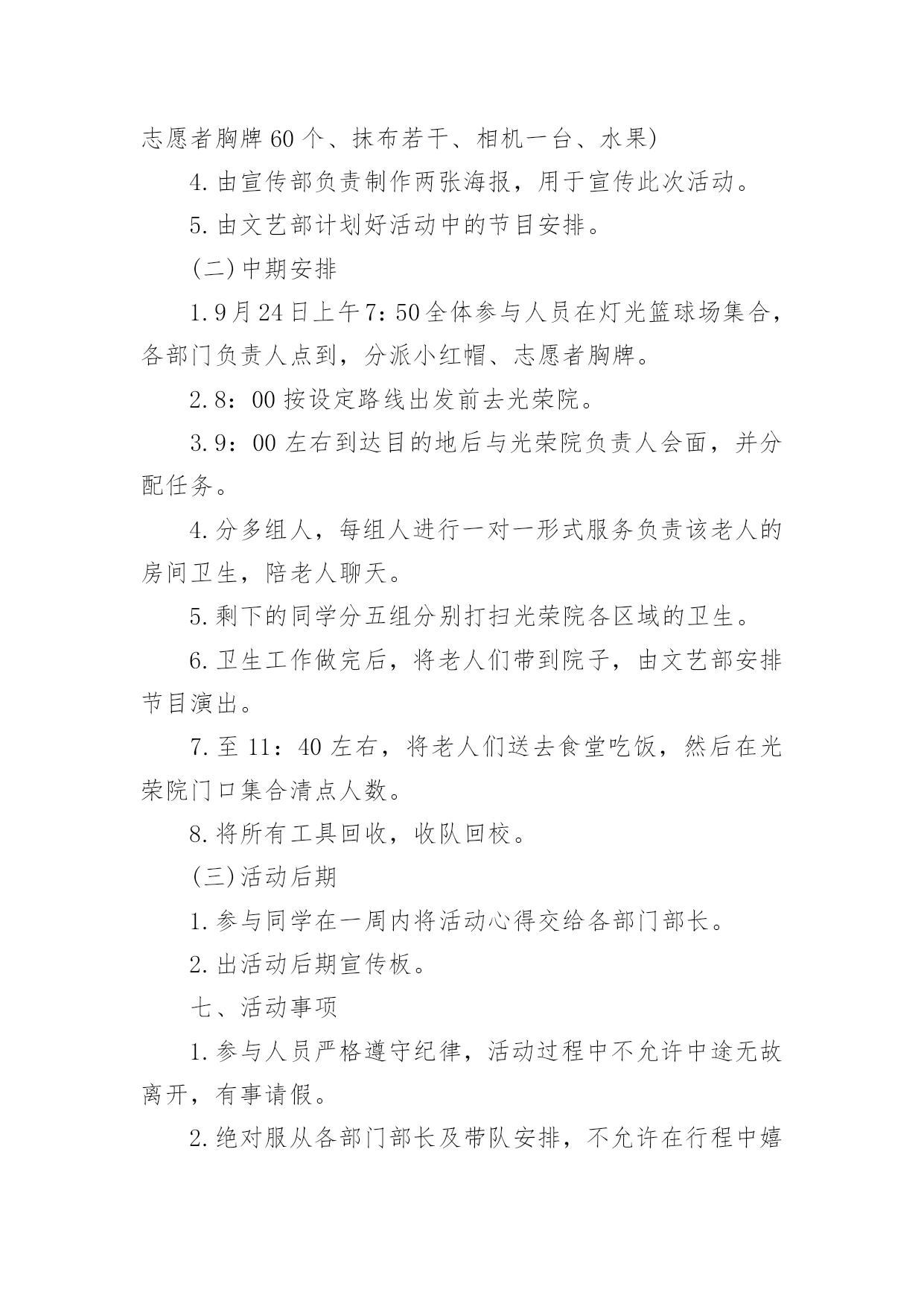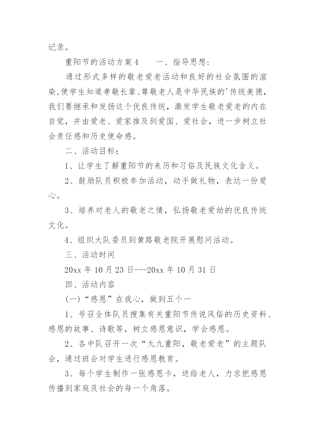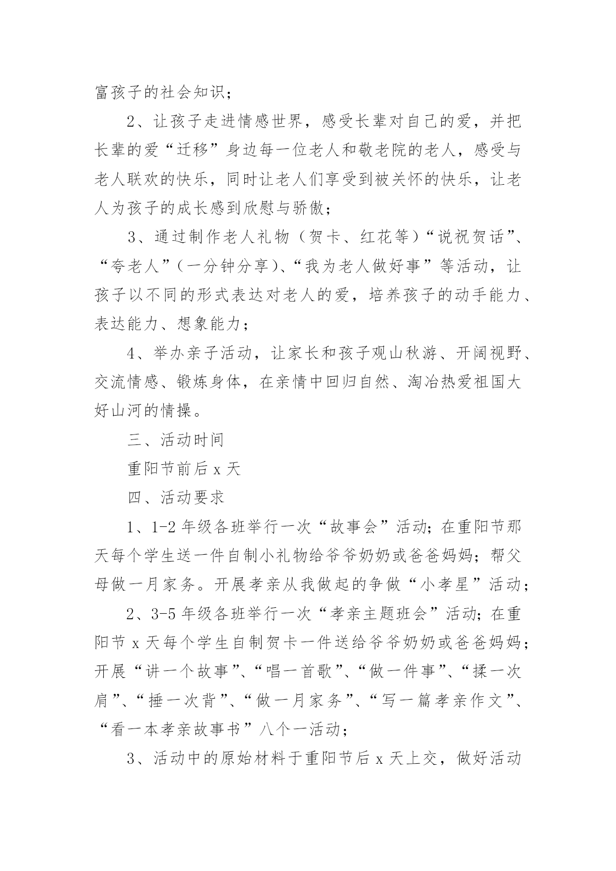重阳节的活动方案关于重阳节的活动方案(通用5篇)为了确保活动扎实开展,常常需要提前准备一份具体、详细、针对性强的活动方案,活动方案是从活动的目的、要求、方式、方法、进度等方面进行安排的书面计划。怎样写活动方案才更能起到其作用呢?下面是小编为大家收集的重阳节的活动方案(通用5篇),欢迎阅读,希望大家能够喜欢。重阳节的活动方案1设计意图:金秋时节,重阳已至,中国的传统节日重阳节。是一个登高望远、品糕登高的日子,是一个属于敬老爱老的日子,我们中班的孩子们邀请了自己的爷爷奶奶、外公外婆来到幼儿园,开展了一次丰富多彩的九九重阳亲子活动,为老人送上自己的美好祝福。活动目标:1、初步了解重阳节是爷爷奶奶的节日。2、使幼儿从小有关心爷爷奶奶的意识,为爷爷奶奶做力所能及的事。3、与爷爷奶奶们一起操作粘贴画,体验亲子间欢乐气氛。活动准备:糖果、重阳糕、各种树叶、胶水等活动过程:1、介绍重阳节:小朋友,知道明天(9月初9)是什么日子吗?(重阳节)重阳节还有另外一个名字,你们知道吗?重阳节又叫老人节。小朋友的节日是六一儿童节,那爷爷奶奶的节日就是重阳节。爷爷奶奶真辛苦,明天是他们的节日,我们一起来给他们过节,好吗?2、合唱歌曲《好娃娃》一首我们学的歌曲《好娃娃》,让我们用最好听地声音唱给爷爷奶奶听。3、爱爷爷奶奶:小朋友都很爱自己的爷爷奶奶,现在我们为爷爷奶奶做些事吧,喂他们吃重阳糕和糖果并说一句爱爷爷奶奶的话:爷爷奶奶辛苦了爷爷奶奶我爱您。4、亲子制作:幼儿与爷爷奶奶一起粘贴树叶画,并给自己的作品命名。5、幼儿把粘贴画送给爷爷奶奶,并送上一句祝福语。重阳节的活动方案2一、活动背景金秋送爽,丹桂飘香。又是一年重阳节,你是否依稀还记得当年“人生亦老天难老,岁岁重阳,今又重阳,战地黄花分外香”的那份豪情,亦或是“独在异乡为异客,每逢佳节倍思亲”的那份思念。敬老是中华民族的传统美德。古人云:“老吾老,以及人之老。”千百年来,中华儿女用自己的言行不断充实、丰富着敬老的思想。二、活动主题情满九月九爱在夕阳红三、活动目的1.为老人们送去节日的祝福,并通过与老人们的交流,学习做人的道理,不断完善自我。2.在活动过程中加强xx级同学对志愿服务活动的认识和了解,加强各部门之间新老成员的交流与了解。3.磨练xx级同学的意志,锻炼同学们的沟通能力,同时增强同学们的社会责任感。4.丰富同学们的业余生活,为同学们提供在学习之余参与社会实践的机会,为将来适应融入社会打下基础。5.通过此次活动传播“奉献、友爱、互助、进步”的志愿者精神。四、活动事项1.活动时间:20xx年10月17日上午7:502.活动地点:xxx(社会福利院)3.参与人员:xx团总支学生会全体系干五、主办方:xx系青年志愿者服务分队承办方:xx系团总支学生会六、活动流程(一)前期准备1.活动组织前先向系部领导请示批准,系部领导批准后方可组织进行此次活动。2.联系光荣院负责人,告知此次活动目的及意义。3.物资准备(青年志愿者服务总队队旗、小红帽60顶、志愿者胸牌60个、抹布若干、相机一台、水果)4.由宣传部负责制作两张海报,用于宣传此次活动。5.由文艺部计划好活动中的节目安排。(二)中期安排1.9月24日上午7:50全体参与人员在灯光篮球场集合,各部门负责人点到,分派小红帽、志愿者胸牌。2.8:00按设定路线出发前去光荣院。3.9:00左右到达目的地后与光荣院负责人会面,并分配任务。4.分多组人,每组人进行一对一形式服务负责该老人的房间卫生,陪老人聊天。5.剩下的同学分五组分别打扫光荣院各区域的卫生。6.卫生工作做完后,将老人们带到院子,由文艺部安排节目演出。7.至11:40左右,将老人们送去食堂吃饭,然后在光荣院门口集合清点人数。8.将所有工具回收,收队回校。(三)活动后期1.参与同学在一周内将活动心得交给各部门部长。2.出活动后期宣传板。七、活动事项1.参与人员严格遵守纪律,活动过程中不允许中途无故离开,有事请假。2.绝对服从各部门部长及带队安排,不允许在行程中嬉戏打闹。3.到达光荣院后注意自身的言行举止,展现出当代大学生的文明礼貌。4.切勿打扰在休息的老人。5.活动中必须佩戴小红帽或志愿者胸牌。7.活动现场,每位同学必须爱护场地设施。8.活动中注意自身安全。9.摄影工作人员注意收集美好瞬间。八、预计经费水果:预计100元重阳节的活动方案3一、指导思想农历九月初九是我国古老的传统节日之一,古人把“九九相重”叫重阳节;“九”是数学当中最大,“九九”与“久久”同音,包含着长久长寿的含意。19xx年,我国把农历九月初九定为“老人节”,将传统与现代巧妙地结合,成为尊老、爱老、助老的“老人节”。平日,许多年轻的父母由于忙于工作,把照顾孩子的重要大事全权托给爷爷、奶奶或外公外婆,老人们冒着寒风酷暑,不管风吹雨打接送宝