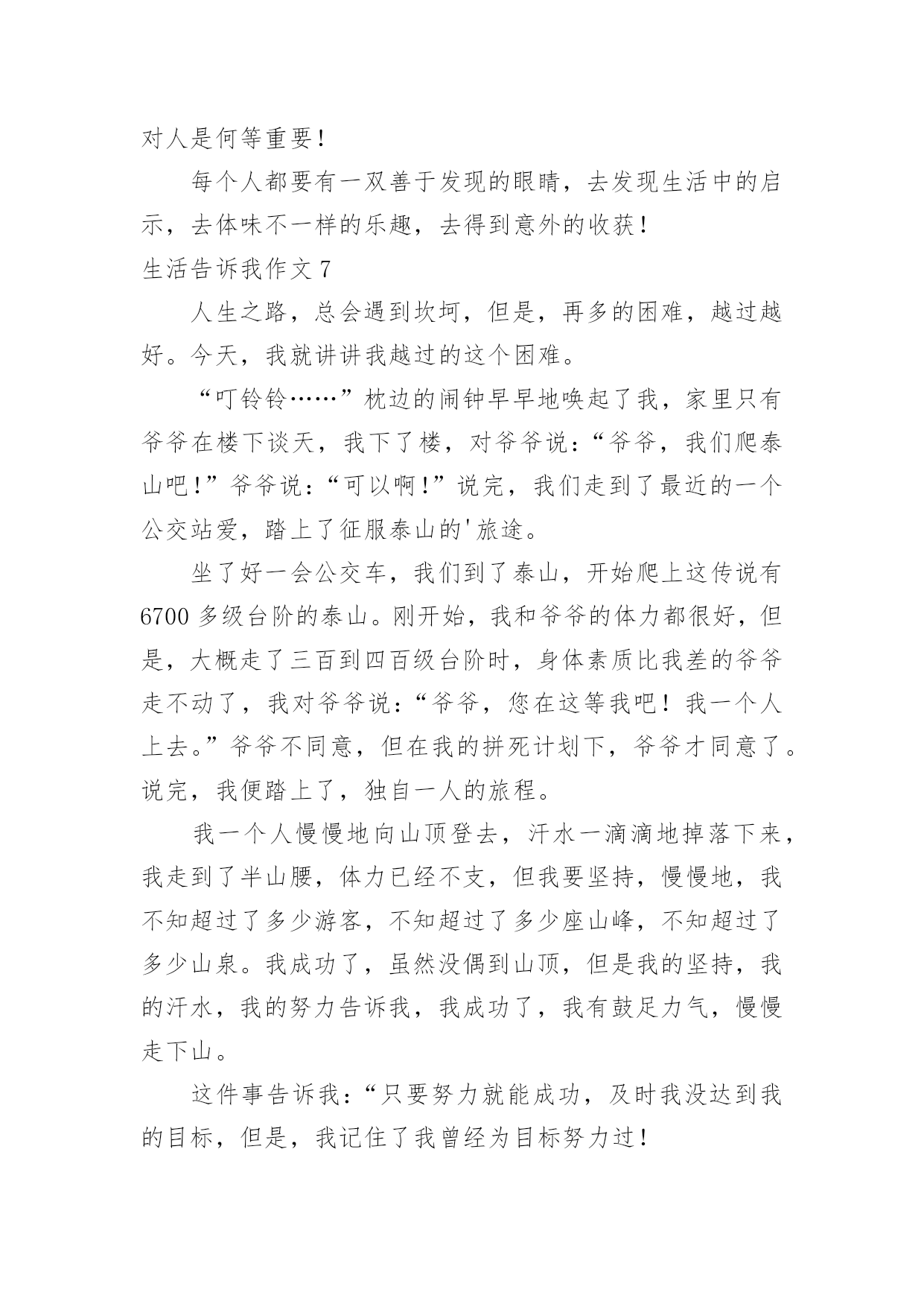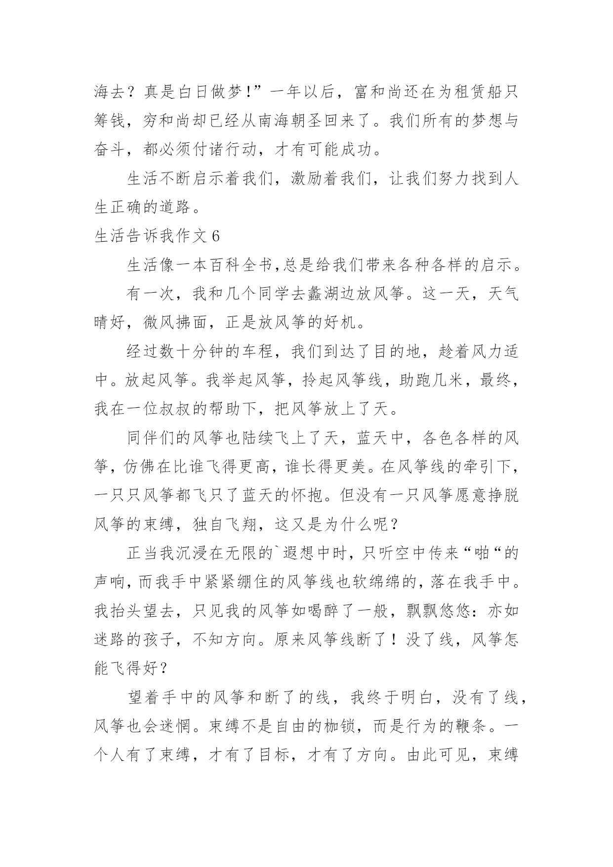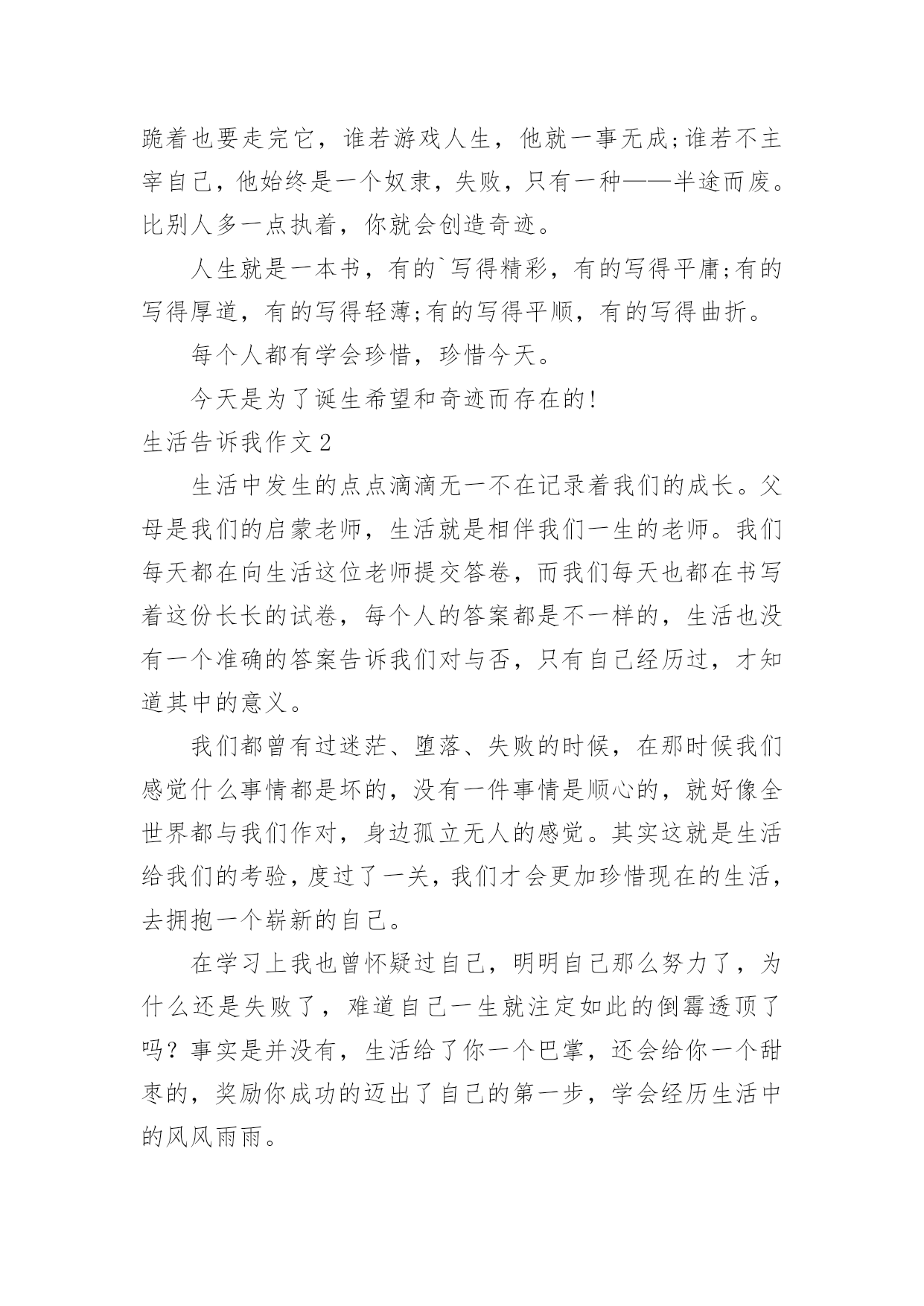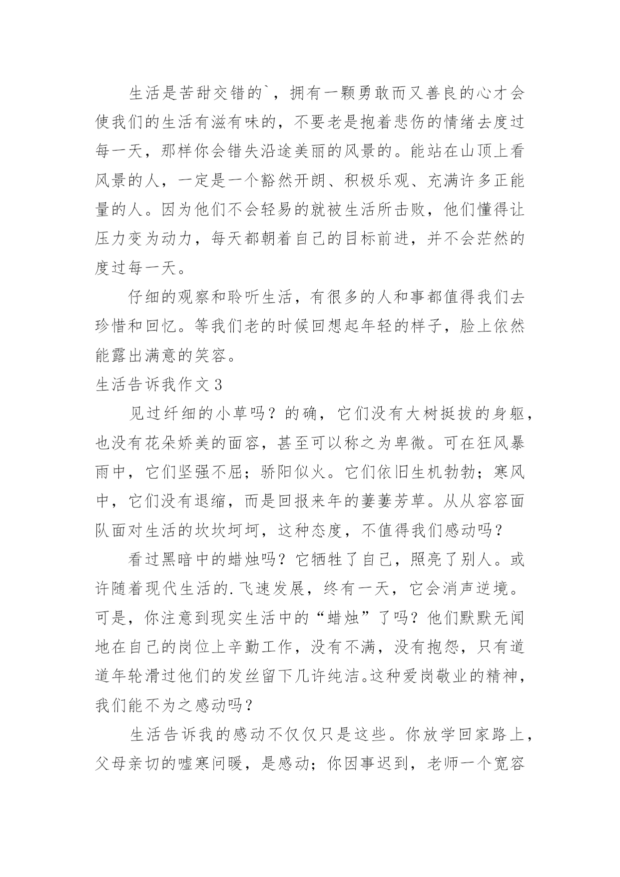 生活告诉我作文(通用)生活告诉我作文15篇在学习、工作、生活中,大家对作文都不陌生吧,作文是通过文字来表达一个主题意义的记叙方法。相信写作文是一个让许多人都头痛的问题,下面是小编为大家收集的生活告诉我作文,希望能够帮助到大家。生活告诉我作文1生活中,生活告诉我不少东西,对此,我也学会不少东西。珍惜,是至关重要的。从前,无论做什么事,我都是“明日复明日”最终只有“万事成蹉跎”。而生活告诉我:时间就是生命。我学会珍惜时间,从此今天事今天完。也正是生活早告诉我:今天是昨天的继续,又是明天的基础。因此,它具有无比重要的作用。昨天是冰封记忆的一本书,而今天是书写人生的一页纸。“男儿不展风云志,空负天生八尺躯。”树立理想,也是至关重要的。理想是石,敲出星星之火,任何人都在为自己的理想而奋斗。如果我们盼望明天,那必须先脚踏实地;如果我们盼望辉煌,那么我们必须脚不停步。成功不会向我们走来,我们必须走向胜利;智慧不会向我们走来,我们必须勤奋求索。奋斗是万物之父。今天就是生命。是你唯一能确知的生命。自己选择的路,跪着也要走完它,谁若游戏人生,他就一事无成;谁若不主宰自己,他始终是一个奴隶,失败,只有一种——半途而废。比别人多一点执着,你就会创造奇迹。人生就是一本书,有的`写得精彩,有的写得平庸;有的写得厚道,有的写得轻薄;有的写得平顺,有的写得曲折。每个人都有学会珍惜,珍惜今天。今天是为了诞生希望和奇迹而存在的!生活告诉我作文2生活中发生的点点滴滴无一不在记录着我们的成长。父母是我们的启蒙老师,生活就是相伴我们一生的老师。我们每天都在向生活这位老师提交答卷,而我们每天也都在书写着这份长长的试卷,每个人的答案都是不一样的,生活也没有一个准确的答案告诉我们对与否,只有自己经历过,才知道其中的意义。我们都曾有过迷茫、堕落、失败的时候,在那时候我们感觉什么事情都是坏的,没有一件事情是顺心的,就好像全世界都与我们作对,身边孤立无人的感觉。其实这就是生活给我们的考验,度过了一关,我们才会更加珍惜现在的生活,去拥抱一个崭新的自己。在学习上我也曾怀疑过自己,明明自己那么努力了,为什么还是失败了,难道自己一生就注定如此的倒霉透顶了吗?事实是并没有,生活给了你一个巴掌,还会给你一个甜枣的,奖励你成功的迈出了自己的第一步,学会经历生活中的风风雨雨。生活是苦甜交错的`,拥有一颗勇敢而又善良的心才会使我们的生活有滋有味的,不要老是抱着悲伤的情绪去度过每一天,那样你会错失沿途美丽的风景的。能站在山顶上看风景的人,一定是一个豁然开朗、积极乐观、充满许多正能量的人。因为他们不会轻易的就被生活所击败,他们懂得让压力变为动力,每天都朝着自己的目标前进,并不会茫然的度过每一天。仔细的观察和聆听生活,有很多的人和事都值得我们去珍惜和回忆。等我们老的时候回想起年轻的样子,脸上依然能露出满意的笑容。生活告诉我作文3见过纤细的小草吗?的确,它们没有大树挺拔的身躯,也没有花朵娇美的面容,甚至可以称之为卑微。可在狂风暴雨中,它们坚强不屈;骄阳似火。它们依旧生机勃勃;寒风中,它们没有退缩,而是回报来年的萋萋芳草。从从容容面队面对生活的坎坎坷坷,这种态度,不值得我们感动吗?看过黑暗中的蜡烛吗?它牺牲了自己,照亮了别人。或许随着现代生活的.飞速发展,终有一天,它会消声逆境。可是,你注意到现实生活中的“蜡烛”了吗?他们默默无闻地在自己的岗位上辛勤工作,没有不满,没有抱怨,只有道道年轮滑过他们的发丝留下几许纯洁。这种爱岗敬业的精神,我们能不为之感动吗?生活告诉我的感动不仅仅只是这些。你放学回家路上,父母亲切的嘘寒问暖,是感动;你因事迟到,老师一个宽容的微笑,是感动;聚会上,看到昔日的同学,是感动……我们不需要腰缠万贯的感动,我们需要的只是人与人之间的真诚沟通。只要我们心存感动,在感动别人的同时也感动自己。我们在感动中快乐,在快乐中净化自己的心灵。生活告诉我作文4当我来到这个世界时,我的生活就开始了。我从小不点长大成人,经历了很多的事,这些事中有痛苦的,有快乐的,有使人深思的……在成长的历程中,这些事的磨练对我们来说是相当重要的,因为生活经历能告诉我们一些道理。当我在痛苦中挣扎时,生活告诉我要勇敢的战胜它,把它压在脚下。当我倒下时,正沮丧,生活告诉我,在那儿倒下就要在那儿站起来。当我取得成功快乐时,生活告诉我,不要忘了困难的时候,不要取得点成绩就骄傲自满,要努力奋斗,更上一层楼。记得我刚来这儿读书时,心情沉重,学什么也学不好,我都想放弃了,后来,我在生活中感悟到了,困难只是暂时的,就看你有没有决心、勇气去战胜它,去挑战它。于是我重新调整心态,积极面对我的初中生活,快乐的与同学相处,努力学好每一门科目。现在我已融入86班这个集体中,成为允捧中学的一份子。有时,我们会听到别人轻生的消息,这时我总是替他们不值