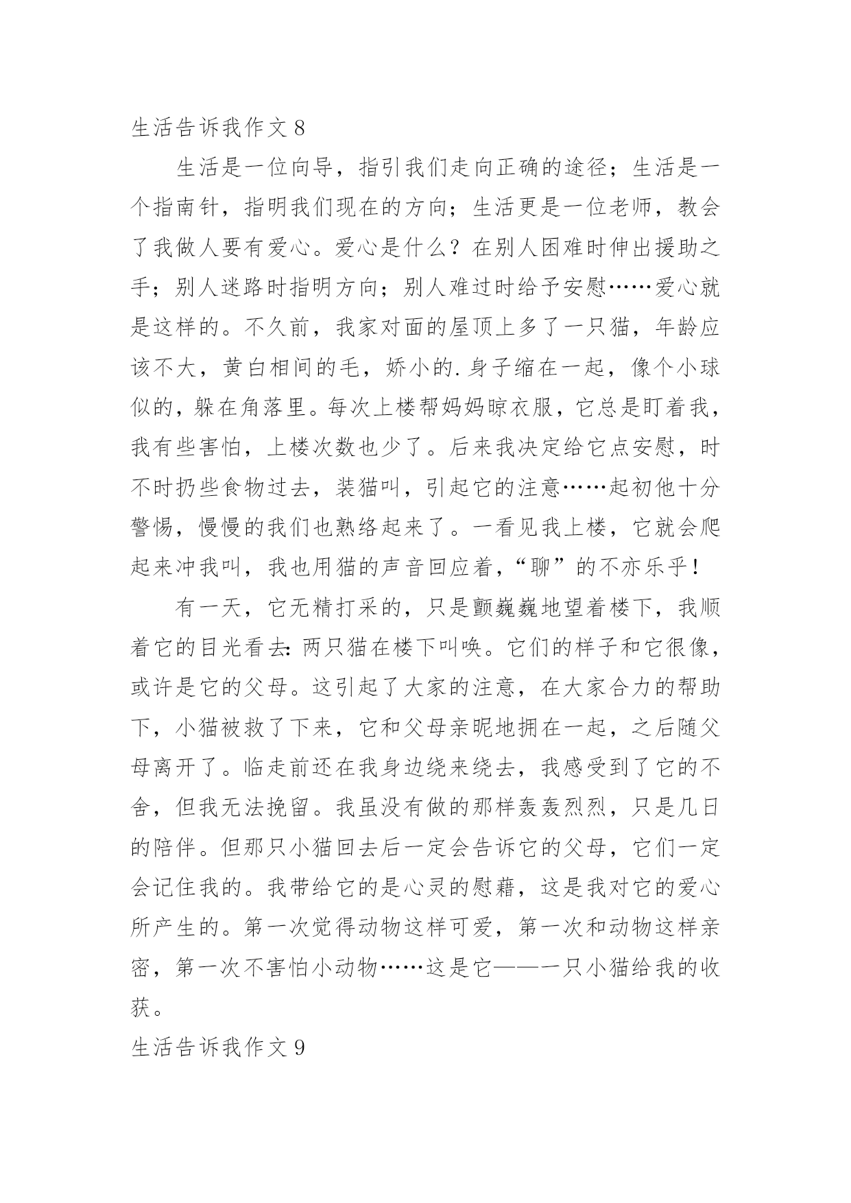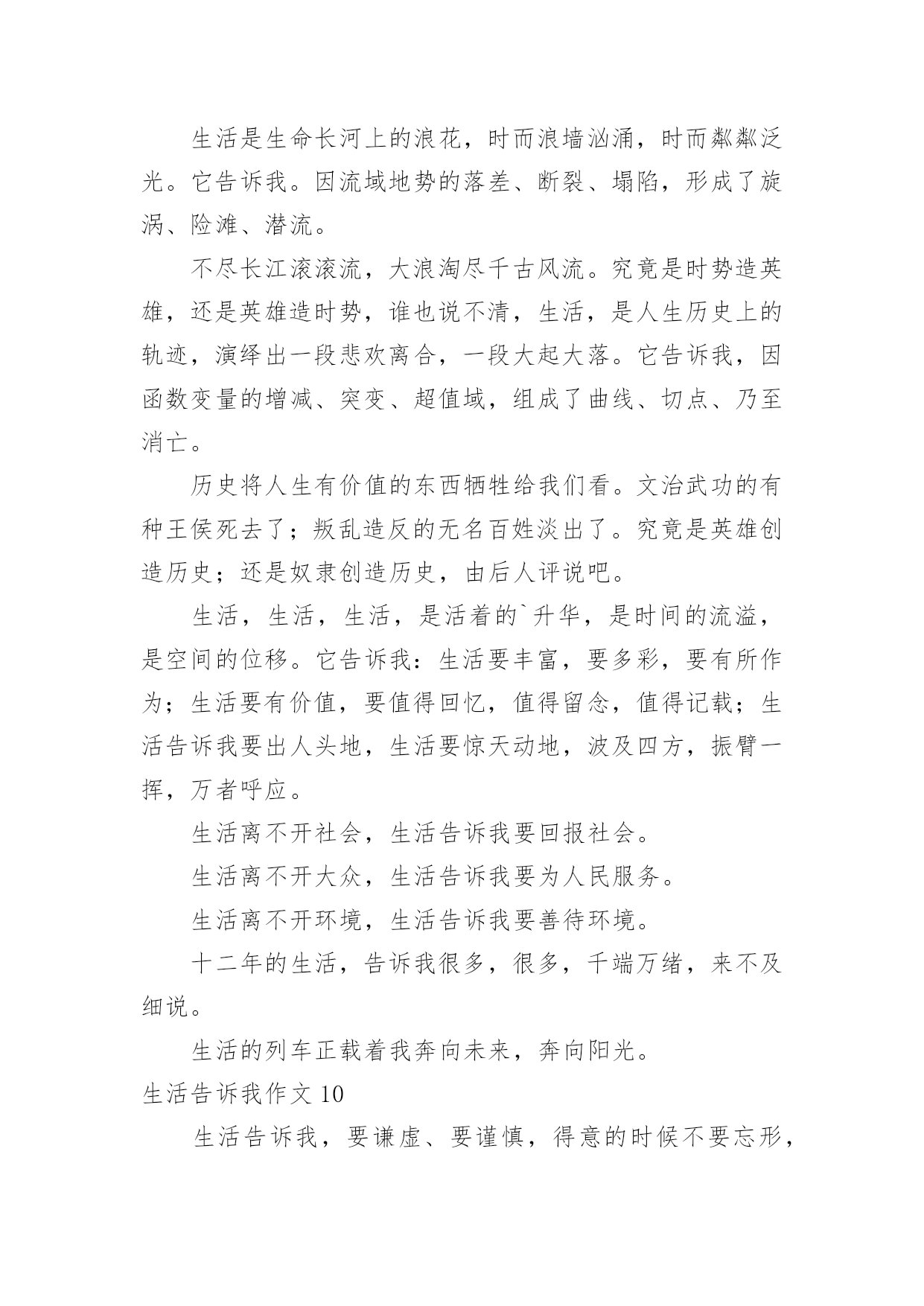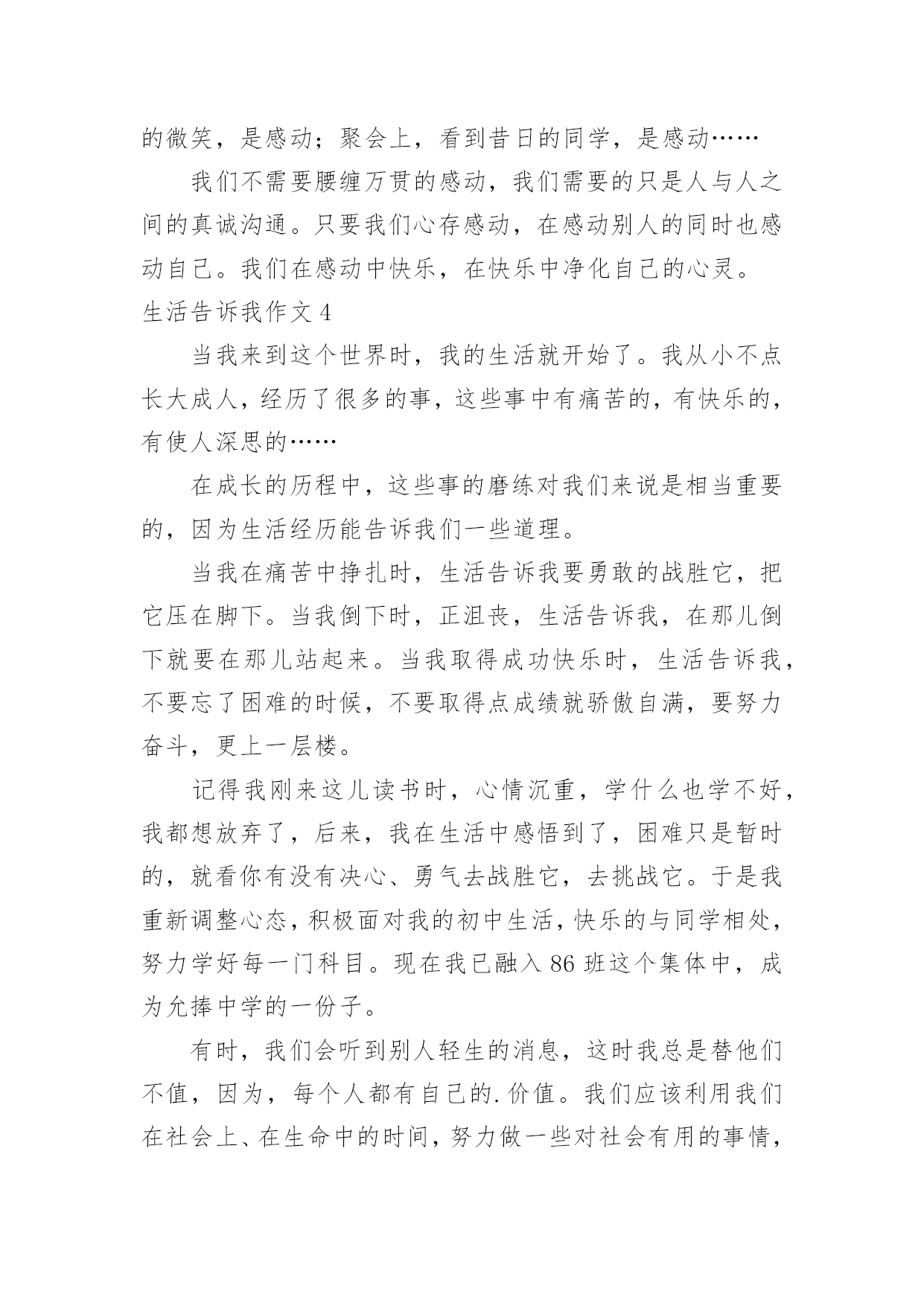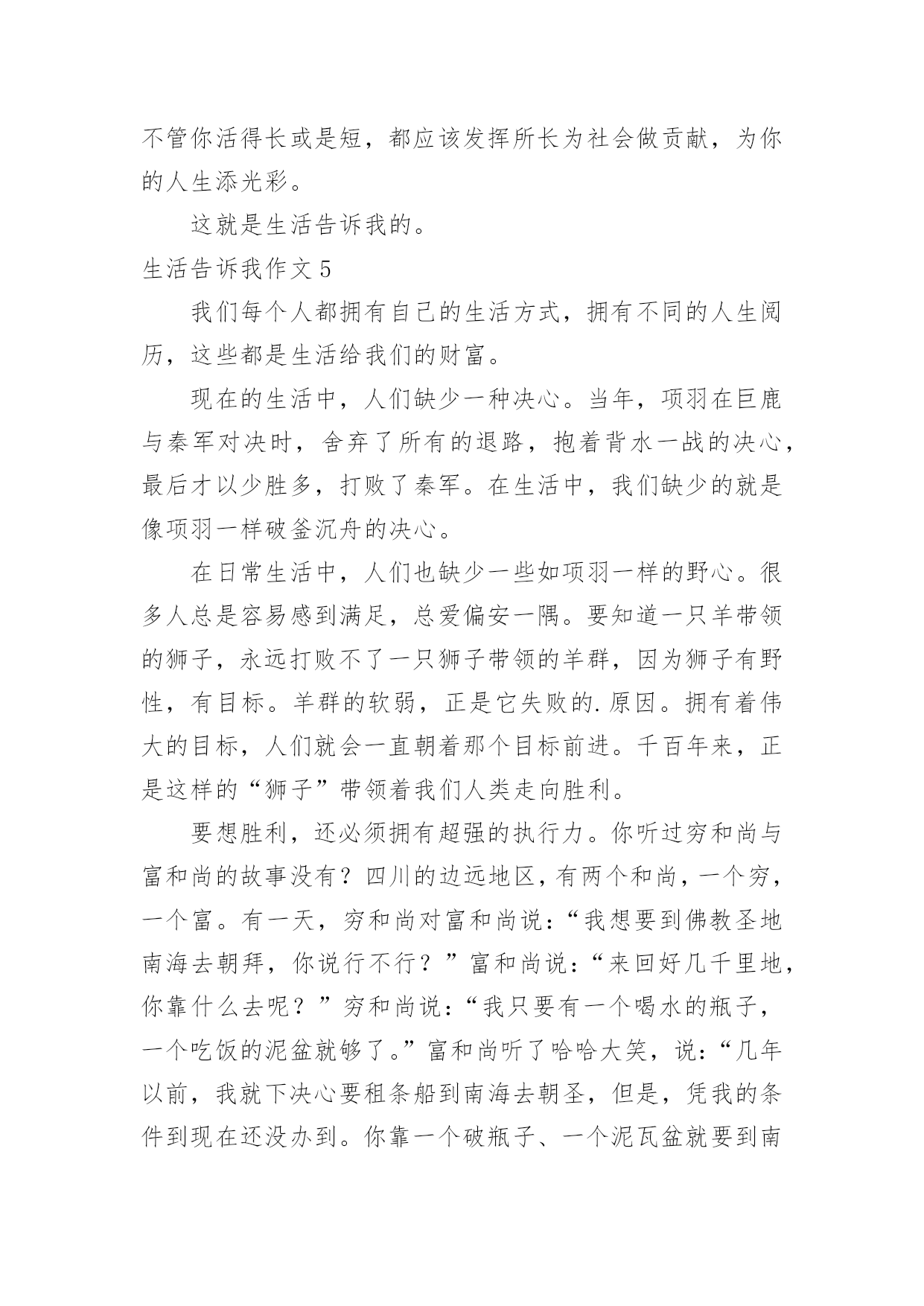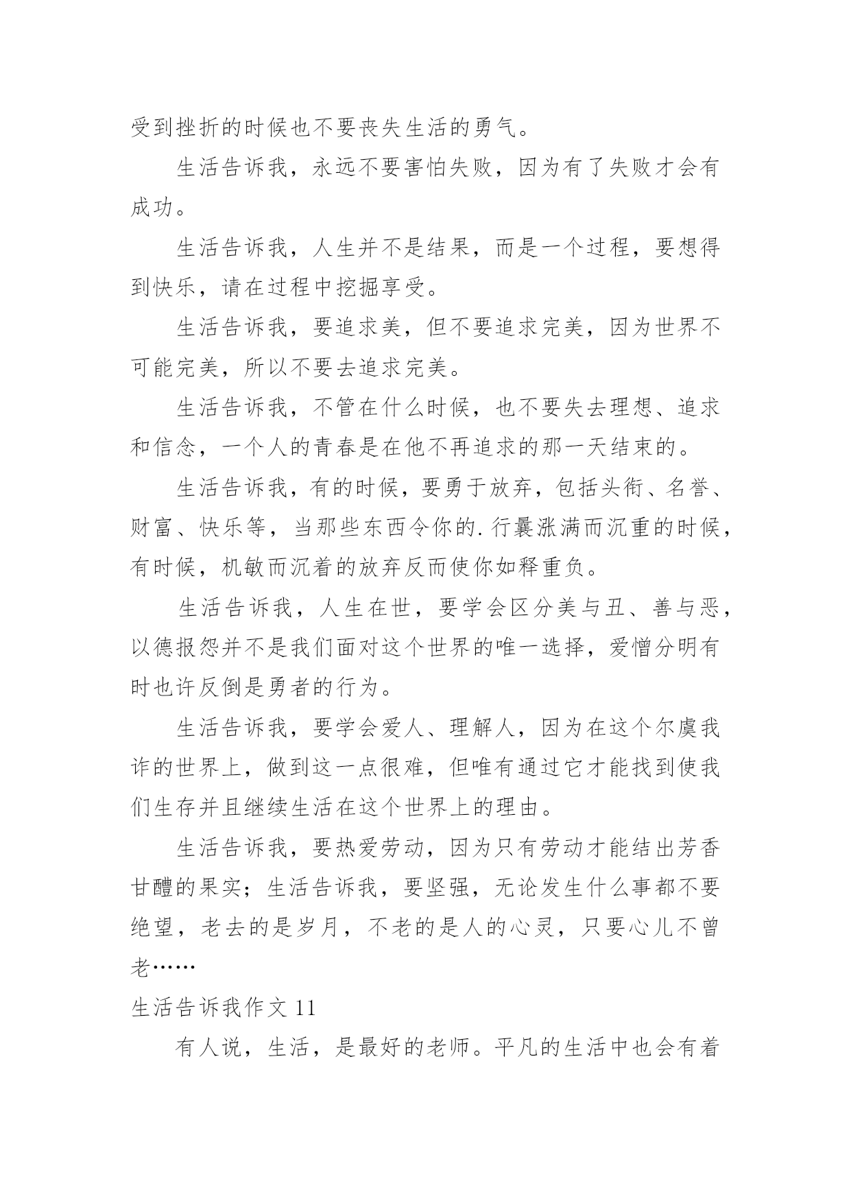 生活告诉我作文(通用)生活告诉我作文15篇在学习、工作、生活中,大家对作文都不陌生吧,作文是通过文字来表达一个主题意义的记叙方法。相信写作文是一个让许多人都头痛的问题,下面是小编为大家收集的生活告诉我作文,希望能够帮助到大家。生活告诉我作文1生活中,生活告诉我不少东西,对此,我也学会不少东西。珍惜,是至关重要的。从前,无论做什么事,我都是“明日复明日”最终只有“万事成蹉跎”。而生活告诉我:时间就是生命。我学会珍惜时间,从此今天事今天完。也正是生活早告诉我:今天是昨天的继续,又是明天的基础。因此,它具有无比重要的作用。昨天是冰封记忆的一本书,而今天是书写人生的一页纸。“男儿不展风云志,空负天生八尺躯。”树立理想,也是至关重要的。理想是石,敲出星星之火,任何人都在为自己的理想而奋斗。如果我们盼望明天,那必须先脚踏实地;如果我们盼望辉煌,那么我们必须脚不停步。成功不会向我们走来,我们必须走向胜利;智慧不会向我们走来,我们必须勤奋求索。奋斗是万物之父。今天就是生命。是你唯一能确知的生命。自己选择的路,跪着也要走完它,谁若游戏人生,他就一事无成;谁若不主宰自己,他始终是一个奴隶,失败,只有一种——半途而废。比别人多一点执着,你就会创造奇迹。人生就是一本书,有的`写得精彩,有的写得平庸;有的写得厚道,有的写得轻薄;有的写得平顺,有的写得曲折。每个人都有学会珍惜,珍惜今天。今天是为了诞生希望和奇迹而存在的!生活告诉我作文2生活中发生的点点滴滴无一不在记录着我们的成长。父母是我们的启蒙老师,生活就是相伴我们一生的老师。我们每天都在向生活这位老师提交答卷,而我们每天也都在书写着这份长长的试卷,每个人的答案都是不一样的,生活也没有一个准确的答案告诉我们对与否,只有自己经历过,才知道其中的意义。我们都曾有过迷茫、堕落、失败的时候,在那时候我们感觉什么事情都是坏的,没有一件事情是顺心的,就好像全世界都与我们作对,身边孤立无人的感觉。其实这就是生活给我们的考验,度过了一关,我们才会更加珍惜现在的生活,去拥抱一个崭新的自己。在学习上我也曾怀疑过自己,明明自己那么努力了,为什么还是失败了,难道自己一生就注定如此的倒霉透顶了吗?事实是并没有,生活给了你一个巴掌,还会给你一个甜枣的,奖励你成功的迈出了自己的第一步,学会经历生活中的风风雨雨。生活是苦甜交错的`,拥有一颗勇敢而又善良的心才会使我们的生活有滋有味的,不要老是抱着悲伤的情绪去度过每一天,那样你会错失沿途美丽的风景的。能站在山顶上看风景的人,一定是一个豁然开朗、积极乐观、充满许多正能量的人。因为他们不会轻易的就被生活所击败,他们懂得让压力变为动力,每天都朝着自己的目标前进,并不会茫然的度过每一天。仔细的观察和聆听生活,有很多的人和事都值得我们去珍惜和回忆。等我们老的时候回想起年轻的样子,脸上依然能露出满意的笑容。生活告诉我作文3见过纤细的小草吗?的确,它们没有大树挺拔的身躯,也没有花朵娇美的面容,甚至可以称之为卑微。可在狂风暴雨中,它们坚强不屈;骄阳似火。它们依旧生机勃勃;寒风中,它们没有退缩,而是回报来年的萋萋芳草。从从容容面队面对生活的坎坎坷坷,这种态度,不值得我们感动吗?看过黑暗中的蜡烛吗?它牺牲了自己,照亮了别人。或许随着现代生活的.飞速发展,终有一天,它会消声逆境。可是,你注意到现实生活中的“蜡烛”了吗?他们默默无闻地在自己的岗位上辛勤工作,没有不满,没有抱怨,只有道道年轮滑过他们的发丝留下几许纯洁。这种爱岗敬业的精神,我们能不为之感动吗?生活告诉我的感动不仅仅只是这些。你放学回家路上,父母亲切的嘘寒问暖,是感动;你因事迟到,老师一个宽容的微笑,是感动;聚会上,看到昔日的同学,是感动……我们不需要腰缠万贯的感动,我们需要的只是人与人之间的真诚沟通。只要我们心存感动,在感动别人的同时也感动自己。我们在感动中快乐,在快乐中净化自己的心灵。生活告诉我作文4当我来到这个世界时,我的生活就开始了。我从小不点长大成人,经历了很多的事,这些事中有痛苦的,有快乐的,有使人深思的……在成长的历程中,这些事的磨练对我们来说是相当重要的,因为生活经历能告诉我们一些道理。当我在痛苦中挣扎时,生活告诉我要勇敢的战胜它,把它压在脚下。当我倒下时,正沮丧,生活告诉我,在那儿倒下就要在那儿站起来。当我取得成功快乐时,生活告诉我,不要忘了困难的时候,不要取得点成绩就骄傲自满,要努力奋斗,更上一层楼。记得我刚来这儿读书时,心情沉重,学什么也学不好,我都想放弃了,后来,我在生活中感悟到了,困难只是暂时的,就看你有没有决心、勇气去战胜它,去挑战它。于是我重新调整心态,积极面对我的初中生活,快乐的与同学相处,努力学好每一门科目。现在我已融入86班这个集体中,成为允捧中学的一份子。有时,我们会听到别人轻生的消息,这时我总是替他们不值