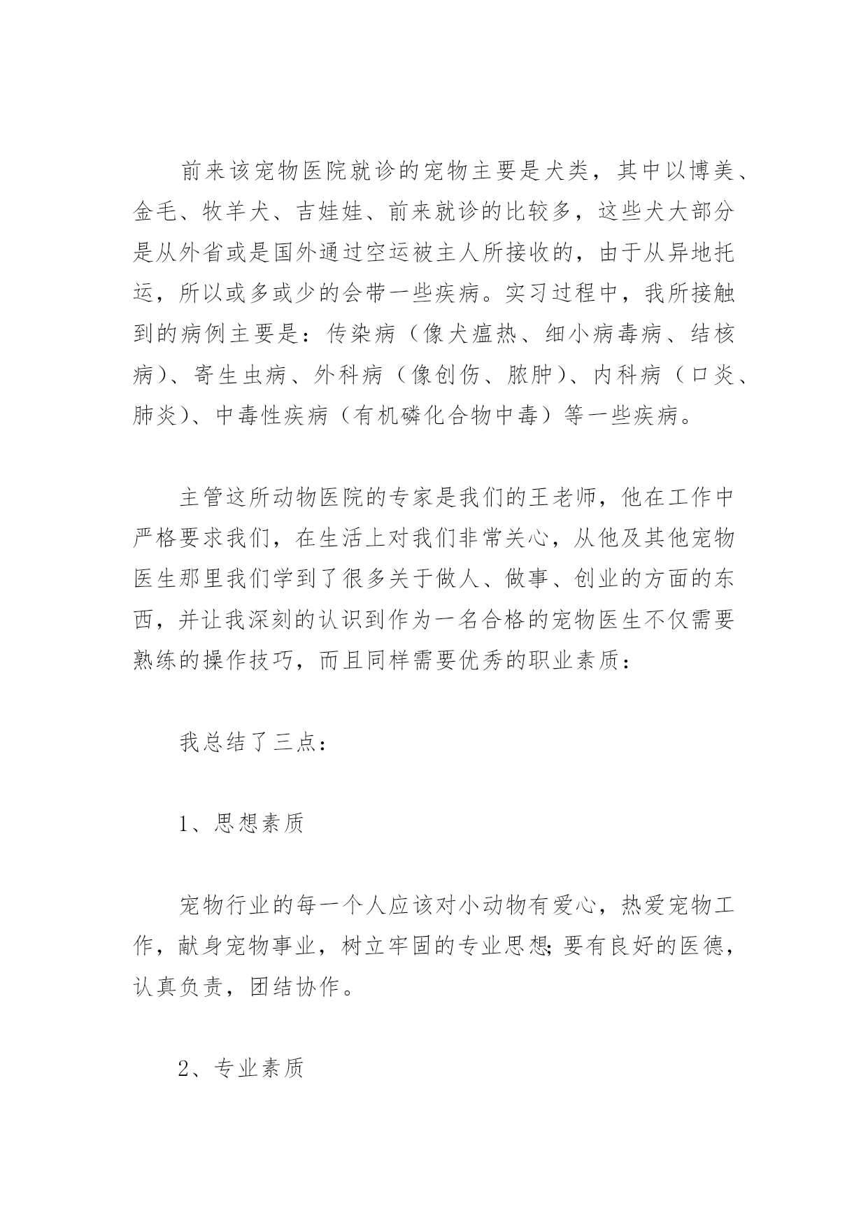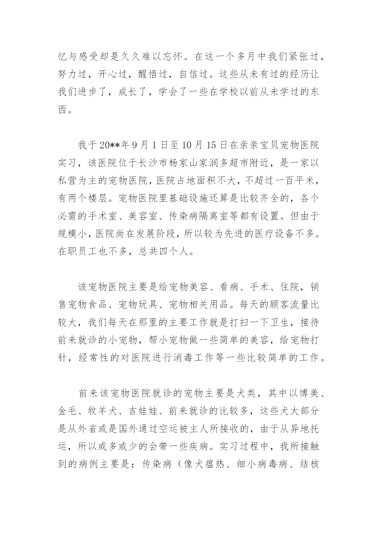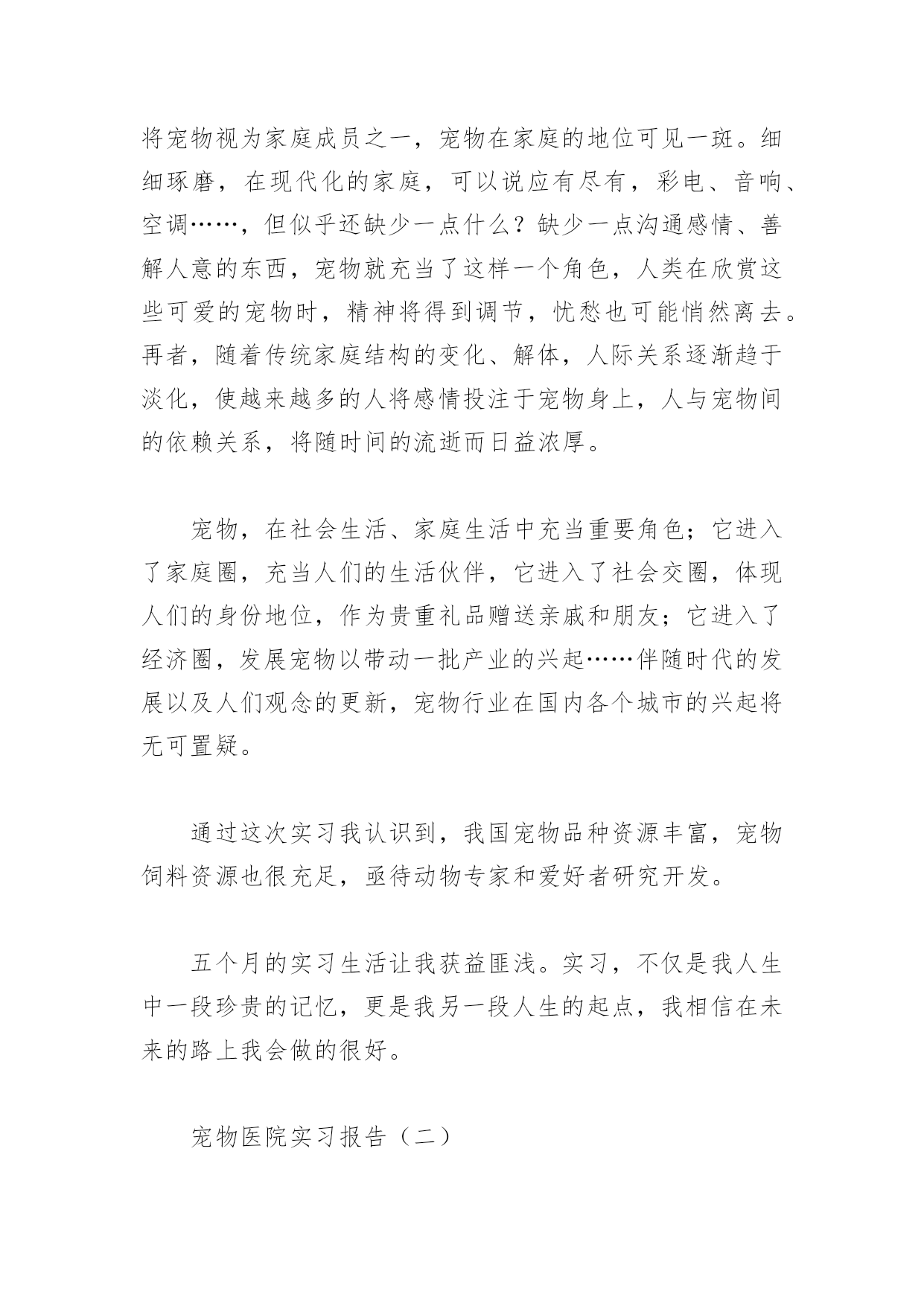 宠物医院实习报告宠物医院实习报告宠物医院实习报告(一)毕业实习工作已经划上了句号,但留在心中的回忆与感受却是久久难以忘怀。在这五个多月中我们紧张过,努力过,开心过,醒悟过,自信过。这些从未有过的经历让我们进步了,成长了,学会了一些在学校以前从未学过的东西。我于20**年12月至2012年5月在吉林农业科技学院附属动物医院实习,该医院位于吉林市重庆路大润发超市附近,是一家以国营为主的宠物医院,医院占地面积不大,不超过一百平米,有两个楼层。宠物医院里基础设施还算是比较齐全的,各个必需的手术室、美容室、传染病隔离室等都有设置。但由于规模小,医院尚在发展阶段,所以较为先进的医疗设备不多。在职员工也不多,总共四个人。该动物医院主要是给宠物美容、看病、手术、住院,销售宠物食品、宠物玩具、宠物相关用品。每天的顾客流量比较大,我们每天在那里的主要工作就是打扫一下卫生,接待前来就诊的小宠物,帮小宠物做一些简单的美容,给宠物打针,经常性的对医院进行消毒工作等一些比较简单的工作。前来该宠物医院就诊的宠物主要是犬类,其中以博美、金毛、牧羊犬、吉娃娃、前来就诊的比较多,这些犬大部分是从外省或是国外通过空运被主人所接收的,由于从异地托运,所以或多或少的会带一些疾病。实习过程中,我所接触到的病例主要是:传染病(像犬瘟热、细小病毒病、结核病)、寄生虫病、外科病(像创伤、脓肿)、内科病(口炎、肺炎)、中毒性疾病(有机磷化合物中毒)等一些疾病。主管这所动物医院的专家是我们的王老师,他在工作中严格要求我们,在生活上对我们非常关心,从他及其他宠物医生那里我们学到了很多关于做人、做事、创业的方面的东西,并让我深刻的认识到作为一名合格的宠物医生不仅需要熟练的操作技巧,而且同样需要优秀的职业素质:我总结了三点:1、思想素质宠物行业的每一个人应该对小动物有爱心,热爱宠物工作,献身宠物事业,树立牢固的专业思想;要有良好的医德,认真负责,团结协作。2、专业素质对顾客要态度诚恳,和蔼热情,关心体贴,掌握宠物的心理特点,给予细致的治疗,技术熟练,做到准确、安全,精益求精,要有敏锐的观察力,善于发现病情变化,遇到病情突变,既要沉着冷静,又要在抢救中敏捷、果断。3、科学素质做为宠物医生要有实事求是、勇于探索的精神,要认真掌握本学科基本理论,每项操作都要知其然并知其所以然。作为宠物医生应该努力拓宽自己的知识面!此次实习给我印象最深不是如何的给宠物看病,美容,而是惊叹越来越多的人群对宠物关注,这些人群主要体现在青年人上面,还有一些白领阶层,这可能跟经济和不同年龄阶层的人的观念以及人们心态的变化有很大的关系。每个养宠物的主人对自己的宠物都像对待自己的亲人一样,很是费心费力的去为宠物生活的方方面面着想。我记得在就诊的过程中就有一位中年妇女是哭着抱着患病的小金毛到医院看病的。现在饲养宠物的观念和以往已经大不相同,狗和猫不再扮演看门和捉老鼠的角色,而是人类休闲时的玩伴。随着物质生活的富裕,人们越来越注重休闲生活情趣的培养。他们将宠物视为家庭成员之一,宠物在家庭的地位可见一斑。细细琢磨,在现代化的家庭,可以说应有尽有,彩电、音响、空调……,但似乎还缺少一点什么?缺少一点沟通感情、善解人意的东西,宠物就充当了这样一个角色,人类在欣赏这些可爱的宠物时,精神将得到调节,忧愁也可能悄然离去。再者,随着传统家庭结构的变化、解体,人际关系逐渐趋于淡化,使越来越多的人将感情投注于宠物身上,人与宠物间的依赖关系,将随时间的流逝而日益浓厚。宠物,在社会生活、家庭生活中充当重要角色;它进入了家庭圈,充当人们的生活伙伴,它进入了社会交圈,体现人们的身份地位,作为贵重礼品赠送亲戚和朋友;它进入了经济圈,发展宠物以带动一批产业的兴起……伴随时代的发展以及人们观念的更新,宠物行业在国内各个城市的兴起将无可置疑。通过这次实习我认识到,我国宠物品种资源丰富,宠物饲料资源也很充足,亟待动物专家和爱好者研究开发。五个月的实习生活让我获益匪浅。实习,不仅是我人生中一段珍贵的记忆,更是我另一段人生的起点,我相信在未来的路上我会做的很好。宠物医院实习报告(二)暑假,我来到了一家宠物医院实习,因为我从小就特别喜欢的动物,尤其是可爱的小狗,所以我充分利用假期的时间找到了这么一份自己感兴趣的实习工作。在这次的暑假实习,有一只狗的死亡让我印象很深,这条狗来带宠物医院的时候,整体感觉都还好,在主人抱它到观察台上之后便准备给他测体温。就在我准备给它测体温的时候,发现其肛门处有液体流出,指导医师看到后就仔细观察了下这条狗,发现其状态很差,在给它做心脏复苏没什么效果,打了强心药也依然没有起色,过了一下狗就死亡了。在抢救的同时宠物主人哽咽着说刚走进来还好好的,怎么突然就死了,我边安慰宠物主人,边询问犬的具体情况,园林这条狗已经在家呕吐和腹泻一个多星期,脱