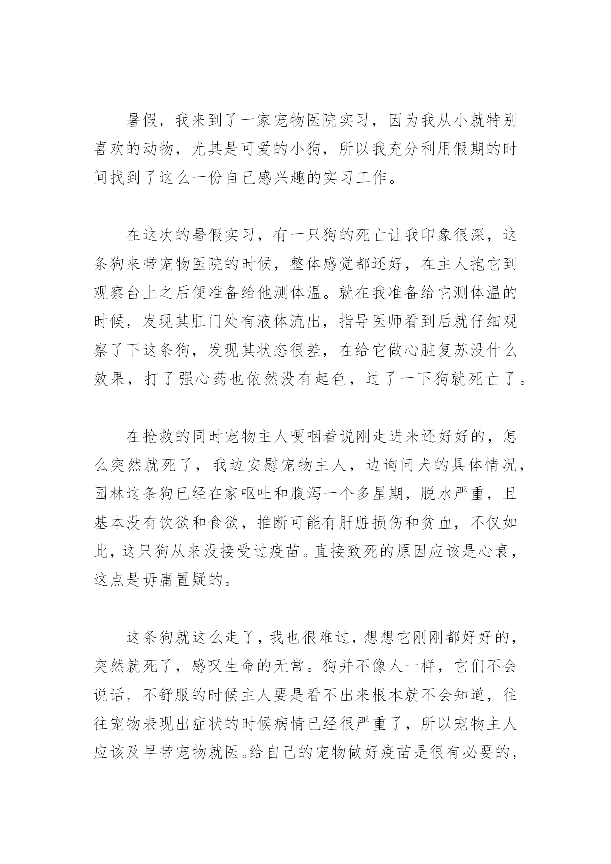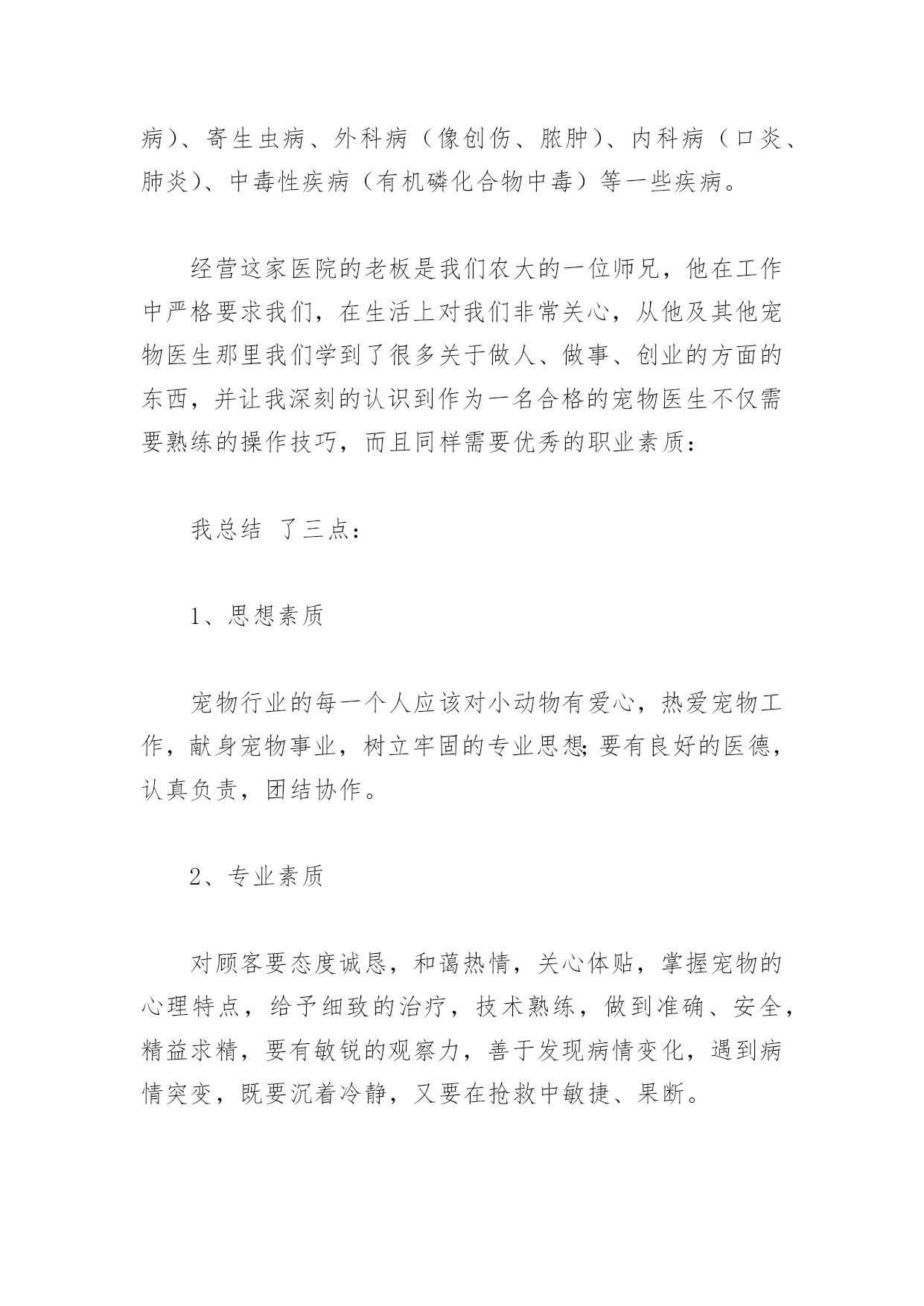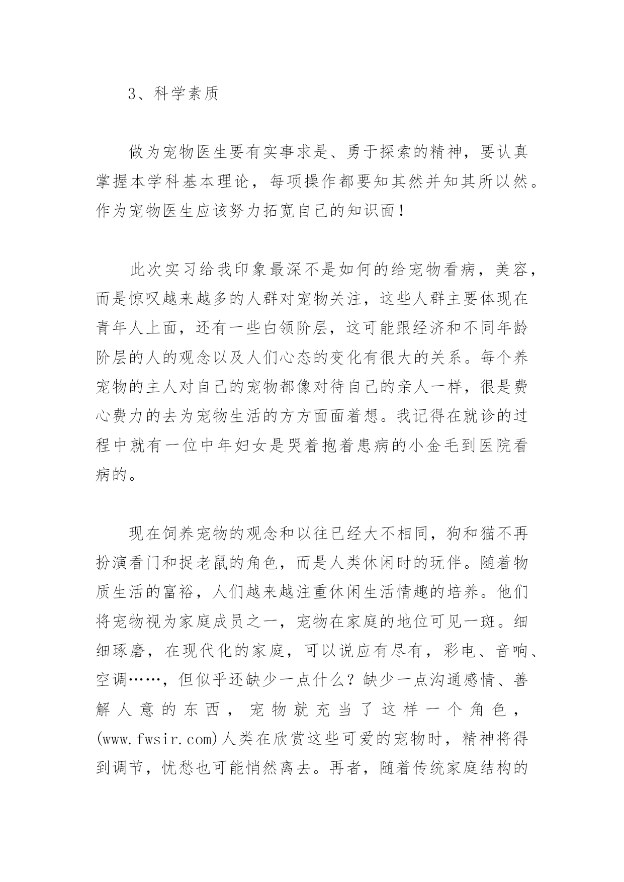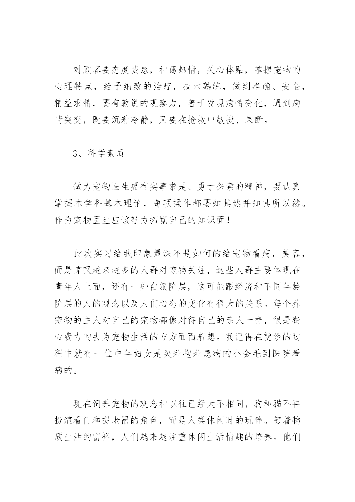 宠物医院实习报告宠物医院实习报告宠物医院实习报告(一)毕业实习工作已经划上了句号,但留在心中的回忆与感受却是久久难以忘怀。在这五个多月中我们紧张过,努力过,开心过,醒悟过,自信过。这些从未有过的经历让我们进步了,成长了,学会了一些在学校以前从未学过的东西。我于20**年12月至2012年5月在吉林农业科技学院附属动物医院实习,该医院位于吉林市重庆路大润发超市附近,是一家以国营为主的宠物医院,医院占地面积不大,不超过一百平米,有两个楼层。宠物医院里基础设施还算是比较齐全的,各个必需的手术室、美容室、传染病隔离室等都有设置。但由于规模小,医院尚在发展阶段,所以较为先进的医疗设备不多。在职员工也不多,总共四个人。该动物医院主要是给宠物美容、看病、手术、住院,销售宠物食品、宠物玩具、宠物相关用品。每天的顾客流量比较大,我们每天在那里的主要工作就是打扫一下卫生,接待前来就诊的小宠物,帮小宠物做一些简单的美容,给宠物打针,经常性的对医院进行消毒工作等一些比较简单的工作。前来该宠物医院就诊的宠物主要是犬类,其中以博美、金毛、牧羊犬、吉娃娃、前来就诊的比较多,这些犬大部分是从外省或是国外通过空运被主人所接收的,由于从异地托运,所以或多或少的会带一些疾病。实习过程中,我所接触到的病例主要是:传染病(像犬瘟热、细小病毒病、结核病)、寄生虫病、外科病(像创伤、脓肿)、内科病(口炎、肺炎)、中毒性疾病(有机磷化合物中毒)等一些疾病。主管这所动物医院的专家是我们的王老师,他在工作中严格要求我们,在生活上对我们非常关心,从他及其他宠物医生那里我们学到了很多关于做人、做事、创业的方面的东西,并让我深刻的认识到作为一名合格的宠物医生不仅需要熟练的操作技巧,而且同样需要优秀的职业素质:我总结了三点:1、思想素质宠物行业的每一个人应该对小动物有爱心,热爱宠物工作,献身宠物事业,树立牢固的专业思想;要有良好的医德,认真负责,团结协作。2、专业素质对顾客要态度诚恳,和蔼热情,关心体贴,掌握宠物的心理特点,给予细致的治疗,技术熟练,做到准确、安全,精益求精,要有敏锐的观察力,善于发现病情变化,遇到病情突变,既要沉着冷静,又要在抢救中敏捷、果断。3、科学素质做为宠物医生要有实事求是、勇于探索的精神,要认真掌握本学科基本理论,每项操作都要知其然并知其所以然。作为宠物医生应该努力拓宽自己的知识面!此次实习给我印象最深不是如何的给宠物看病,美容,而是惊叹越来越多的人群对宠物关注,这些人群主要体现在青年人上面,还有一些白领阶层,这可能跟经济和不同年龄阶层的人的观念以及人们心态的变化有很大的关系。每个养宠物的主人对自己的宠物都像对待自己的亲人一样,很是费心费力的去为宠物生活的方方面面着想。我记得在就诊的过程中就有一位中年妇女是哭着抱着患病的小金毛到医院看病的。现在饲养宠物的观念和以往已经大不相同,狗和猫不再扮演看门和捉老鼠的角色,而是人类休闲时的玩伴。随着物质生活的富裕,人们越来越注重休闲生活情趣的培养。他们将宠物视为家庭成员之一,宠物在家庭的地位可见一斑。细细琢磨,在现代化的家庭,可以说应有尽有,彩电、音响、空调……,但似乎还缺少一点什么?缺少一点沟通感情、善解人意的东西,宠物就充当了这样一个角色,人类在欣赏这些可爱的宠物时,精神将得到调节,忧愁也可能悄然离去。再者,随着传统家庭结构的变化、解体,人际关系逐渐趋于淡化,使越来越多的人将感情投注于宠物身上,人与宠物间的依赖关系,将随时间的流逝而日益浓厚。宠物,在社会生活、家庭生活中充当重要角色;它进入了家庭圈,充当人们的生活伙伴,它进入了社会交圈,体现人们的身份地位,作为贵重礼品赠送亲戚和朋友;它进入了经济圈,发展宠物以带动一批产业的兴起……伴随时代的发展以及人们观念的更新,宠物行业在国内各个城市的兴起将无可置疑。通过这次实习我认识到,我国宠物品种资源丰富,宠物饲料资源也很充足,亟待动物专家和爱好者研究开发。五个月的实习生活让我获益匪浅。实习,不仅是我人生中一段珍贵的记忆,更是我另一段人生的起点,我相信在未来的路上我会做的很好。宠物医院实习报告(二)暑假,我来到了一家宠物医院实习,因为我从小就特别喜欢的动物,尤其是可爱的小狗,所以我充分利用假期的时间找到了这么一份自己感兴趣的实习工作。在这次的暑假实习,有一只狗的死亡让我印象很深,这条狗来带宠物医院的时候,整体感觉都还好,在主人抱它到观察台上之后便准备给他测体温。就在我准备给它测体温的时候,发现其肛门处有液体流出,指导医师看到后就仔细观察了下这条狗,发现其状态很差,在给它做心脏复苏没什么效果,打了强心药也依然没有起色,过了一下狗就死亡了。在抢救的同时宠物主人哽咽着说刚走进来还好好的,怎么突然就死了,我边安慰宠物主人,边询问犬的具体情况,园林这条狗已经在家呕吐和腹泻一个多星期,脱