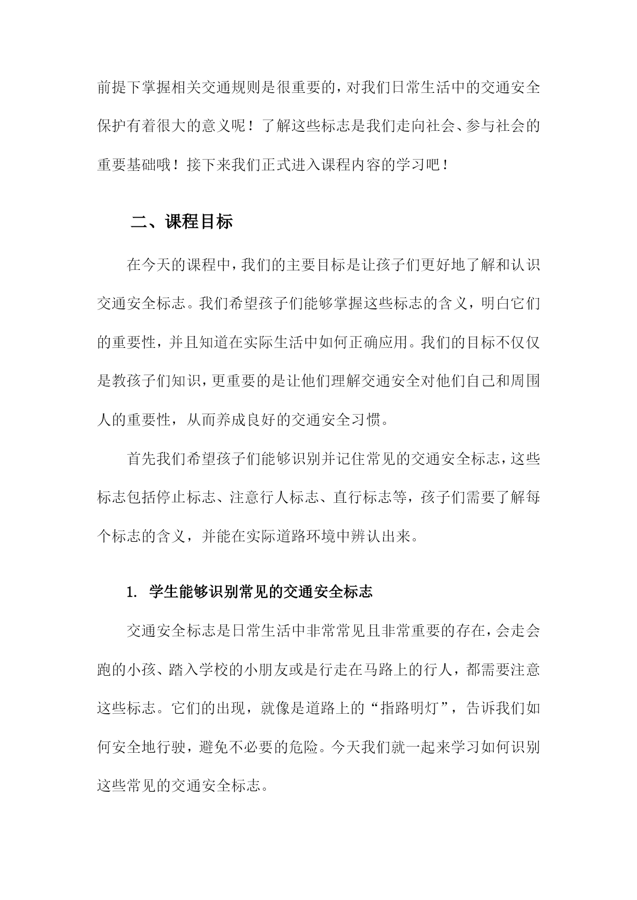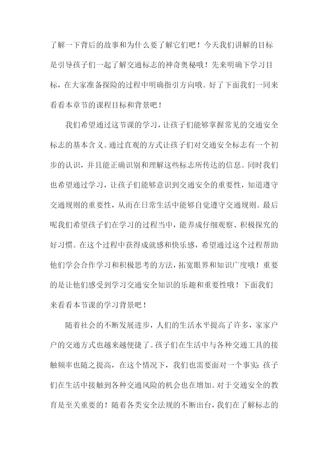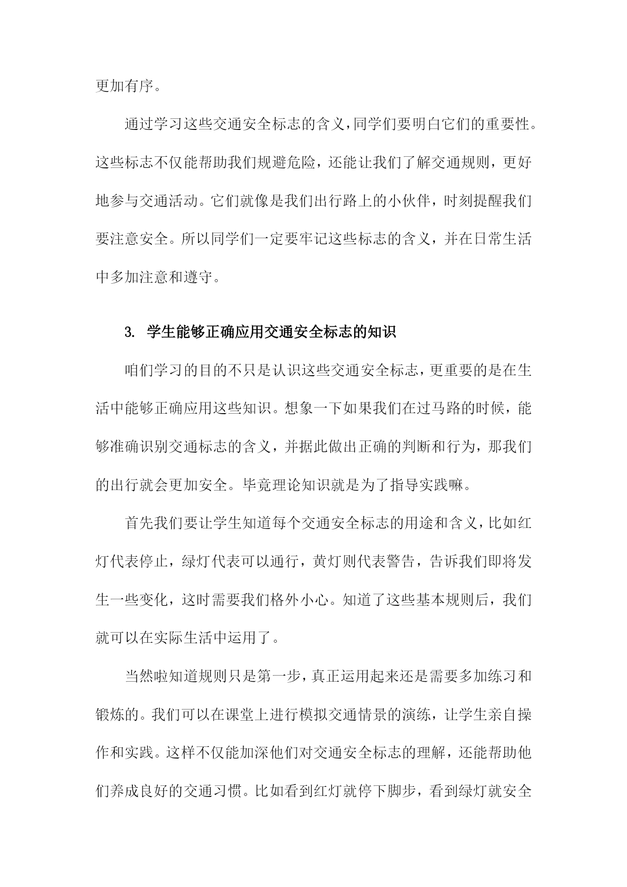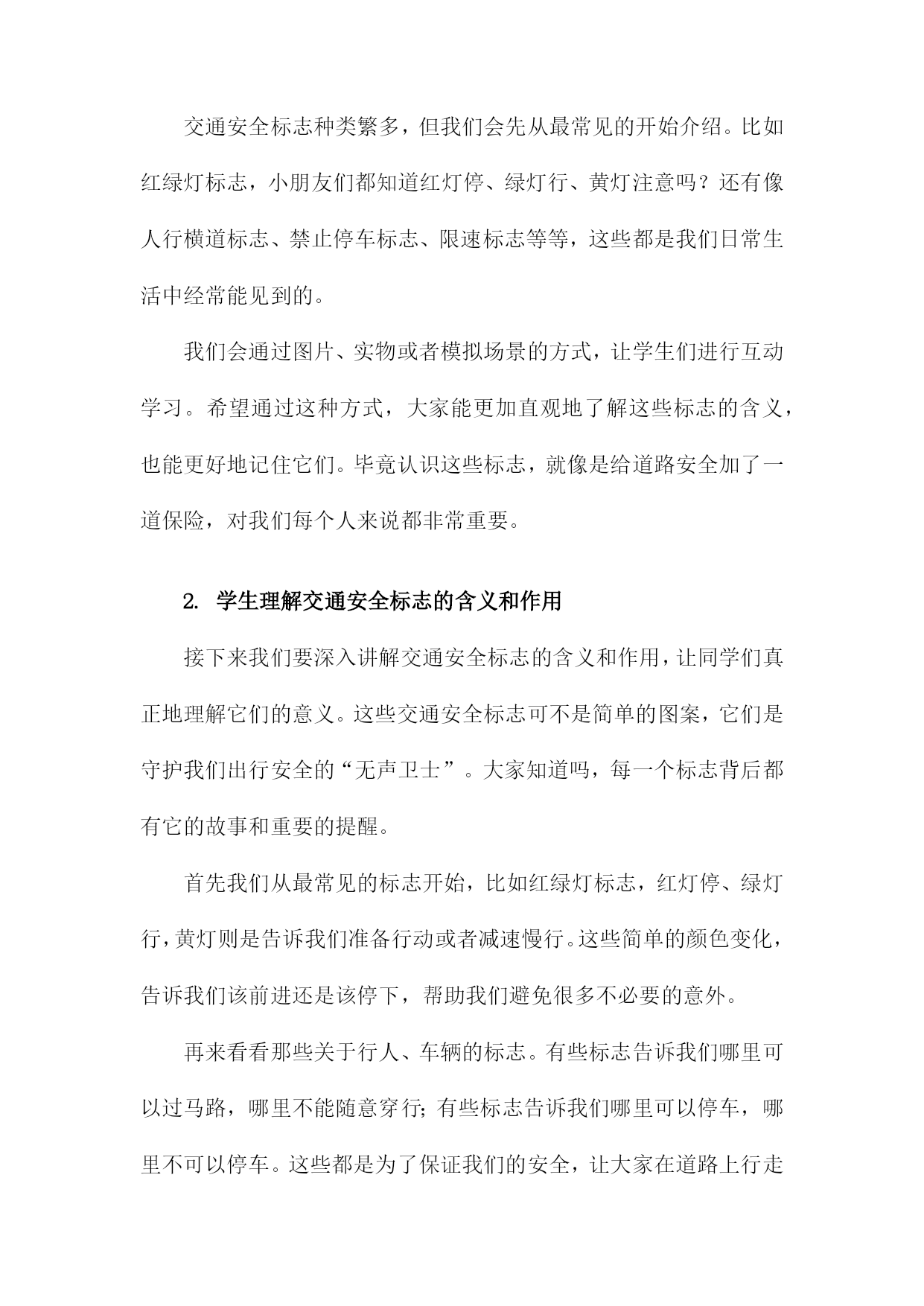认识交通安全标志的教案一、简述交通安全标志是我们日常生活中不可或缺的重要元素,它关系到每个人的生命安全和出行便利。今天我们就来一起认识交通安全标志,了解它们的含义和作用。通过学习这些标志,孩子们可以更好地了解交通规则,增强安全意识,从而避免交通意外。那么这些标志究竟有哪些?它们又代表着怎样的含义呢?接下来我们就一起来探索吧!1.阐述交通安全标志的重要性交通安全标志是我们日常出行的“指路明灯”,也是每一位交通参与者的“安全守护者”。它们不仅告诉我们哪里可以安全过马路,还提醒我们哪些地方需要减速慢行或者注意车辆。这些标志就像路上的“小卫士”,默默地守护着我们的安全。所以学会识别和理解这些交通安全标志,对我们来说至关重要。2.引入课程目标和学习背景当我们走出家门,无论我们是走路还是去远处玩,总会看到一些标志。这些标志就像是路上的小向导,告诉我们前方有什么需要注意的事情。今天我们要一起走进这个标志的世界,了解它们背后的故事和含义。大家都知道交通安全的标志很重要,知道为什么吗?一起来了解一下背后的故事和为什么要了解它们吧!今天我们讲解的目标是引导孩子们一起了解交通标志的神奇奥秘哦!先来明确下学习目标,在大家准备探险的过程中明确指引方向哦。好了下面我们一同来看看本章节的课程目标和背景吧!我们希望通过这节课的学习,让孩子们能够掌握常见的交通安全标志的基本含义。通过直观的方式让孩子们对交通安全标志有一个初步的认识,并且能正确识别和理解这些标志所传达的信息。同时我们也希望通过学习,让孩子们能够意识到交通安全的重要性,知道遵守交通规则的重要性,从而在日常生活中能够自觉遵守交通规则。最后呢我们希望孩子们在学习的过程当中,能养成仔细观察、积极探究的好习惯。在这个过程中获得成就感和快乐感,希望通过这个过程帮助他们学会合作学习和积极思考的方法,拓宽眼界和知识广度哦!重要的是让他们感受到学习交通安全知识的乐趣和重要性哦!下面我们来看看本节课的学习背景吧!随着社会的不断发展进步,人们的生活水平提高了许多,家家户户的交通方式也越来越便捷了。孩子们在生活中与各种交通工具的接触频率也随之提高,在这个情况下,我们也需要面对一个事实:孩子们在生活中接触到各种交通风险的机会也在增加。对于交通安全的教育是至关重要的!随着各类安全法规的不断出台,我们在了解标志的前提下掌握相关交通规则是很重要的,对我们日常生活中的交通安全保护有着很大的意义呢!了解这些标志是我们走向社会、参与社会的重要基础哦!接下来我们正式进入课程内容的学习吧!二、课程目标在今天的课程中,我们的主要目标是让孩子们更好地了解和认识交通安全标志。我们希望孩子们能够掌握这些标志的含义,明白它们的重要性,并且知道在实际生活中如何正确应用。我们的目标不仅仅是教孩子们知识,更重要的是让他们理解交通安全对他们自己和周围人的重要性,从而养成良好的交通安全习惯。首先我们希望孩子们能够识别并记住常见的交通安全标志,这些标志包括停止标志、注意行人标志、直行标志等,孩子们需要了解每个标志的含义,并能在实际道路环境中辨认出来。1.学生能够识别常见的交通安全标志交通安全标志是日常生活中非常常见且非常重要的存在,会走会跑的小孩、踏入学校的小朋友或是行走在马路上的行人,都需要注意这些标志。它们的出现,就像是道路上的“指路明灯”,告诉我们如何安全地行驶,避免不必要的危险。今天我们就一起来学习如何识别这些常见的交通安全标志。交通安全标志种类繁多,但我们会先从最常见的开始介绍。比如红绿灯标志,小朋友们都知道红灯停、绿灯行、黄灯注意吗?还有像人行横道标志、禁止停车标志、限速标志等等,这些都是我们日常生活中经常能见到的。我们会通过图片、实物或者模拟场景的方式,让学生们进行互动学习。希望通过这种方式,大家能更加直观地了解这些标志的含义,也能更好地记住它们。毕竟认识这些标志,就像是给道路安全加了一道保险,对我们每个人来说都非常重要。2.学生理解交通安全标志的含义和作用接下来我们要深入讲解交通安全标志的含义和作用,让同学们真正地理解它们的意义。这些交通安全标志可不是简单的图案,它们是守护我们出行安全的“无声卫士”。大家知道吗,每一个标志背后都有它的故事和重要的提醒。首先我们从最常见的标志开始,比如红绿灯标志,红灯停、绿灯行,黄灯则是告诉我们准备行动或者减速慢行。这些简单的颜色变化,告诉我们该前进还是该停下,帮助我们避免很多不必要的意外。再来看看那些关于行人、车辆的标志。有些标志告诉我们哪里可以过马路,哪里不能随意穿行;有些标志告诉我们哪里可以停车,哪里不可以停车。这些都是为了保证我们的安全,让大家在道路上行走更加有序。通过学习这些交通安全标志的含义,同学们要明白它们的重要性。这些标志不仅能帮助我们规避危险,还能让我们