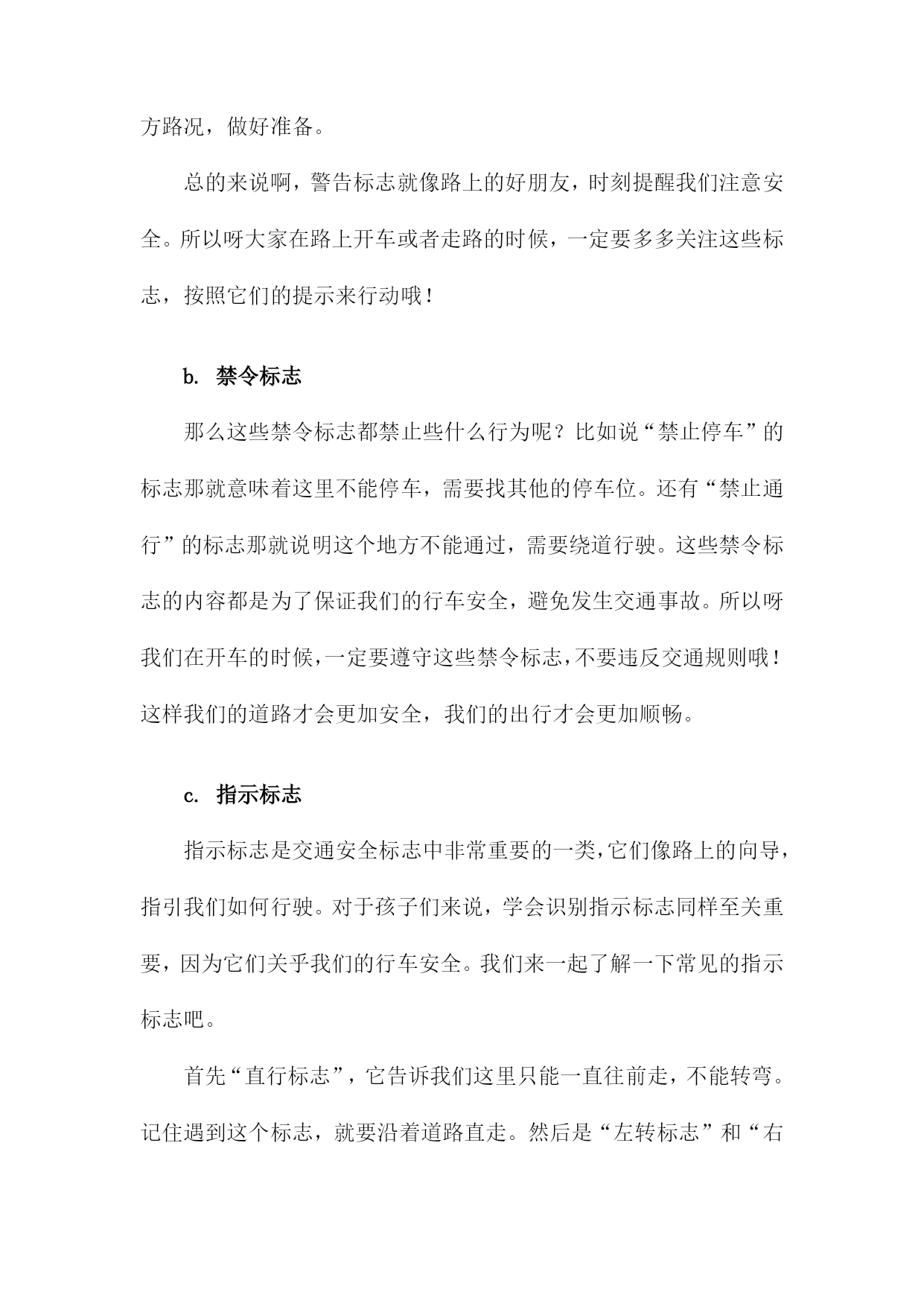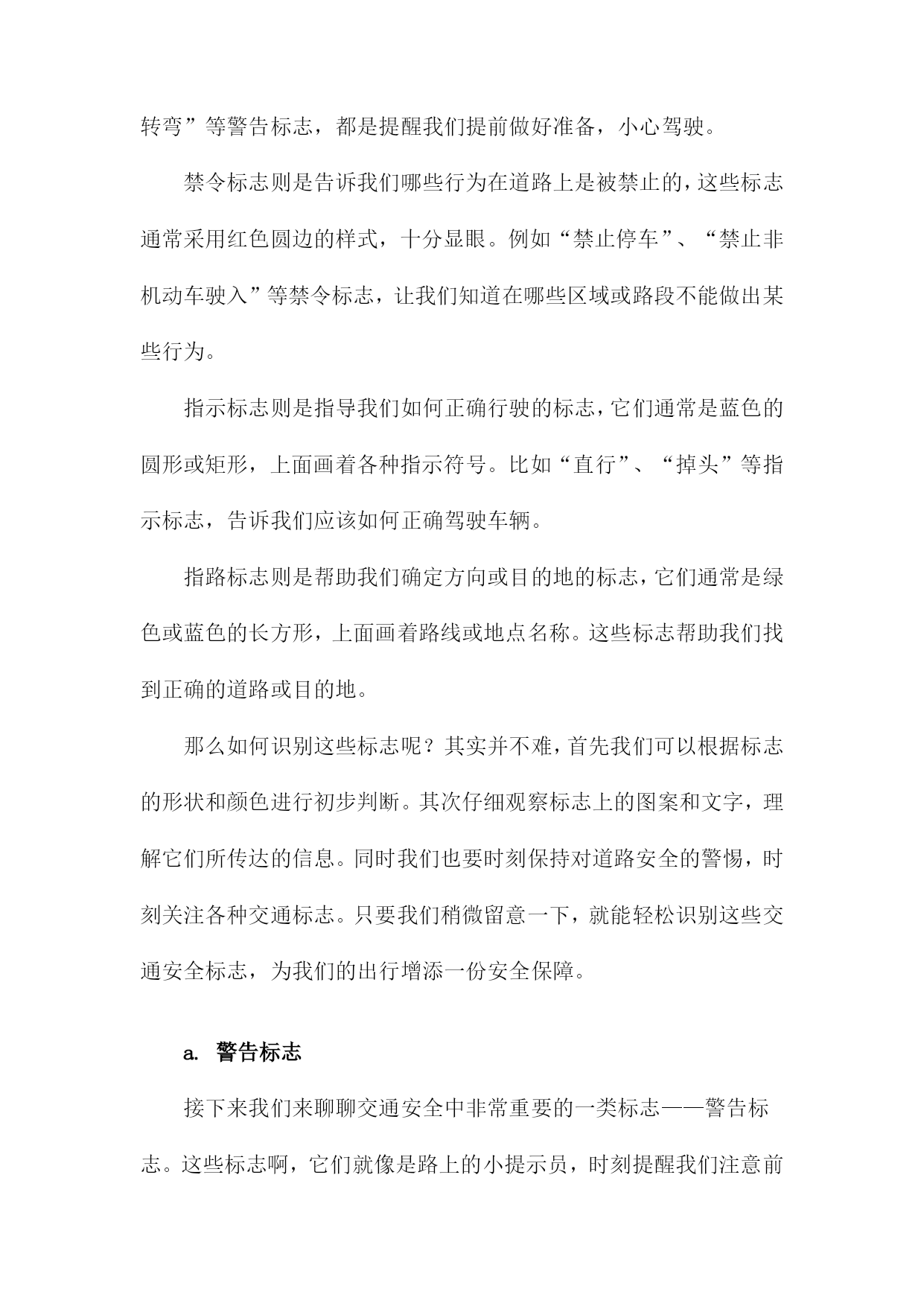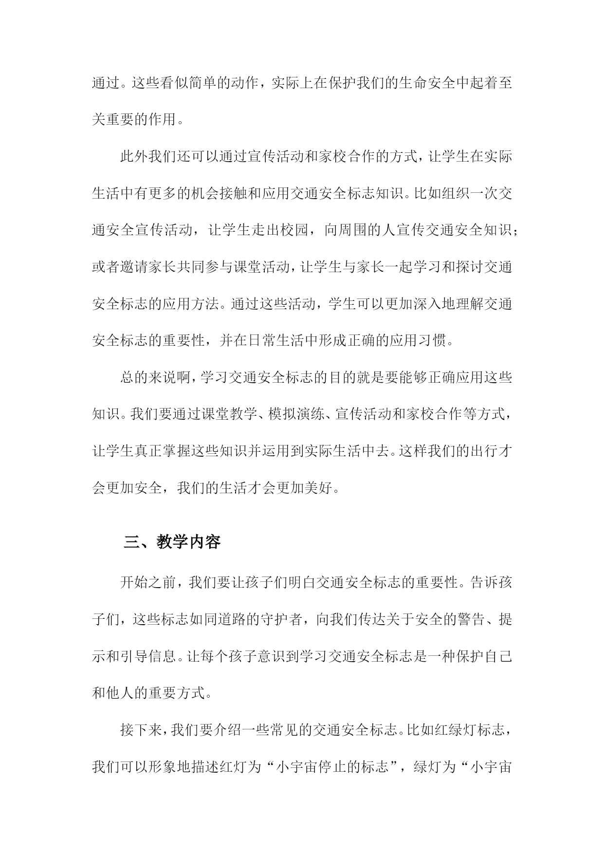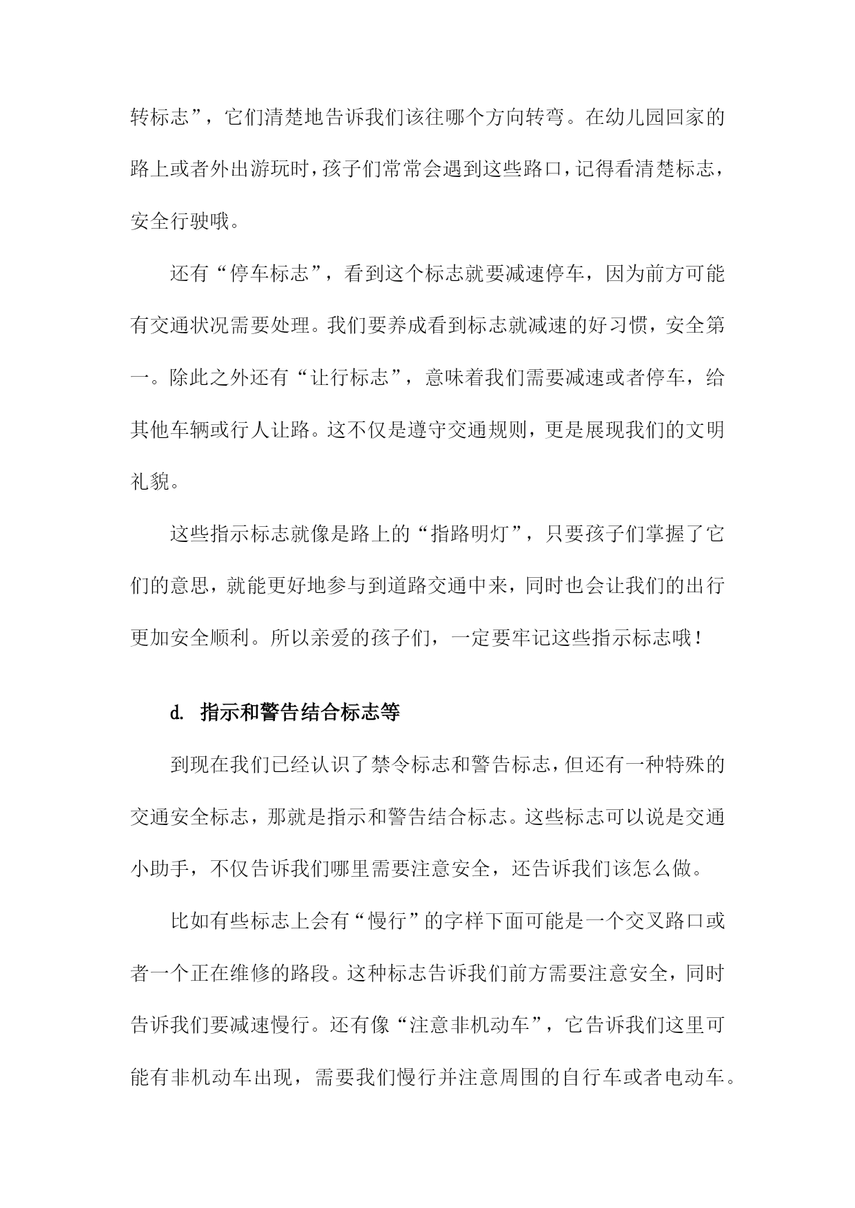 认识交通安全标志的教案一、简述交通安全标志是我们日常生活中不可或缺的重要元素,它关系到每个人的生命安全和出行便利。今天我们就来一起认识交通安全标志,了解它们的含义和作用。通过学习这些标志,孩子们可以更好地了解交通规则,增强安全意识,从而避免交通意外。那么这些标志究竟有哪些?它们又代表着怎样的含义呢?接下来我们就一起来探索吧!1.阐述交通安全标志的重要性交通安全标志是我们日常出行的“指路明灯”,也是每一位交通参与者的“安全守护者”。它们不仅告诉我们哪里可以安全过马路,还提醒我们哪些地方需要减速慢行或者注意车辆。这些标志就像路上的“小卫士”,默默地守护着我们的安全。所以学会识别和理解这些交通安全标志,对我们来说至关重要。2.引入课程目标和学习背景当我们走出家门,无论我们是走路还是去远处玩,总会看到一些标志。这些标志就像是路上的小向导,告诉我们前方有什么需要注意的事情。今天我们要一起走进这个标志的世界,了解它们背后的故事和含义。大家都知道交通安全的标志很重要,知道为什么吗?一起来了解一下背后的故事和为什么要了解它们吧!今天我们讲解的目标是引导孩子们一起了解交通标志的神奇奥秘哦!先来明确下学习目标,在大家准备探险的过程中明确指引方向哦。好了下面我们一同来看看本章节的课程目标和背景吧!我们希望通过这节课的学习,让孩子们能够掌握常见的交通安全标志的基本含义。通过直观的方式让孩子们对交通安全标志有一个初步的认识,并且能正确识别和理解这些标志所传达的信息。同时我们也希望通过学习,让孩子们能够意识到交通安全的重要性,知道遵守交通规则的重要性,从而在日常生活中能够自觉遵守交通规则。最后呢我们希望孩子们在学习的过程当中,能养成仔细观察、积极探究的好习惯。在这个过程中获得成就感和快乐感,希望通过这个过程帮助他们学会合作学习和积极思考的方法,拓宽眼界和知识广度哦!重要的是让他们感受到学习交通安全知识的乐趣和重要性哦!下面我们来看看本节课的学习背景吧!随着社会的不断发展进步,人们的生活水平提高了许多,家家户户的交通方式也越来越便捷了。孩子们在生活中与各种交通工具的接触频率也随之提高,在这个情况下,我们也需要面对一个事实:孩子们在生活中接触到各种交通风险的机会也在增加。对于交通安全的教育是至关重要的!随着各类安全法规的不断出台,我们在了解标志的前提下掌握相关交通规则是很重要的,对我们日常生活中的交通安全保护有着很大的意义呢!了解这些标志是我们走向社会、参与社会的重要基础哦!接下来我们正式进入课程内容的学习吧!二、课程目标在今天的课程中,我们的主要目标是让孩子们更好地了解和认识交通安全标志。我们希望孩子们能够掌握这些标志的含义,明白它们的重要性,并且知道在实际生活中如何正确应用。我们的目标不仅仅是教孩子们知识,更重要的是让他们理解交通安全对他们自己和周围人的重要性,从而养成良好的交通安全习惯。首先我们希望孩子们能够识别并记住常见的交通安全标志,这些标志包括停止标志、注意行人标志、直行标志等,孩子们需要了解每个标志的含义,并能在实际道路环境中辨认出来。1.学生能够识别常见的交通安全标志交通安全标志是日常生活中非常常见且非常重要的存在,会走会跑的小孩、踏入学校的小朋友或是行走在马路上的行人,都需要注意这些标志。它们的出现,就像是道路上的“指路明灯”,告诉我们如何安全地行驶,避免不必要的危险。今天我们就一起来学习如何识别这些常见的交通安全标志。交通安全标志种类繁多,但我们会先从最常见的开始介绍。比如红绿灯标志,小朋友们都知道红灯停、绿灯行、黄灯注意吗?还有像人行横道标志、禁止停车标志、限速标志等等,这些都是我们日常生活中经常能见到的。我们会通过图片、实物或者模拟场景的方式,让学生们进行互动学习。希望通过这种方式,大家能更加直观地了解这些标志的含义,也能更好地记住它们。毕竟认识这些标志,就像是给道路安全加了一道保险,对我们每个人来说都非常重要。2.学生理解交通安全标志的含义和作用接下来我们要深入讲解交通安全标志的含义和作用,让同学们真正地理解它们的意义。这些交通安全标志可不是简单的图案,它们是守护我们出行安全的“无声卫士”。大家知道吗,每一个标志背后都有它的故事和重要的提醒。首先我们从最常见的标志开始,比如红绿灯标志,红灯停、绿灯行,黄灯则是告诉我们准备行动或者减速慢行。这些简单的颜色变化,告诉我们该前进还是该停下,帮助我们避免很多不必要的意外。再来看看那些关于行人、车辆的标志。有些标志告诉我们哪里可以过马路,哪里不能随意穿行;有些标志告诉我们哪里可以停车,哪里不可以停车。这些都是为了保证我们的安全,让大家在道路上行走更加有序。通过学习这些交通安全标志的含义,同学们要明白它们的重要性。这些标志不仅能帮助我们规避危险,还能让我们