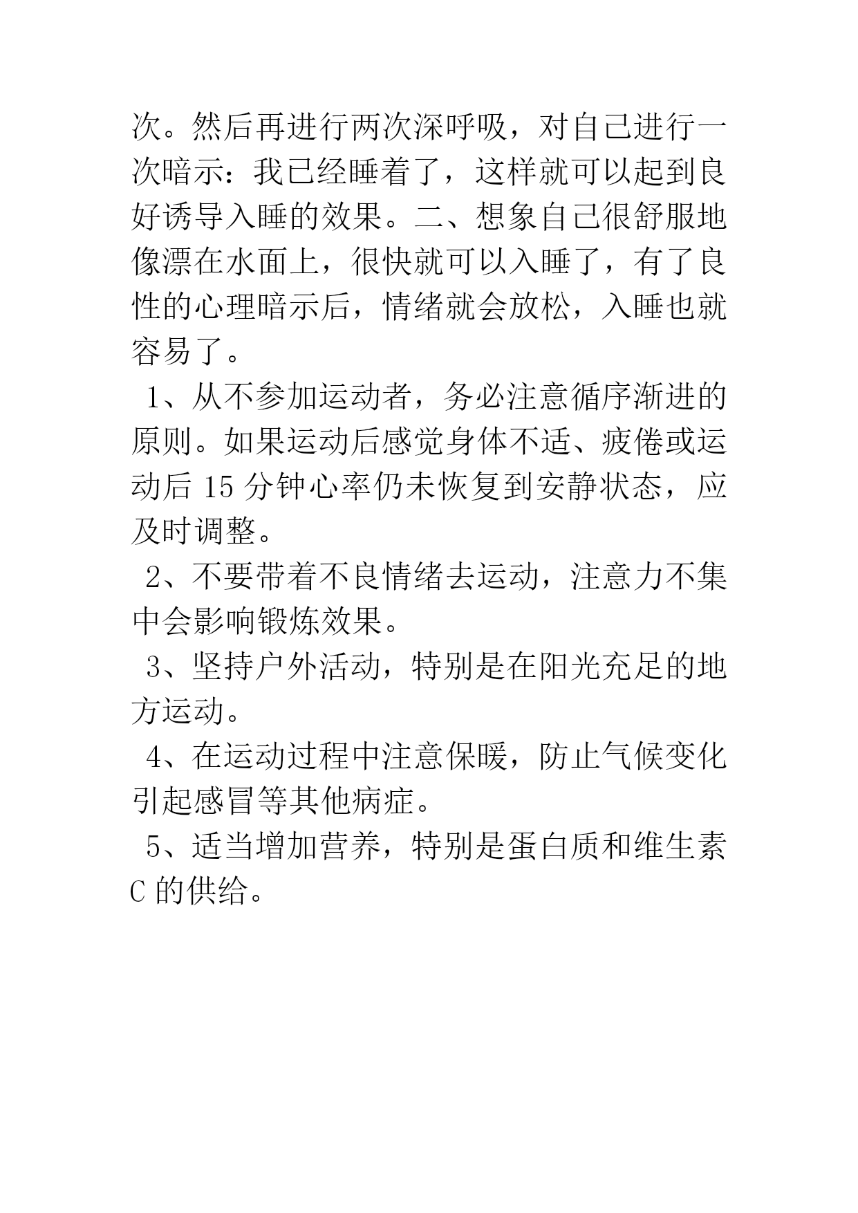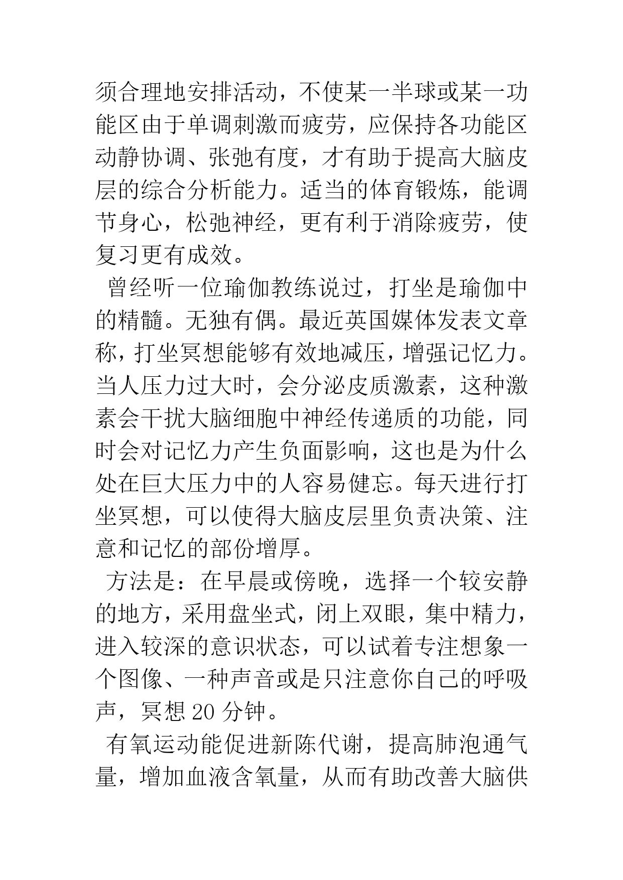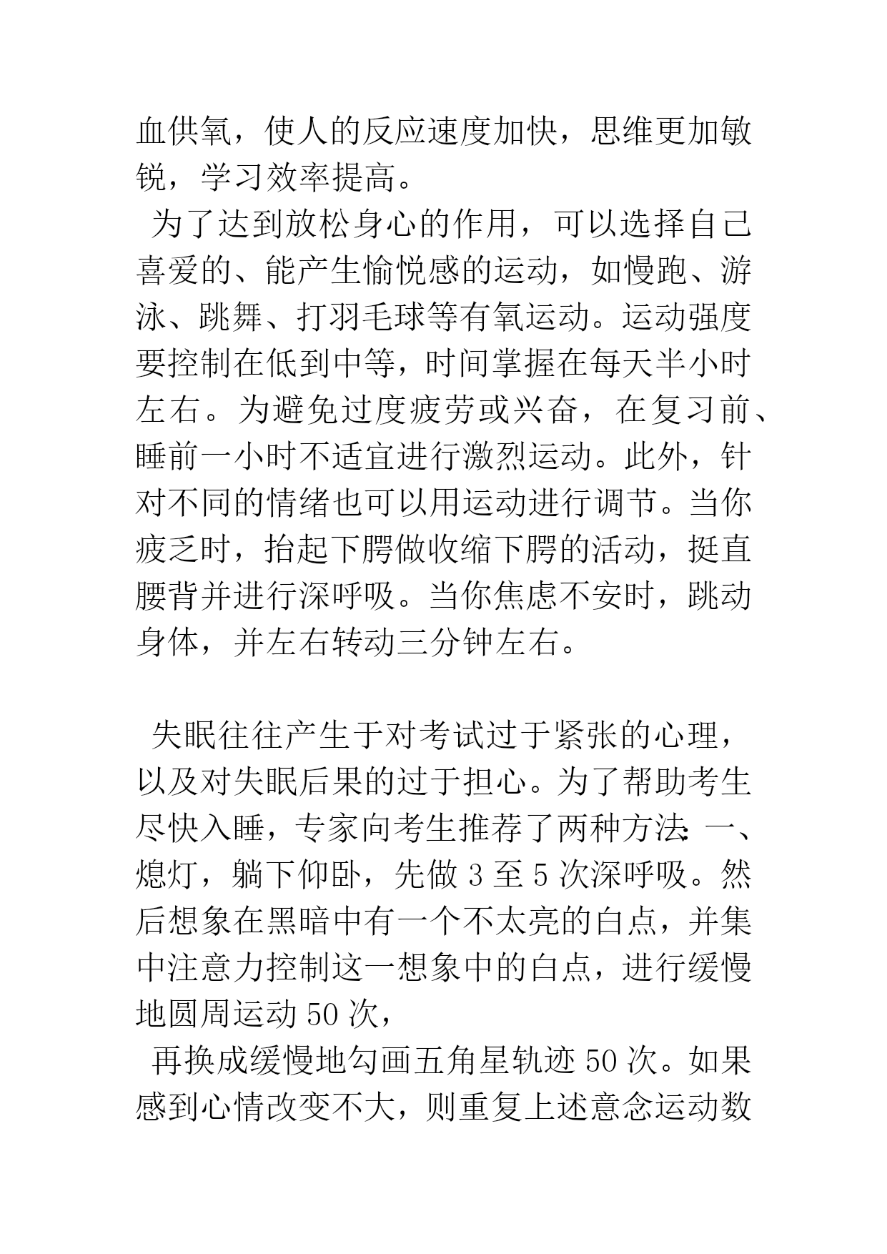 考前如何通过运动进行减压寒假到来,再过几个月初三学生就要参加中考,现在正是考生们的最后冲刺阶段,压力之大可想而知。“减压”二字并非说说那么简单,真要起到效果,运动减压是有效的方法之一。今天就介绍一下运动减压的原理,以及如何运动减压。迎考期间,大多数考生或多或少存在紧张、烦恼、压抑、担忧等焦虑情绪。运动则提供了一个“宣泄口”,是最有效的情绪疏导工具,能减轻应激反应及应激反应对生理的影响,有效地释放被压抑的情感,并增强心理承受力。考生们整天伏案苦读,单调而枯燥,长时间单调刺激易造成生理和心理的疲劳。运动能使刺激强度得到变换,起到改善、调节脑功能的重要作用,提高中枢神经系统活动的平衡性和灵活性。要充分发挥大脑潜能,必须合理地安排活动,不使某一半球或某一功能区由于单调刺激而疲劳,应保持各功能区动静协调、张弛有度,才有助于提高大脑皮层的综合分析能力。适当的体育锻炼,能调节身心,松弛神经,更有利于消除疲劳,使复习更有成效。曾经听一位瑜伽教练说过,打坐是瑜伽中的精髓。无独有偶。最近英国媒体发表文章称,打坐冥想能够有效地减压,增强记忆力。当人压力过大时,会分泌皮质激素,这种激素会干扰大脑细胞中神经传递质的功能,同时会对记忆力产生负面影响,这也是为什么处在巨大压力中的人容易健忘。每天进行打坐冥想,可以使得大脑皮层里负责决策、注意和记忆的部份增厚。方法是:在早晨或傍晚,选择一个较安静的地方,采用盘坐式,闭上双眼,集中精力,进入较深的意识状态,可以试着专注想象一个图像、一种声音或是只注意你自己的呼吸声,冥想20分钟。有氧运动能促进新陈代谢,提高肺泡通气量,增加血液含氧量,从而有助改善大脑供血供氧,使人的反应速度加快,思维更加敏锐,学习效率提高。为了达到放松身心的作用,可以选择自己喜爱的、能产生愉悦感的运动,如慢跑、游泳、跳舞、打羽毛球等有氧运动。运动强度要控制在低到中等,时间掌握在每天半小时左右。为避免过度疲劳或兴奋,在复习前、睡前一小时不适宜进行激烈运动。此外,针对不同的情绪也可以用运动进行调节。当你疲乏时,抬起下腭做收缩下腭的活动,挺直腰背并进行深呼吸。当你焦虑不安时,跳动身体,并左右转动三分钟左右。失眠往往产生于对考试过于紧张的心理,以及对失眠后果的过于担心。为了帮助考生尽快入睡,专家向考生推荐了两种方法:一、熄灯,躺下仰卧,先做3至5次深呼吸。然后想象在黑暗中有一个不太亮的白点,并集中注意力控制这一想象中的白点,进行缓慢地圆周运动50次,再换成缓慢地勾画五角星轨迹50次。如果感到心情改变不大,则重复上述意念运动数次。然后再进行两次深呼吸,对自己进行一次暗示:我已经睡着了,这样就可以起到良好诱导入睡的效果。二、想象自己很舒服地像漂在水面上,很快就可以入睡了,有了良性的心理暗示后,情绪就会放松,入睡也就容易了。1、从不参加运动者,务必注意循序渐进的原则。如果运动后感觉身体不适、疲倦或运动后15分钟心率仍未恢复到安静状态,应及时调整。2、不要带着不良情绪去运动,注意力不集中会影响锻炼效果。3、坚持户外活动,特别是在阳光充足的地方运动。4、在运动过程中注意保暖,防止气候变化引起感冒等其他病症。5、适当增加营养,特别是蛋白质和维生素C的供给。