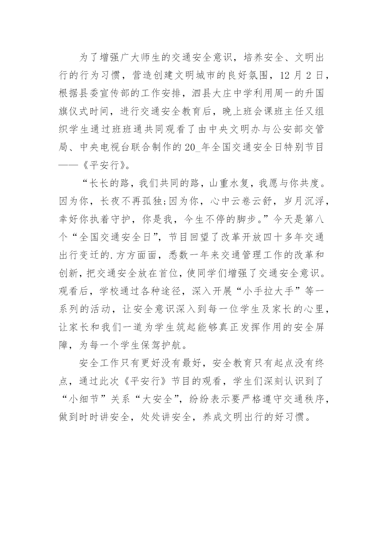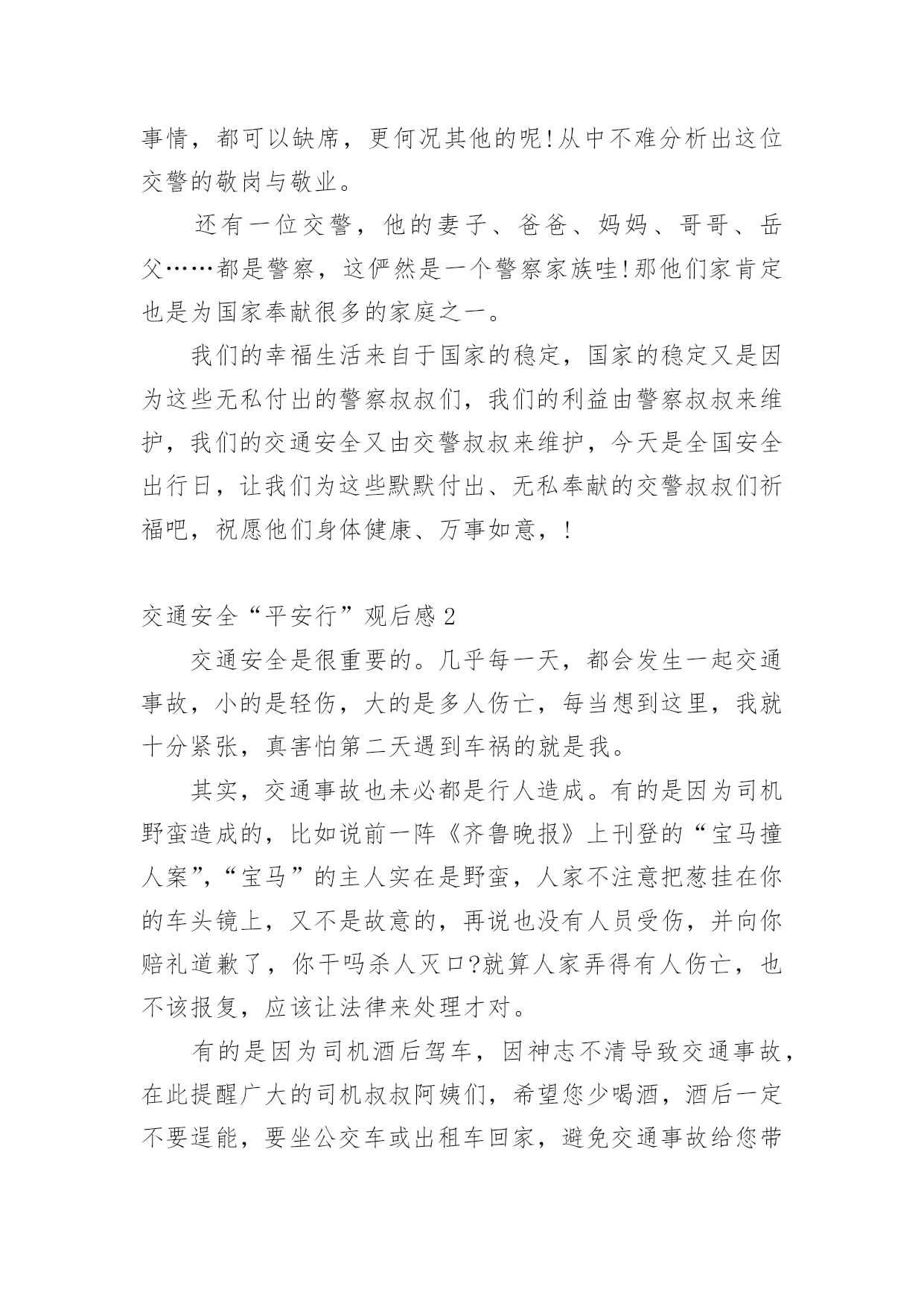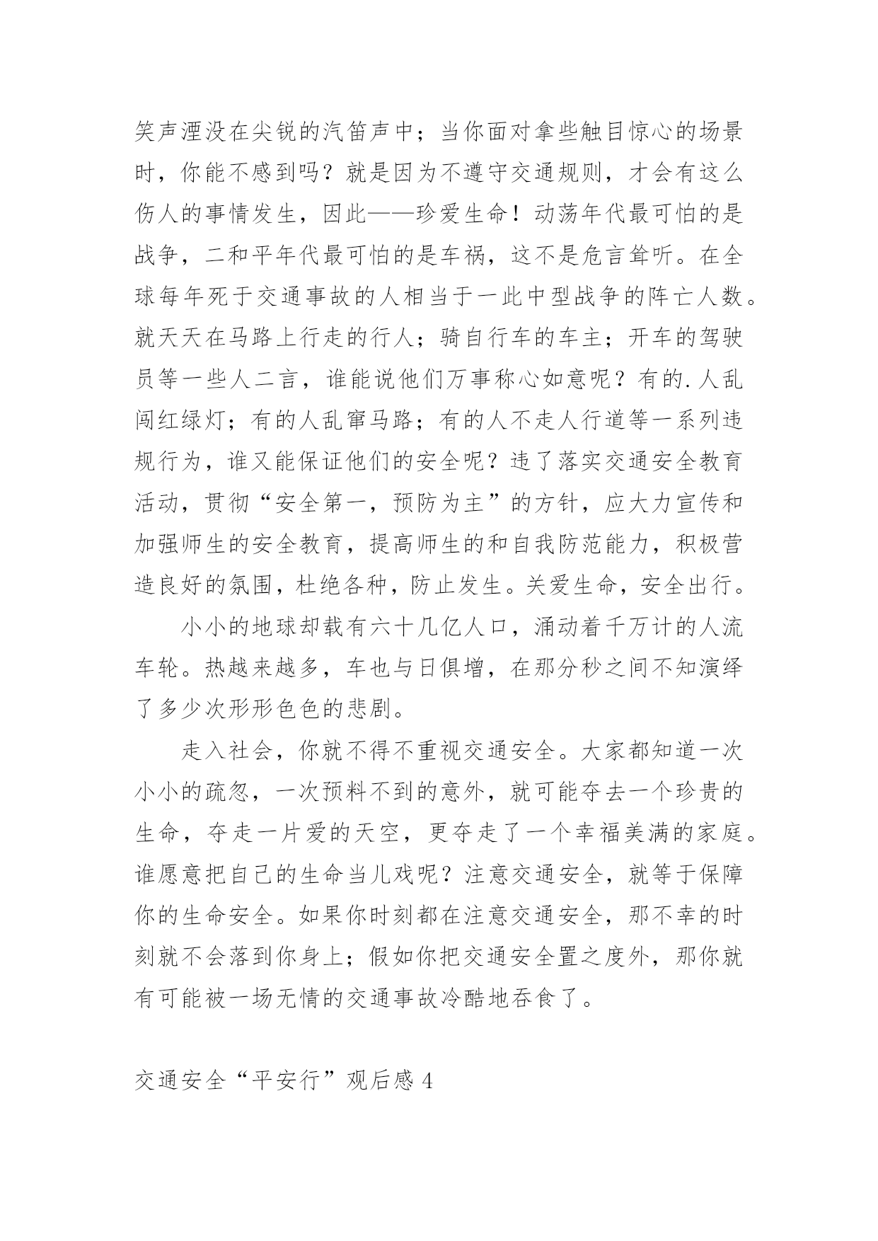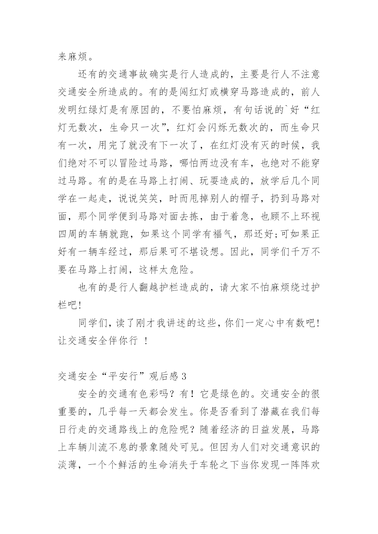 交通安全“平安行”观后感当品味完一部影视作品后,一定有不少感悟吧,现在就让我们写一篇走心的观后感吧。那么观后感到底应该怎么写呢?以下是小编收集整理的交通安全“平安行”观后感,欢迎大家借鉴与参考,希望对大家有所帮助。交通安全“平安行”观后感1我们每天都会跟人来人往的大马路交往,车这么多,人这么多,是谁保证我们的出行安全呢?不错,正是我们可亲可敬的交警叔叔。今天放学回家,妈妈让我打开电视观看《平安行》,节目之中介绍了一些警龄在30-40年之间的老交警,诉说了这群老交警对这身制服的不舍与热爱……这里面我印象最深的一位交警,曾因受到暴力而受伤,导致左脚行动十分不灵便,这可是落下一辈子的毛病啊!真难以想象,一位交警,竟然也会受这么重的伤,腿脚的不灵便,给他生活造成了困难,也带来极大的压力,虽然他的表情轻松愉悦,但我们可以想象他现实中的生活到底是什么样子的!为了不让自己的女儿担心,说自己是男人,这样的伤扛得住,为了来参加今天的《平安行》,他甚至缺席了自己女儿的婚礼,从这一点中,就可以看出,他肯定陪伴女儿的时间很少,就连婚礼这么重要的`事情,都可以缺席,更何况其他的呢!从中不难分析出这位交警的敬岗与敬业。还有一位交警,他的妻子、爸爸、妈妈、哥哥、岳父……都是警察,这俨然是一个警察家族哇!那他们家肯定也是为国家奉献很多的家庭之一。我们的幸福生活来自于国家的稳定,国家的稳定又是因为这些无私付出的警察叔叔们,我们的利益由警察叔叔来维护,我们的交通安全又由交警叔叔来维护,今天是全国安全出行日,让我们为这些默默付出、无私奉献的交警叔叔们祈福吧,祝愿他们身体健康、万事如意,!交通安全“平安行”观后感2交通安全是很重要的。几乎每一天,都会发生一起交通事故,小的是轻伤,大的是多人伤亡,每当想到这里,我就十分紧张,真害怕第二天遇到车祸的就是我。其实,交通事故也未必都是行人造成。有的是因为司机野蛮造成的,比如说前一阵《齐鲁晚报》上刊登的“宝马撞人案”,“宝马”的主人实在是野蛮,人家不注意把葱挂在你的车头镜上,又不是故意的,再说也没有人员受伤,并向你赔礼道歉了,你干吗杀人灭口?就算人家弄得有人伤亡,也不该报复,应该让法律来处理才对。有的是因为司机酒后驾车,因神志不清导致交通事故,在此提醒广大的司机叔叔阿姨们,希望您少喝酒,酒后一定不要逞能,要坐公交车或出租车回家,避免交通事故给您带来麻烦。还有的交通事故确实是行人造成的,主要是行人不注意交通安全所造成的。有的是闯红灯或横穿马路造成的,前人发明红绿灯是有原因的,不要怕麻烦,有句话说的`好“红灯无数次,生命只一次”,红灯会闪烁无数次的,而生命只有一次,用完了就没有下一次了,在红灯没有灭的时候,我们绝对不可以冒险过马路,哪怕两边没有车,也绝对不能穿过马路。有的是在马路上打闹、玩耍造成的,放学后几个同学在一起走,说说笑笑,时而甩掉别人的帽子,扔到马路对面,那个同学便到马路对面去拣,由于着急,也顾不上环视四周的车辆就跑,如果这个同学有福气,那还好;可如果正好有一辆车经过,那后果可不堪设想。因此,同学们千万不要在马路上打闹,这样太危险。也有的是行人翻越护栏造成的,请大家不怕麻烦绕过护栏吧!同学们,读了刚才我讲述的这些,你们一定心中有数吧!让交通安全伴你行!交通安全“平安行”观后感3安全的交通有色彩吗?有!它是绿色的。交通安全的很重要的,几乎每一天都会发生。你是否看到了潜藏在我们每日行走的交通路线上的危险呢?随着经济的日益发展,马路上车辆川流不息的景象随处可见。但因为人们对交通意识的淡薄,一个个鲜活的生命消失于车轮之下当你发现一阵阵欢笑声湮没在尖锐的汽笛声中;当你面对拿些触目惊心的场景时,你能不感到吗?就是因为不遵守交通规则,才会有这么伤人的事情发生,因此——珍爱生命!动荡年代最可怕的是战争,二和平年代最可怕的是车祸,这不是危言耸听。在全球每年死于交通事故的人相当于一此中型战争的阵亡人数。就天天在马路上行走的行人;骑自行车的车主;开车的驾驶员等一些人二言,谁能说他们万事称心如意呢?有的.人乱闯红绿灯;有的人乱窜马路;有的人不走人行道等一系列违规行为,谁又能保证他们的安全呢?违了落实交通安全教育活动,贯彻“安全第一,预防为主”的方针,应大力宣传和加强师生的安全教育,提高师生的和自我防范能力,积极营造良好的氛围,杜绝各种,防止发生。关爱生命,安全出行。小小的地球却载有六十几亿人口,涌动着千万计的人流车轮。热越来越多,车也与日俱增,在那分秒之间不知演绎了多少次形形色色的悲剧。走入社会,你就不得不重视交通安全。大家都知道一次小小的疏忽,一次预料不到的意外,就可能夺去一个珍贵的生命,夺走一片爱的天空,更夺走了一个幸福美满的家庭。谁愿意把自己的生命当儿戏呢?注意交通安全,就等于保障你的生命安全。如果你时刻都在注意交通安全,那不幸的时刻